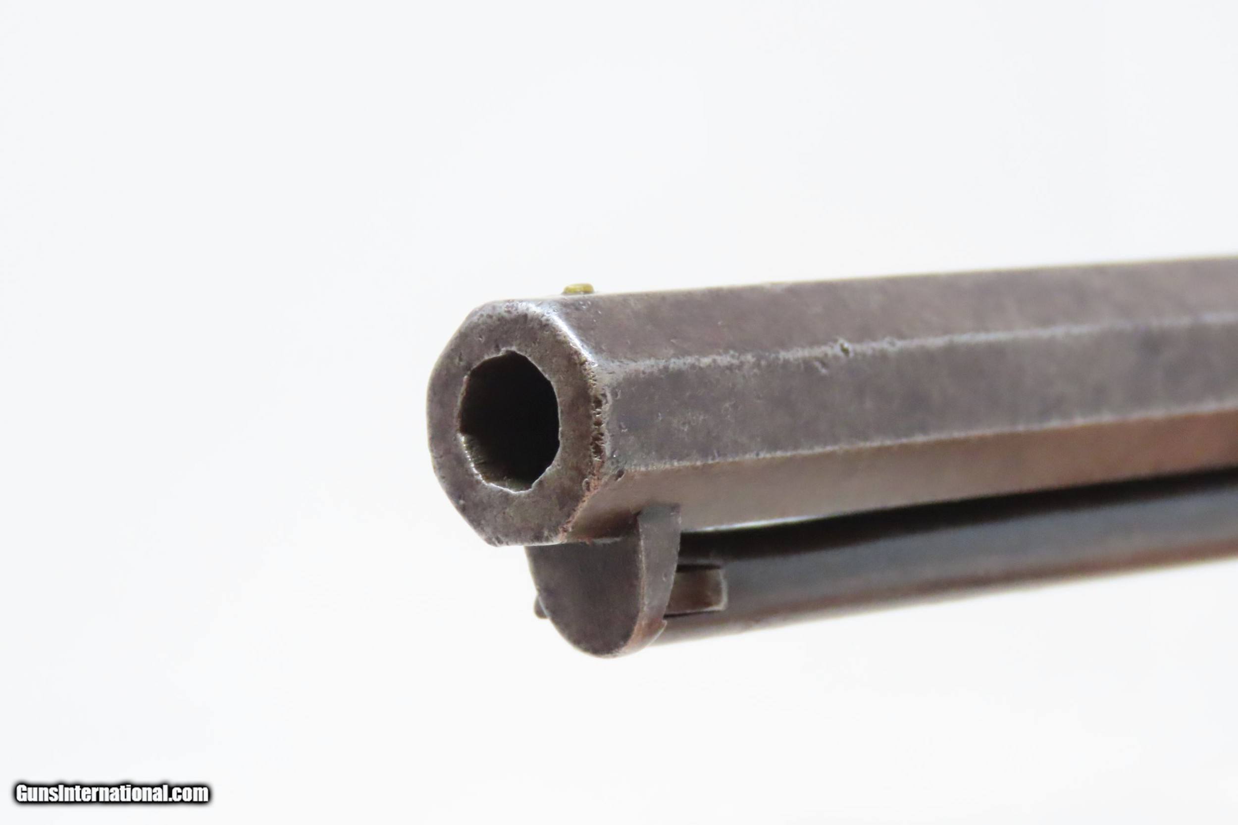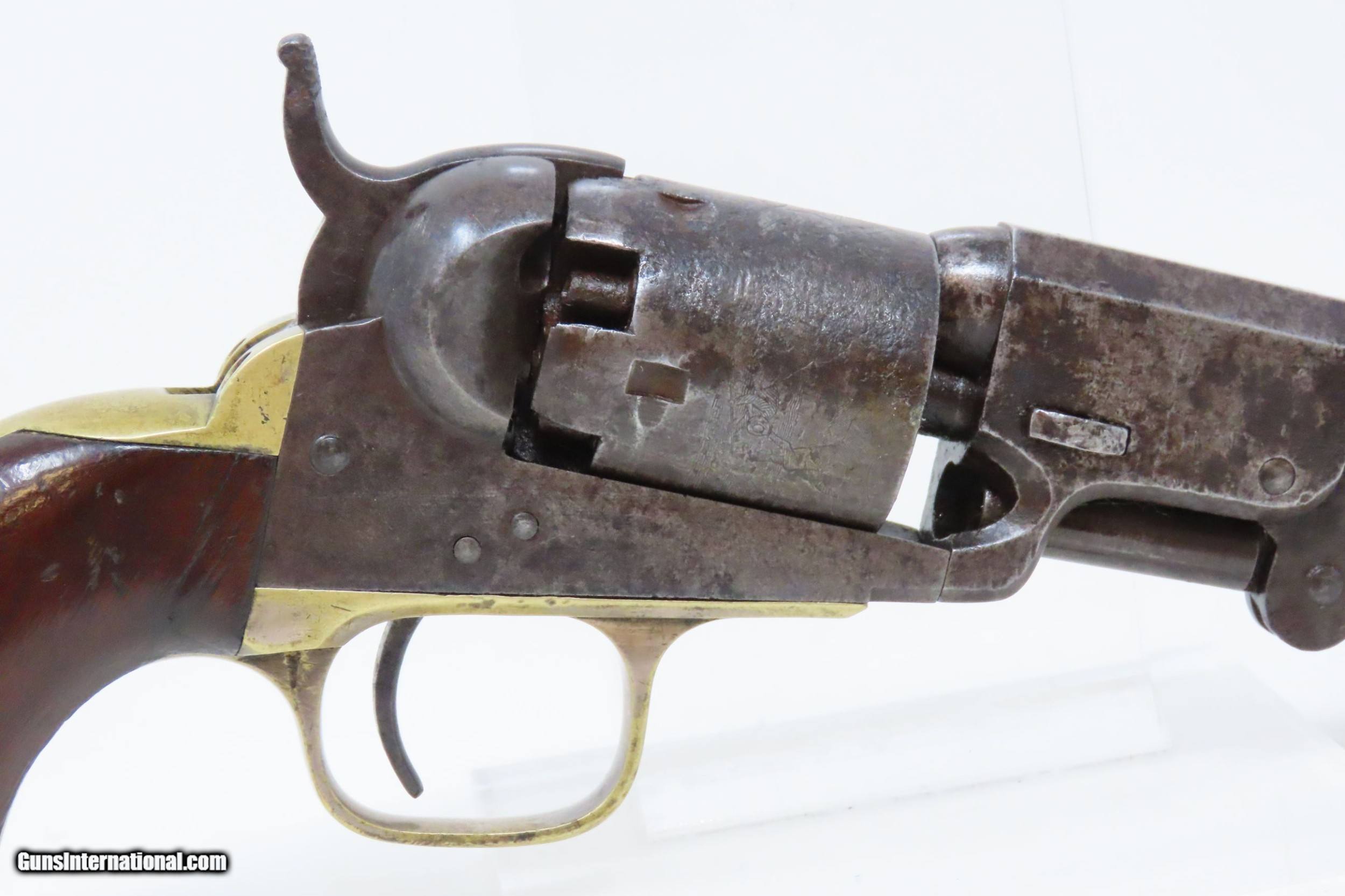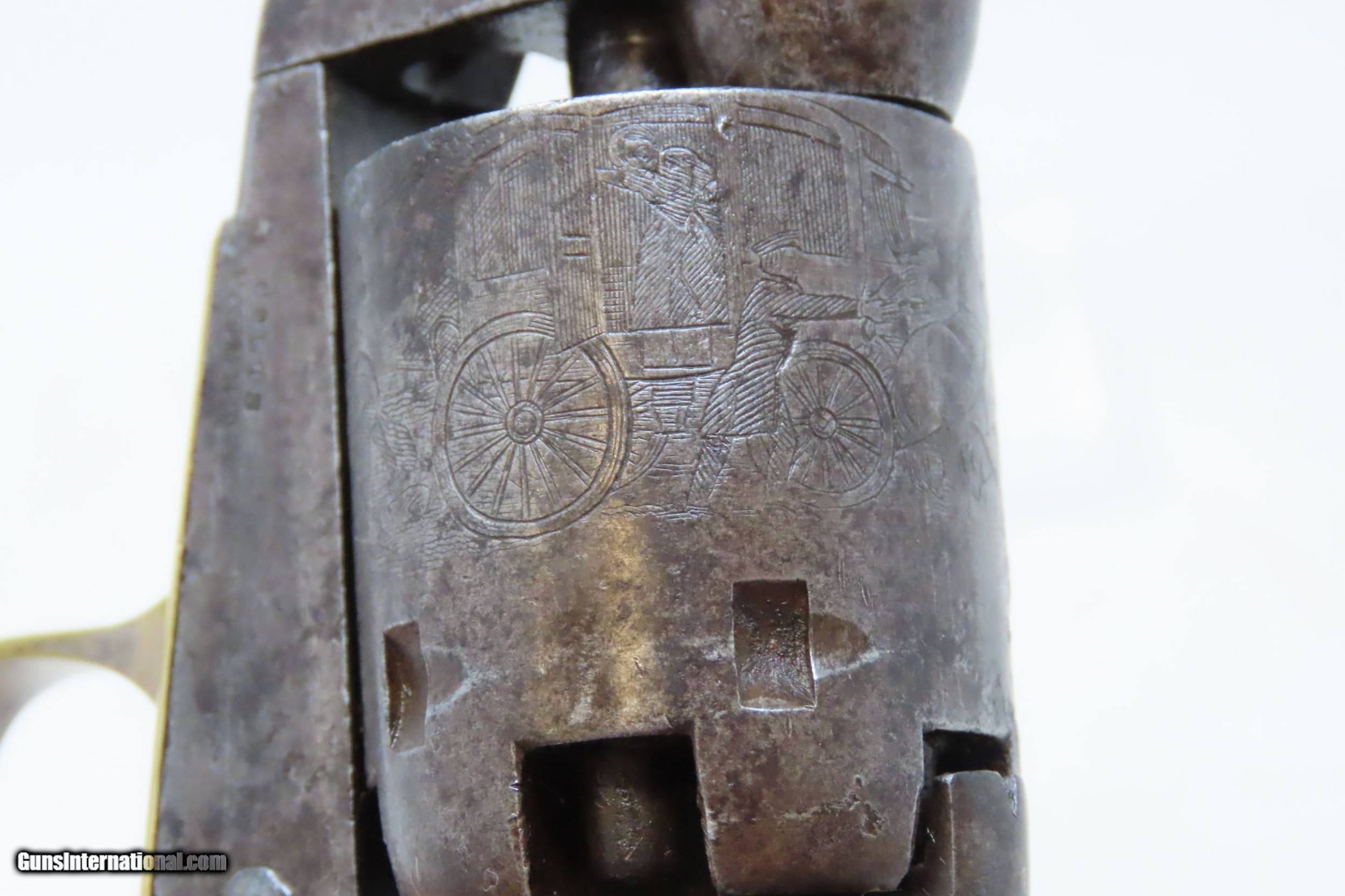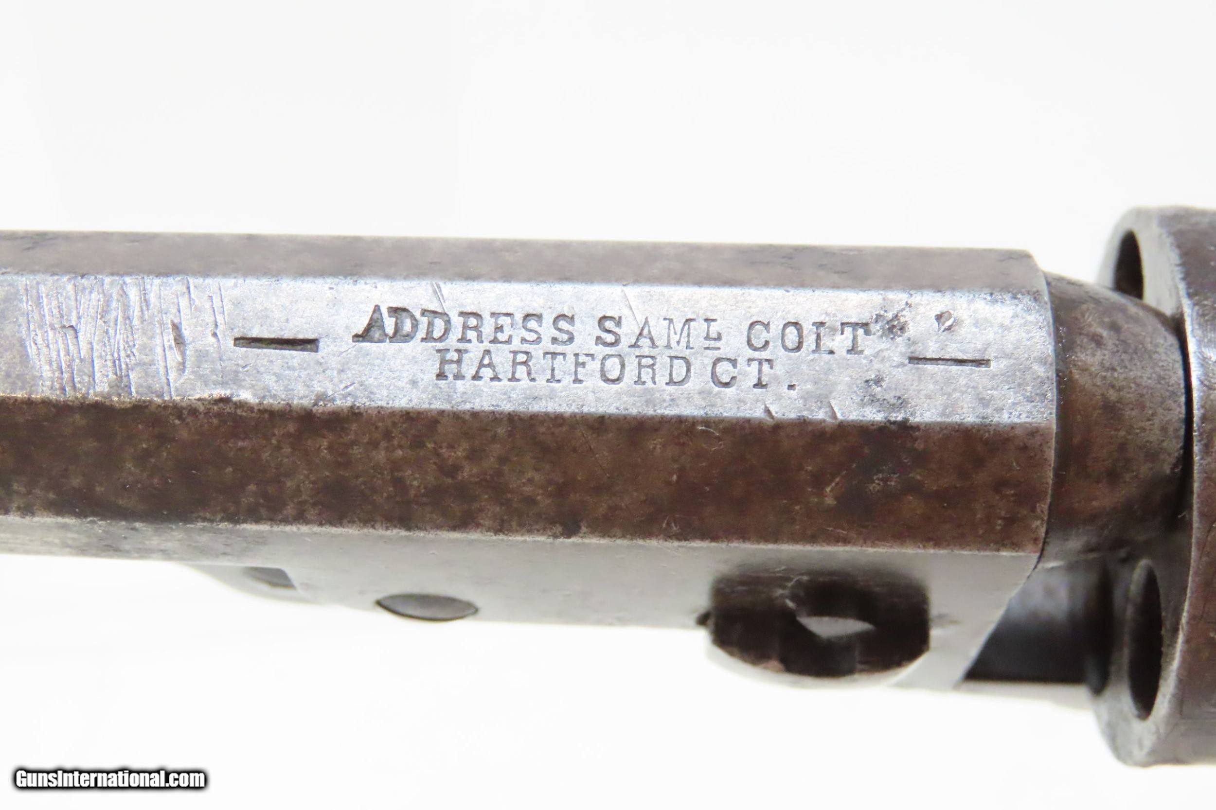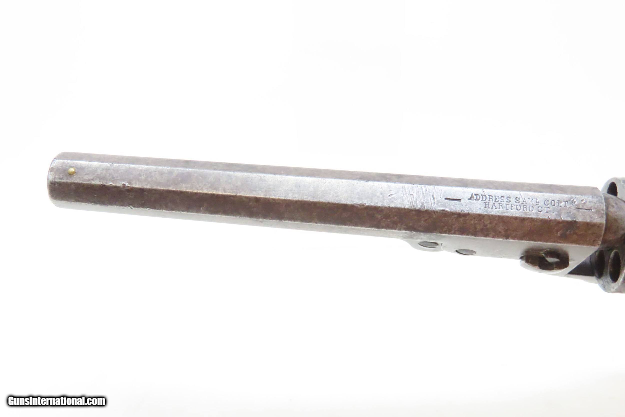 Description: CIVIL WAR Era Antique COLT Model 1849 POCKET .31 Cal. PERCUSSION Revolver HARTFORD, CONNECTICUT Manufactured in 1860 Here we present an antique percussion Colt Model 1849 Pocket Revolver, made in 1860 in Hartford, Connecticut. The Model 1849 Pocket, the replacement for the Baby Dragoon, was the most widely produced of any Colt percussion pistol. Nearly 340,000 were manufactured during its 23-year production run that ended in 1873. Over 280,000 of these were produced by Colt’s factory at Hartford by the end of the American Civil War in 1865. These were very popular and saw a lot of use on the battlefield, on the home front and in the West. These were some of the smallest, handiest pocket revolvers of the time. One of the most aesthetically pleasing aspects of the 1849 Pocket is its cylinder scene. Cylinder scenes during this period were common, especially for Colt, not only for their visual appeal, but because it made a revolver more difficult to forge. The scene on the 1849 Pocket is that of a stagecoach robbery. The focal point is the stagecoach drawn by four horses. A woman in a dress is seen framed in the doorway of the side of the coach. The driver is standing alongside wielding his pistol against multiple assailants as the horses rear and struggle against their harnesses. Several of the bandits lay dying on the ground, one tries to control the horses, two are running away and one is in the process of falling dead after being shot. Not a bad way to show interested buyers what a pistol like this would be good for. It did a fine job as a self-defense handgun for the average citizen in 19th Century America. The overall condition is good. Original patina. The cylinder scene remains visible. The numbers match with the exception of the barrel wedge. The action is excellent. The bore is in good shape with strong rifling. The grip has seen some scuffing on the left side that has been smoothed over with continued use. Also on the left side where the grip meets the frame the walnut is chipped. Own the original! This is a legitimate antique and not a reproduction. Barrel is 6 inches. Caliber: .31 Percussion Overall condition as seen in photos. Very Fast. Very Safe. FREE SHIPPING WORLDWIDE. Delivered directly to your door by express mail! Guaranteed AUTHENTIC & Includes CERTIFICATE OF AUTHENTICITY. ancestryguns $1800 #226071 SOLD Antique: Yes |