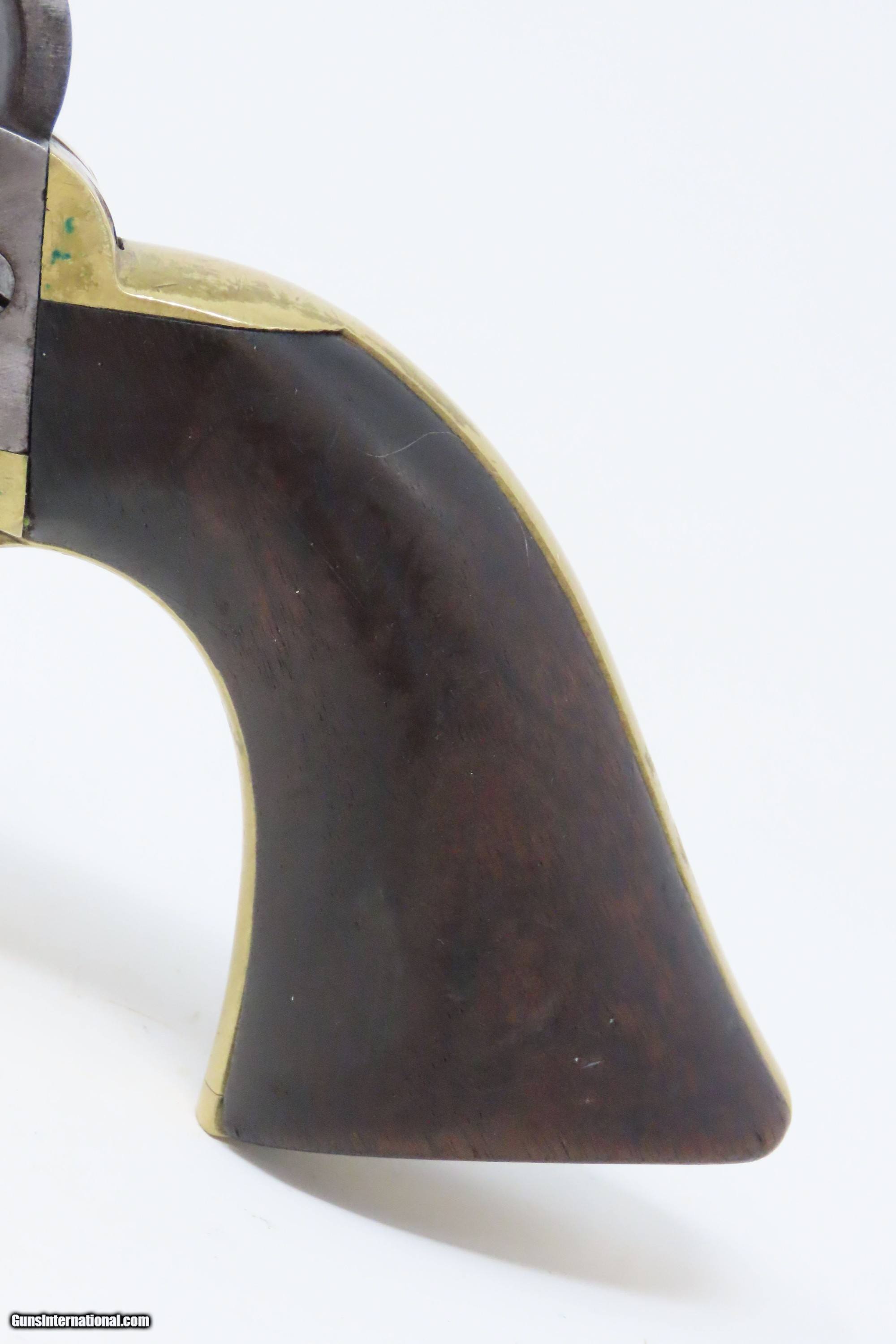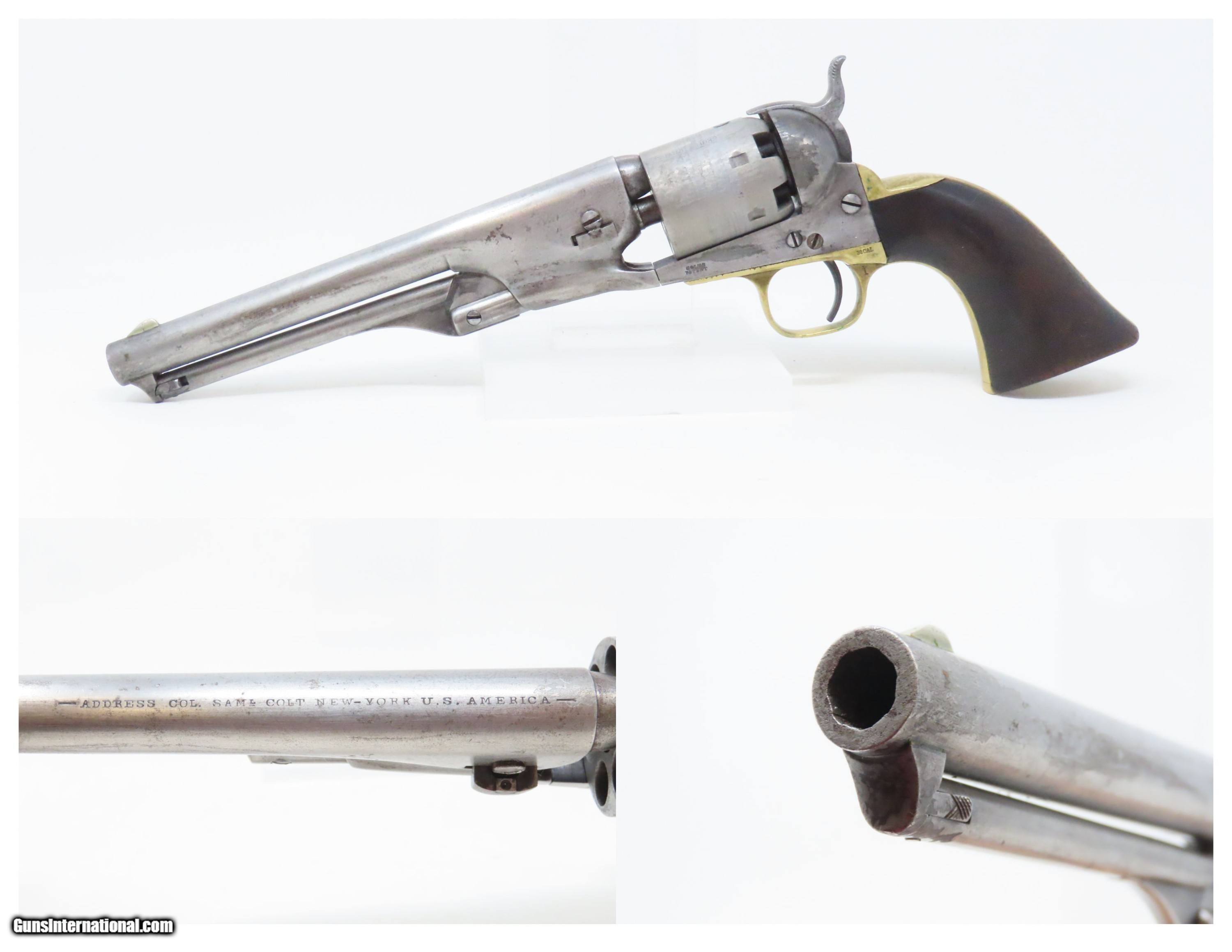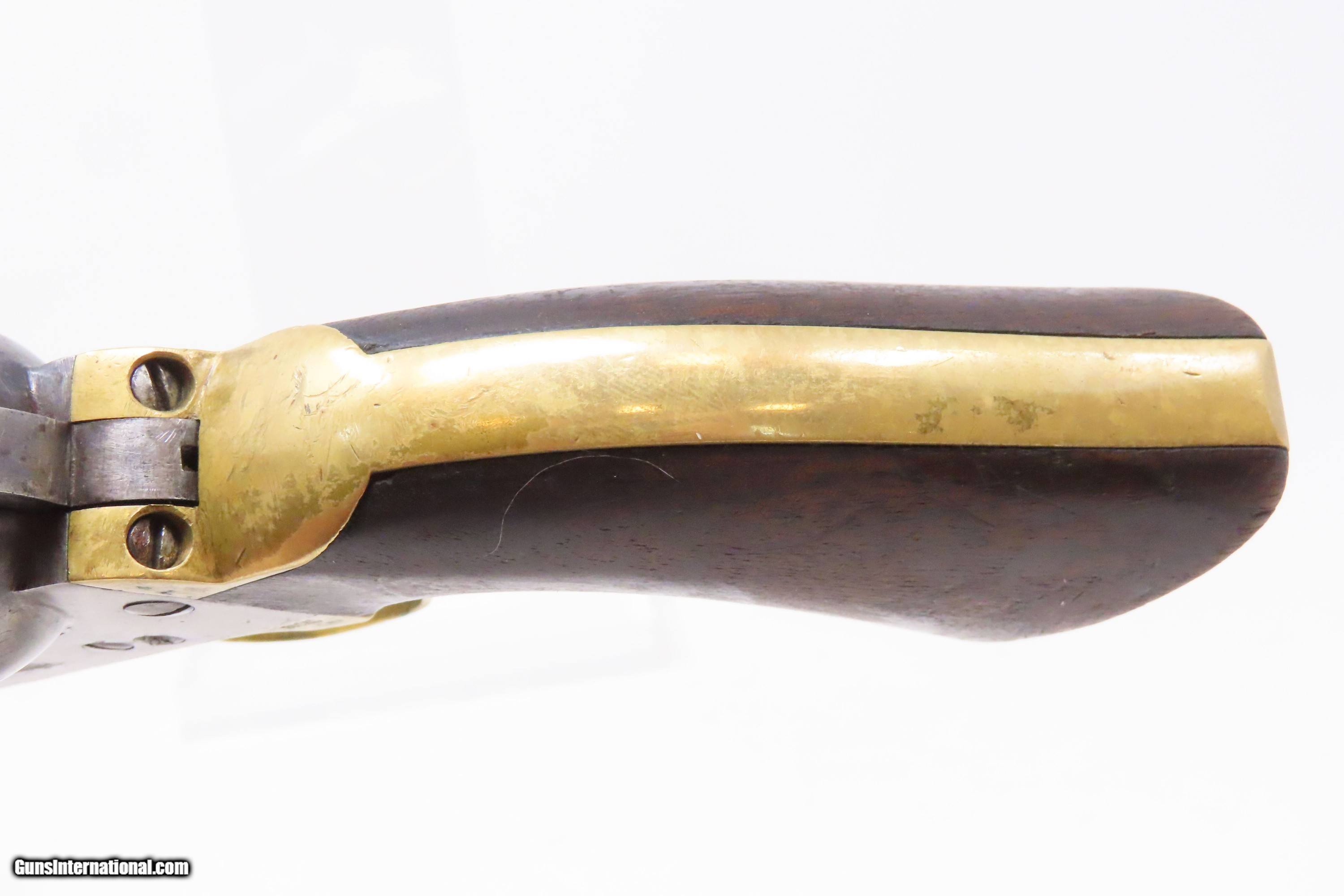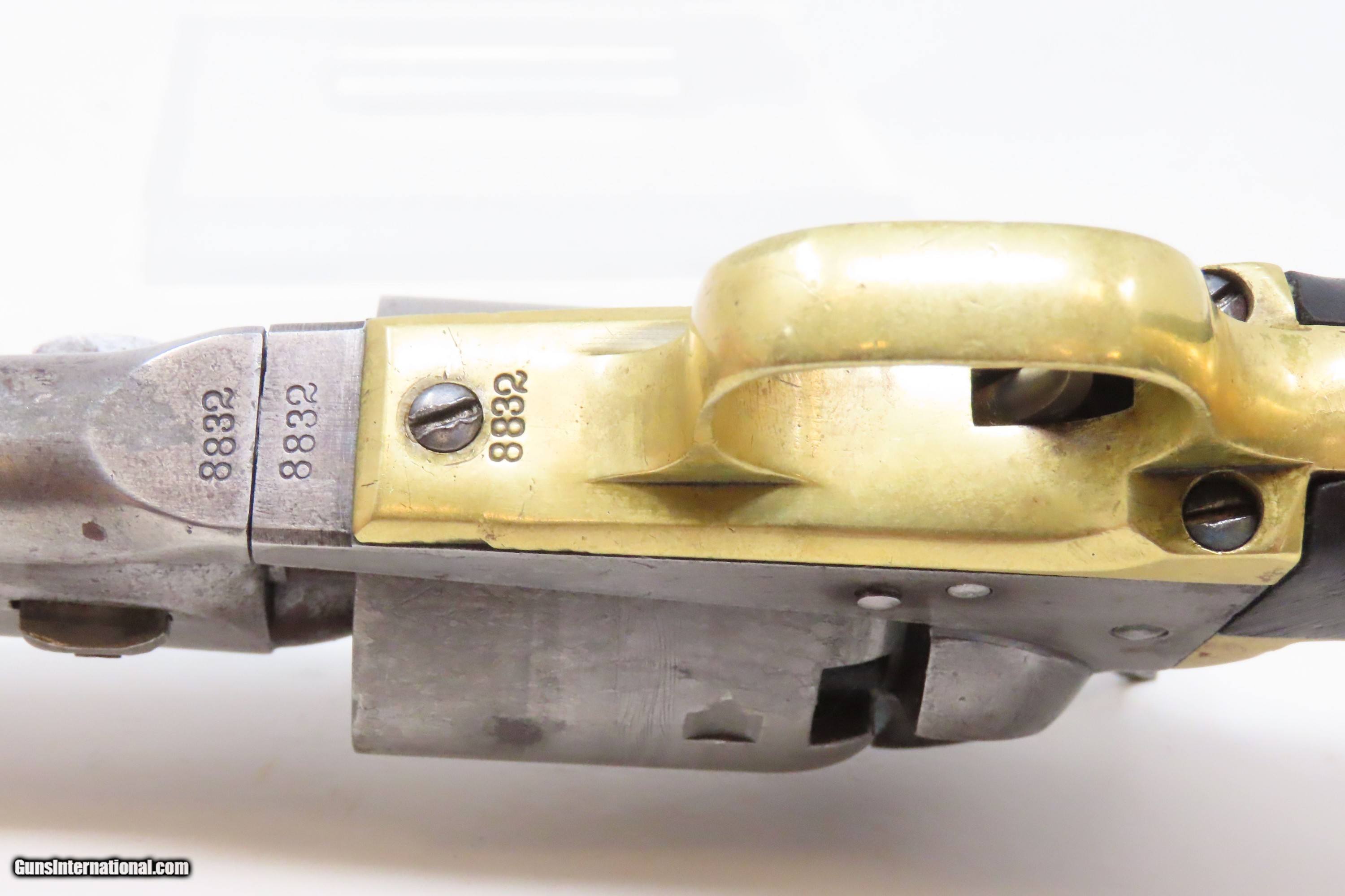 Description: CIVIL WAR Era Antique COLT Model 1861 NAVY .36 Caliber PERCUSSION Revolver Produced in 1862 During the AMERICAN CIVIL WAR Here we present an antique Colt Model 1861 Navy Percussion Revolver, made in 1862 early in the American Civil War. The introduction of the 1861 Navy was simply an update to the very successful 1851 Navy, with the primary differences being the round barrel instead of octagonal, and the addition of the creeping style of loading lever. These updates made for a sleek package that very much resembled Colt’s crowning achievement, the 1860 Army. The 1861 Navy still retained its .36 caliber, making this the preferred firearm for many not wanting to step up to a .44 like the Army, while still sharing most of its dimensions. The Colt Model 1861 Navy was formally adopted by the Union government and was used by both the Army and the Navy. Many of those sold to the military were never martially inspected or marked. Of course, there was a healthy commercial market for these during the war, and many soldiers privately purchased these revolvers as well. In a slightly smaller and lighter package than its 1860 Army big brother, many soldiers and cavalry preferred the Navy in .36 caliber. Of course, these weapons continued to be used well after the Civil War, especially during Westward Expansion. The overall condition is very good. Cleaned. The cylinder scene is still quite visible. The numbers match. The action is excellent. The bore is in very good condition with bright lands and strong rifling throughout. The grip is solid. A nice piece! Own the original! This is a legitimate antique and not a reproduction. Barrel is 7-1/2 inches. Caliber: .36 Percussion Overall condition as seen in photos. Very Fast. Very Safe. FREE SHIPPING WORLDWIDE. Delivered directly to your door by express mail! Guaranteed AUTHENTIC & Includes CERTIFICATE OF AUTHENTICITY. ancestryguns $2700 #227837 SOLD Antique: Yes |