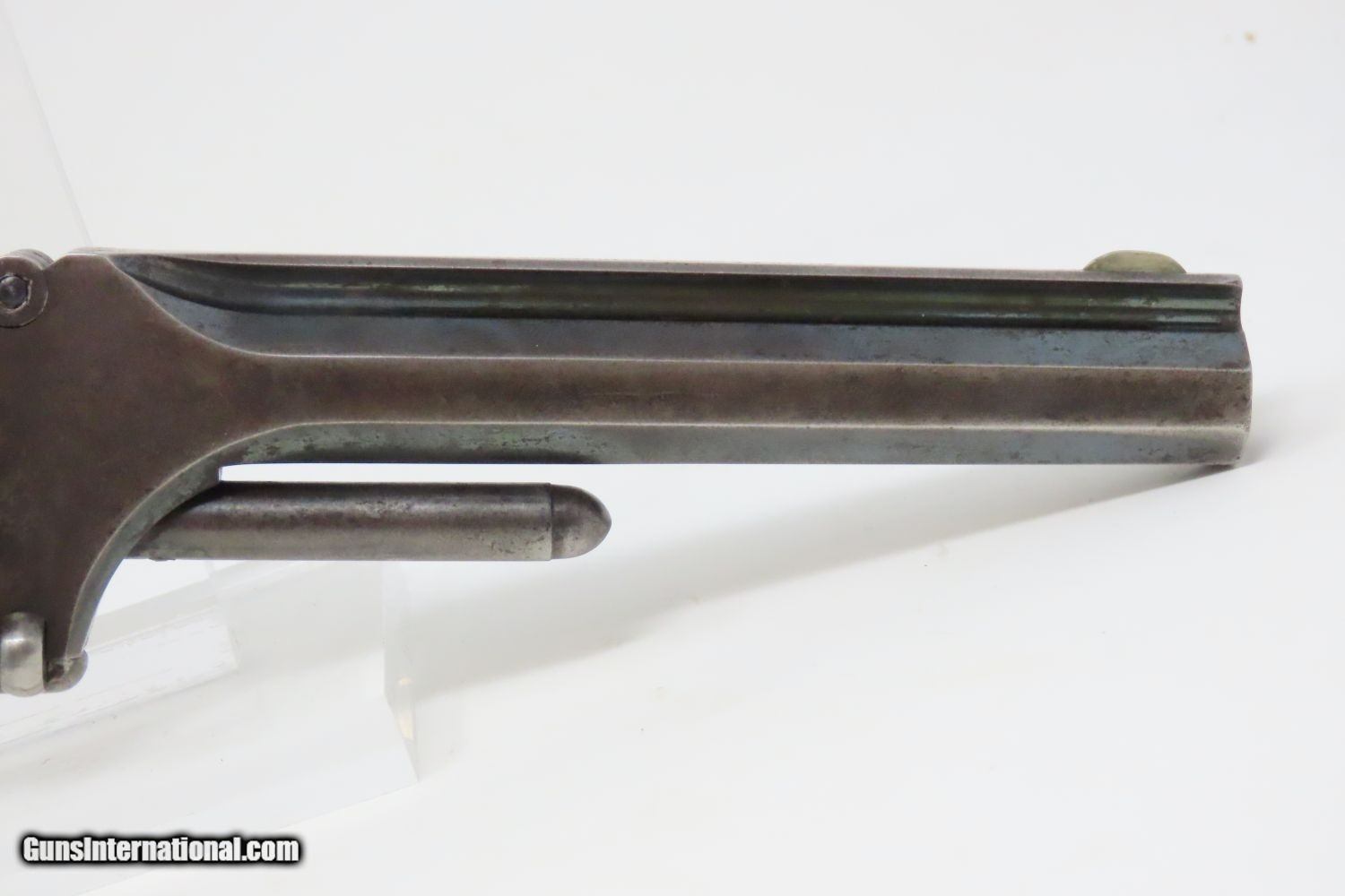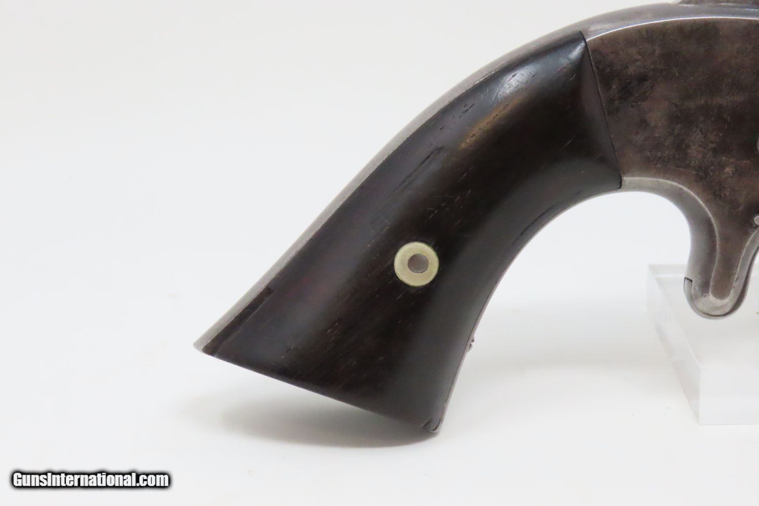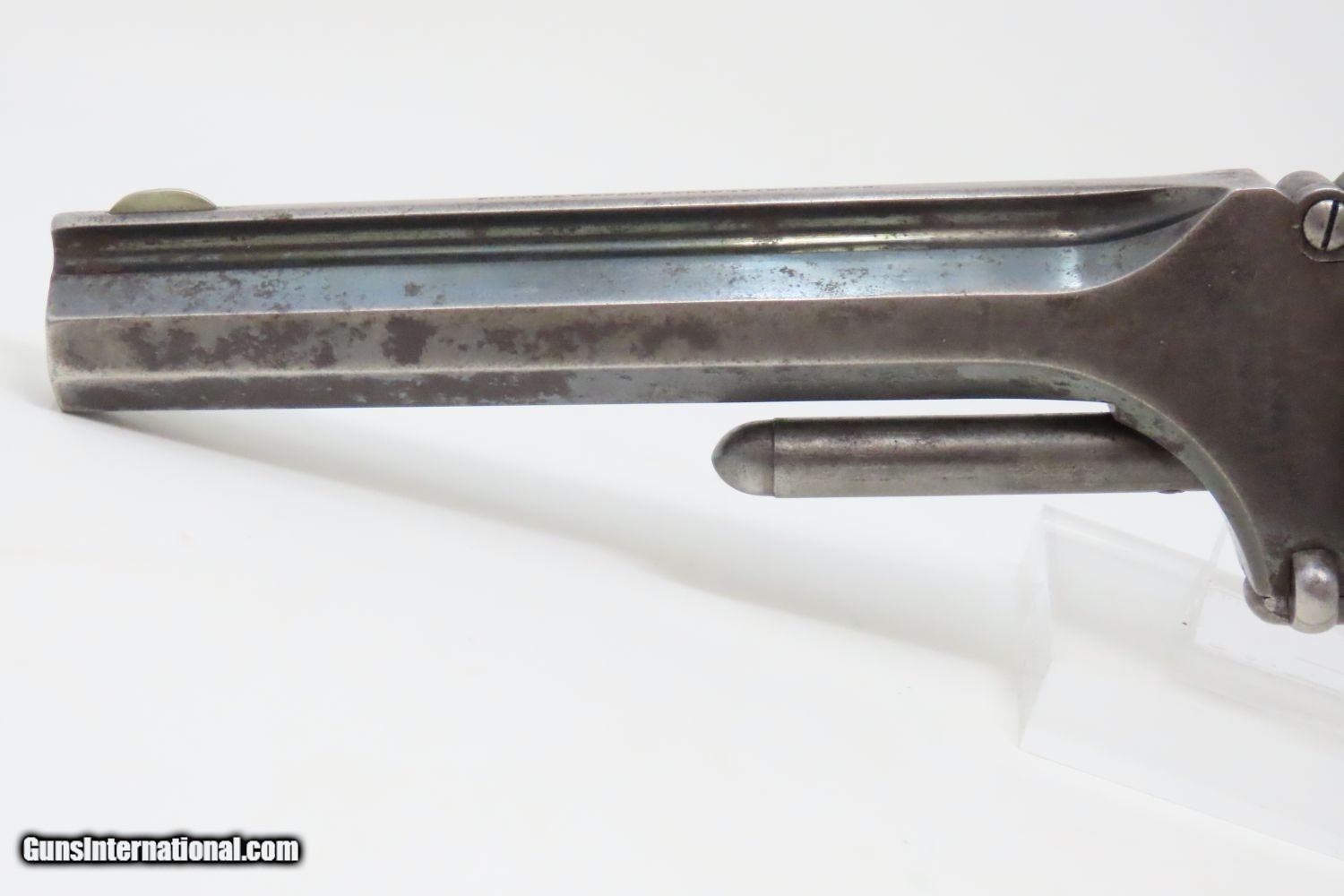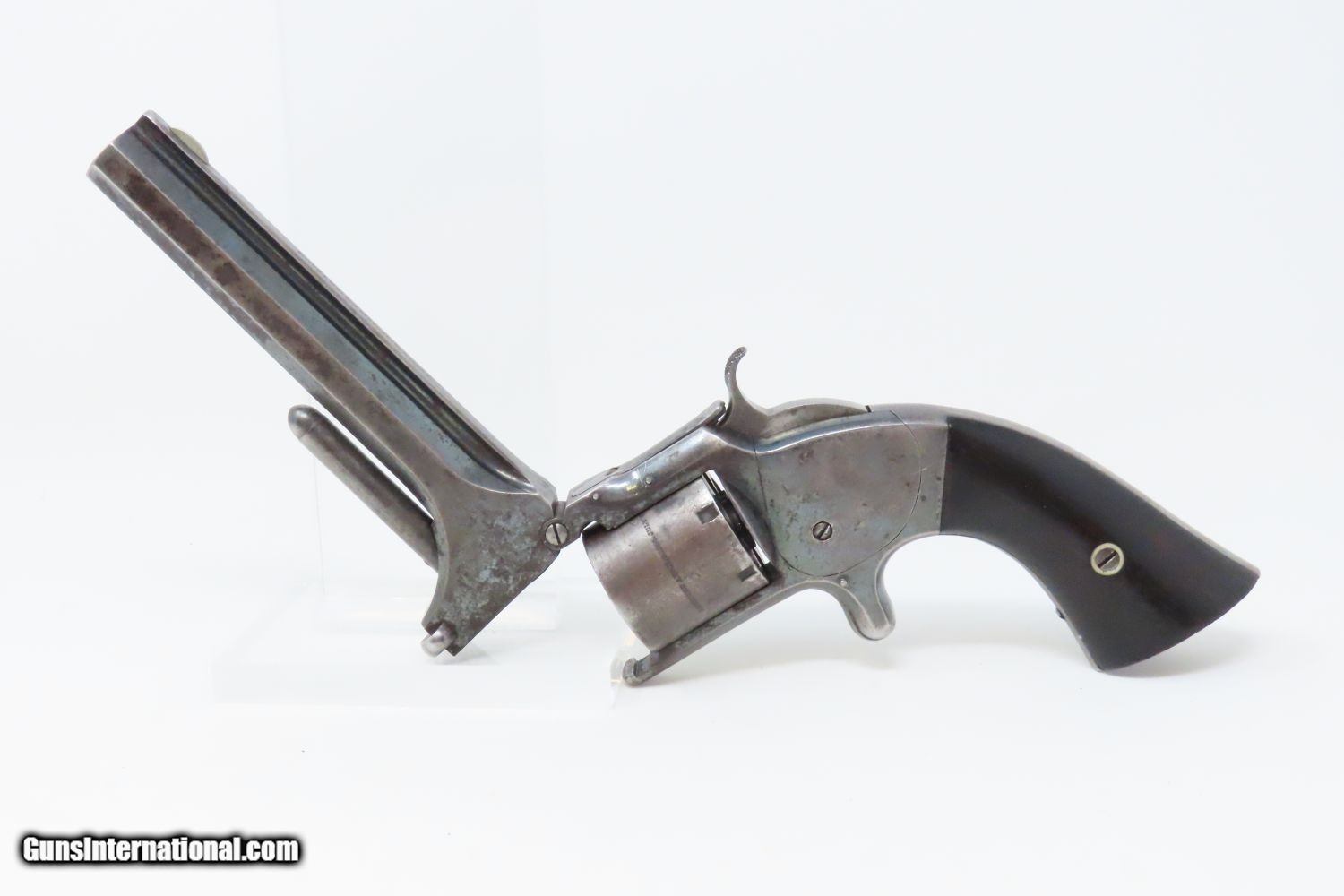 Description: CIVIL WAR Era Antique SMITH & WESSON No. 2 “OLD ARMY” .32 Caliber Revolver Made During the Civil War Era Circa 1861 Here we present an antique Smith & Wesson Model No. 2 Old Army Revolver, made circa 1861 in Springfield, Massachusetts. Smith & Wesson purchased the rights to the Rollin White patent for the bored through cylinder, which would forever change the development of revolving firearms. Beginning in 1857 they produced the Number 1, a 7-shot .22 rimfire pocket pistol, which was quite successful. This was fine for the commercial market, but S&W knew they could scale up their design for a pistol that could be worn on the belt in a holster. They began shipping their Number 2 “Army” Revolver, a 6-shot .32 caliber, just 2 months after the beginning of the American Civil War. Smith & Wesson continued to leverage their patent well beyond the war and they remained very popular with the public and on the frontiers. There was a total of 77,200 of these revolvers made during their production run from 1861 through 1874. Though it never received any large federal contracts, it was adopted at the state, unit and individual levels. Per Charles Pate, Kentucky ordered 731 Number 2 “Armies” from Kittredge & Co. late in 1862, and even more in 1863. He says that “Most, if not all, of the revolvers used to fill the Kentucky order were almost certainly under 10,000 in serial number.” He also lists individuals and units that used these revolvers, per records and personal correspondence. The 7th Kentucky Cavalry appears to be the only unit officially issued this handgun during the war. Among the most famous of users was future U.S. President Rutherford B. Hayes, who began his part in the war as Lieutenant Colonel and ended it with Brevet Brigadier General. Ulysses S. Grant wrote about him “his conduct on the field was marked by conspicuous gallantry as well as the display of qualities of a higher order than that of mere personal daring." Another name and legend from the Civil War who used the Number 2 was General George Armstrong Custer, who owned a pair of them. “Wild Bill” Hickok wore this gun the night he was assassinated while playing cards, his last hand now called the “Dead Man’s Hand” of Black Aces and 8s. The overall condition is very good. Great blue and silver finish. The action (hammer/trigger) is strong, although the cylinder does not index and lock up. The bore is bright in great shape. The grips are seated firmly with a sliver out of the back of the right panel. One of the first Smith & Wesson revolvers ever made, and just in time for the American Civil War! Own the original! This is a legitimate antique and not a reproduction. Barrel is 5 inches. Caliber: .32 Long Rimfire Overall condition as seen in photos. Very Fast. Very Safe. FREE SHIPPING WORLDWIDE. Delivered directly to your door by express mail! Guaranteed AUTHENTIC & Includes CERTIFICATE OF AUTHENTICITY. ancestryguns $1795 #201005 SOLD Antique: Yes |
