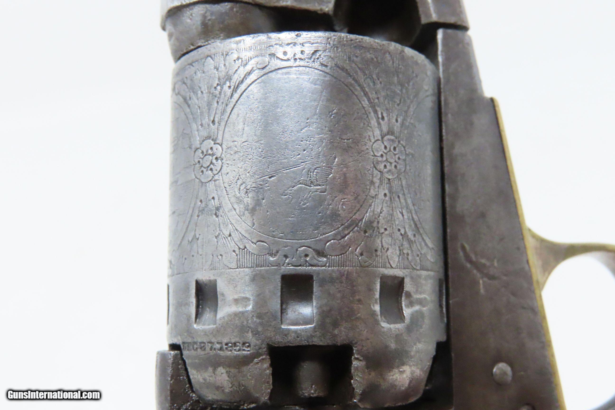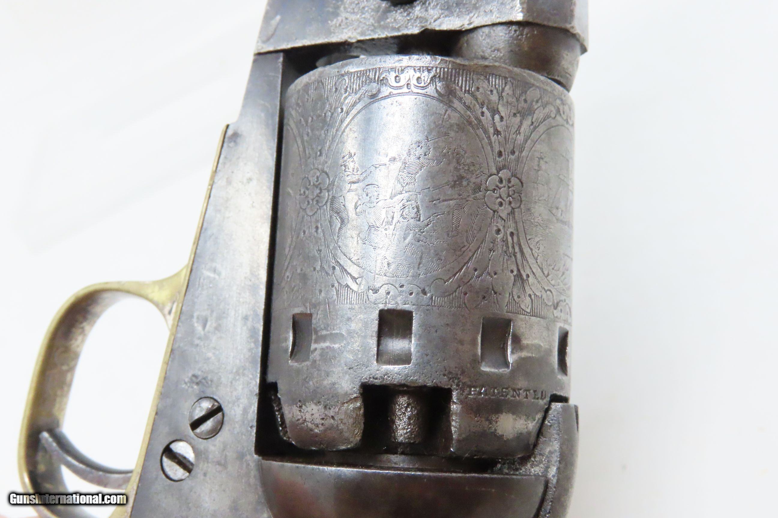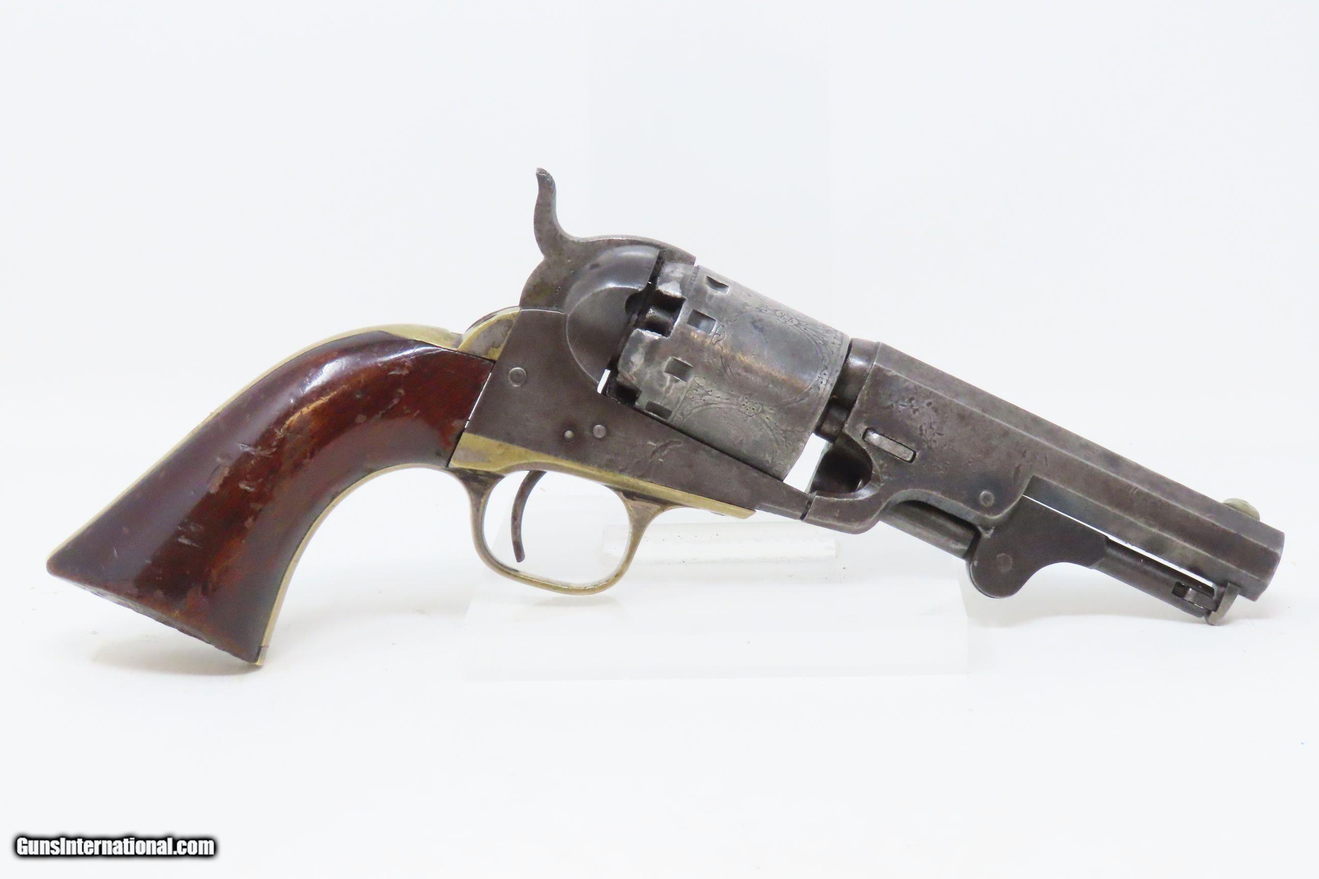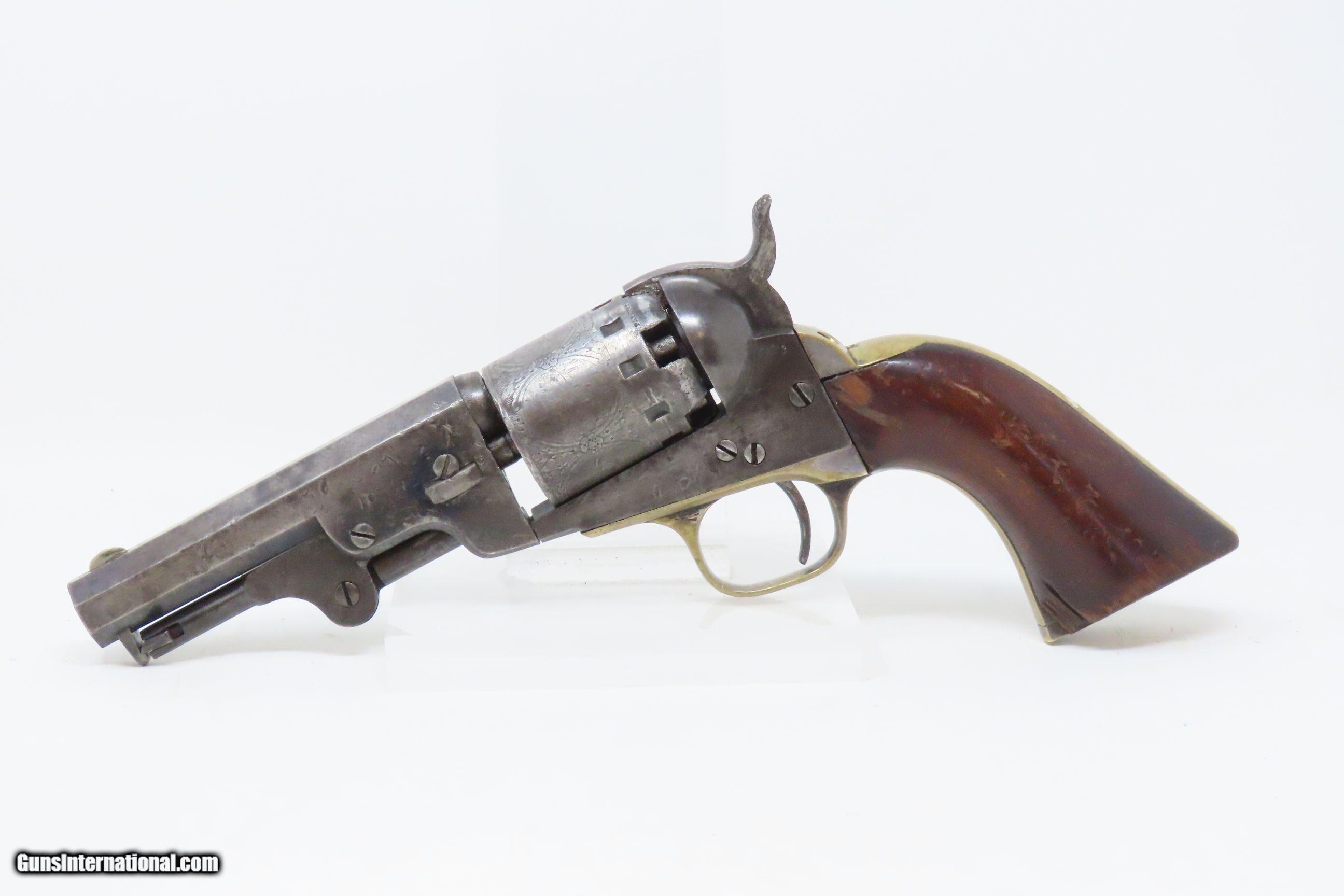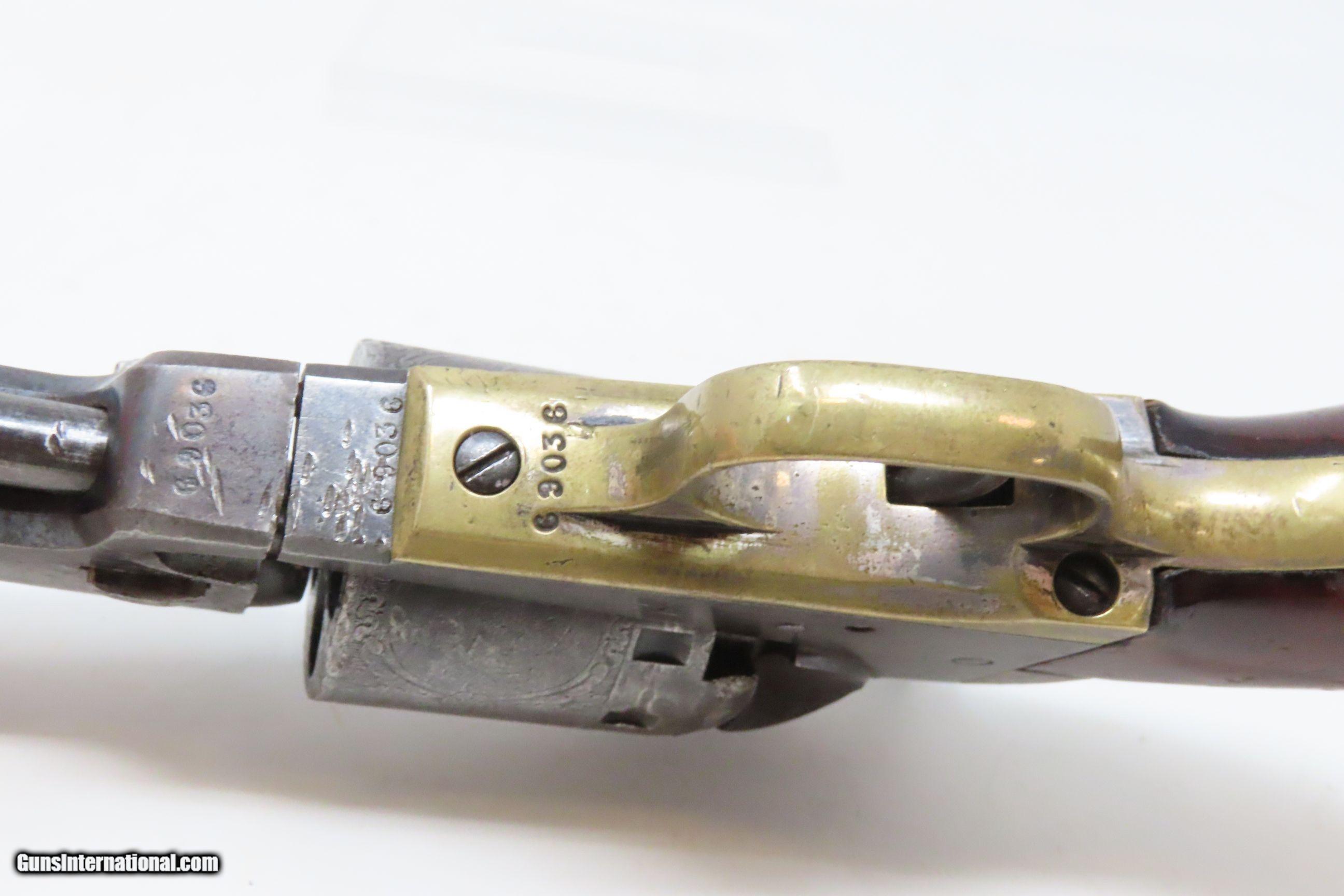Description: CIVIL WAR Era MANHATTAN FIRE ARMS CO. Series IV Percussion “NAVY” Revolver With Multi-Panel ENGRAVED CYLINDER SCENE Here we present an antique Manhattan Arms Fourth Series Percussion Pocket Revolver, made circa 1866 in Newark, New Jersey with roughly 24,000 of these 4th Series revolvers made during a production run between April 1864 to June 1867. Serial numbers ranged between 45,200 and 69,200 in this series. Manhattan Fire Arms Co. was founded in 1856 specifically to capitalize on the soon to be expiring Colt patents in 1857. This strategy worked very well for the company and they began by making high quality and very close copies of both Colts and other popular pistols with expired patents. These revolvers greatly resemble the Colt Model 1849 Pocket and 1851 Navy revolvers. In fact, Manhattan’s copies of Colts were so close that Colt tried to kill their production with a lawsuit, even though their patent had expired. There were roughly 80,000 total revolvers made throughout the production run of Series One through Series Five. Series I through Series IV were all five-shot revolvers while the Series V (with its tapered loading lever) was of six-shot. All were, however, chambered for the .36 ball cartridge. Manhattan’s revolvers were very well received by the public. The company never received U.S. military contracts, except for a small delivery, most likely on the regimental level. Nevertheless, many Manhattan revolvers found themselves on smoky Civil War battlefields, purchased privately by officers and soldiers, and they were certainly in use at home. The war created a vast and unquenchable market for firearms of all types. The overall condition is very good. Some original finish remains in low handled areas. Much of the cylinder scene remains. Excellent, tight action. The bore is bright with some scattered pitting. Legible markings. Good grip. Numbers match. The left backstrap screw is missing. Here we have a wonderful example of a late Civil War manufactured percussion revolver to collect and display! Own the original! This is a legitimate antique and not a reproduction. Barrel is 4 inches. Caliber: .36 Percussion Overall condition as seen in photos. Very Fast. Very Safe. FREE SHIPPING WORLDWIDE. Delivered directly to your door by express mail! Guaranteed AUTHENTIC & Includes CERTIFICATE OF AUTHENTICITY. ancestryguns $1750 #230047 SOLD Antique: Yes |