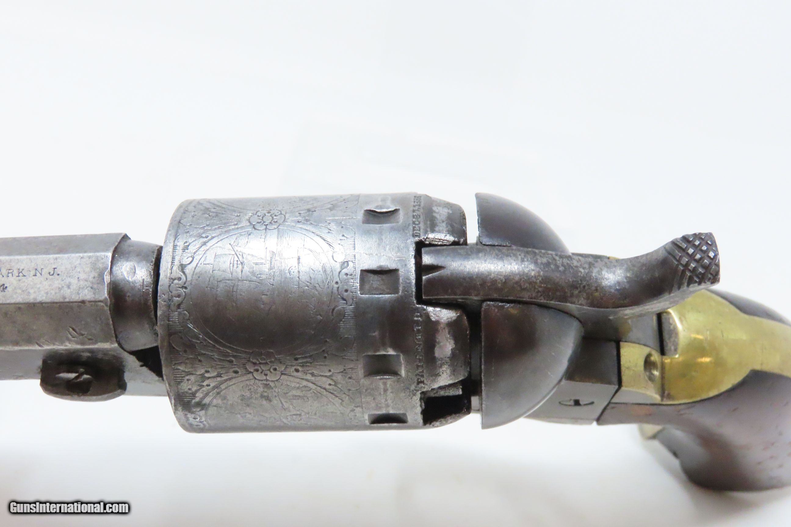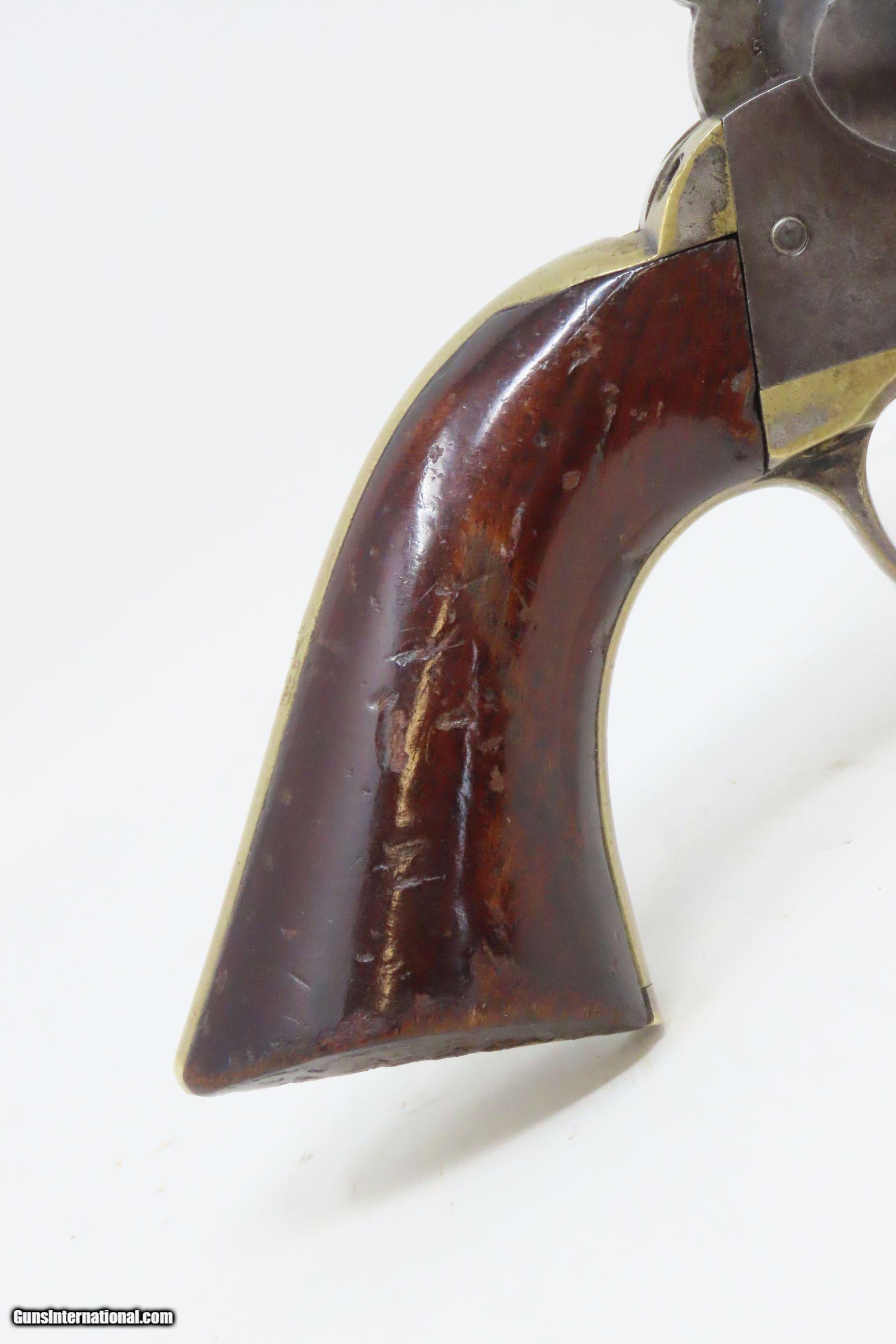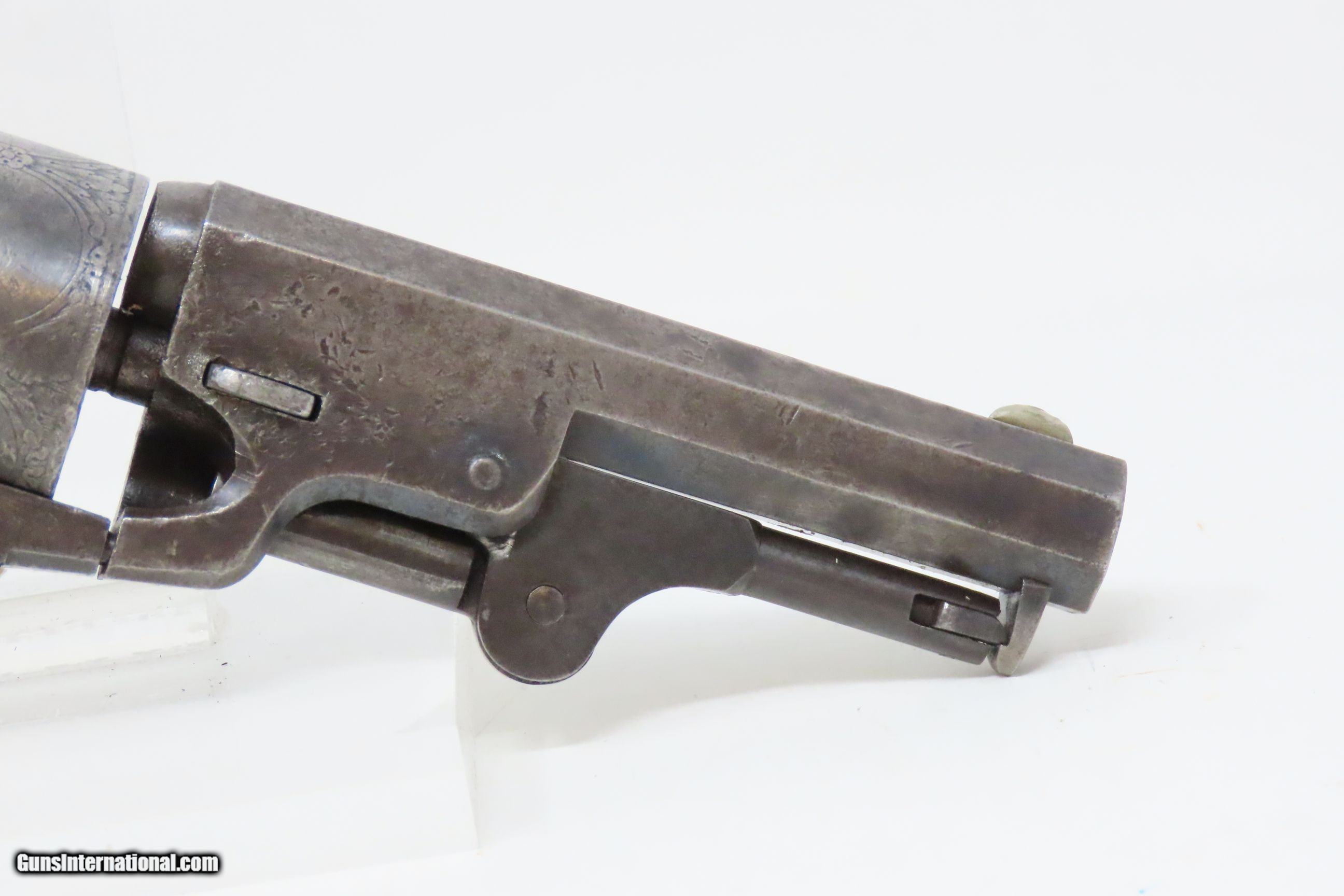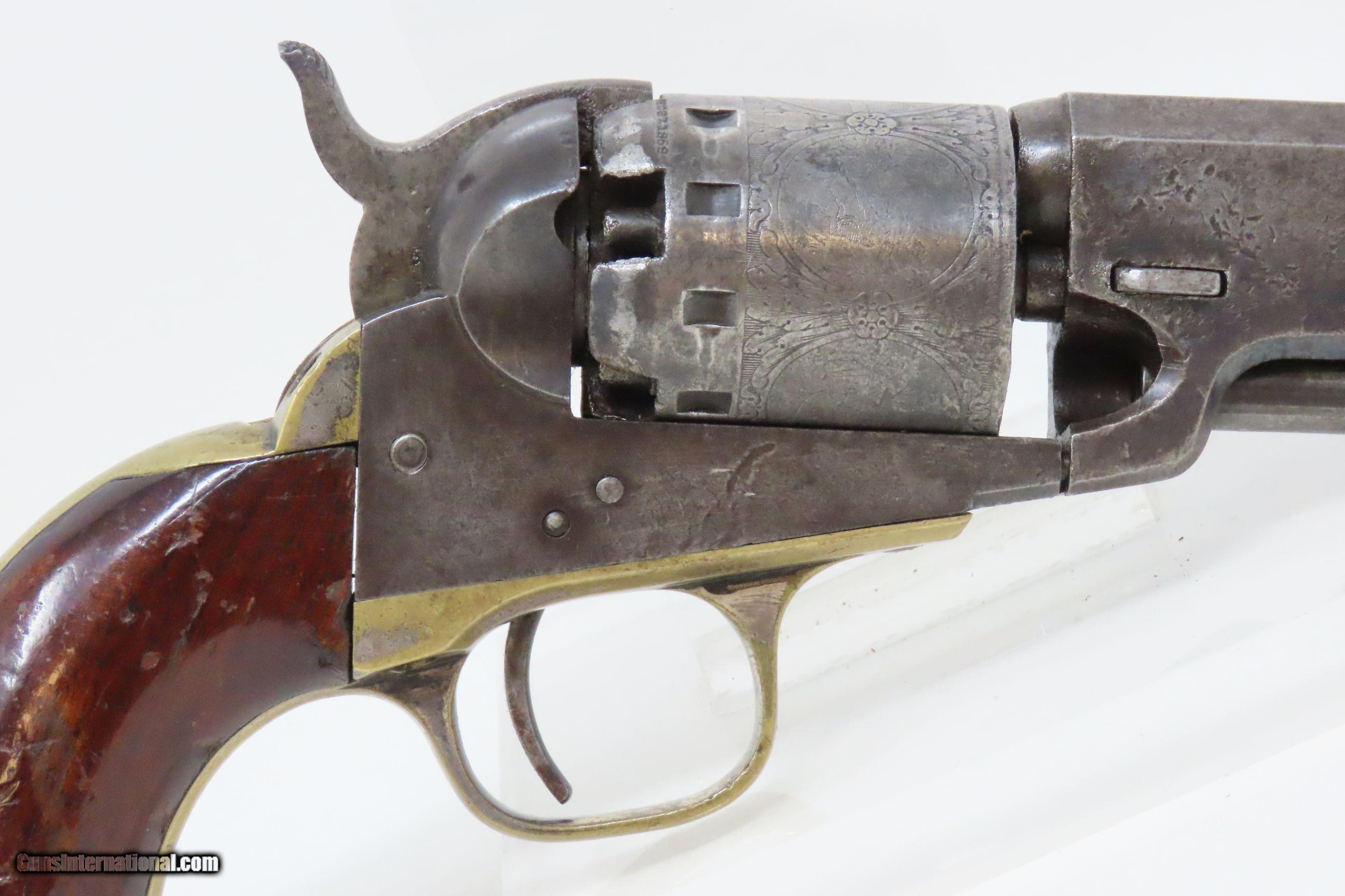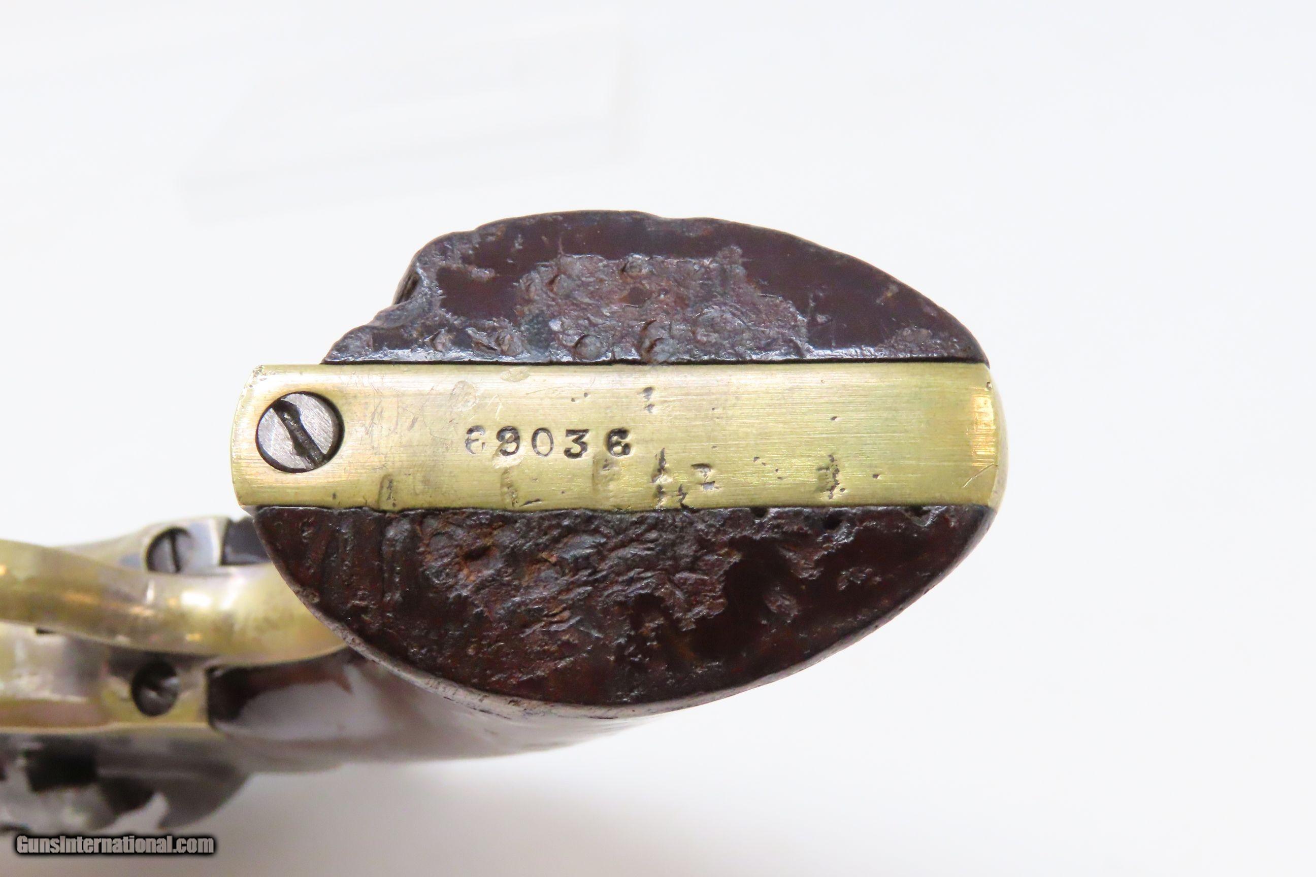 Description: CIVIL WAR Era MANHATTAN FIRE ARMS CO. Series IV Percussion “NAVY” Revolver With Multi-Panel ENGRAVED CYLINDER SCENE Here we present an antique Manhattan Arms Fourth Series Percussion Pocket Revolver, made circa 1866 in Newark, New Jersey with roughly 24,000 of these 4th Series revolvers made during a production run between April 1864 to June 1867. Serial numbers ranged between 45,200 and 69,200 in this series. Manhattan Fire Arms Co. was founded in 1856 specifically to capitalize on the soon to be expiring Colt patents in 1857. This strategy worked very well for the company and they began by making high quality and very close copies of both Colts and other popular pistols with expired patents. These revolvers greatly resemble the Colt Model 1849 Pocket and 1851 Navy revolvers. In fact, Manhattan’s copies of Colts were so close that Colt tried to kill their production with a lawsuit, even though their patent had expired. There were roughly 80,000 total revolvers made throughout the production run of Series One through Series Five. Series I through Series IV were all five-shot revolvers while the Series V (with its tapered loading lever) was of six-shot. All were, however, chambered for the .36 ball cartridge. Manhattan’s revolvers were very well received by the public. The company never received U.S. military contracts, except for a small delivery, most likely on the regimental level. Nevertheless, many Manhattan revolvers found themselves on smoky Civil War battlefields, purchased privately by officers and soldiers, and they were certainly in use at home. The war created a vast and unquenchable market for firearms of all types. The overall condition is very good. Some original finish remains in low handled areas. Much of the cylinder scene remains. Excellent, tight action. The bore is bright with some scattered pitting. Legible markings. Good grip. Numbers match. The left backstrap screw is missing. Here we have a wonderful example of a late Civil War manufactured percussion revolver to collect and display! Own the original! This is a legitimate antique and not a reproduction. Barrel is 4 inches. Caliber: .36 Percussion Overall condition as seen in photos. Very Fast. Very Safe. FREE SHIPPING WORLDWIDE. Delivered directly to your door by express mail! Guaranteed AUTHENTIC & Includes CERTIFICATE OF AUTHENTICITY. ancestryguns $1750 #230047 SOLD Antique: Yes |
