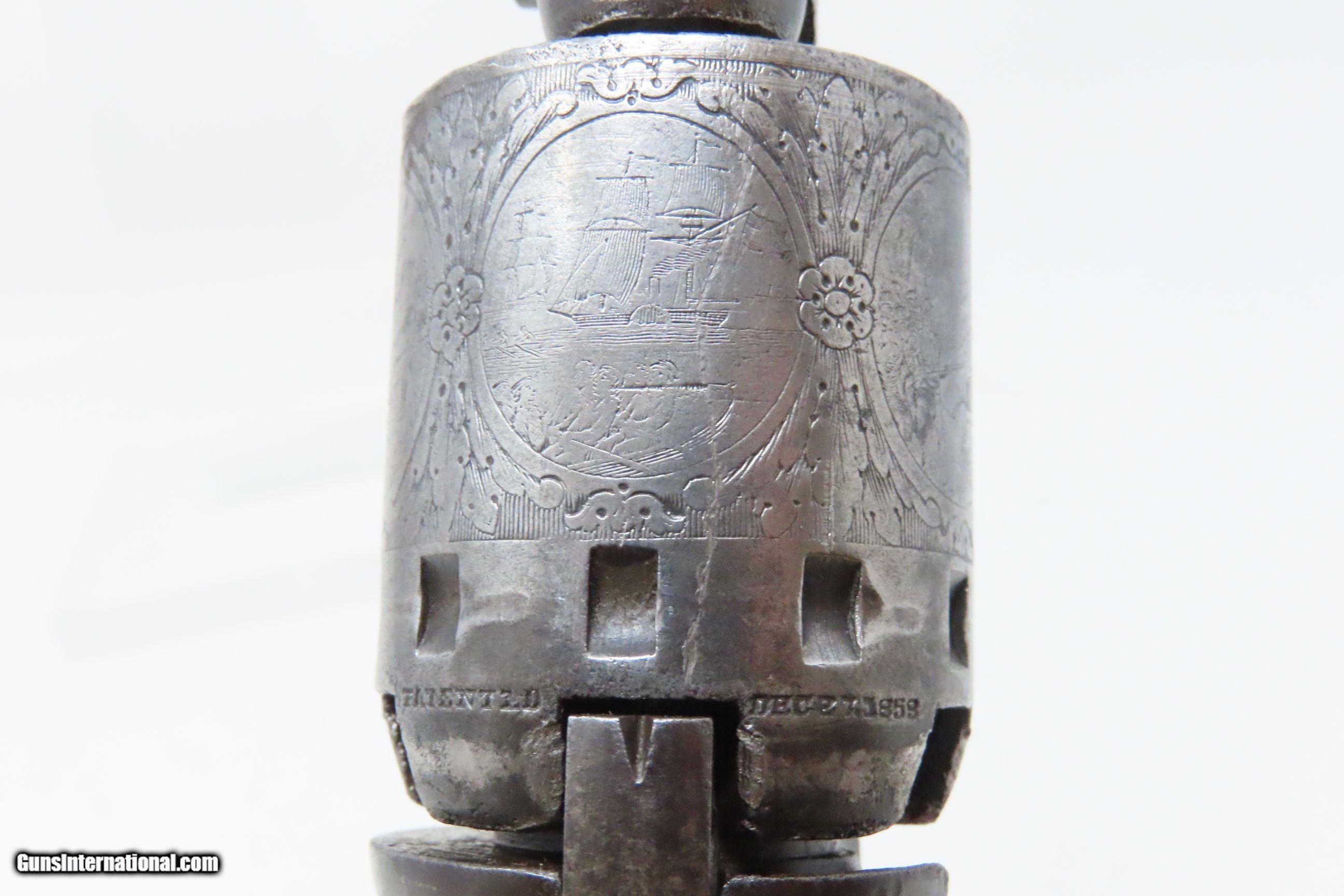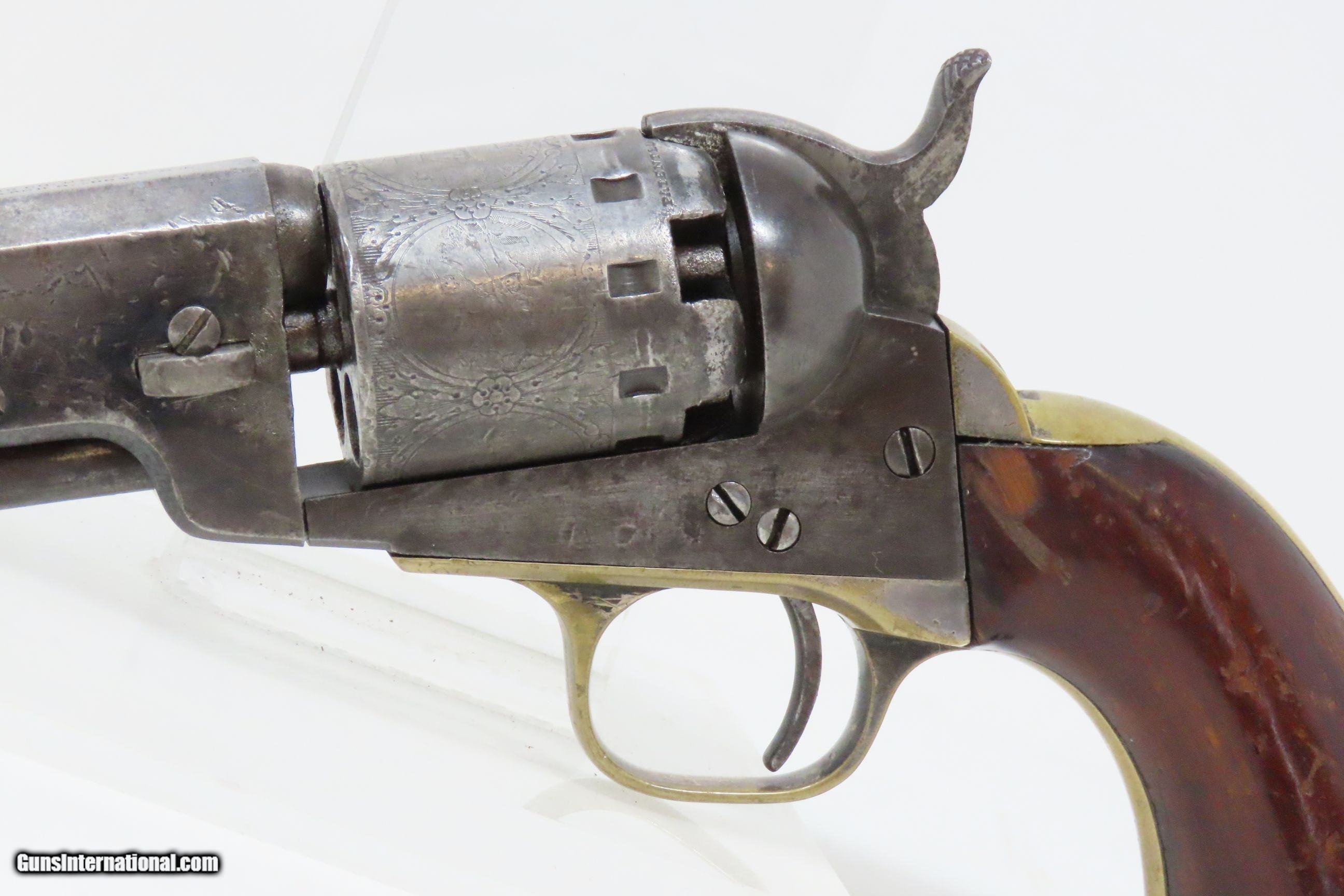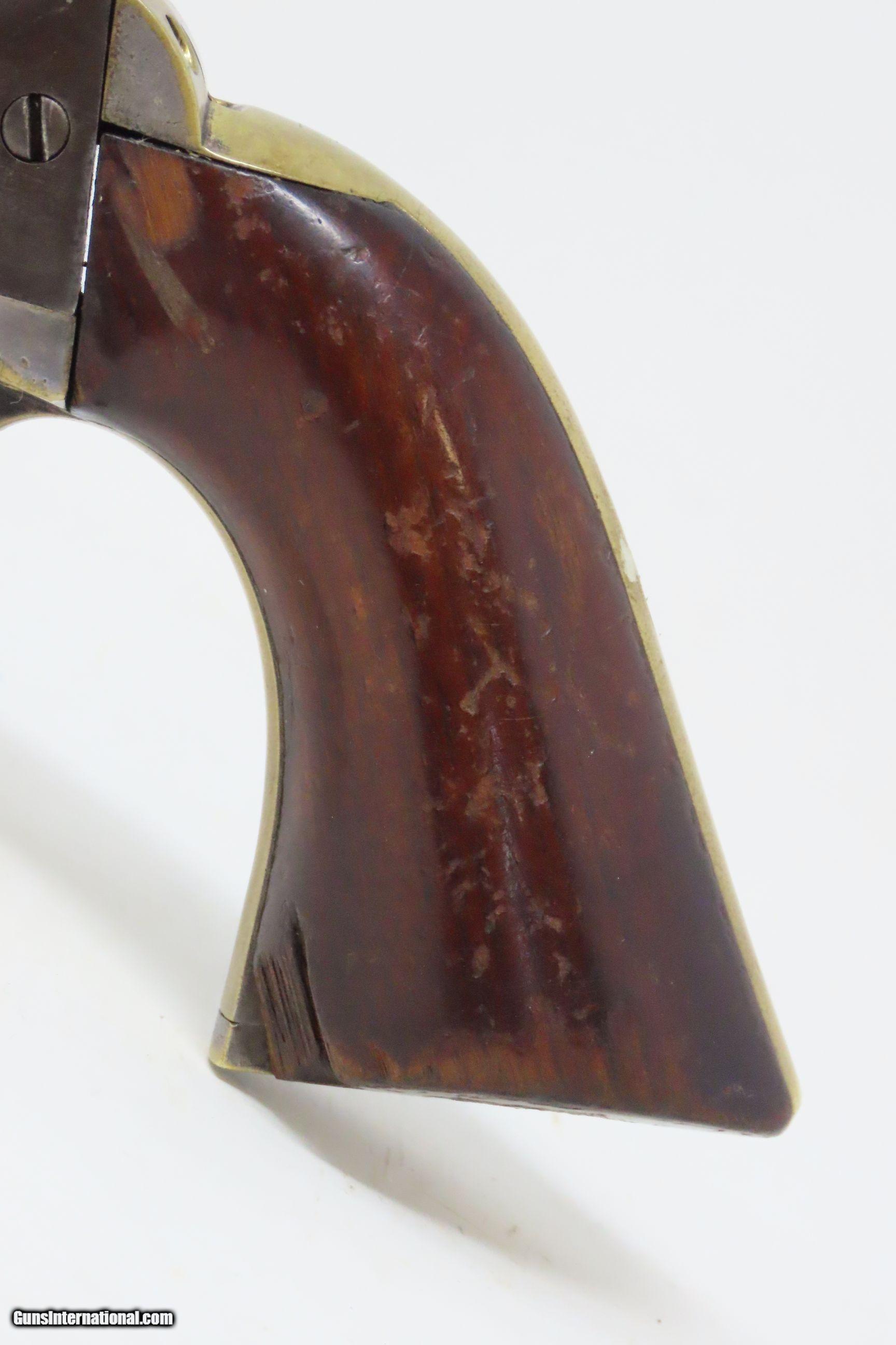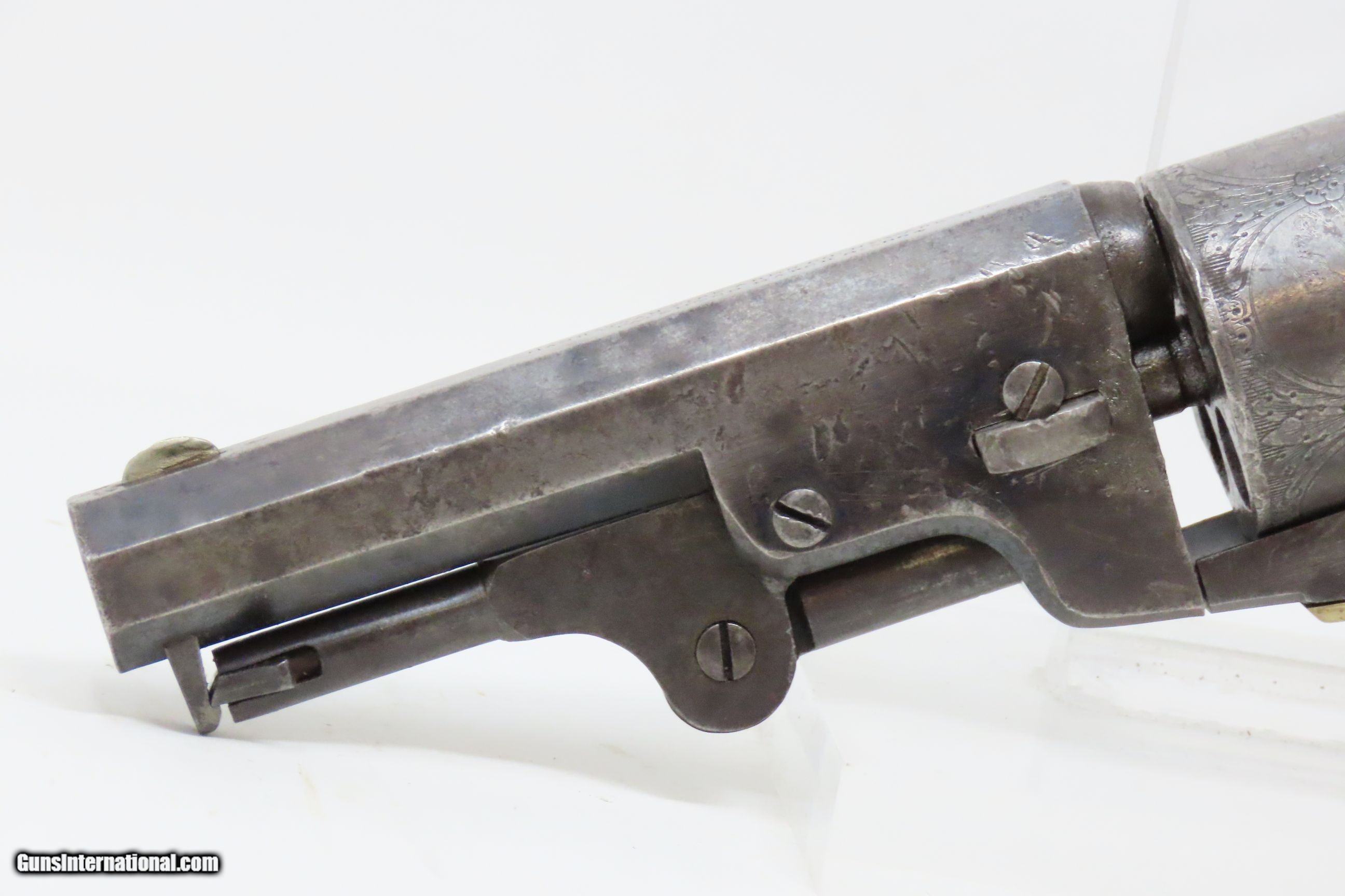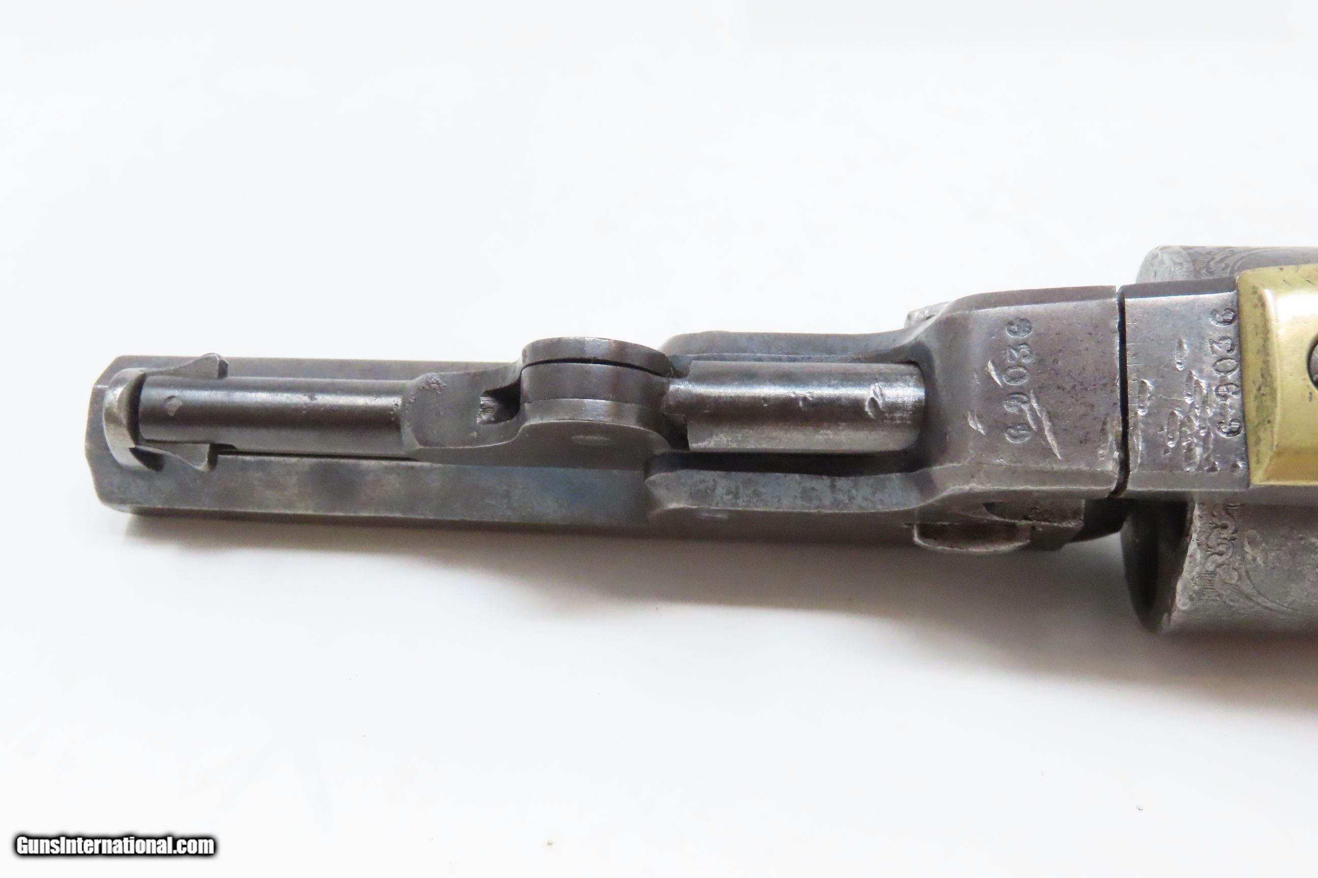 Description: CIVIL WAR Era MANHATTAN FIRE ARMS CO. Series IV Percussion “NAVY” Revolver With Multi-Panel ENGRAVED CYLINDER SCENE Here we present an antique Manhattan Arms Fourth Series Percussion Pocket Revolver, made circa 1866 in Newark, New Jersey with roughly 24,000 of these 4th Series revolvers made during a production run between April 1864 to June 1867. Serial numbers ranged between 45,200 and 69,200 in this series. Manhattan Fire Arms Co. was founded in 1856 specifically to capitalize on the soon to be expiring Colt patents in 1857. This strategy worked very well for the company and they began by making high quality and very close copies of both Colts and other popular pistols with expired patents. These revolvers greatly resemble the Colt Model 1849 Pocket and 1851 Navy revolvers. In fact, Manhattan’s copies of Colts were so close that Colt tried to kill their production with a lawsuit, even though their patent had expired. There were roughly 80,000 total revolvers made throughout the production run of Series One through Series Five. Series I through Series IV were all five-shot revolvers while the Series V (with its tapered loading lever) was of six-shot. All were, however, chambered for the .36 ball cartridge. Manhattan’s revolvers were very well received by the public. The company never received U.S. military contracts, except for a small delivery, most likely on the regimental level. Nevertheless, many Manhattan revolvers found themselves on smoky Civil War battlefields, purchased privately by officers and soldiers, and they were certainly in use at home. The war created a vast and unquenchable market for firearms of all types. The overall condition is very good. Some original finish remains in low handled areas. Much of the cylinder scene remains. Excellent, tight action. The bore is bright with some scattered pitting. Legible markings. Good grip. Numbers match. The left backstrap screw is missing. Here we have a wonderful example of a late Civil War manufactured percussion revolver to collect and display! Own the original! This is a legitimate antique and not a reproduction. Barrel is 4 inches. Caliber: .36 Percussion Overall condition as seen in photos. Very Fast. Very Safe. FREE SHIPPING WORLDWIDE. Delivered directly to your door by express mail! Guaranteed AUTHENTIC & Includes CERTIFICATE OF AUTHENTICITY. ancestryguns $1750 #230047 SOLD Antique: Yes |