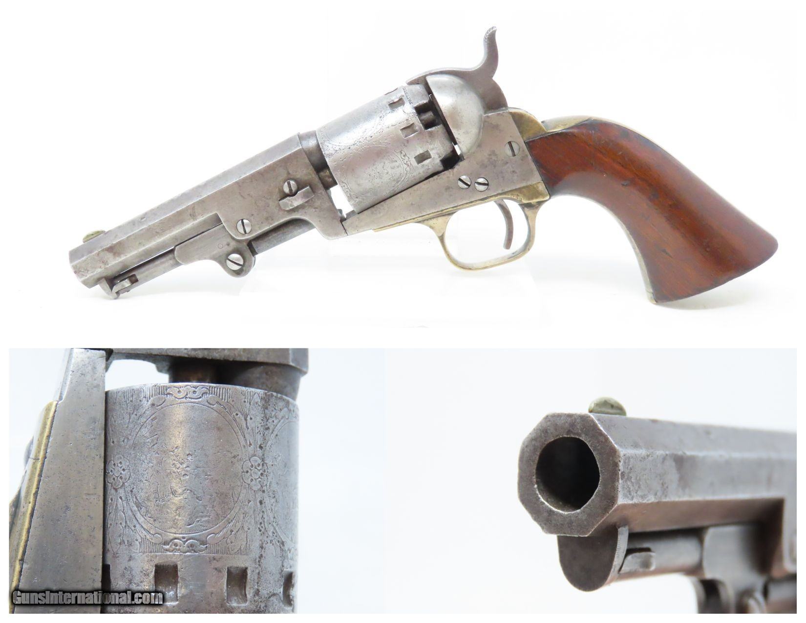 Description: CIVIL WAR Era MANHATTAN FIRE ARMS CO. Series II Percussion POCKET Revolver 5-Shot Revolver with Multi-Panel CYLINDER SCENE Here we present an antique Manhattan Arms Second Series Percussion Navy Revolver, made circa mid-1861 with the second series being produced between January 1860 to September 1861 in Newark, New Jersey. Serial numbers ranged between approximately 4,200 and 14,500 in this series. Manhattan Fire Arms Co. was founded in 1856 specifically to capitalize on the soon to be expiring Colt patents in 1857. This strategy worked very well for the company, and they began by making high quality and very close copies of both Colts and other popular pistols with expired patents. These revolvers greatly resemble the Colt Model 1849 Pocket and 1851 Navy revolvers. In fact, Manhattan’s copies of Colts were so close that Colt tried to kill their production with a lawsuit, even though their patent had expired. Manhattan’s revolvers were very well received by the public. The company never received U.S. military contracts, except for a small delivery, most likely on the regimental level. Nevertheless, many Manhattan revolvers found themselves on smoky Civil War battlefields, purchased privately by officers and soldiers, and they were certainly in use at home. The war created a vast and unquenchable market for firearms of all types. The overall condition is very good. Strong action (hammer/trigger), the cylinder indexes, though the cylinder does not lock up. The bore is in good shape for its age showing good rifling. Nice, solid grip. The cylinder scene is legible. Numbers match except for the wedge. Own the original! This is a legitimate antique and not a reproduction. Barrel is 4 inches. Caliber: .36 Percussion Overall condition as seen in photos. Very Fast. Very Safe. FREE SHIPPING WORLDWIDE. Delivered directly to your door by express mail! Guaranteed AUTHENTIC & Includes CERTIFICATE OF AUTHENTICITY. ancestryguns $1700 #220015 SOLD Antique: Yes |