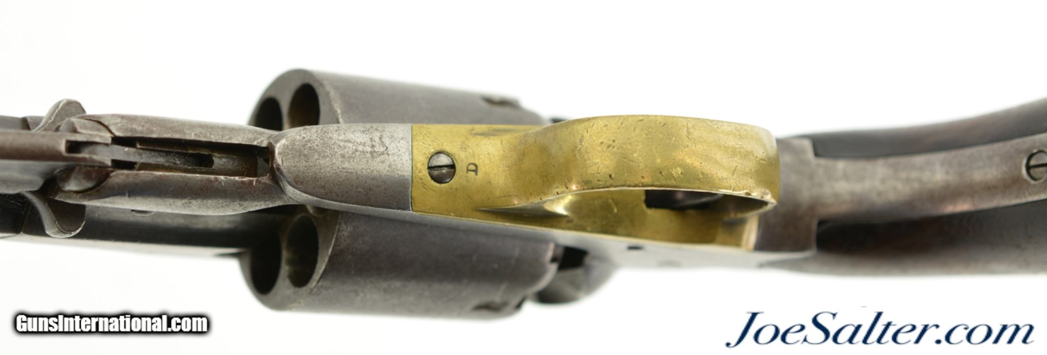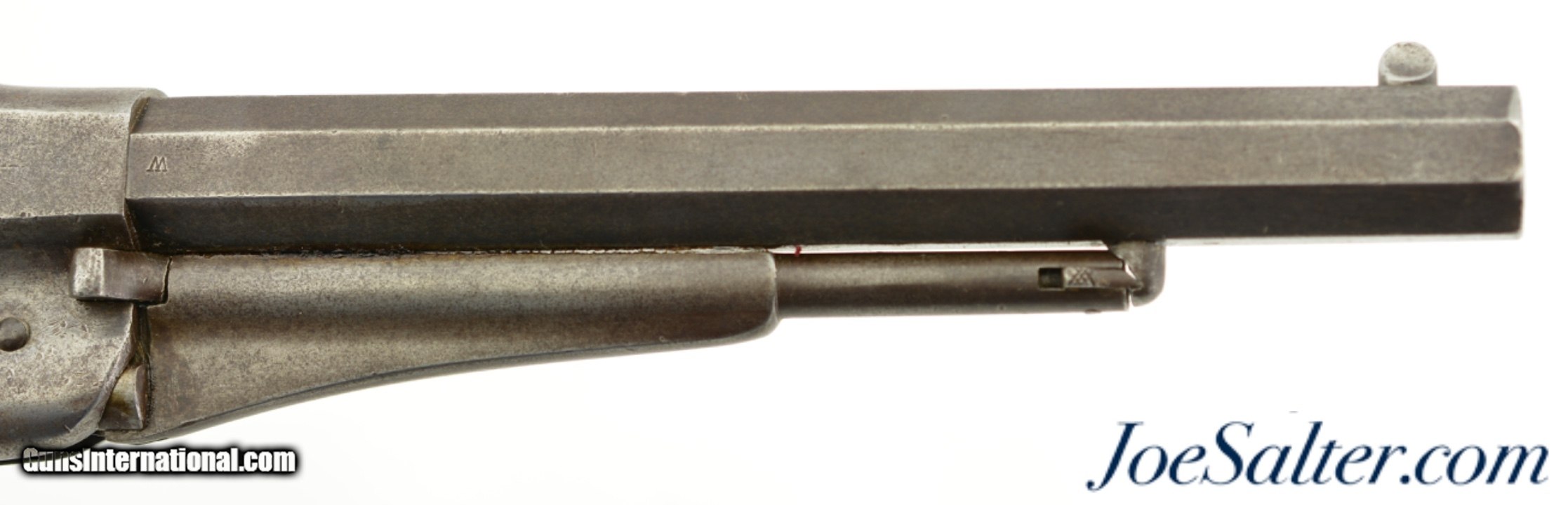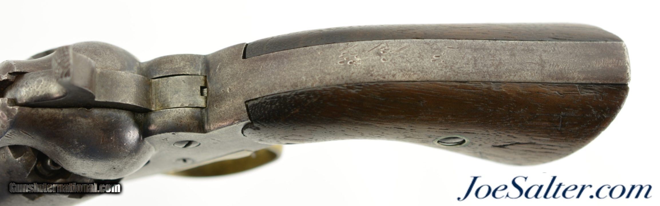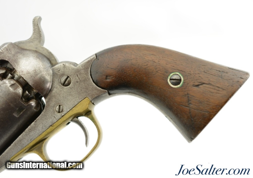 Description: Serial #99441, .44 Caliber, 8" octagon barrel with a good bore that has some minor freckling within the grooves. This is a handsome revolver that retains a few traces of the original bright blue finish on protected areas, with the balance turned to an overall mottled gray patina. Surface scratches are present on the cylinder, with a mild yellow-ochre patina on the trigger guard. The walnut grips are in good-very good shape with numerous handling marks present in the thick, added oil finish. There is no cartouche visible. The lock-up is solid, and the action functions well. This is a good-very good example of a desirable Civil War revolver, and would make a nice piece for display. Antique SOLD |