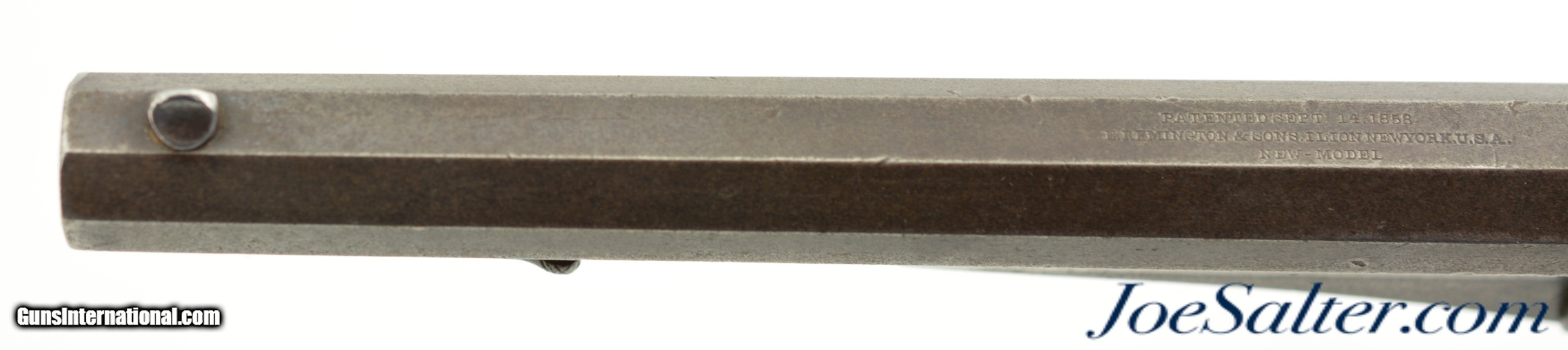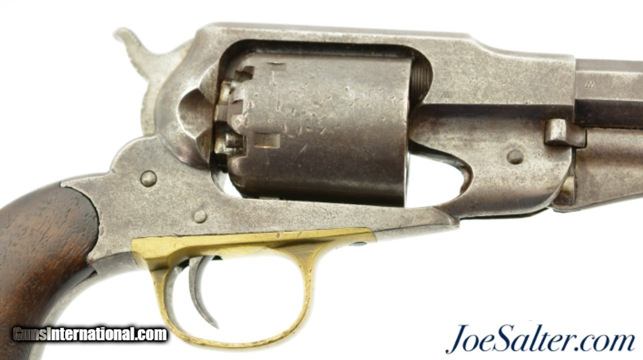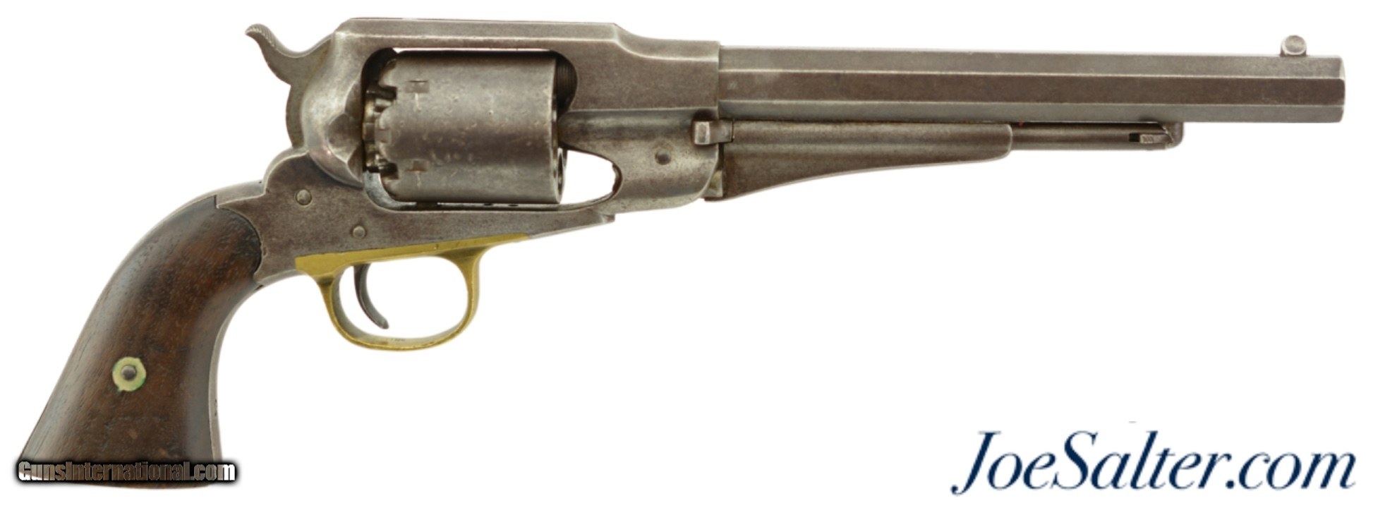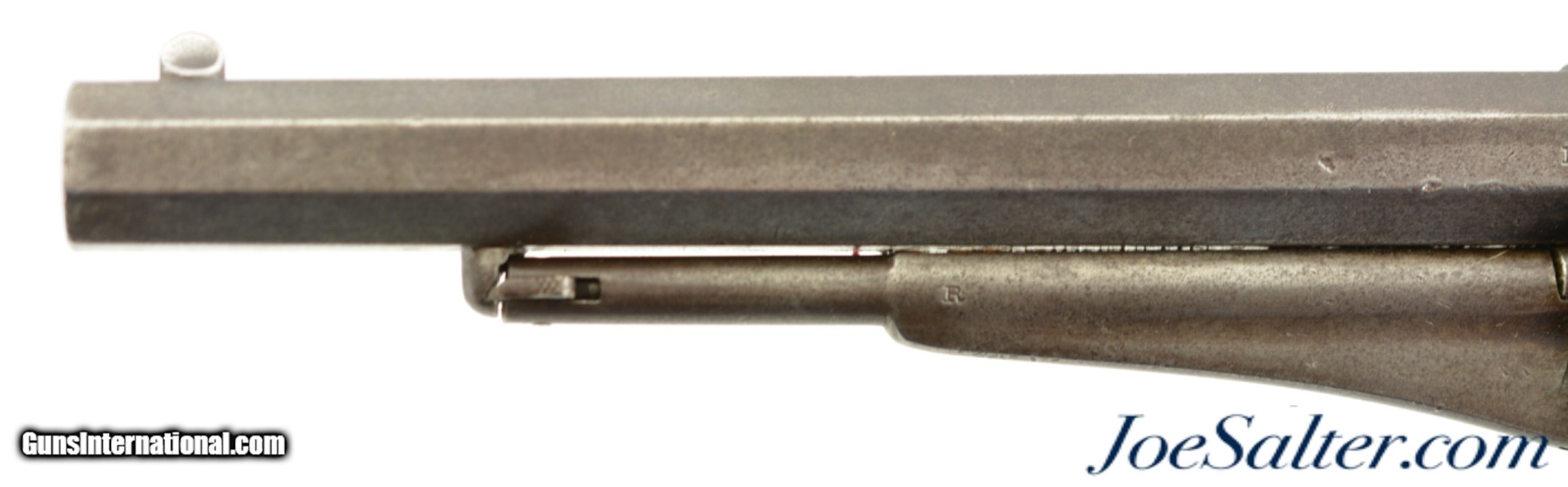 Description: Serial #99441, .44 Caliber, 8" octagon barrel with a good bore that has some minor freckling within the grooves. This is a handsome revolver that retains a few traces of the original bright blue finish on protected areas, with the balance turned to an overall mottled gray patina. Surface scratches are present on the cylinder, with a mild yellow-ochre patina on the trigger guard. The walnut grips are in good-very good shape with numerous handling marks present in the thick, added oil finish. There is no cartouche visible. The lock-up is solid, and the action functions well. This is a good-very good example of a desirable Civil War revolver, and would make a nice piece for display. Antique SOLD |