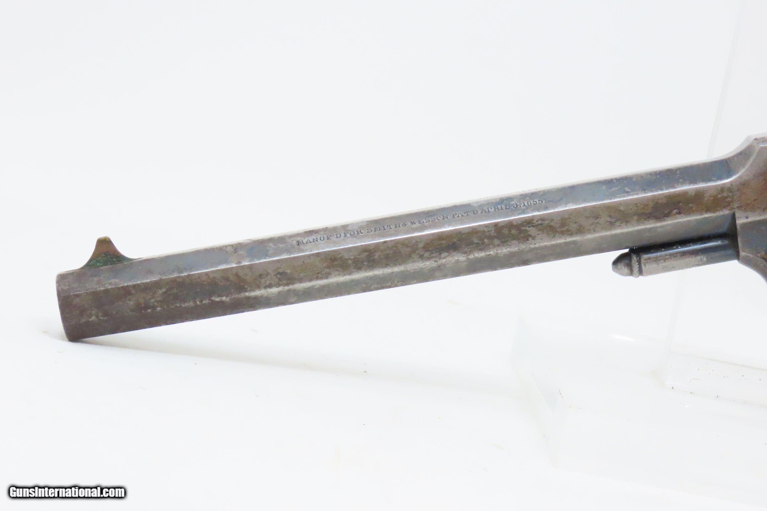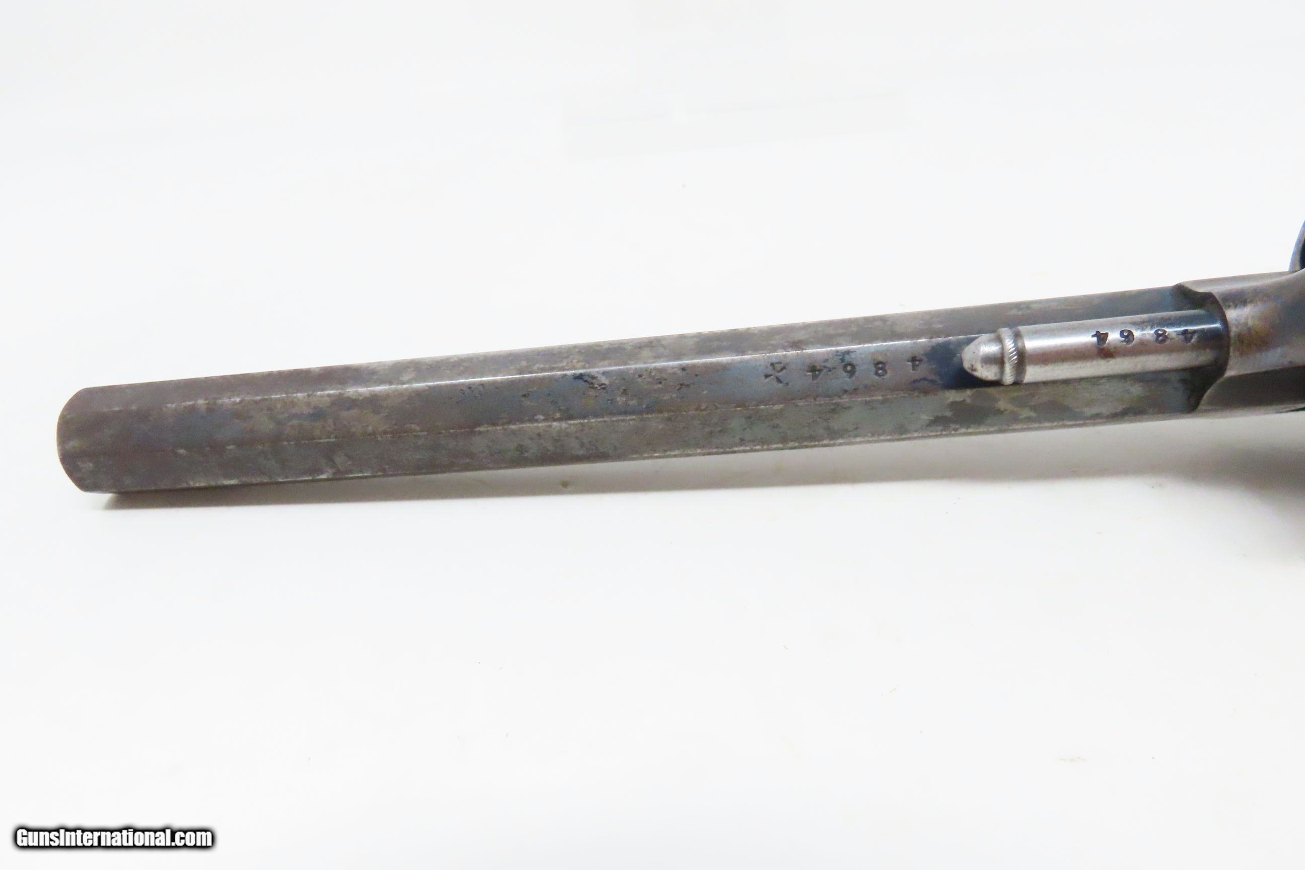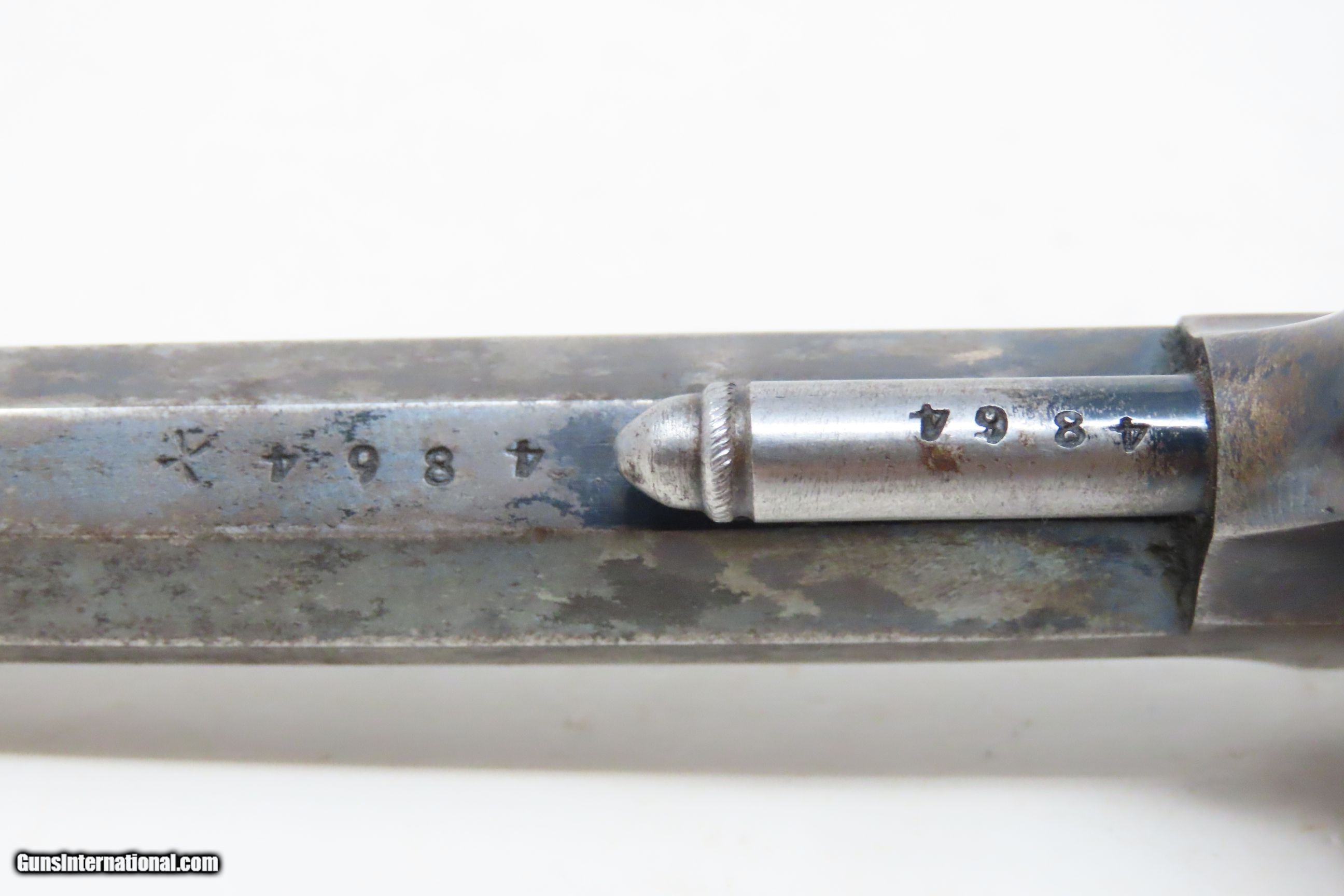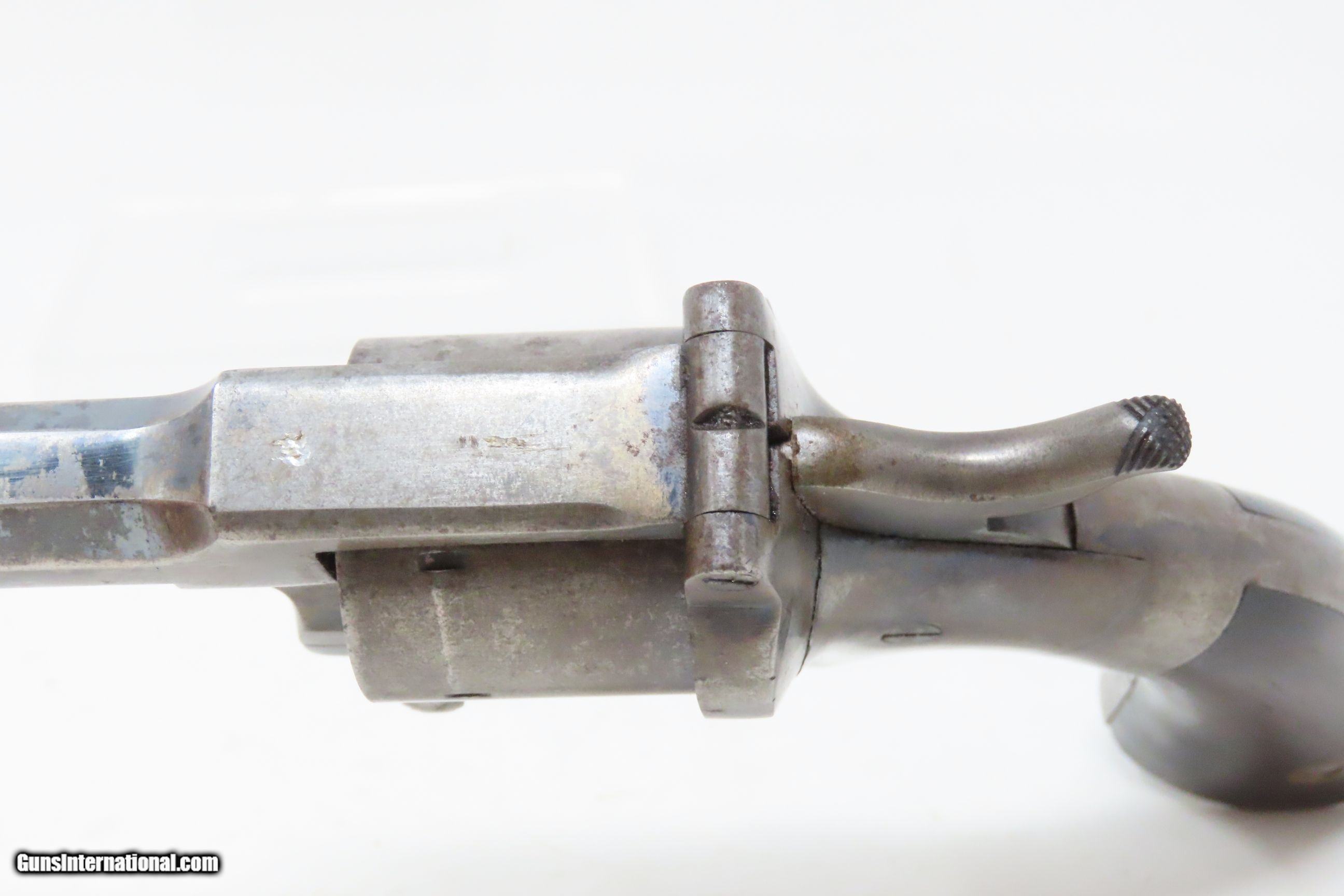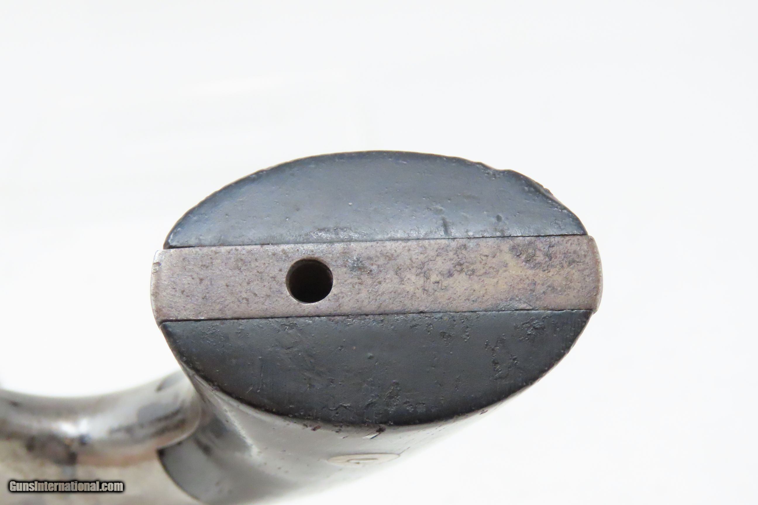 Description: CIVIL WAR Era SCARCE Antique LUCIUS W. POND .32 Caliber RF Pocket Revolver Patent Infringement Revolver Sued by SMITH & WESSON Here we present an antique Lucius W. Pond Belt/Pocket Spur Trigger Revolver, manufactured circa 1863 in Worcester, Massachusetts. This Civil War era single action revolver was the subject of a patent infringement lawsuit in 1862, by Pond, of the Rollin White Patent from 1855, which was owned by Smith and Wesson. The court ruled in favor of Smith and Wesson. However, Pond, along with Bacon, Moore, and Warner (who were also found infringing on the patent) were able to continue producing the Belt Revolver on the grounds that they would be marked “Manuf’d for Smith & Wesson Pat’d April 3, 1855”. The final run of 4,486 were marked as the court demanded, with production ending in 1870. The Belt Revolver had several distinctive features. The most notable of them is the small trigger and no trigger guard. This was combined with a single action mechanism and a break open frame, allowing the shooter to load the cylinder. However, the hinge was located above the cylinder, rather than below as had become the norm. This allowed the cartridges to fall out of the cylinder, as it would be pointed downwards. The Belt Revolver was chambered to fire one of two different calibers. Those designated as “Navy” models were chambered for .32 rimfire cartridges, while the “Army” model was chambered to accept .44 rimfire cartridges. This revolver features six shots of .32 rimfire, making it the “Navy” model. The left side of the barrel is marked “MANUF’D FOR SMITH & WESSON PAT’D APRIL 3, 1855”. The top of the barrel is marked “L.W. POND WORCESTER MASS. PAT’D JULY 10, 1860”. This revolver is similar to the S&W Model No. 2 in several ways, including the tip up barrel design for loading and unloading. However, the Pond’s hinge is located at the rear of the frame and is more robust, making it less prone to wobble. The overall condition is very good. Some original finish ha sbeen preserved. Excellent action. The bore is bright with some light scattered pitting. Both grips remain in good shape with average handling. The butt is drilled and tapped for a lanyard ring. Numbers match. The hinge is solid. Markings are legible. Here is a great looking, scarce Pond Revolver with Smith & Wesson markings! Own the original! This is a legitimate antique and not a reproduction. Barrel is 6 inches. Caliber: .32 Rimfire Overall condition as seen in photos. Very Fast. Very Safe. FREE SHIPPING WORLDWIDE. Delivered directly to your door by express mail! Guaranteed AUTHENTIC & Includes CERTIFICATE OF AUTHENTICITY. ancestryguns $1200 #230421 SOLD Antique: Yes |