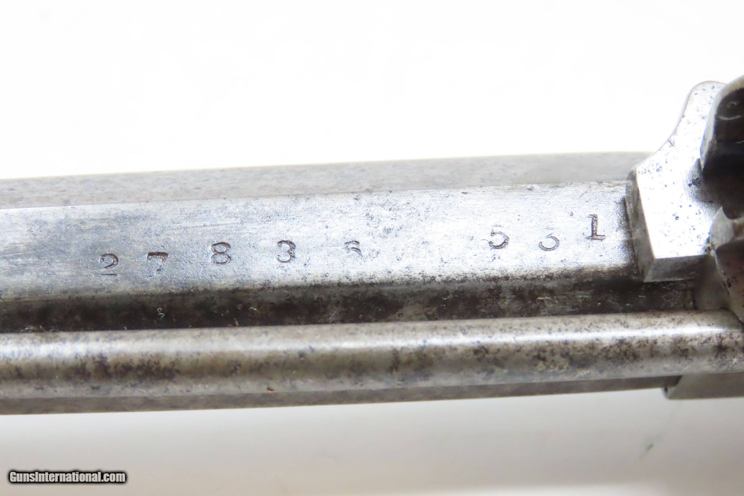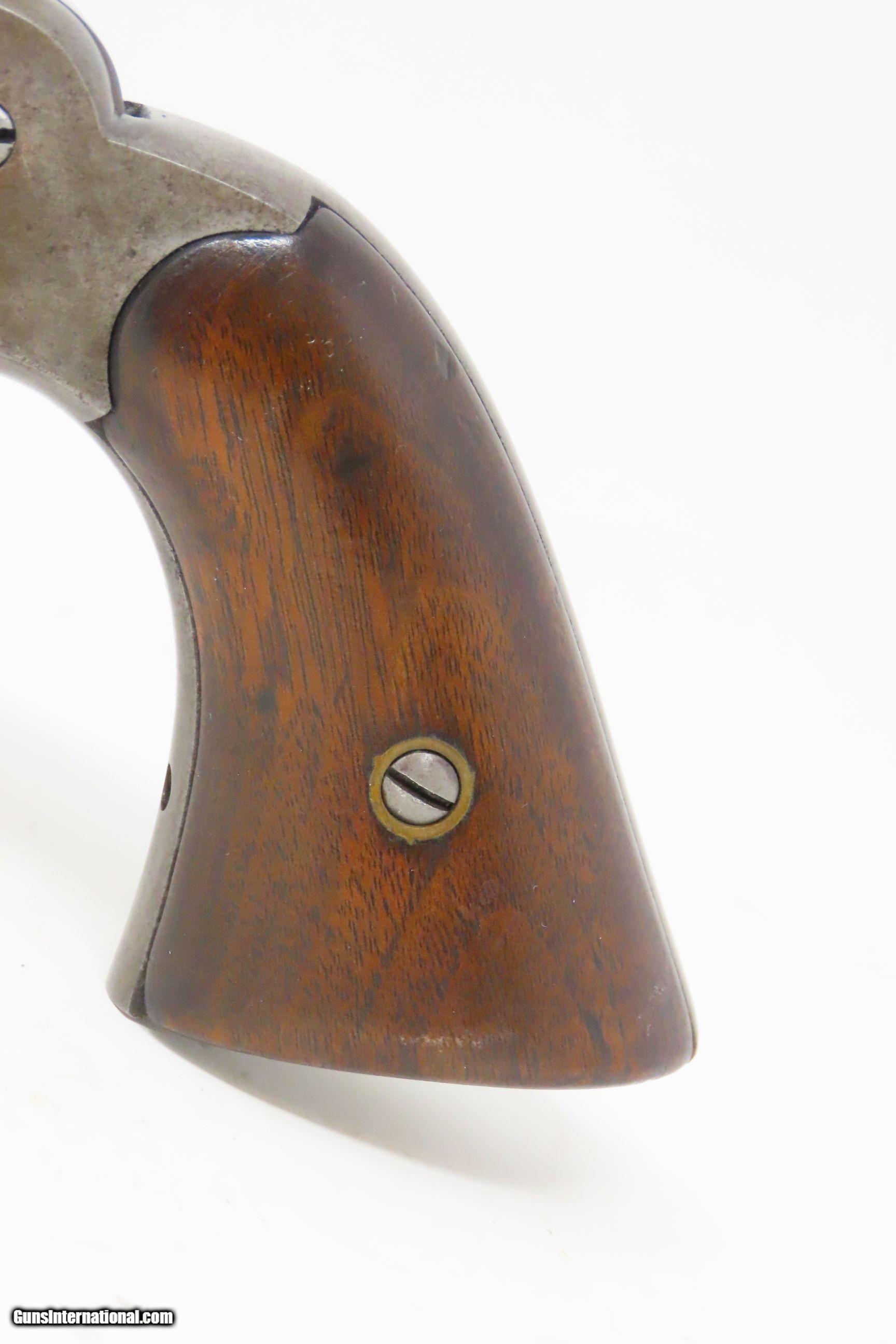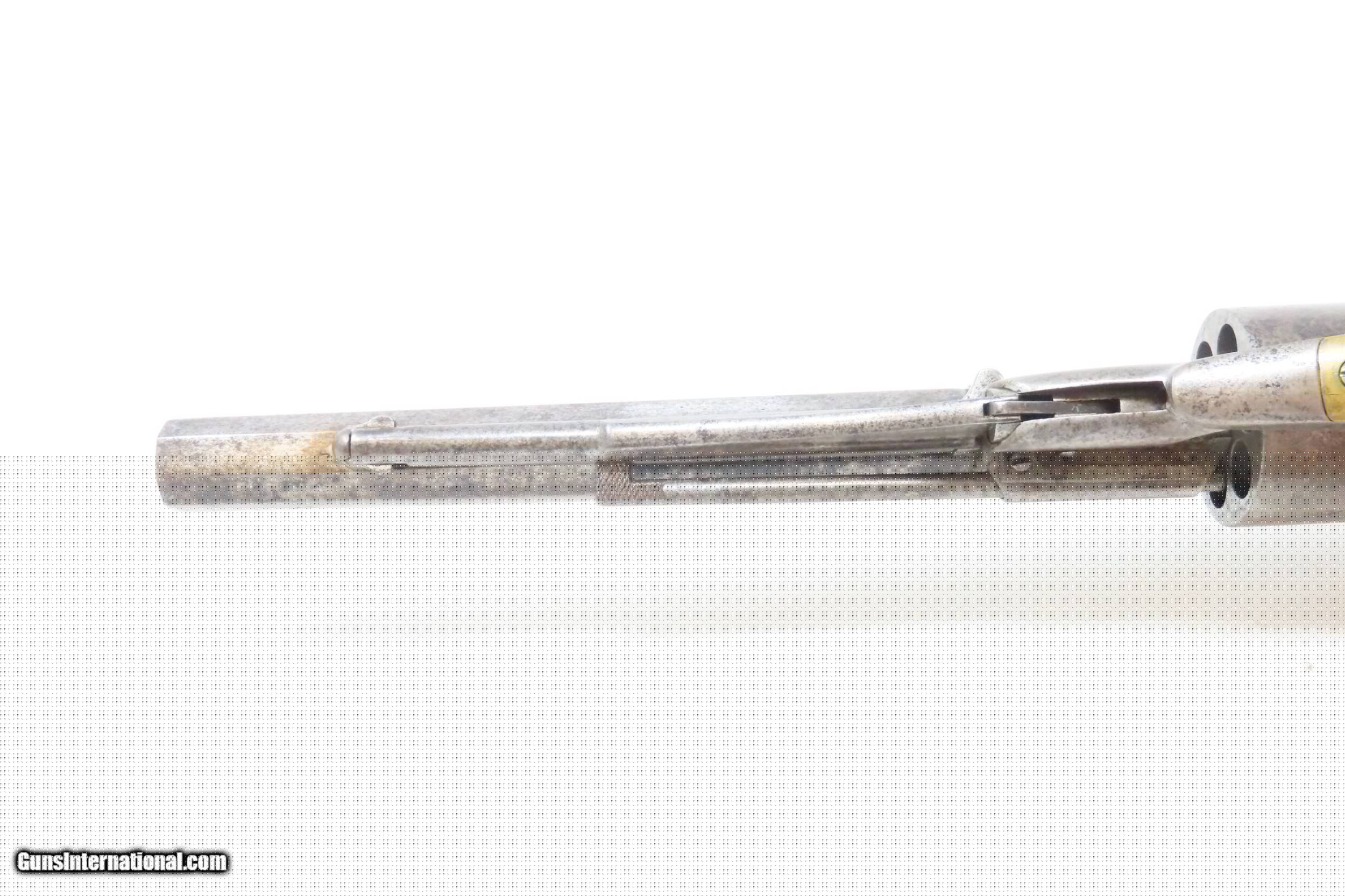 Description: CIVIL WAR Era US REMINGTON ARMS Antique CARTRIDGE CONVERSION New Model NAVY 1 of 1,000 with LOADING GATE & EJECTOR ROD Built In Here we present an antique U.S. Remington New Model Navy Cartridge Conversion Revolver, made circa 1863 to 1875 in Ilion, New York. Remington manufactured approximately 22,000 of the .36 caliber New Model Most Navy revolvers were made in the original percussion format, though some actually left the factory in the .38 caliber centerfire configuration. As mentioned, this revolver has been converted from percussion to utilize .38 Centerfire cartridges, making these very desirable in the budding metallic cartridge revolver market. Smith & Wesson’s infamous Rollin White Patent was just expiring. The US Navy even experimented with a small contract (approximately 1000) of these revolvers in this example’s configuration, with a loading gate and ejector rod built in. These Navy models were fitted with hinged and latched loading gates, and nearly all came with ejector The overall condition is good. Excellent action. Bright bore with nice rifling. The makers address on the top of the barrel is worn, but remains partially legible. Both grips are in very good shape with light wear and a smooth finish. Numbers match. The modern holster is in good shape. Here is a very scarce and desirable factory cartridge conversion of Remington’s New Model Navy! Own the original! This is a legitimate antique and not a reproduction. Barrel is 7-1/2 inches. Caliber: .38 Centerfire Overall condition as seen in photos. Very Fast. Very Safe. FREE SHIPPING WORLDWIDE. Delivered directly to your door by express mail! Guaranteed AUTHENTIC & Includes CERTIFICATE OF AUTHENTICITY. ancestryguns $3425 #217141 SOLD Antique: Yes |