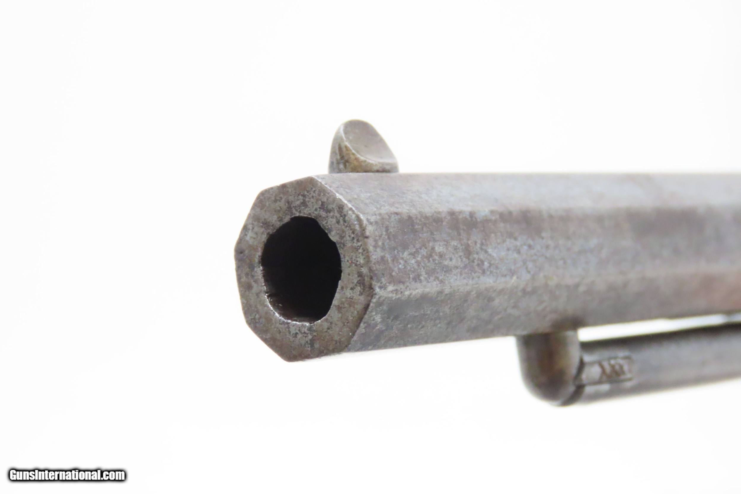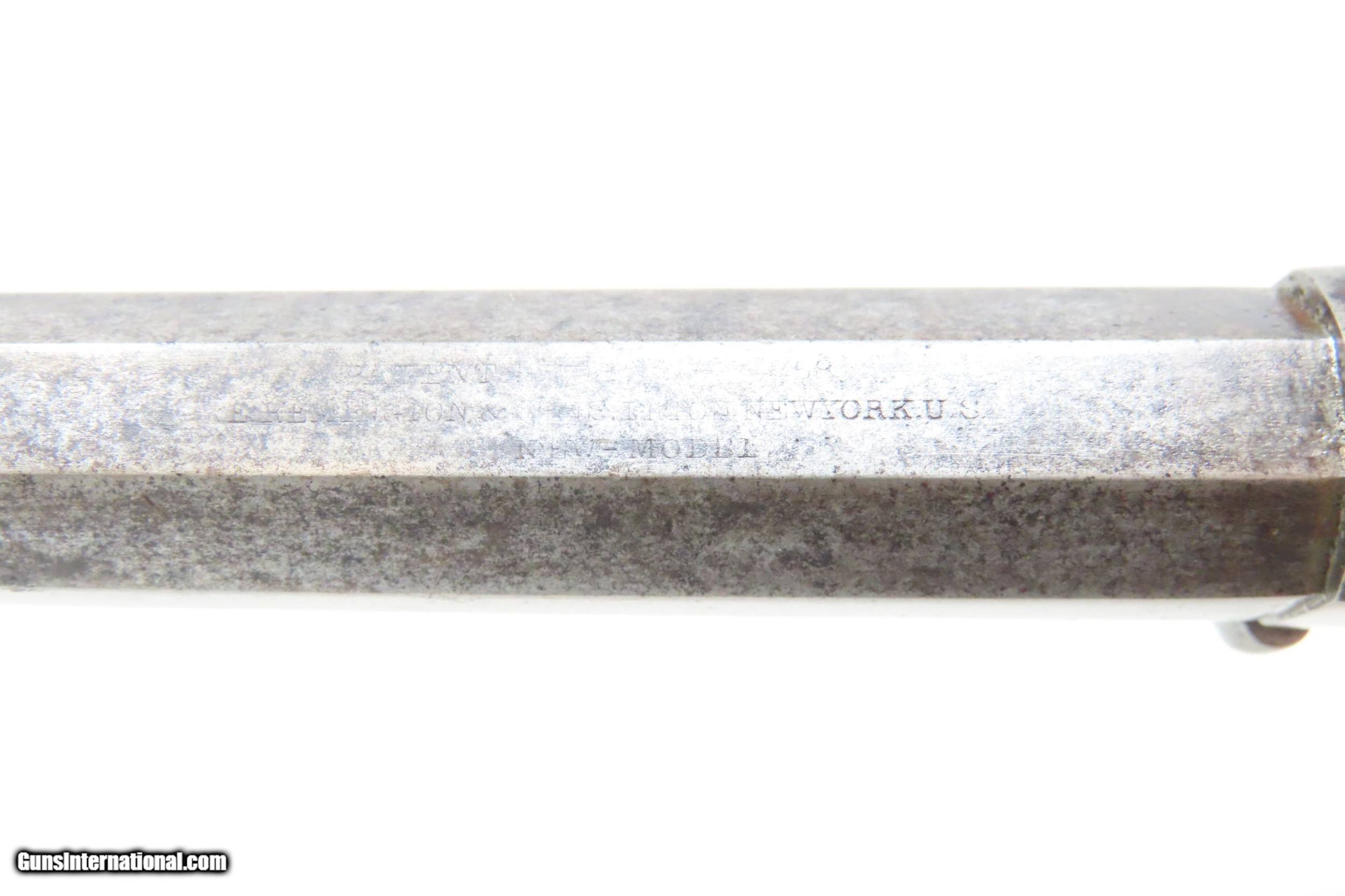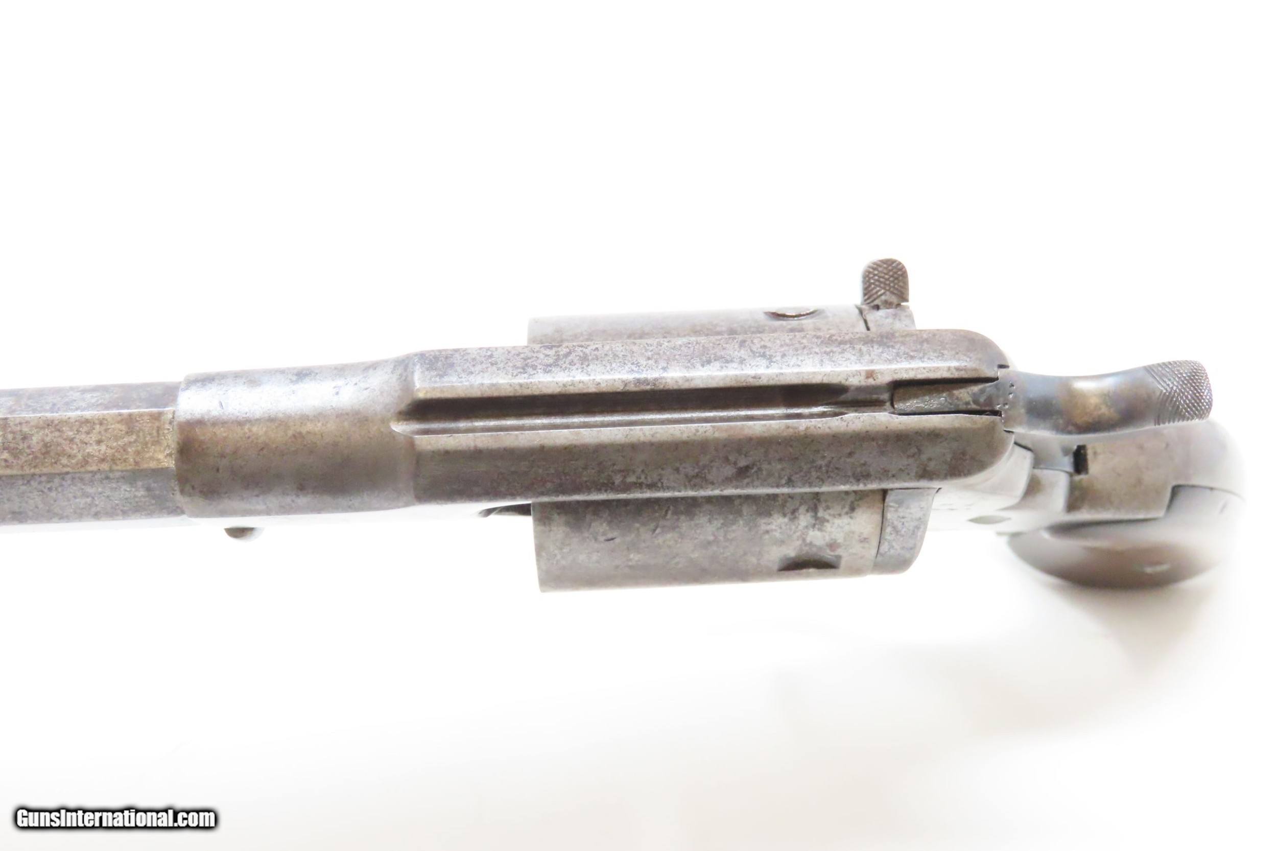 Description: CIVIL WAR Era US REMINGTON ARMS Antique CARTRIDGE CONVERSION New Model NAVY 1 of 1,000 with LOADING GATE & EJECTOR ROD Built In Here we present an antique U.S. Remington New Model Navy Cartridge Conversion Revolver, made circa 1863 to 1875 in Ilion, New York. Remington manufactured approximately 22,000 of the .36 caliber New Model Most Navy revolvers were made in the original percussion format, though some actually left the factory in the .38 caliber centerfire configuration. As mentioned, this revolver has been converted from percussion to utilize .38 Centerfire cartridges, making these very desirable in the budding metallic cartridge revolver market. Smith & Wesson’s infamous Rollin White Patent was just expiring. The US Navy even experimented with a small contract (approximately 1000) of these revolvers in this example’s configuration, with a loading gate and ejector rod built in. These Navy models were fitted with hinged and latched loading gates, and nearly all came with ejector The overall condition is good. Excellent action. Bright bore with nice rifling. The makers address on the top of the barrel is worn, but remains partially legible. Both grips are in very good shape with light wear and a smooth finish. Numbers match. The modern holster is in good shape. Here is a very scarce and desirable factory cartridge conversion of Remington’s New Model Navy! Own the original! This is a legitimate antique and not a reproduction. Barrel is 7-1/2 inches. Caliber: .38 Centerfire Overall condition as seen in photos. Very Fast. Very Safe. FREE SHIPPING WORLDWIDE. Delivered directly to your door by express mail! Guaranteed AUTHENTIC & Includes CERTIFICATE OF AUTHENTICITY. ancestryguns $3425 #217141 SOLD Antique: Yes |