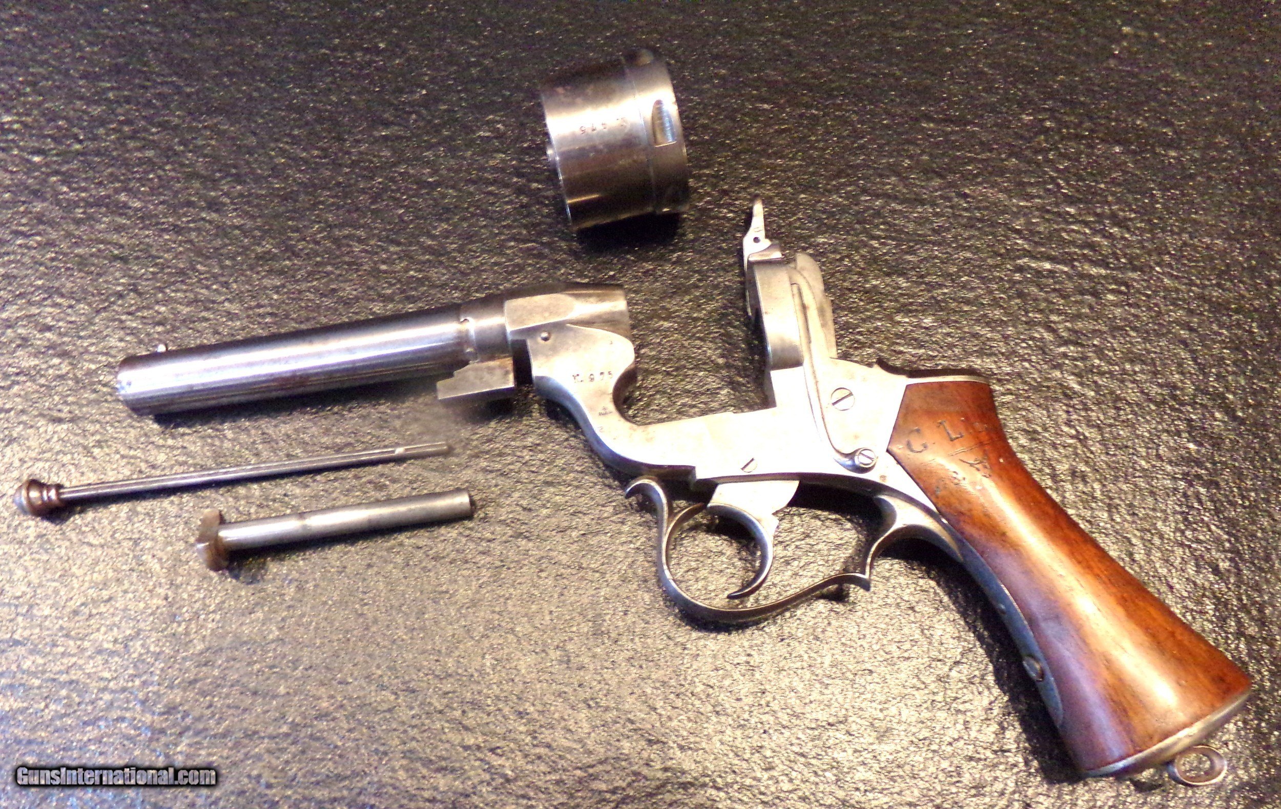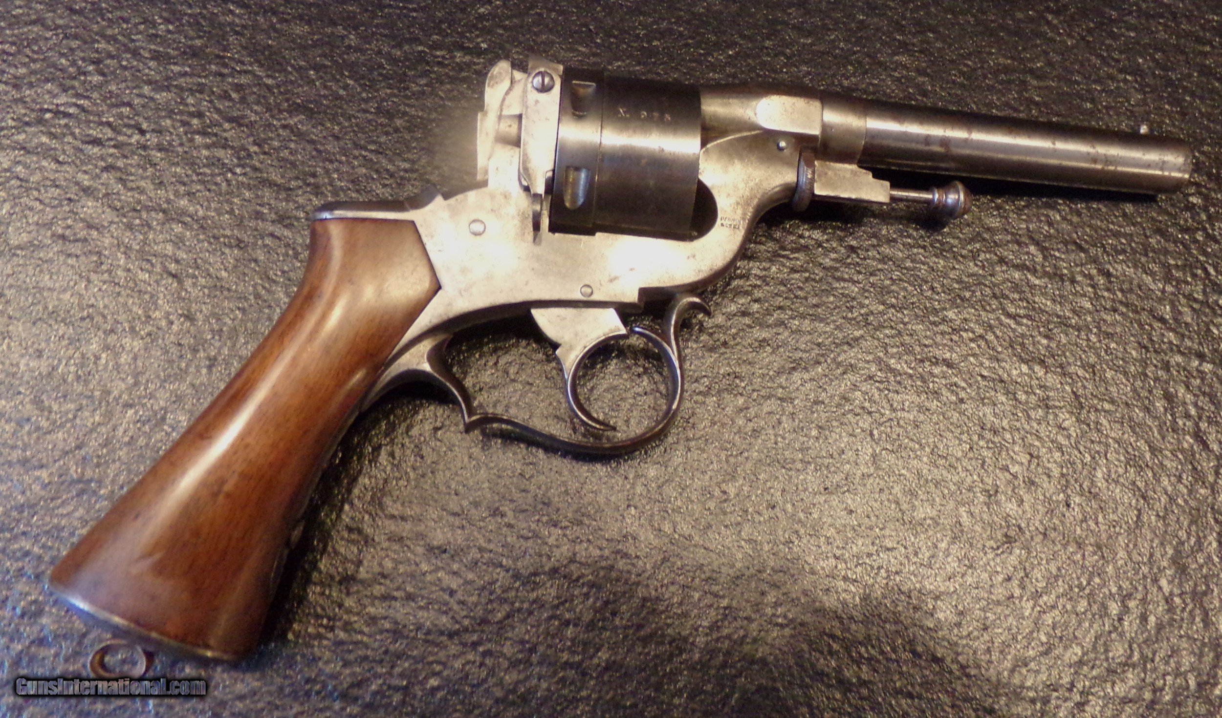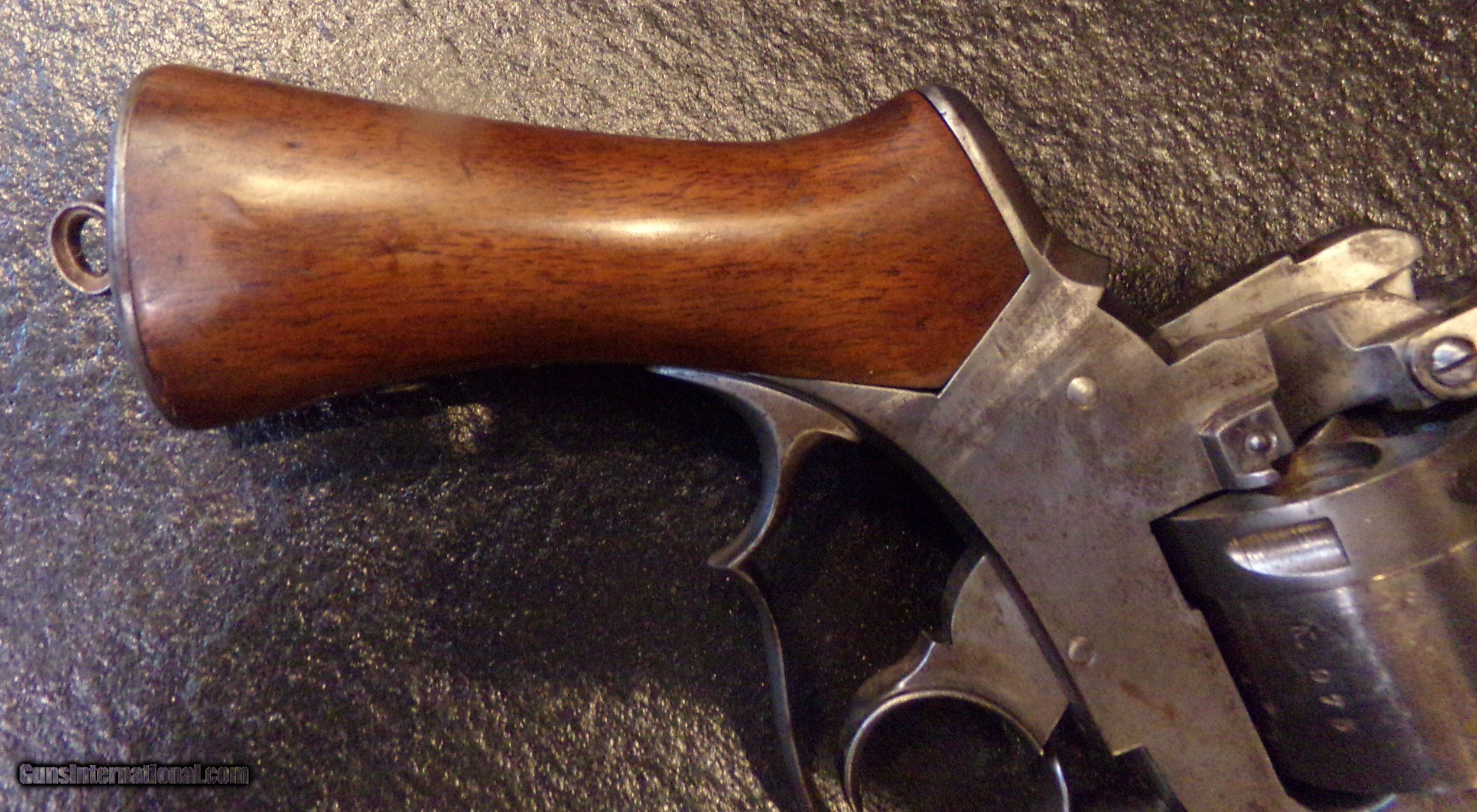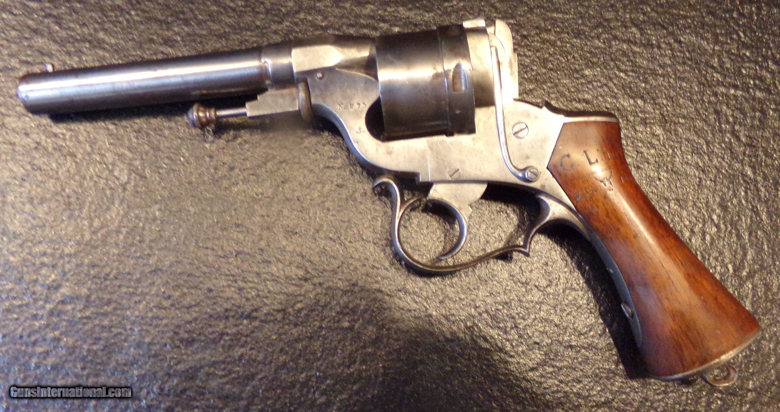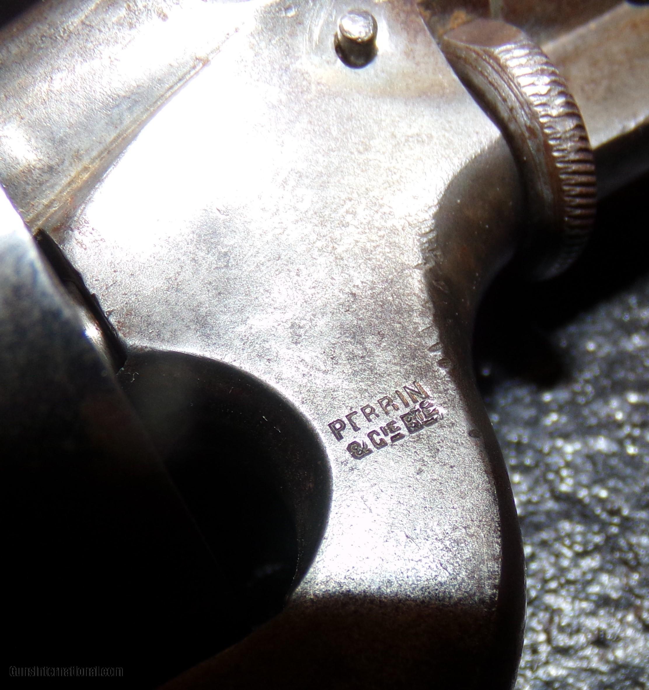 Description: I am offering a very rare Civil War imported 11MM Perrin Centerfire Revolver with a Texas connection. There were 550 brought in during 1862. Those Civil War revolvers had serial numbers under 1000 as does this one. I looked on the internet for those Perrin revolvers that were either sold or are for sale in the US and the serial numbers ranged from 142 to 975. Revolvers numbered 895,936,953 and 963 are part of the Springfield Museum collection. These revolvers most likely were never issued because of the limited amount of cartridges available. 380 were put up for sale at in New York in 1880. Bannerman acquired 348 of them and then sold them in 1901. This particular revolver was not part of the Bannerman sales. It was one of the 202 (550-348) either sold to someone else in 1880 or taken home by someone before then. That leads me to the Texas association. There is engraving in the left grip. The initials G.L. then the word TEXAS on one line and below that No 8., the head of a longhorn steer, and the date I believe is 1895. I am speculating that this may refer to a reunion of Texas Confederate Veterans or an Old Cowboy reunion. The number 8 could mean the 8th reunion or related to a unit like the 8th Texas Cavalry. More research should be done to figure it out. I am assuming the revolver was given as an award. The revolver still retains its bright finish and is 100% complete and functional. The grips are smooth and in near excellent condition. The loading gate on this one lifts up and back making it the second type. The serial number appears on the frame and cylinder. The maker mark appears on the right side of the frame. The barrel is 5 ½” long with a bore of about 11.3mm. Overall this is an excellent example of one of the rarest imported Civil War revolvers and will not be found in most collections. It is also priced to sell. Compare it to other ones for sale! I found a picture of a badge from a 1895 UCV Texas convention featuring the head of a longhorn steer! I don't have the badge just a picture. SOLD Antique: Yes |