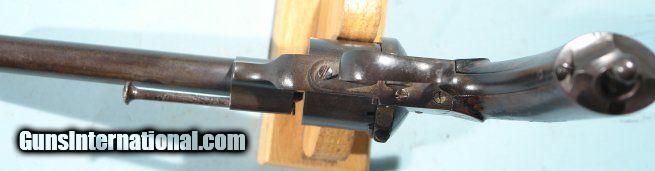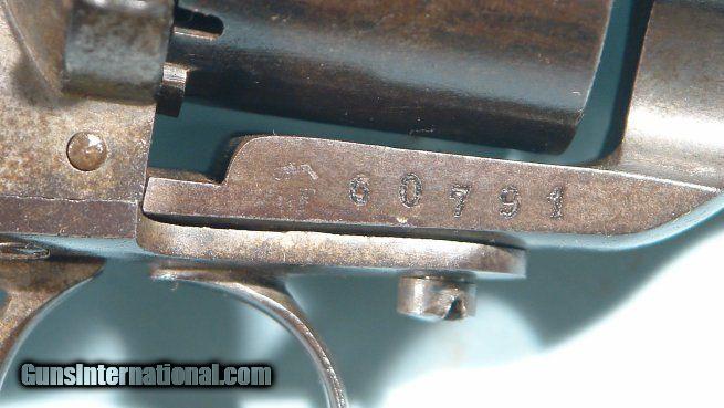 Description: CIVIL WAR LEFAUCHEUX MODEL 1854 SINGLE ACTION 12 MM PINFIRE CAVALRY REVOLVER CIRCA 1861. 6 shot pinfire breech loading military serial numbered in the 60,xxx range and all matching and original excellent condition. 80% plus original blue finish on barrel and cylinder with much blue still remaining in the chambers. Crisp grey case hardened frame. Original grips with 60-705 original varnish. Frame with Lefaucheux inspection stamp before the serial number “PROOF/LF”. Perfect working order and excellent bore. Many purchased by both the Union and Confederate States during the war. Many issued to western Union Volunteer Cavalry from Kansas, Missouri, Illinois and Wisconsin. As well as slightly over 100 to Maryland Cavalry that saw service at Gettysburg. Extra nice example. SOLD Antique: Yes |