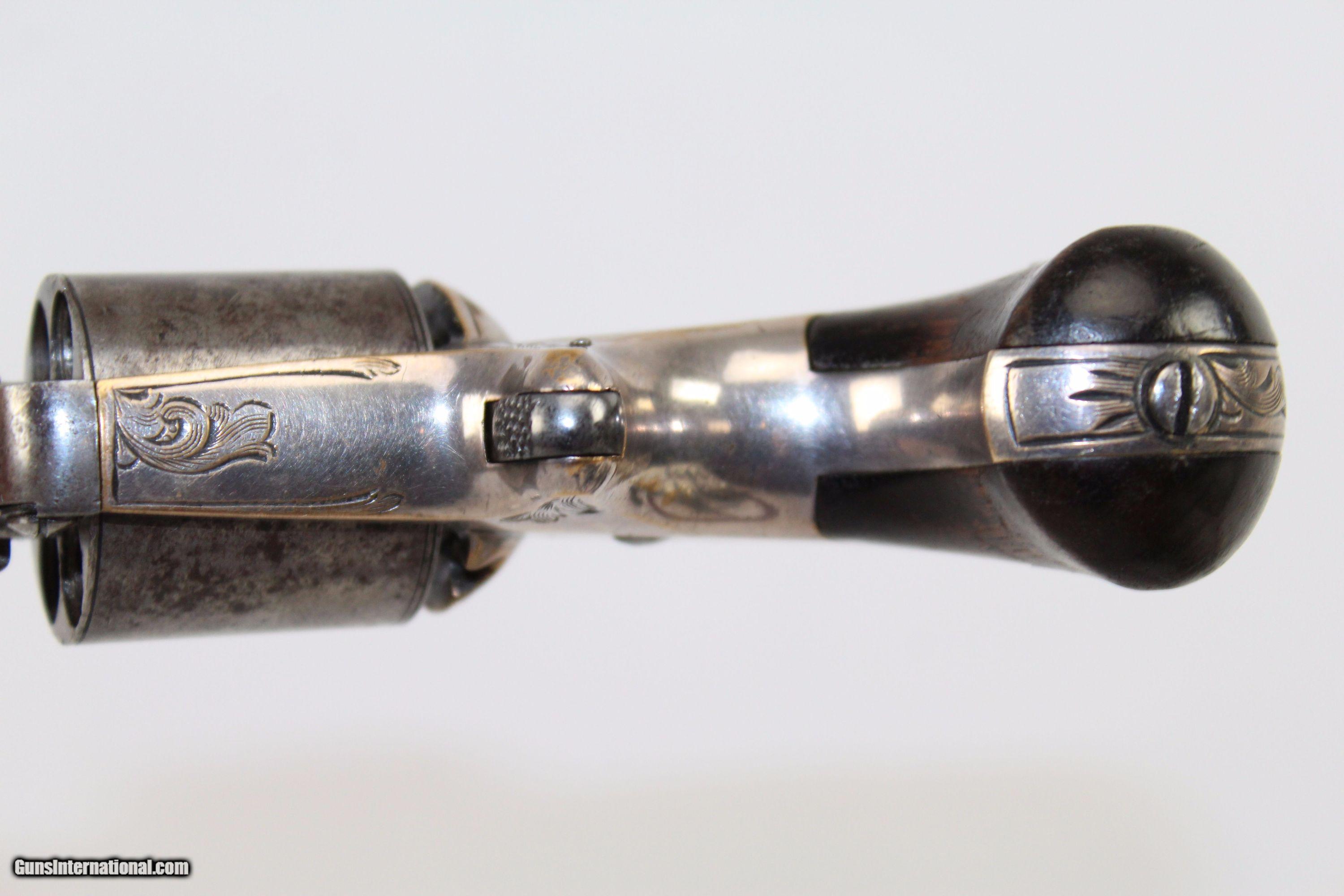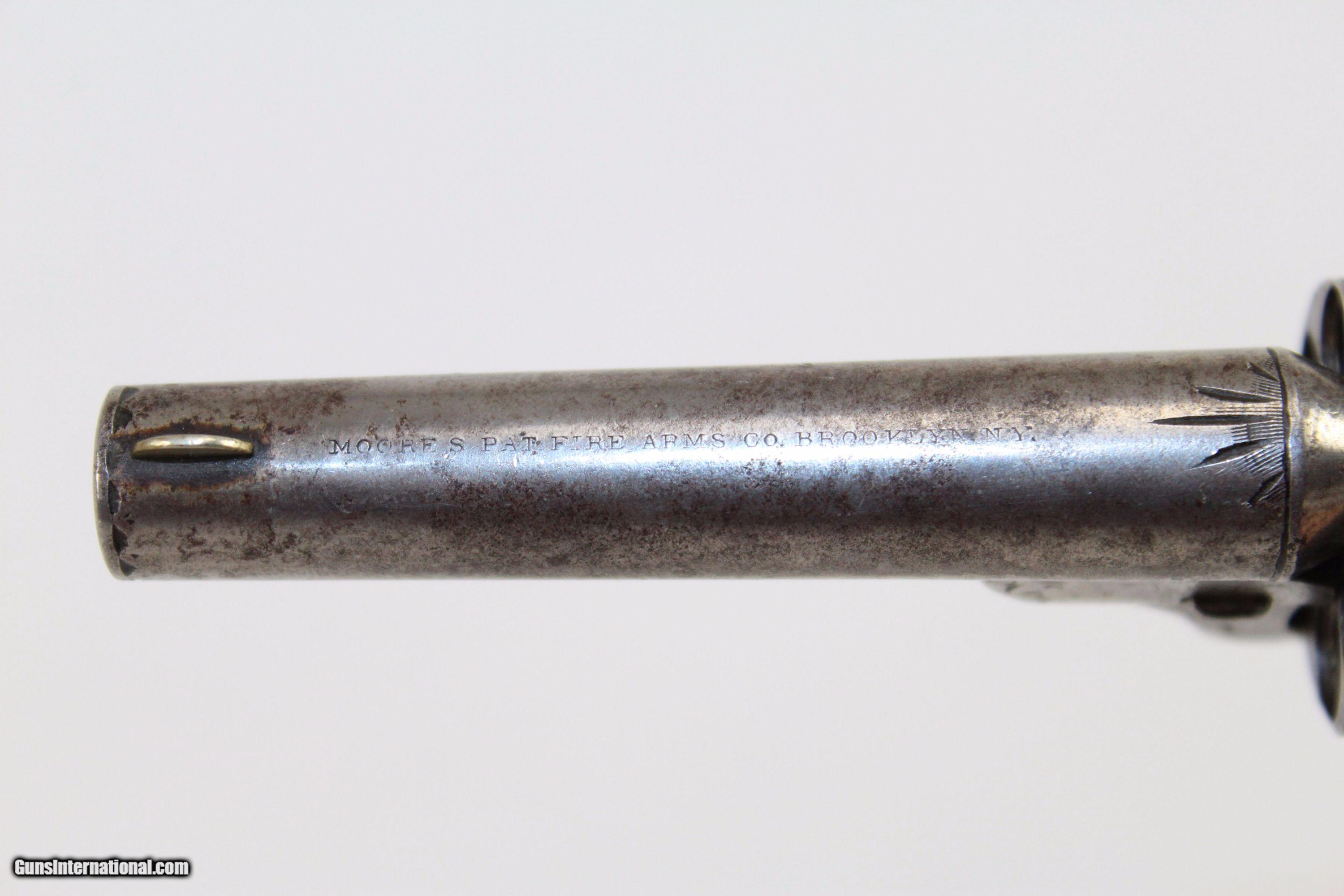Description: CIVIL WAR Moore's Patent Teat-Fire Revolver Engraved Revolver That Circumvented S&W’s Patents Here we present an antique Moore’s Patent Teat-Fire Revolver, circa 1864, in Brooklyn, New York. It was wartime and the United States stood divided. During a period of rapid industrial innovation, the firearms industry was one of the hottest. The war drove a huge market and many different makers, designs and patents appeared in a very short amount of time. Some of Colt’s most coveted patents expired in 1857, opening opportunity, but Smith & Wesson purchased the Rollin White Patent in the late 1850s, enabling them to control the market on what virtually became the “modern” revolver. Specifically, the Rollin White Patent was for completely bored through (front to back) chambers in the cylinder. This is the same concept still in use in revolvers today. This enabled the most effective use of metallic cartridges. Many companies simply infringed on the patent. They were promptly sued. Others tried and succeeded in finding ways around the patent to make metallic cartridge revolvers while the Rollin White Patent was still in effect. Daniel Moore, the designer of this revolver was one who did both. He designed a cartridge revolver that was the first “swing-out” cylinder revolver, but blatantly infringed on S&W’s patent. He was sued and lost, but he was not done. He soon designed another revolver with the partnership of David Williamson. That is the pictured “teat-fire” revolver. Like the Plant, another successful revolver that skirted the RW Patent, it used a mostly bored through cylinder with a constriction at the back. The cartridges each loaded from the front of the cylinder. A small projection at the back of the cartridge (like a teat) was the primer. The overall condition is fine. The original silver plate finish is 75%. Traces of original blue finish can be found on the cylinder. The engraving and markings are clear and legible. The grips are in good shape. The bore is sharp and fine. The action is excellent. Here is a gorgeous Civil War Pocket Revolver! Own the original! This is a legitimate antique and not a reproduction. Barrel is 3-1/4 inches. Caliber: .32 Teat-fire Overall condition as seen in photos. Very Fast. Very Safe. FREE SHIPPING WORLDWIDE. Delivered directly to your door by express mail! Guaranteed AUTHENTIC & Includes CERTIFICATE OF AUTHENTICITY. ancestryguns $1200 #5449 SOLD Antique: Yes |