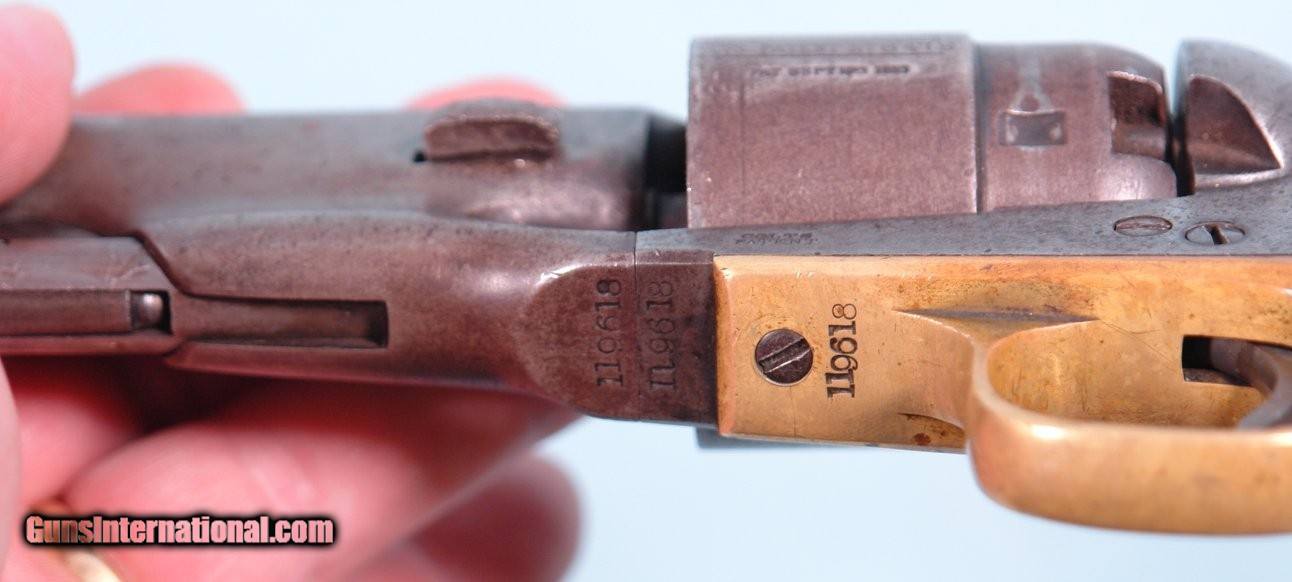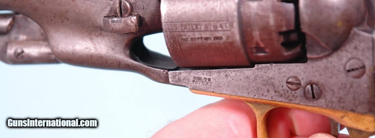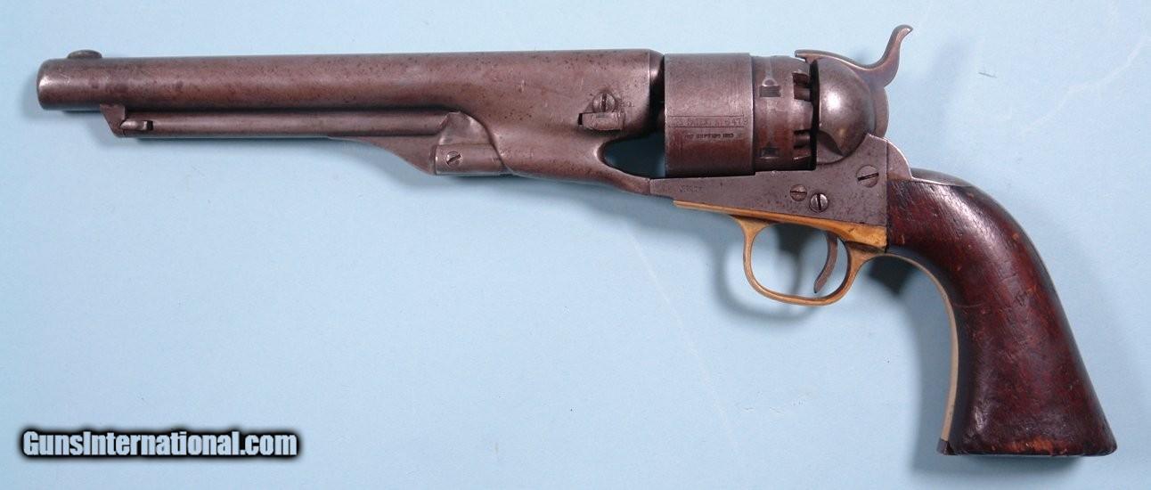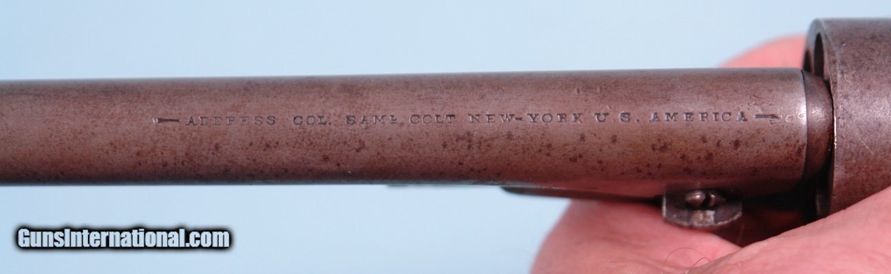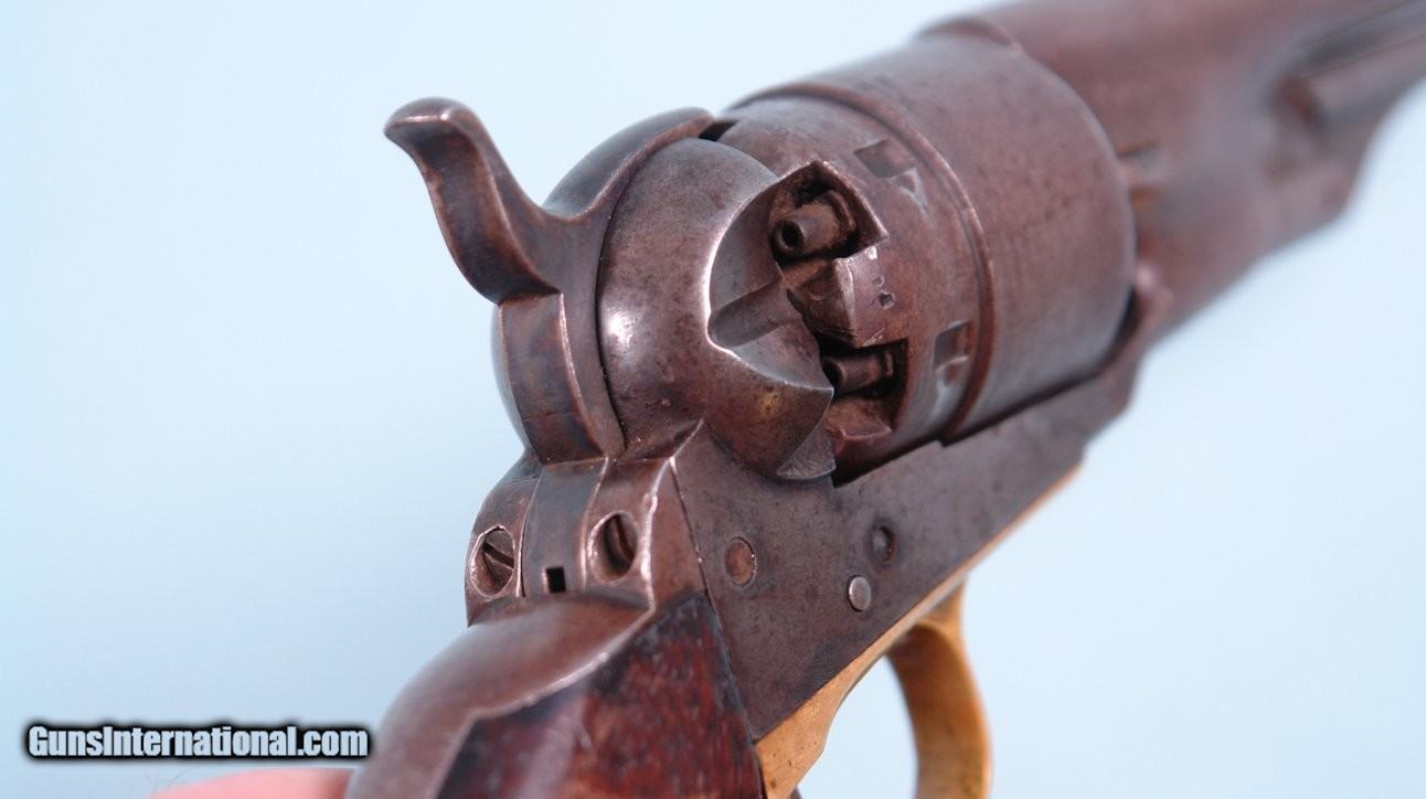 Description: CIVIL WAR ORIGINAL COLT U.S. MODEL 1860 PERCUSSION ARMY .44 CAL. REVOLVER IN THE KENTUCKY CAV. VOLS. SERIAL RANGE. Six shot with 8’ barrel with excellent address stamp (ADDRESS COL. SAML. COLT NEW-YORK U.S. AMERICA). Serial numbered in the 119xxx range close in number to many Model 1860’s issued to the 4th Kentucky U.S. Cavalry during the Civil War as recorded in Springfield Armory records now in the National Archives. 100% original and all matching except the cylinder which is a field replacement inspected with the same “HH” Ordnance inspection marks as the barrel. Extra nice sharp markings and all original patina with traces of case hardening on hammer. Very nice “NAVAL ENGAGEMENT” cylinder scene. Original grips with visible cartouches on both sides and the original finish. Working order and very good bore and chambers. SOLD Antique: Yes Handgun Caliber: .44 |
