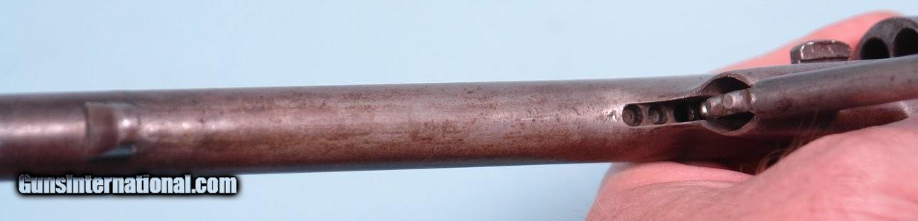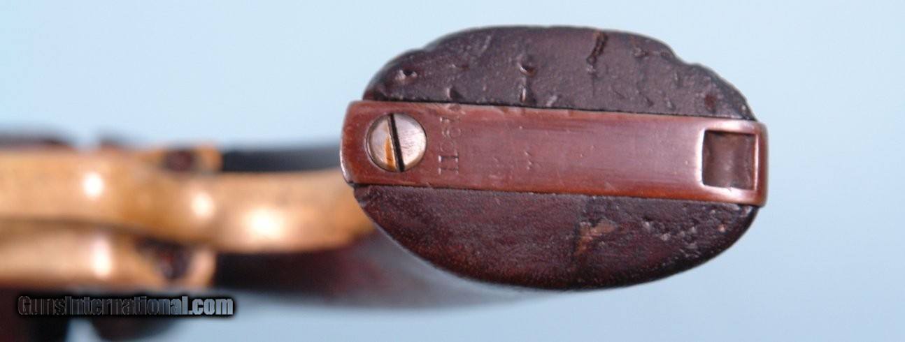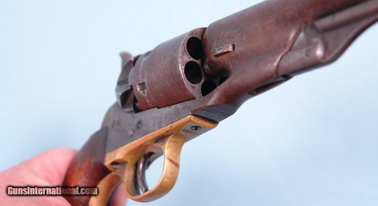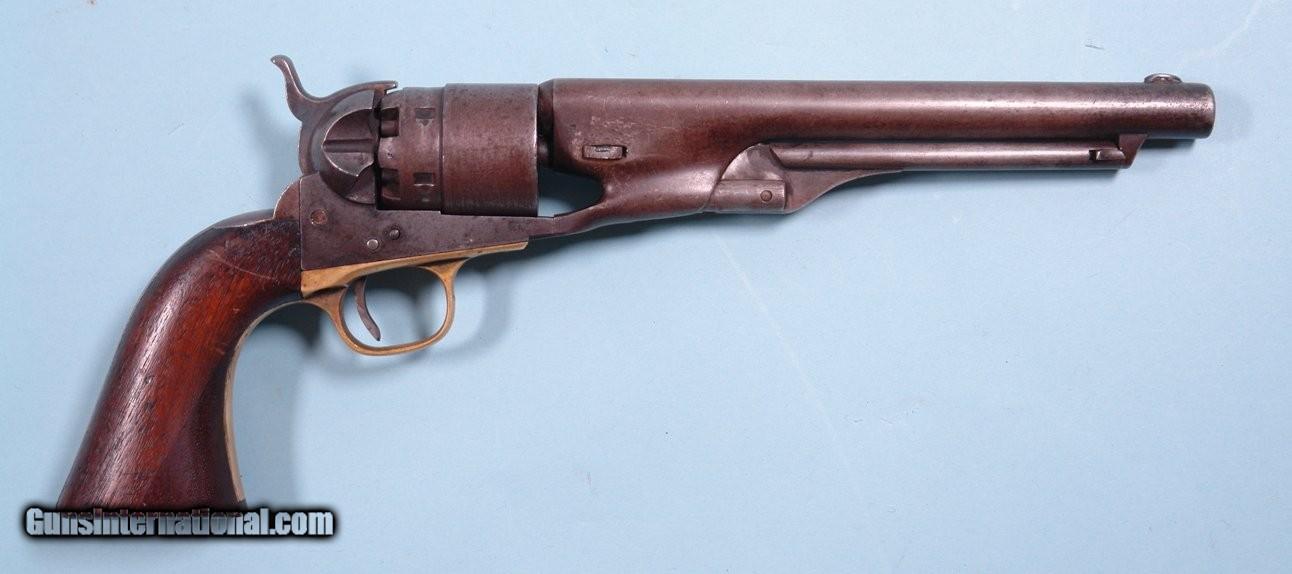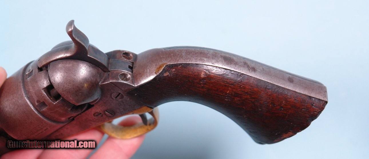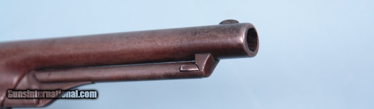 Description: CIVIL WAR ORIGINAL COLT U.S. MODEL 1860 PERCUSSION ARMY .44 CAL. REVOLVER IN THE KENTUCKY CAV. VOLS. SERIAL RANGE. Six shot with 8’ barrel with excellent address stamp (ADDRESS COL. SAML. COLT NEW-YORK U.S. AMERICA). Serial numbered in the 119xxx range close in number to many Model 1860’s issued to the 4th Kentucky U.S. Cavalry during the Civil War as recorded in Springfield Armory records now in the National Archives. 100% original and all matching except the cylinder which is a field replacement inspected with the same “HH” Ordnance inspection marks as the barrel. Extra nice sharp markings and all original patina with traces of case hardening on hammer. Very nice “NAVAL ENGAGEMENT” cylinder scene. Original grips with visible cartouches on both sides and the original finish. Working order and very good bore and chambers. SOLD Antique: Yes Handgun Caliber: .44 |