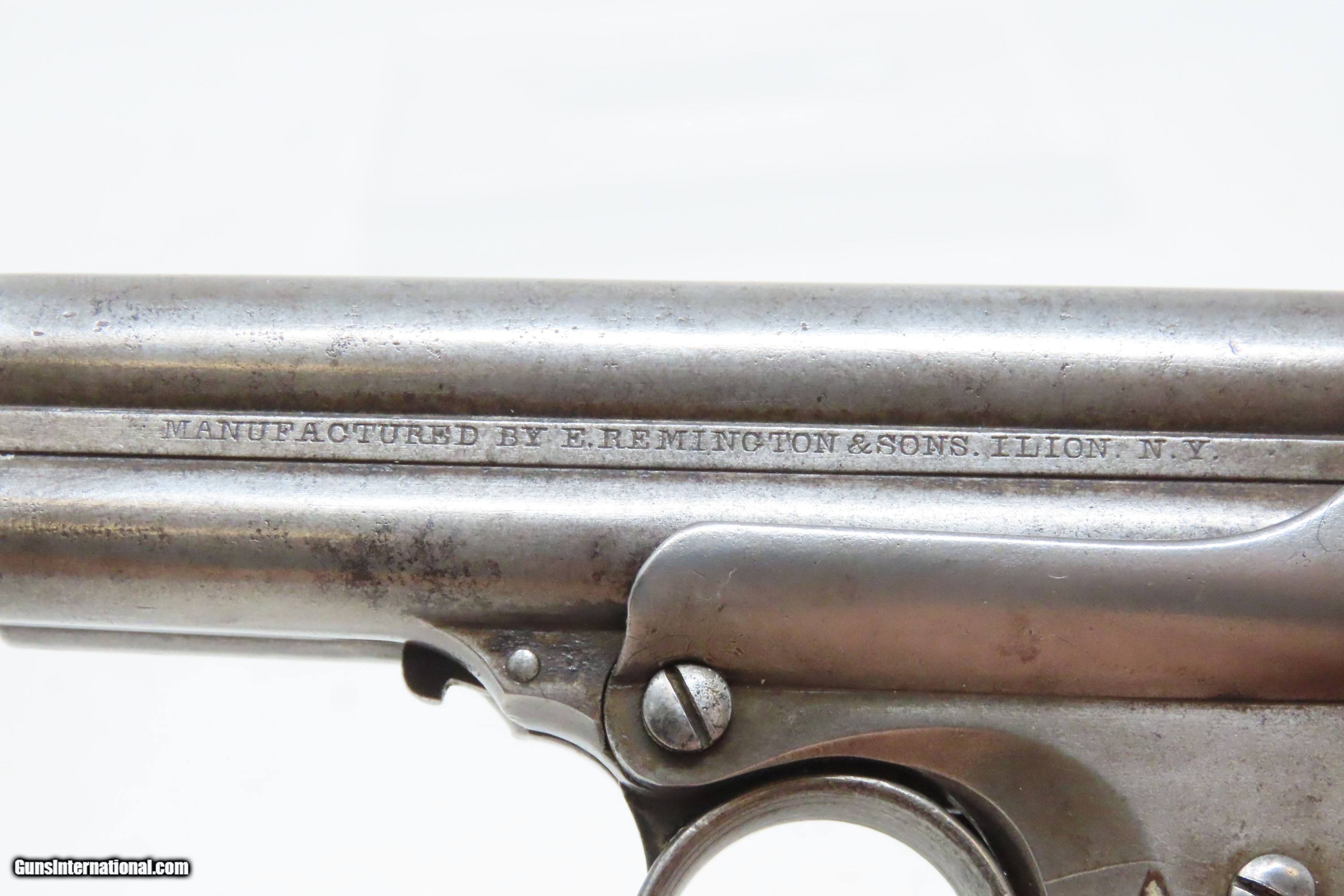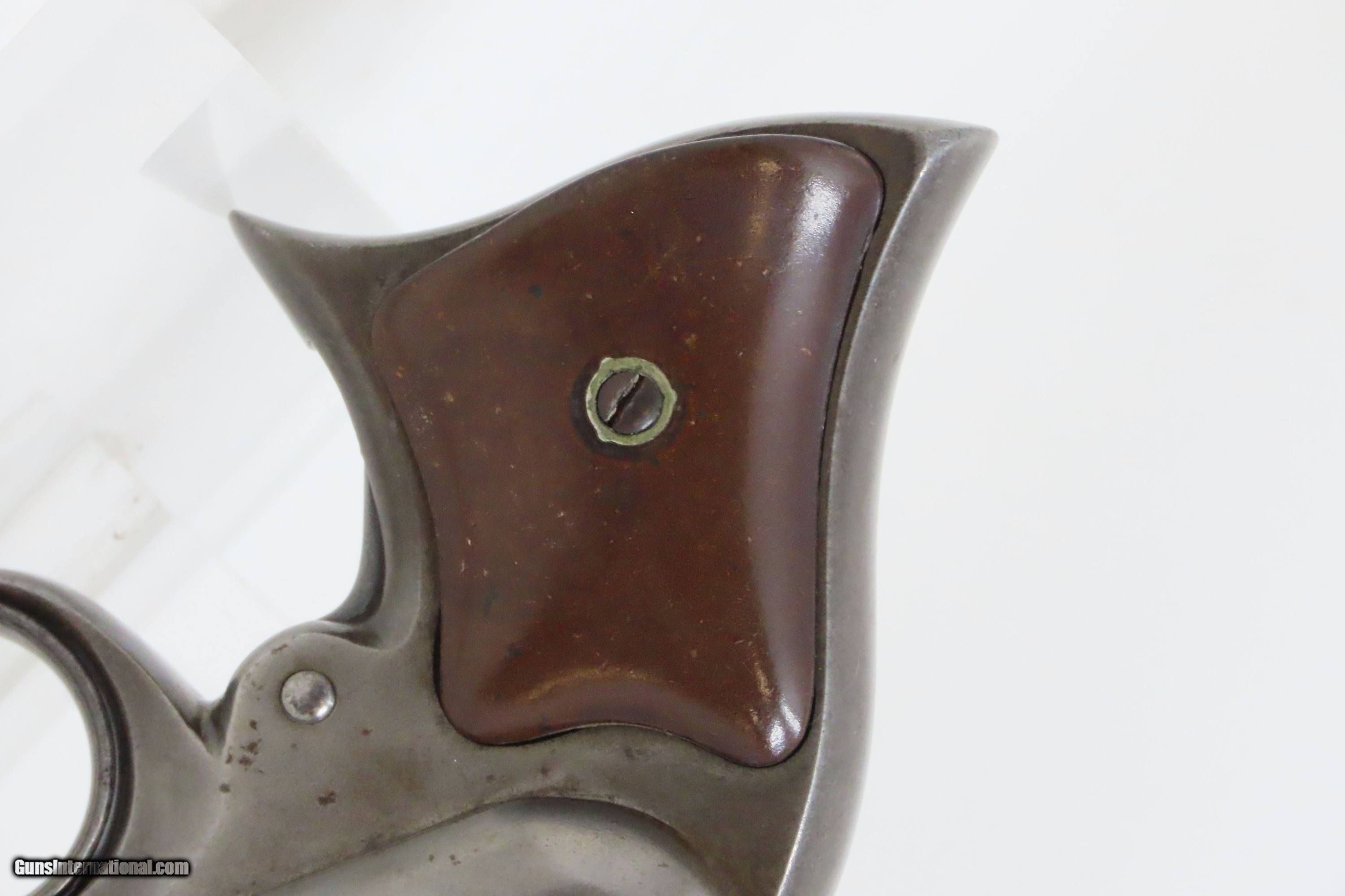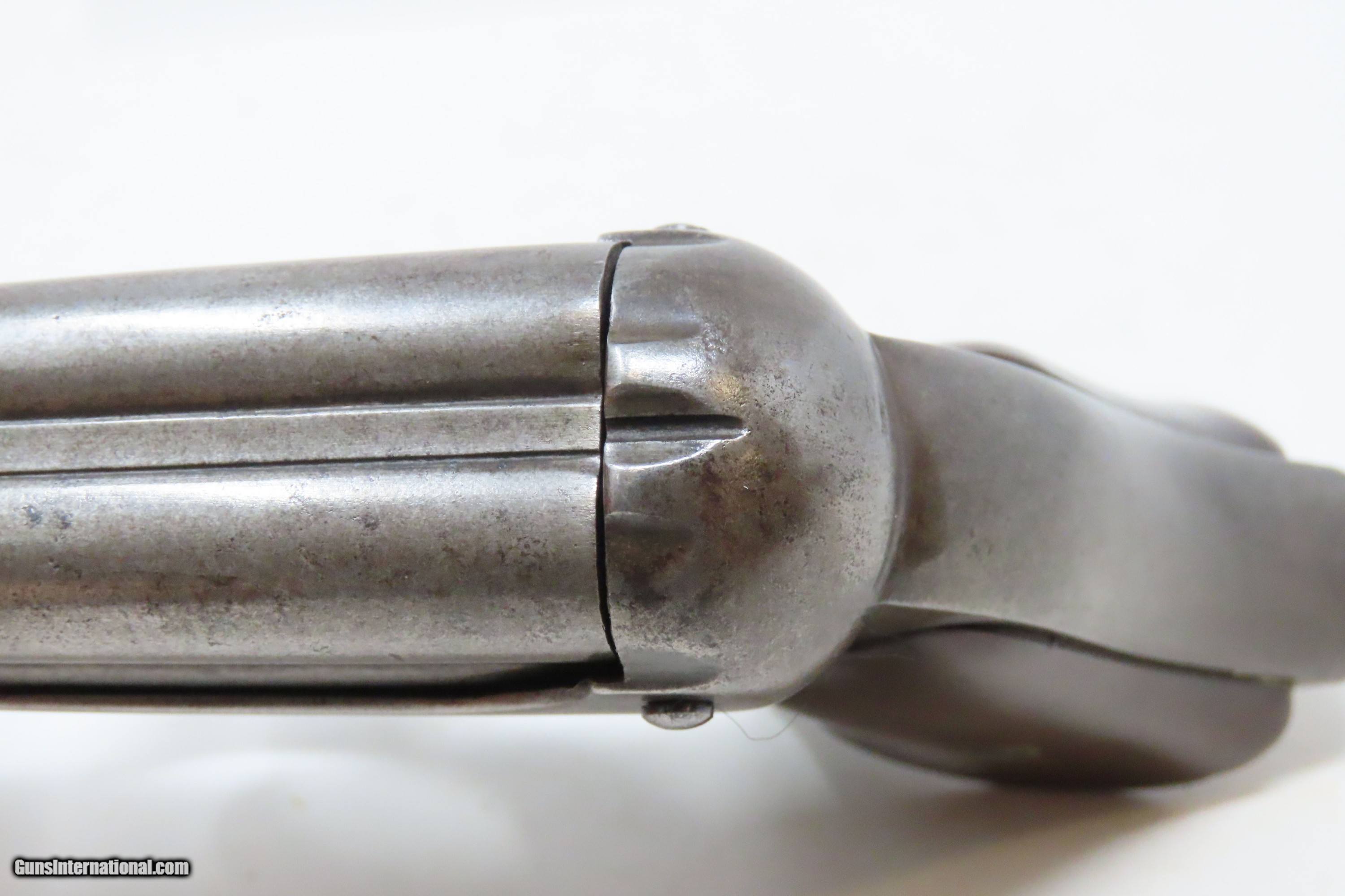 Description: Civil War REMINGTON-ELLIOT Antique RING TRIGGER .32 RF PEPPERBOX Pistol Civil War Era 4-Shot Deringer Pistol Here we present an antique Remington-Elliot .32 Caliber Pepperbox Pistol, made circa the Civil War Era in Ilion, New York, also known as Remington’s “New Repeating Pistol (Elliot’s Patent) No. 2”. Manufactured from 1863 to 1888, this is a four shot, .32 caliber ring trigger pistol using a cluster of stationary barrels and a revolving firing pin, similar in concept to the Sharps Pepperboxes. It features a German silver blade front and frame notched rear sights. This pepperbox is functionally double action only, with the concealed hammer operated entirely by the motion of the ring trigger. The grip section is contoured so the butt rests on the ring finger. This repeating design was able to utilize the new rimfire ammunition like Smith & Wesson, without infringing on Smith & Wesson’s Rollin White Patent for bored through chambers on a revolver’s cylinder. They made very nice, easy to use and compact firearms for 19th century conceal and carry. Though not a primary military arm during the American Civil War, handguns like this were commonly privately purchased by soldiers for use on the battlefield. Whether legend or fact, it is interesting to note something commonly read about pocket pistols of the day, is that while they could be used for self-defense against the enemy, many soldiers kept them on their person to defend themselves against an unwanted amputation in the primitive field hospitals that were notorious, even in their day. The overall condition is good. Most of the action functions, but the firing pin does not rotate. Good bores for their ages. Both grips are in good shape and contain light handling wear. Markings are sharp. Numbers match. Own the original! This is a legitimate antique and not a reproduction. Barrel is 3-3/8 inches. Caliber: .32 Rimfire Overall condition as seen in photos. Very Fast. Very Safe. FREE SHIPPING WORLDWIDE. Delivered directly to your door by express mail! Guaranteed AUTHENTIC & Includes CERTIFICATE OF AUTHENTICITY. ancestryguns $1200 #233815 SOLD Antique: Yes |