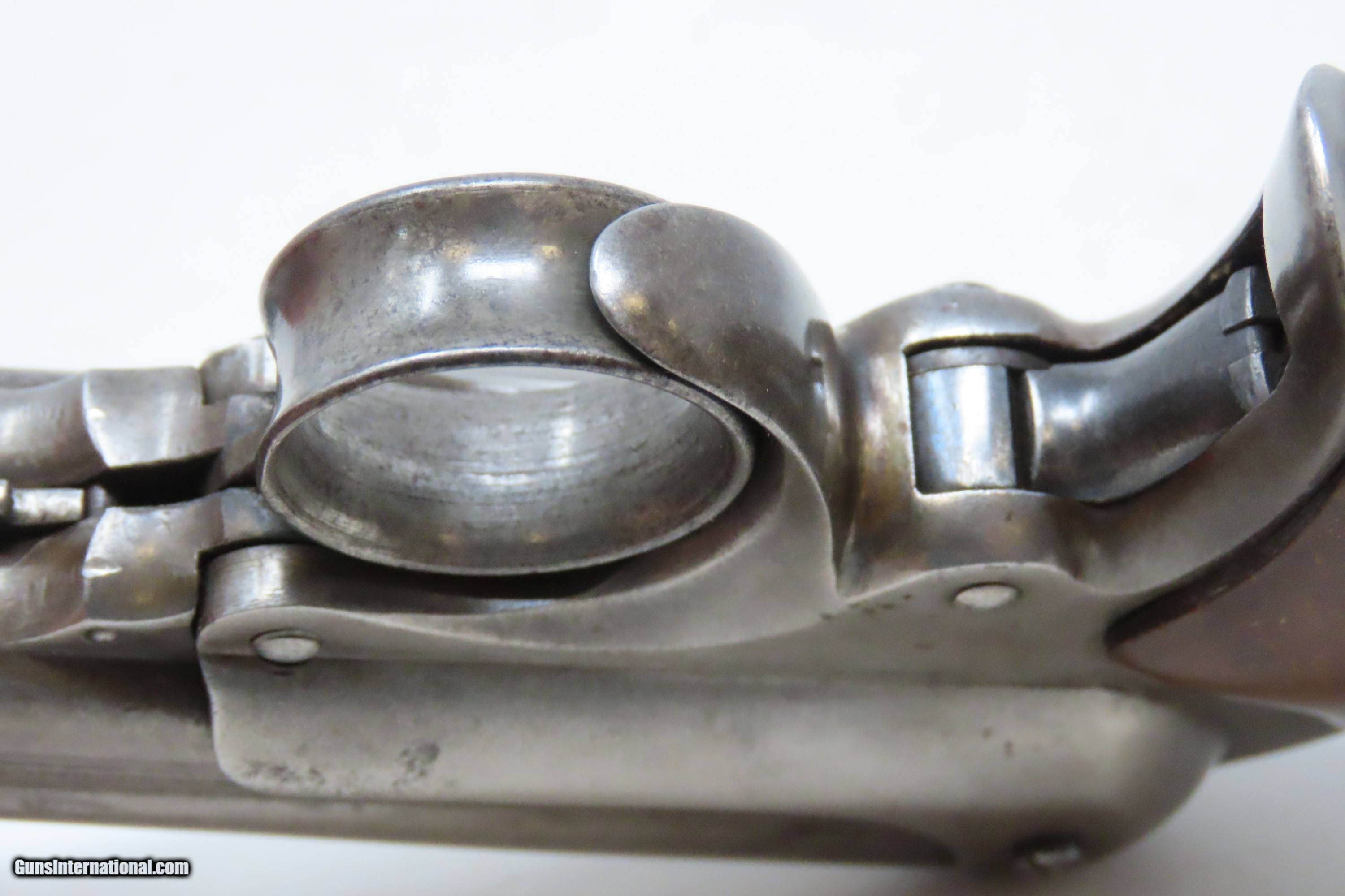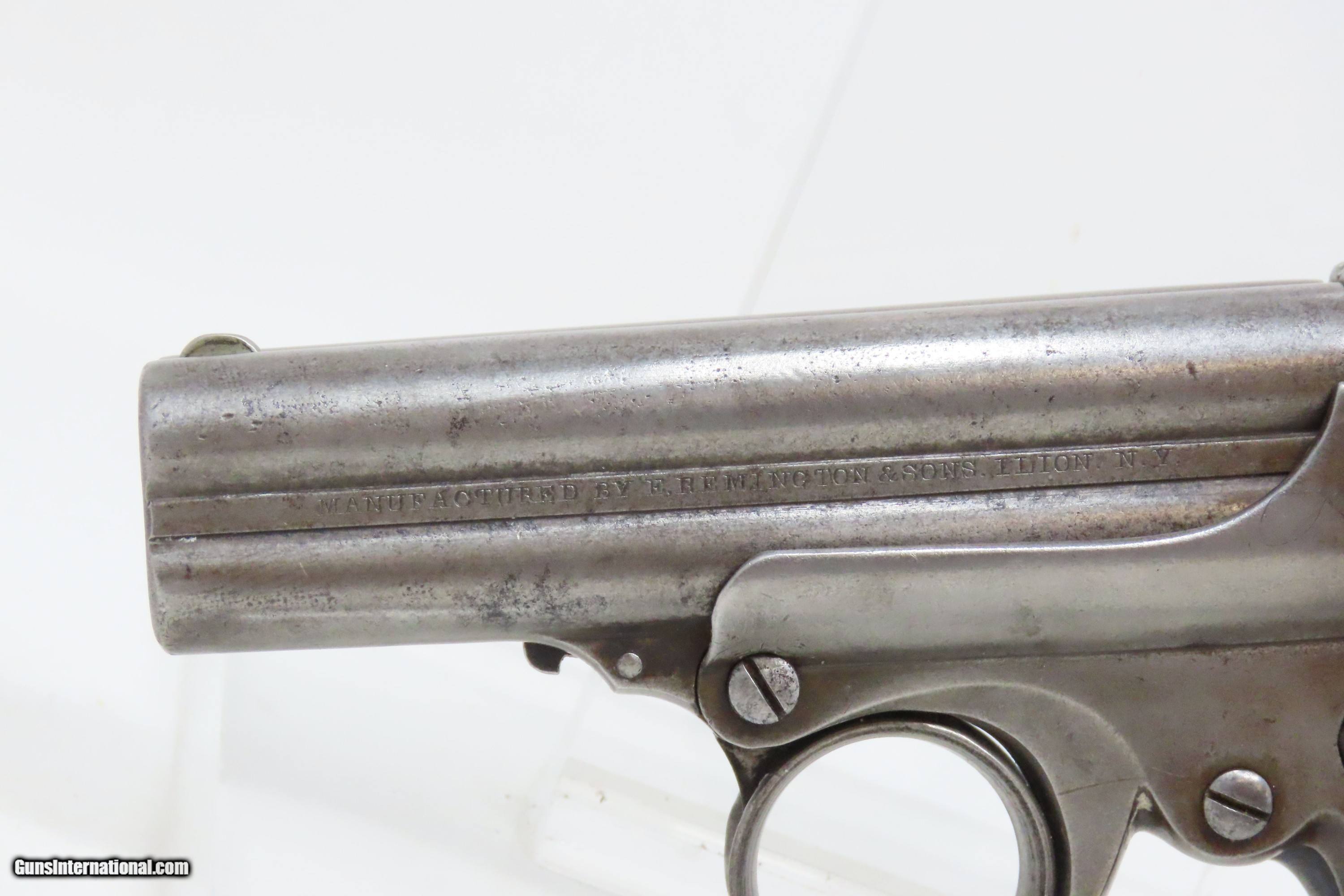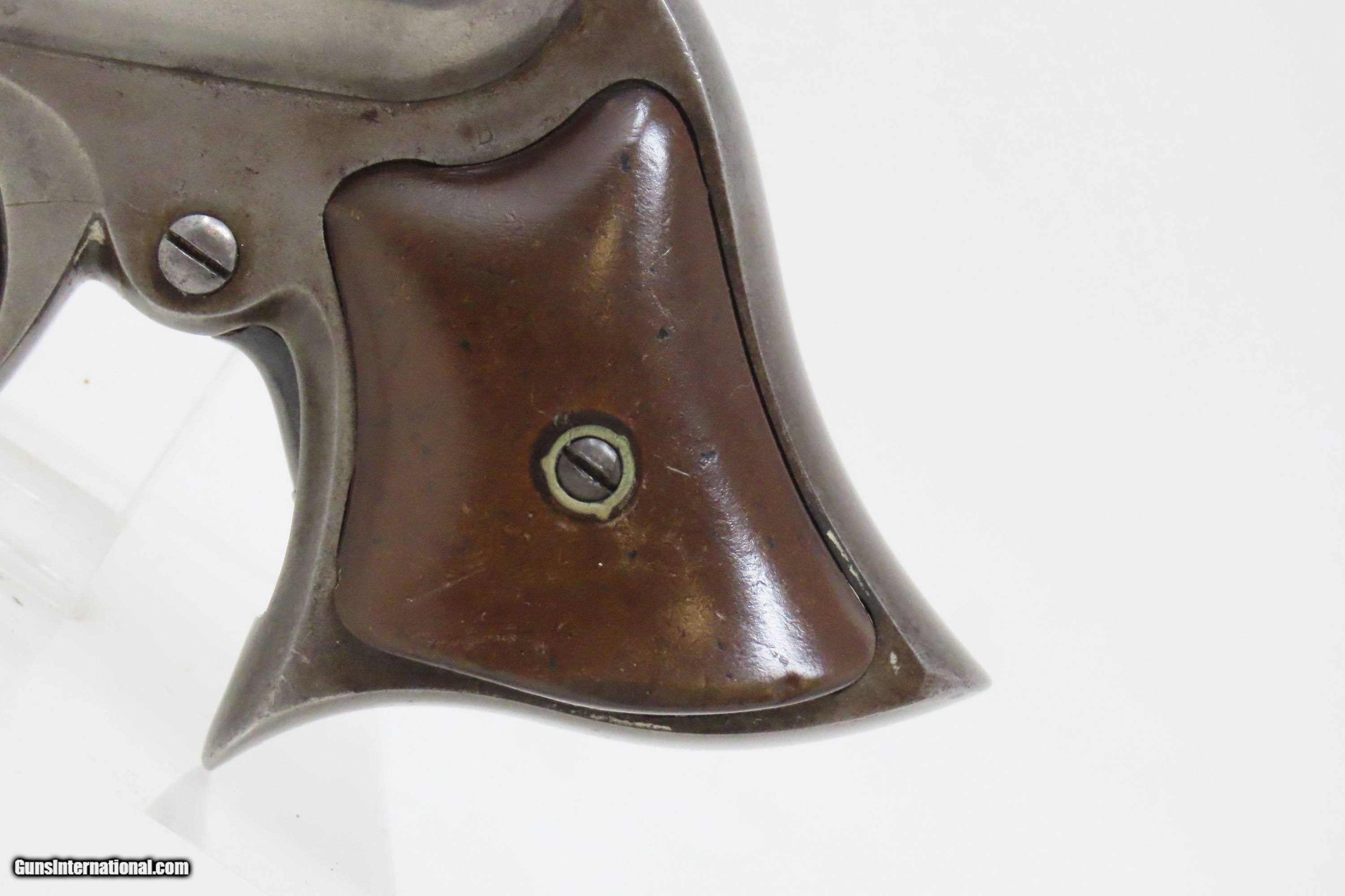 Description: Civil War REMINGTON-ELLIOT Antique RING TRIGGER .32 RF PEPPERBOX Pistol Civil War Era 4-Shot Deringer Pistol Here we present an antique Remington-Elliot .32 Caliber Pepperbox Pistol, made circa the Civil War Era in Ilion, New York, also known as Remington’s “New Repeating Pistol (Elliot’s Patent) No. 2”. Manufactured from 1863 to 1888, this is a four shot, .32 caliber ring trigger pistol using a cluster of stationary barrels and a revolving firing pin, similar in concept to the Sharps Pepperboxes. It features a German silver blade front and frame notched rear sights. This pepperbox is functionally double action only, with the concealed hammer operated entirely by the motion of the ring trigger. The grip section is contoured so the butt rests on the ring finger. This repeating design was able to utilize the new rimfire ammunition like Smith & Wesson, without infringing on Smith & Wesson’s Rollin White Patent for bored through chambers on a revolver’s cylinder. They made very nice, easy to use and compact firearms for 19th century conceal and carry. Though not a primary military arm during the American Civil War, handguns like this were commonly privately purchased by soldiers for use on the battlefield. Whether legend or fact, it is interesting to note something commonly read about pocket pistols of the day, is that while they could be used for self-defense against the enemy, many soldiers kept them on their person to defend themselves against an unwanted amputation in the primitive field hospitals that were notorious, even in their day. The overall condition is good. Most of the action functions, but the firing pin does not rotate. Good bores for their ages. Both grips are in good shape and contain light handling wear. Markings are sharp. Numbers match. Own the original! This is a legitimate antique and not a reproduction. Barrel is 3-3/8 inches. Caliber: .32 Rimfire Overall condition as seen in photos. Very Fast. Very Safe. FREE SHIPPING WORLDWIDE. Delivered directly to your door by express mail! Guaranteed AUTHENTIC & Includes CERTIFICATE OF AUTHENTICITY. ancestryguns $1200 #233815 SOLD Antique: Yes |