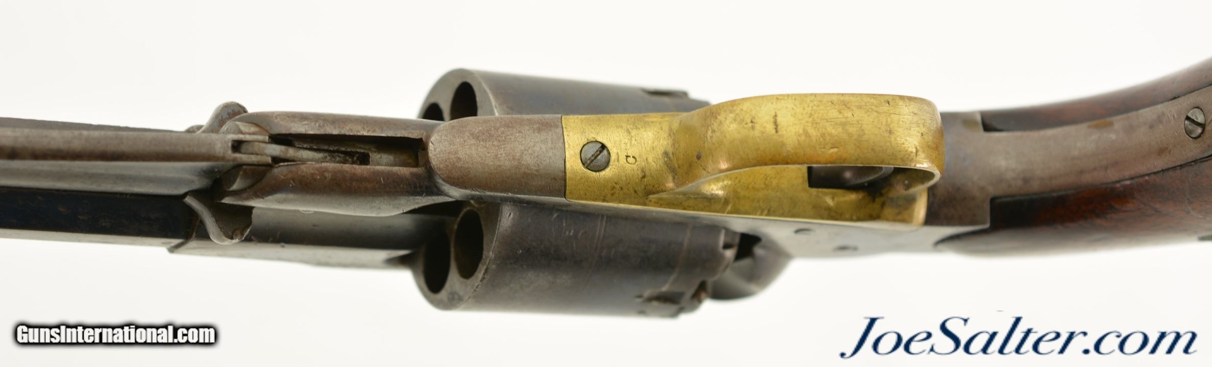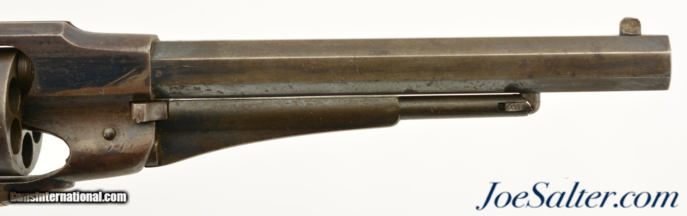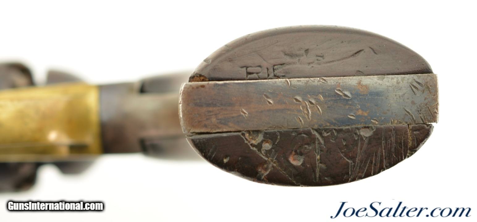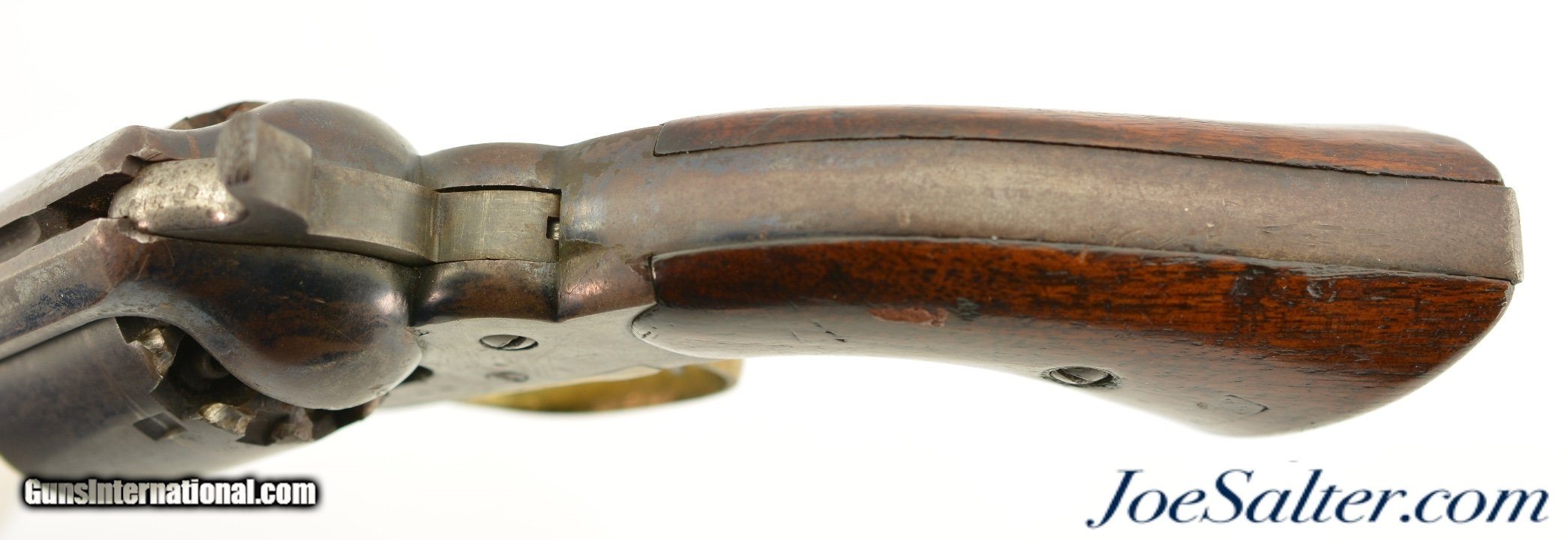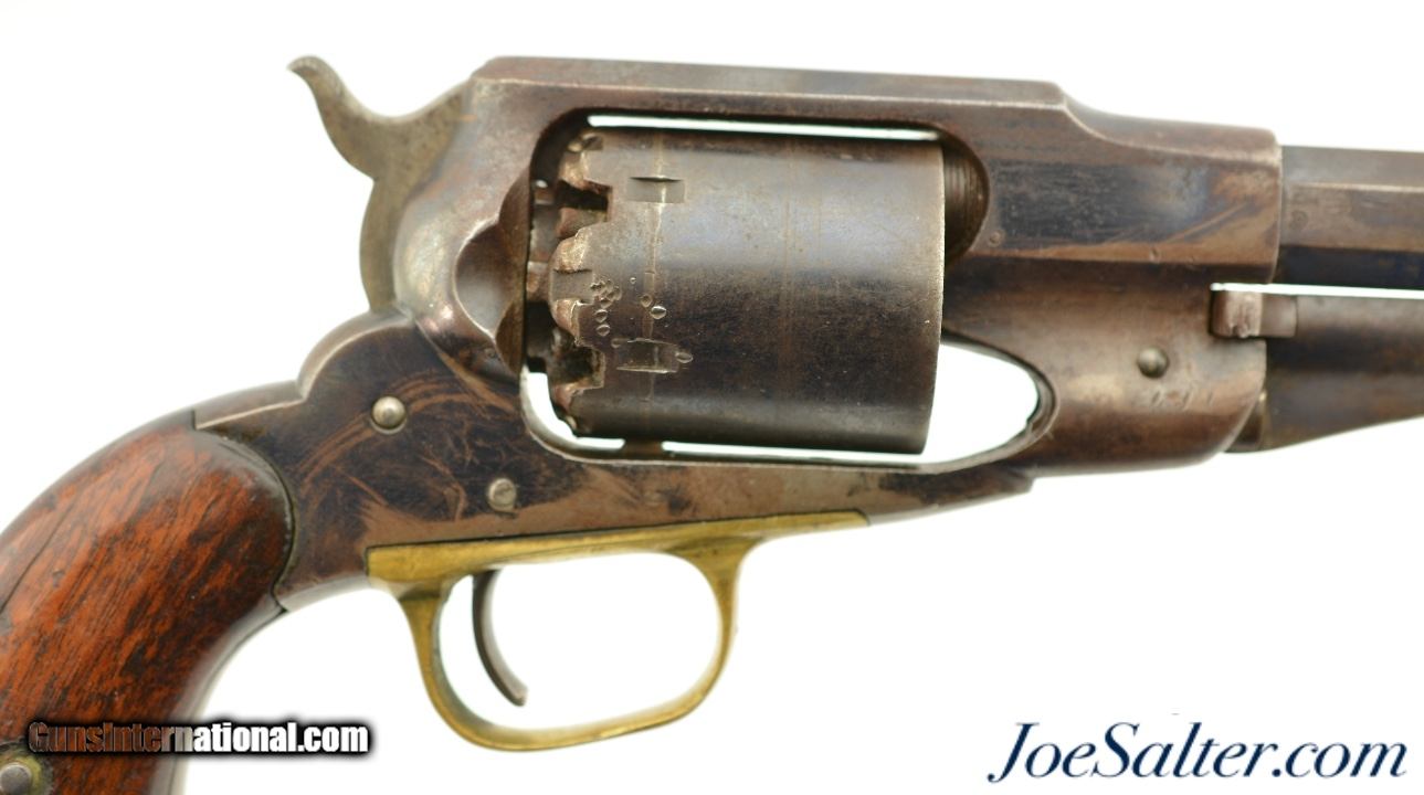 Description: Serial #46958, .44 Caliber, 8" octagon barrel with a very good bore that has some minor freckling within the grooves. This is a handsome revolver that retains 50-60% of the original bright blue finish with the balance flaked to a smooth, plum-brown patina that has scattered spots of mild freckling, as well as some small peen marks on the frame around and on the head of the cylinder pin. Surface scratches are present on the left side of the frame below the recoil shield, some further surface freckling is present on the cylinder and barrel, with traces of muted original color case-hardening still present on the hammer. The walnut grips are in good-very good shape with numerous handling marks present in the thick, added oil finish. The cartouche is still visible on the left panel, with . The lock-up is solid, and the action functions flawlessly. This revolver does not look like it was ever issued, or if it was, not to someone who carried very much in the field, and most of the finish loss is due to poor storage. This is a great, high condition example of a desirable Civil War revolver, and rates fine-near excellent overall. Antique SOLD |