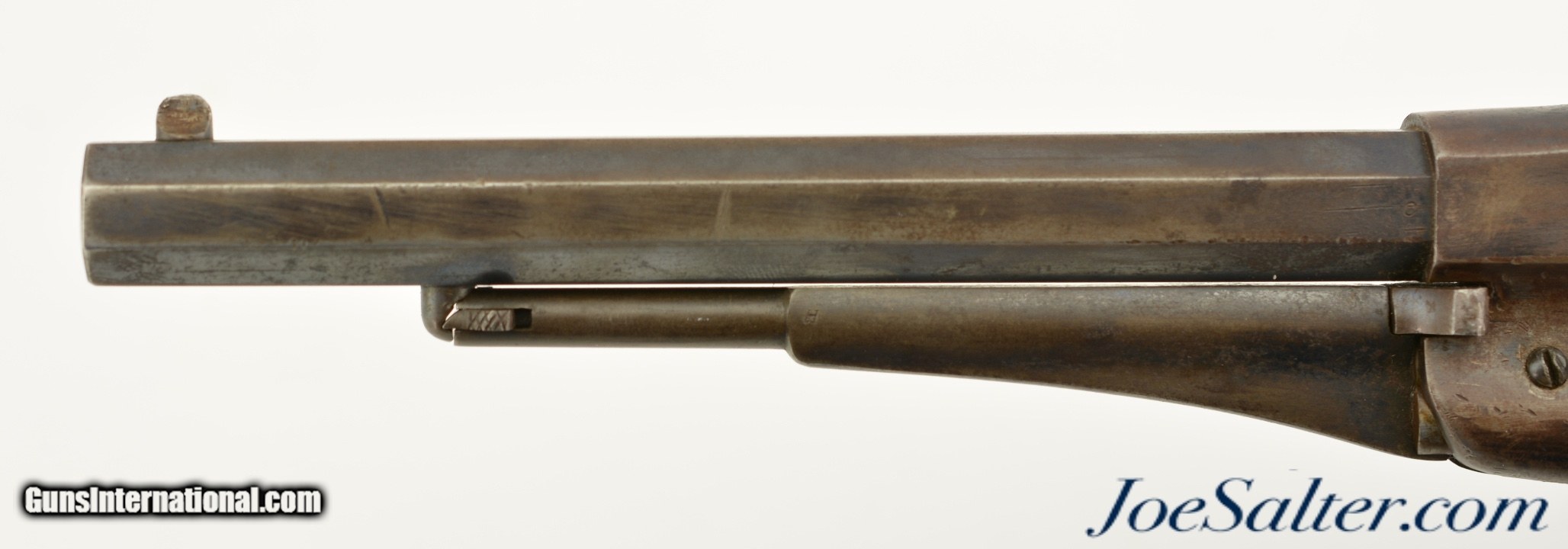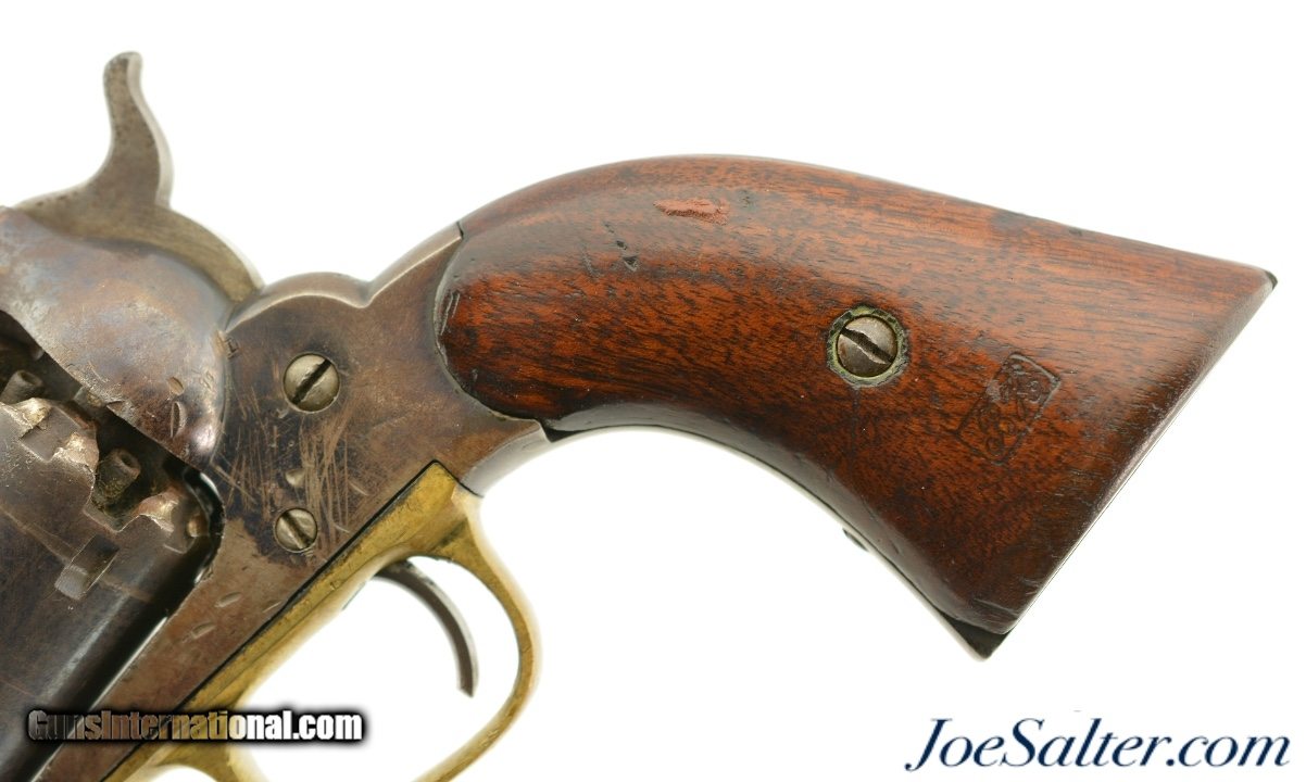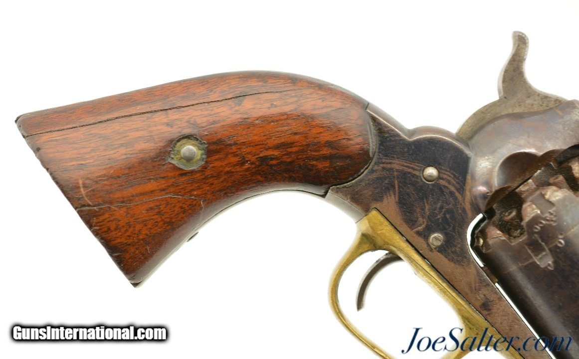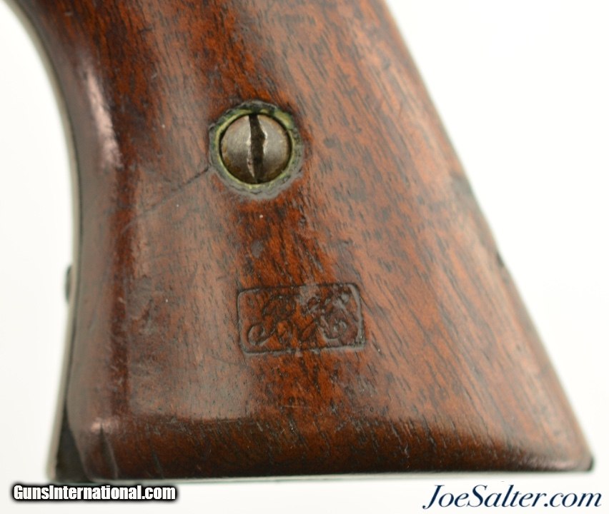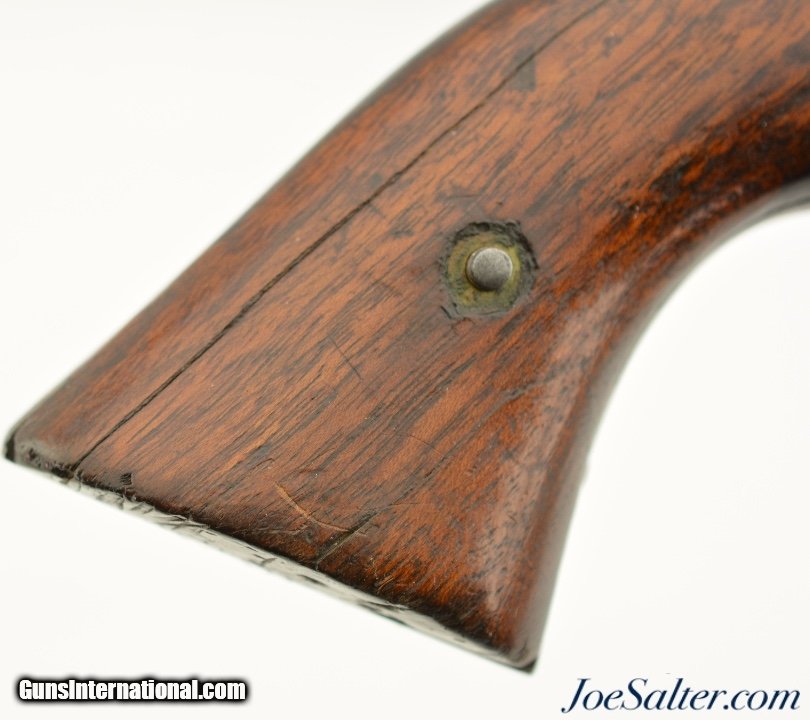 Description: Serial #46958, .44 Caliber, 8" octagon barrel with a very good bore that has some minor freckling within the grooves. This is a handsome revolver that retains 50-60% of the original bright blue finish with the balance flaked to a smooth, plum-brown patina that has scattered spots of mild freckling, as well as some small peen marks on the frame around and on the head of the cylinder pin. Surface scratches are present on the left side of the frame below the recoil shield, some further surface freckling is present on the cylinder and barrel, with traces of muted original color case-hardening still present on the hammer. The walnut grips are in good-very good shape with numerous handling marks present in the thick, added oil finish. The cartouche is still visible on the left panel, with . The lock-up is solid, and the action functions flawlessly. This revolver does not look like it was ever issued, or if it was, not to someone who carried very much in the field, and most of the finish loss is due to poor storage. This is a great, high condition example of a desirable Civil War revolver, and rates fine-near excellent overall. Antique SOLD Antique: Yes |