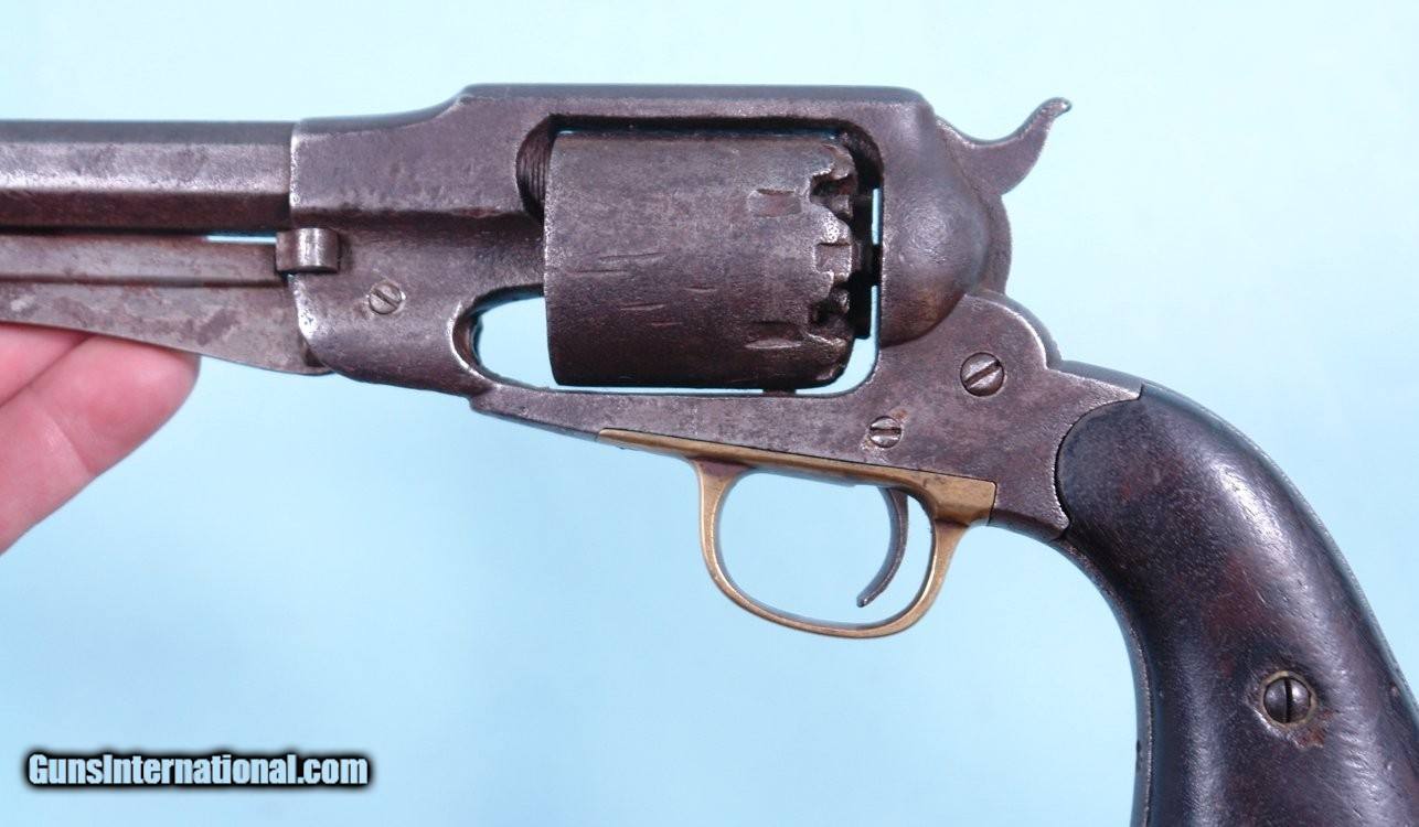 Description: CIVIL WAR REMINGTON U.S. NEW MODEL .44 CAL. PERCUSSION ARMY REVOLVER CIRCA 1863-64. Six-shot with 8” barrel having the “E. REMINGTON & SONS, ILION, NEW YORK U.S.A./NEW MODEL” barrel address stamp with the Sept. 14, 1858 patent date. All original and complete and matching. Old worn dark patina overall with the grips moderately worn. Ordnance sub-inspection marks on metal parts. Cocks properly but cylinder does not rotate. Dark bore. From a 1940’s-1960’s old Virginia collection of relic Civil War arms from around the area of the Battle of Petersburg. Nice display example. SOLD Antique: Yes Handgun Caliber: .44 |