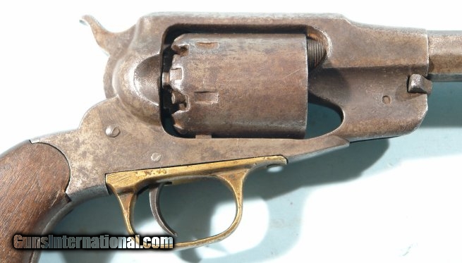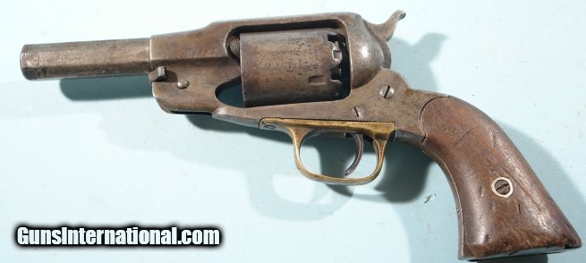 Description: CIVIL WAR REMINGTON U.S. NEW MODEL PERCUSSION ARMY REVOLVER CIRCA 1863. Early War production serial numbered in the 39,xxx range and all matching. Six shot .44 caliber with barrel shortened during the period of use to 4”. This is often encountered on revolvers that were captured by Confederate civilians and partisan Rangers that needed it to be more easily concealed. Very good overall with visible Remington barrel address. Has a very pleasing original patina. Original grips with wear. Working order. Quite colorful and has obviously seen Civil War service. SOLD Antique: Yes |