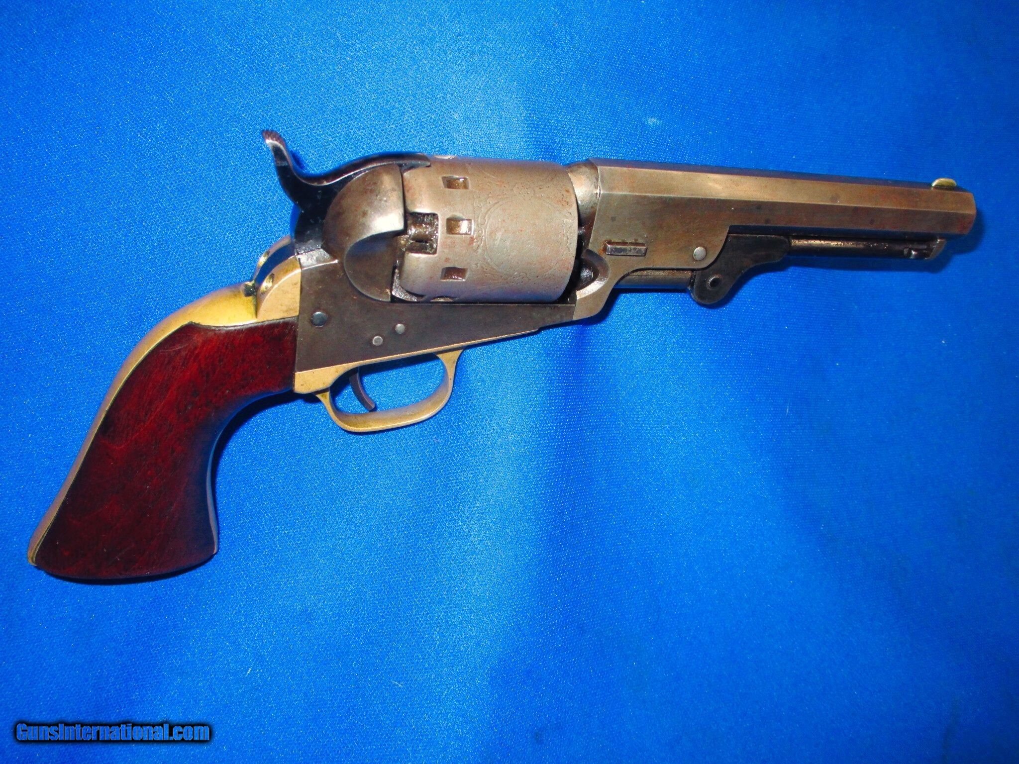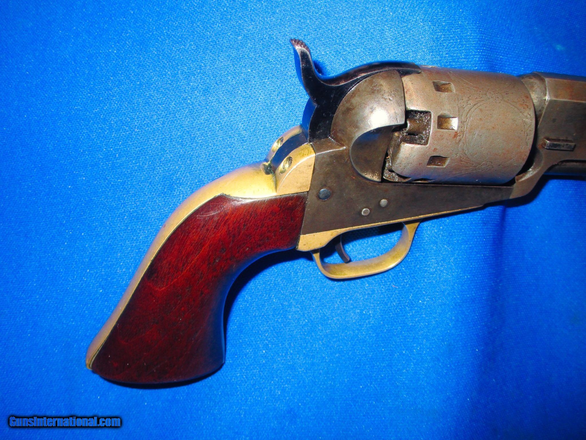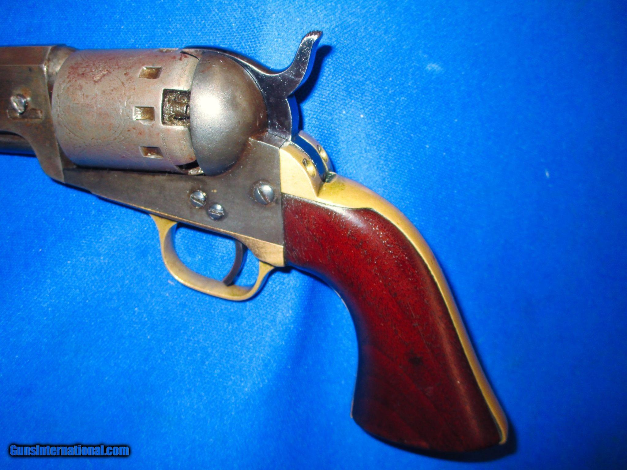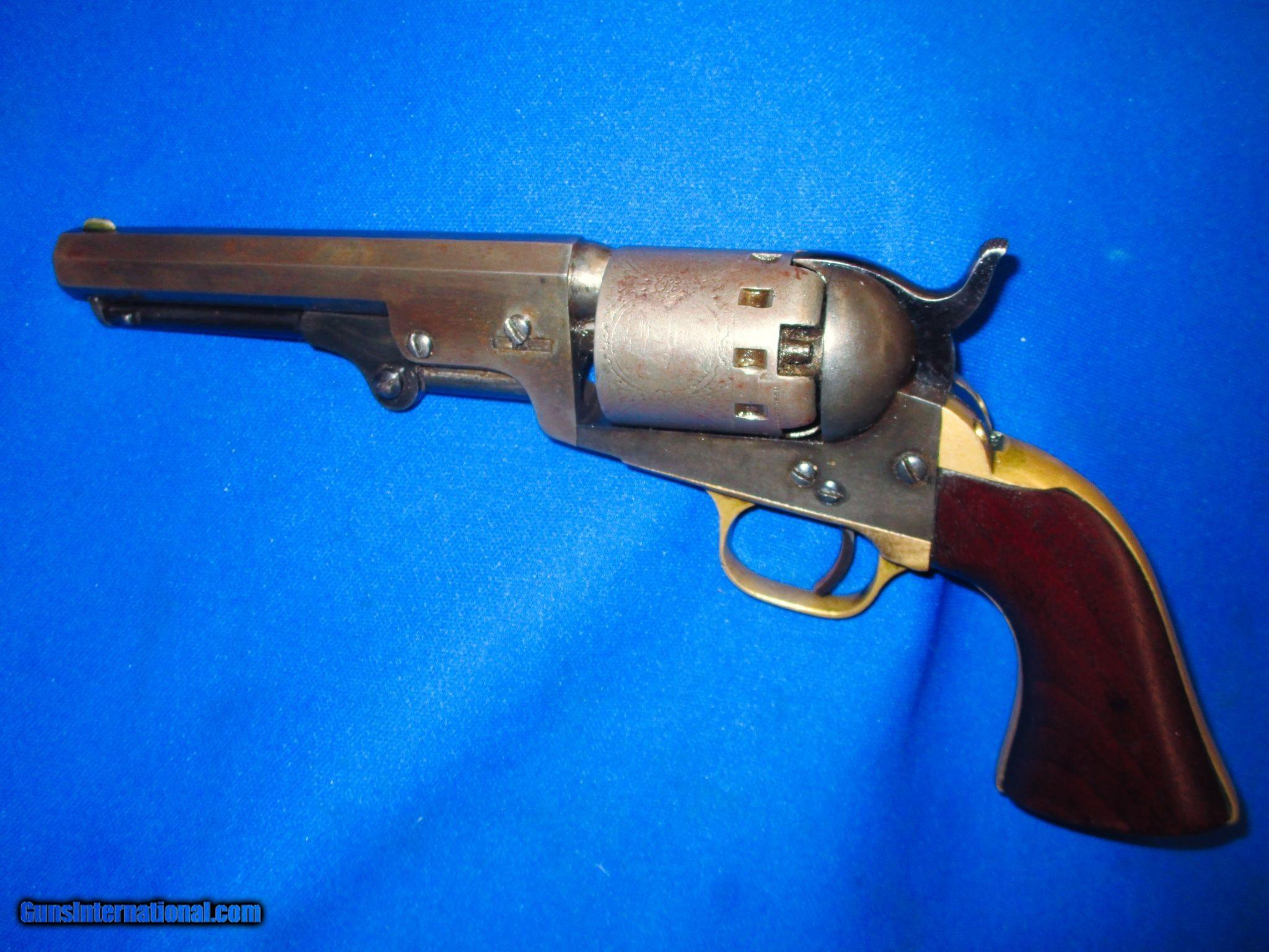 Description: An Early Civil War Series II Percussion Manhattan Navy Revolver With A 5 Inch Barrel In Very Good Untouched Condition. Serail #6,302, all matching numbers. All original and complete. Made 1860-1861 in .36 caliber. The revolver has nice metal, markings, and edges throughout. It has a full cyinder scene around it. All of the metal on the pistol has a nice darkening patina on it. It is darker in person than it is in the photos. The lighting makes it look lighter. The brass backstrap and trigger guard are fine & untouched with a mellow color on them. The original wood grips are excellent throughout with a wonderful color to them. The revolver has a very good bore and action. This Is A Very Nice Untouched Example Of An Early Civil War Series II Percussion .36 Caliber Manhattan Navy Revolver With A 5 Inch Barrel! DISCLAIMER: All firearms are sold as collector’s items only – we did not accept responsibility as to the shooting safety or reliability of any antique firearm. All firearms as described as accurately as possible, given the restraints of a catalog listing length. We want satisfied customers and often under describe the weapons. Any city or state regulations regarding owning antique firearms are the responsibility of the purchaser. All firearms are mechanically perfect unless noted, but again are NOT warranted as safe to fire. We do not sell or ship any Antique Guns or Antique Ammo to anywhere in New York State. Antique: Yes Manufacturer: Manhatten Model: Series II Navy Revolver Serial Number: 6302 Condition: Very Good Untouched Condition Metal Condition: Very Good Untouched Condition Wood Condition: Very Good Untouched Condition Bore Condition: Very Good Untouched Condition Action: Single Manufacture Date: 1860-1861 Grips: Wood Price: $1,195.00 Contact Seller |