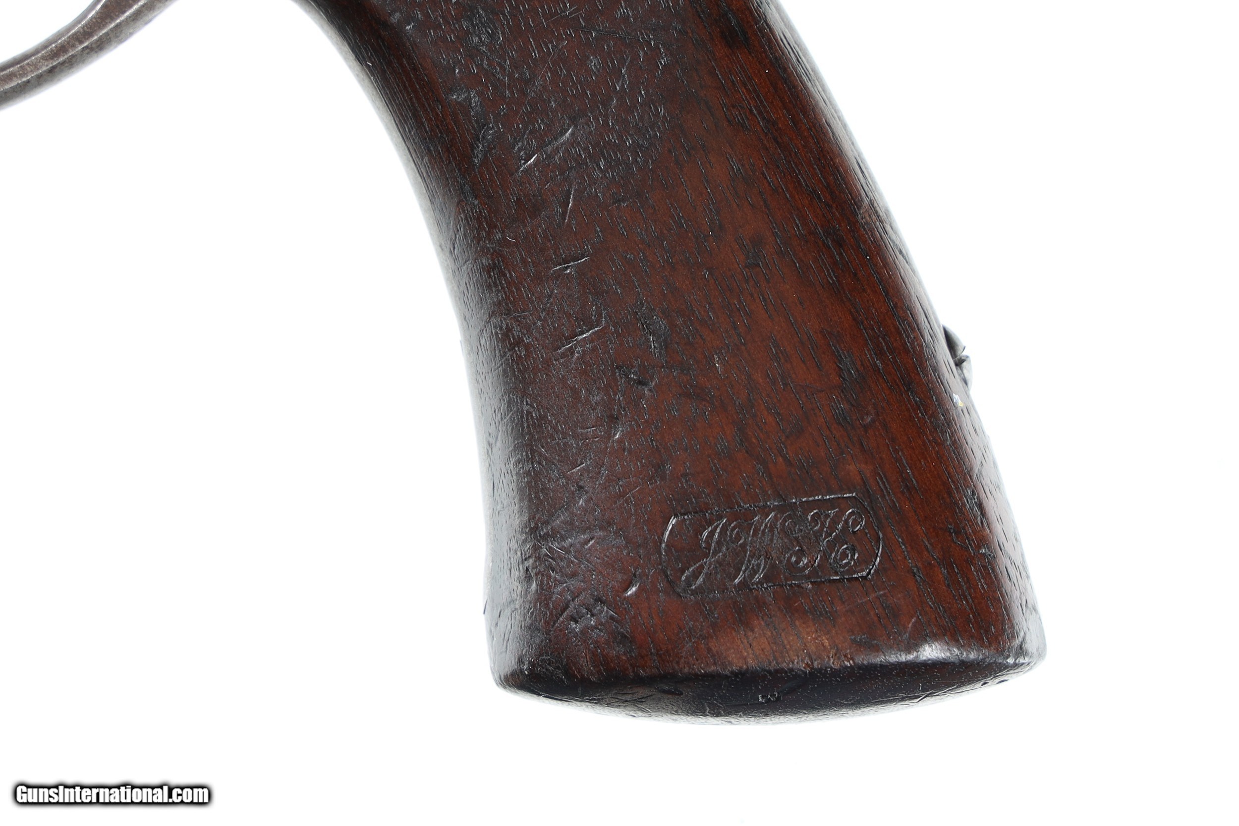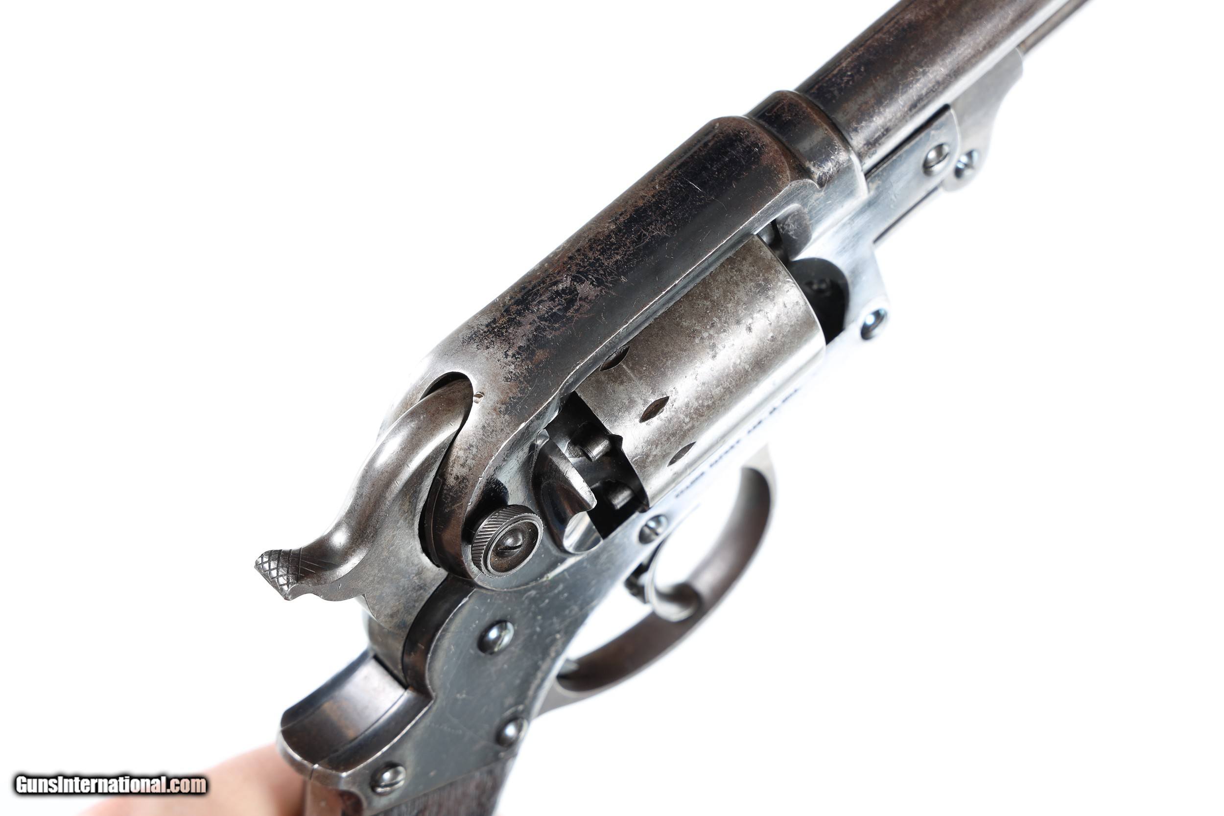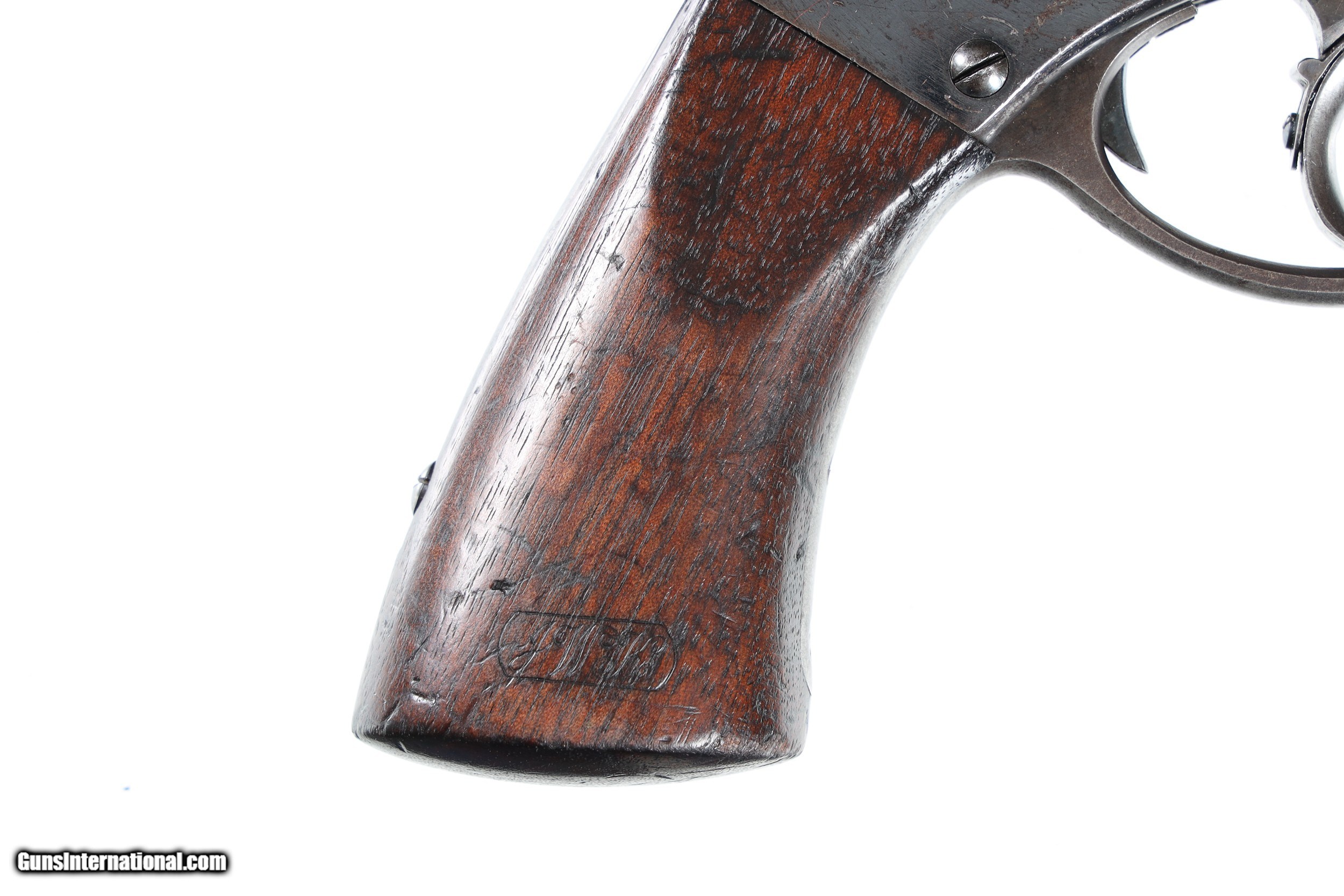 Description: Civil War issued Starr 44 Army Revolver. Serial Number 12382 Bbl, 6" Cal, .44 percussion Mfg, circa 1860. Large Frame Starr Arms Model 1858 Double Action Army pattern revolver. Cal, .44 percussion with 6 shot non-fluted cylinder. Blue finished with case color hammer. Blade front sight with grooved hammer rear sight. US Martially inspected with 2 cartouches on base of oil finished walnut grip. Double action operation. Condition. Very fine with an abundance of original blue finish on frame and in protected areas of the barrel. The action operates properly. The bore is very good and grips are very fine with some period of use bruises and impressions. Antique SOLD Antique: Yes Handgun Caliber: .44 Manufacturer: Starr Arms Model: 1858 Serial Number: 12382 Barrel Length: 6 |