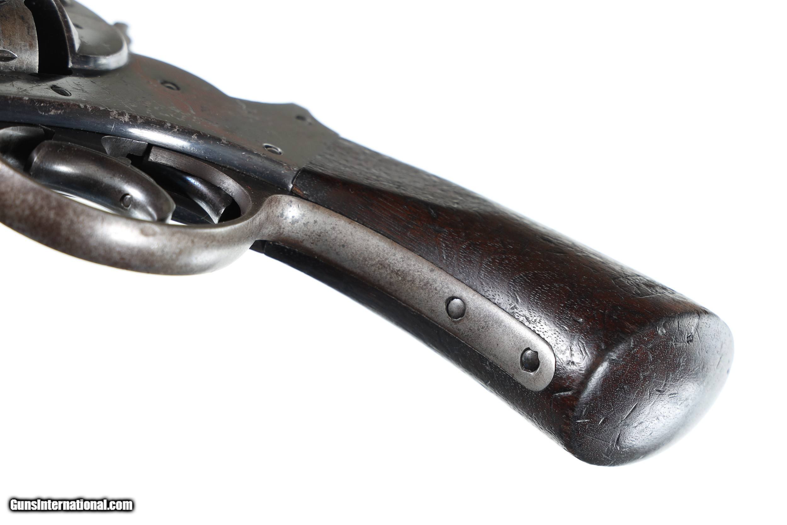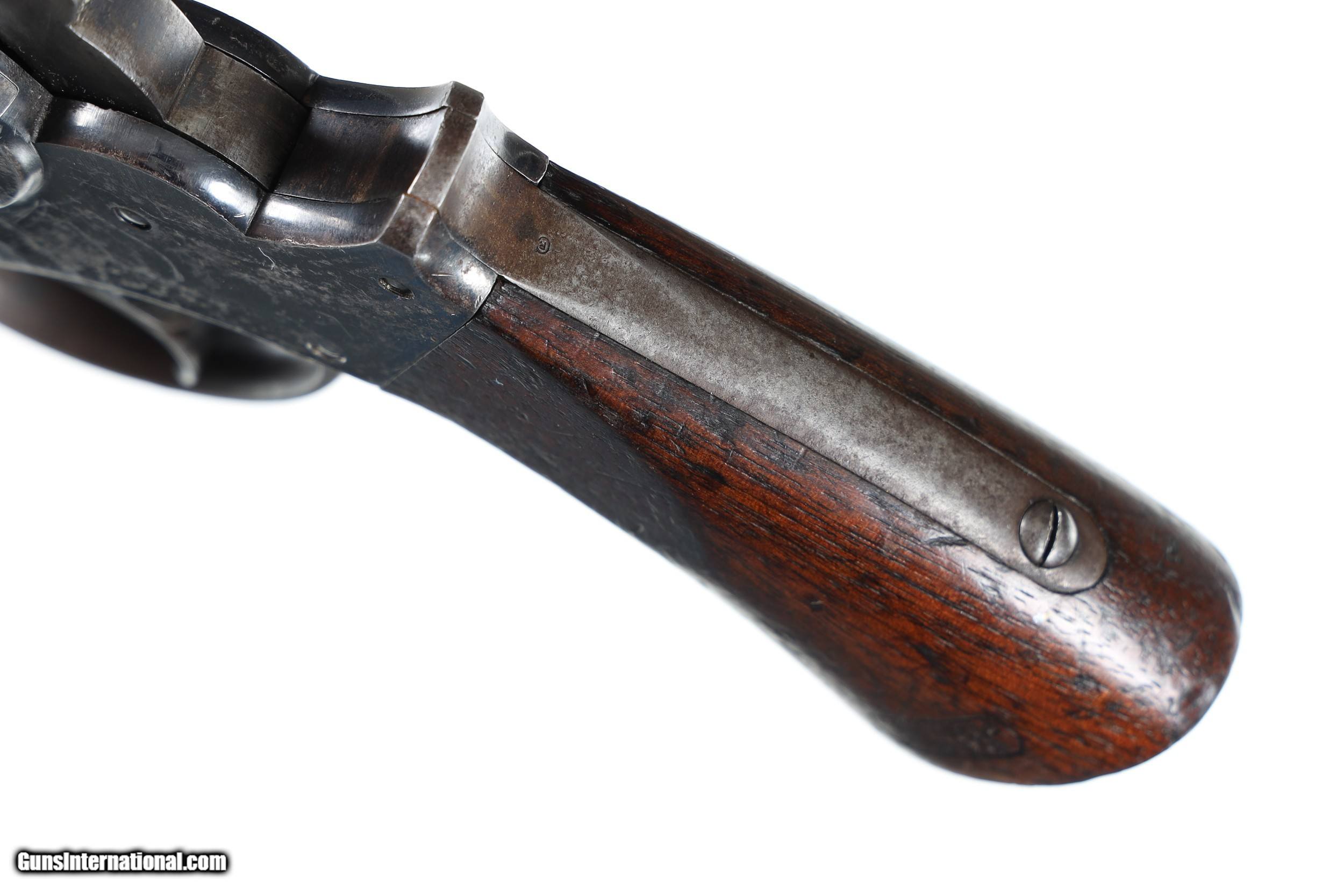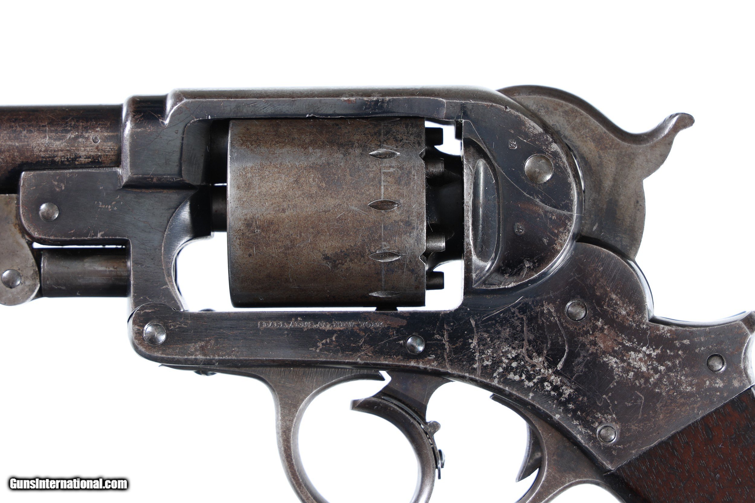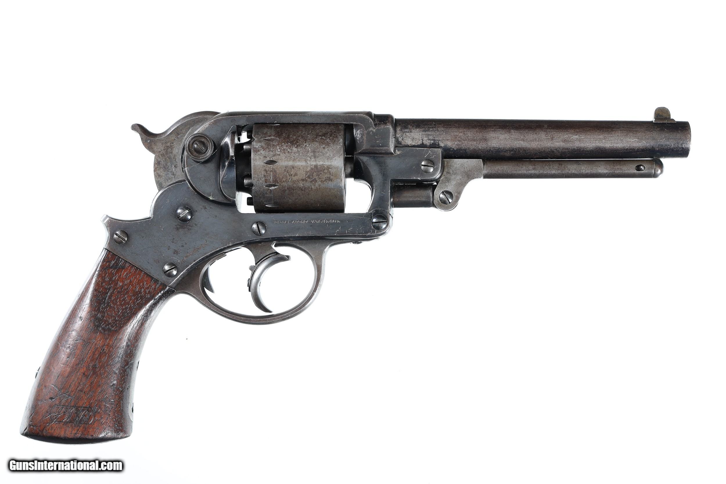 Description: Civil War issued Starr 44 Army Revolver. Serial Number 12382 Bbl, 6" Cal, .44 percussion Mfg, circa 1860. Large Frame Starr Arms Model 1858 Double Action Army pattern revolver. Cal, .44 percussion with 6 shot non-fluted cylinder. Blue finished with case color hammer. Blade front sight with grooved hammer rear sight. US Martially inspected with 2 cartouches on base of oil finished walnut grip. Double action operation. Condition. Very fine with an abundance of original blue finish on frame and in protected areas of the barrel. The action operates properly. The bore is very good and grips are very fine with some period of use bruises and impressions. Antique SOLD Antique: Yes Handgun Caliber: .44 Manufacturer: Starr Arms Model: 1858 Serial Number: 12382 Barrel Length: 6 |