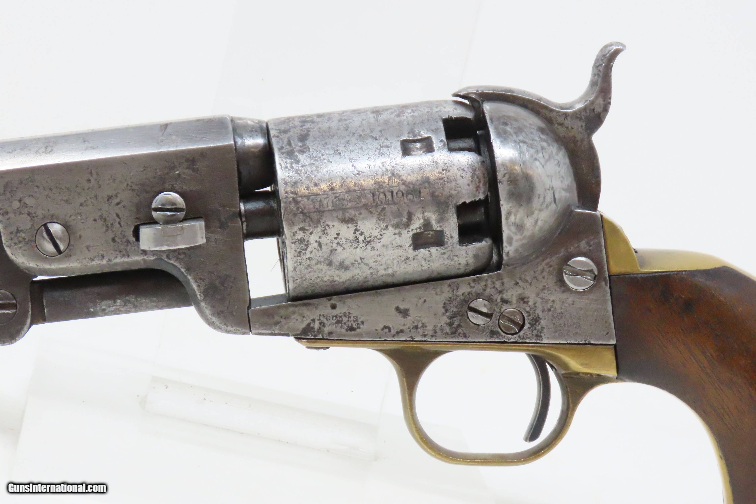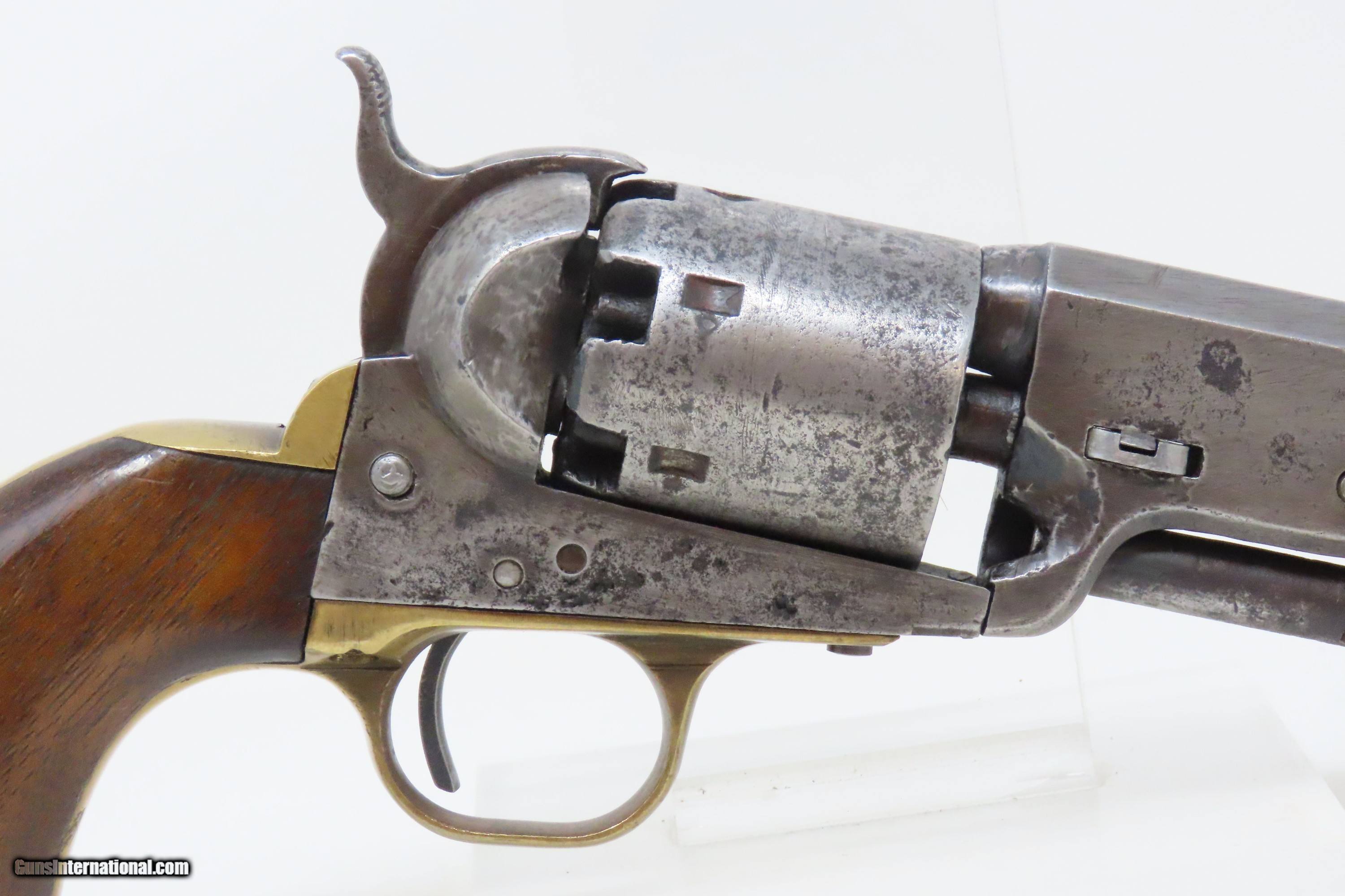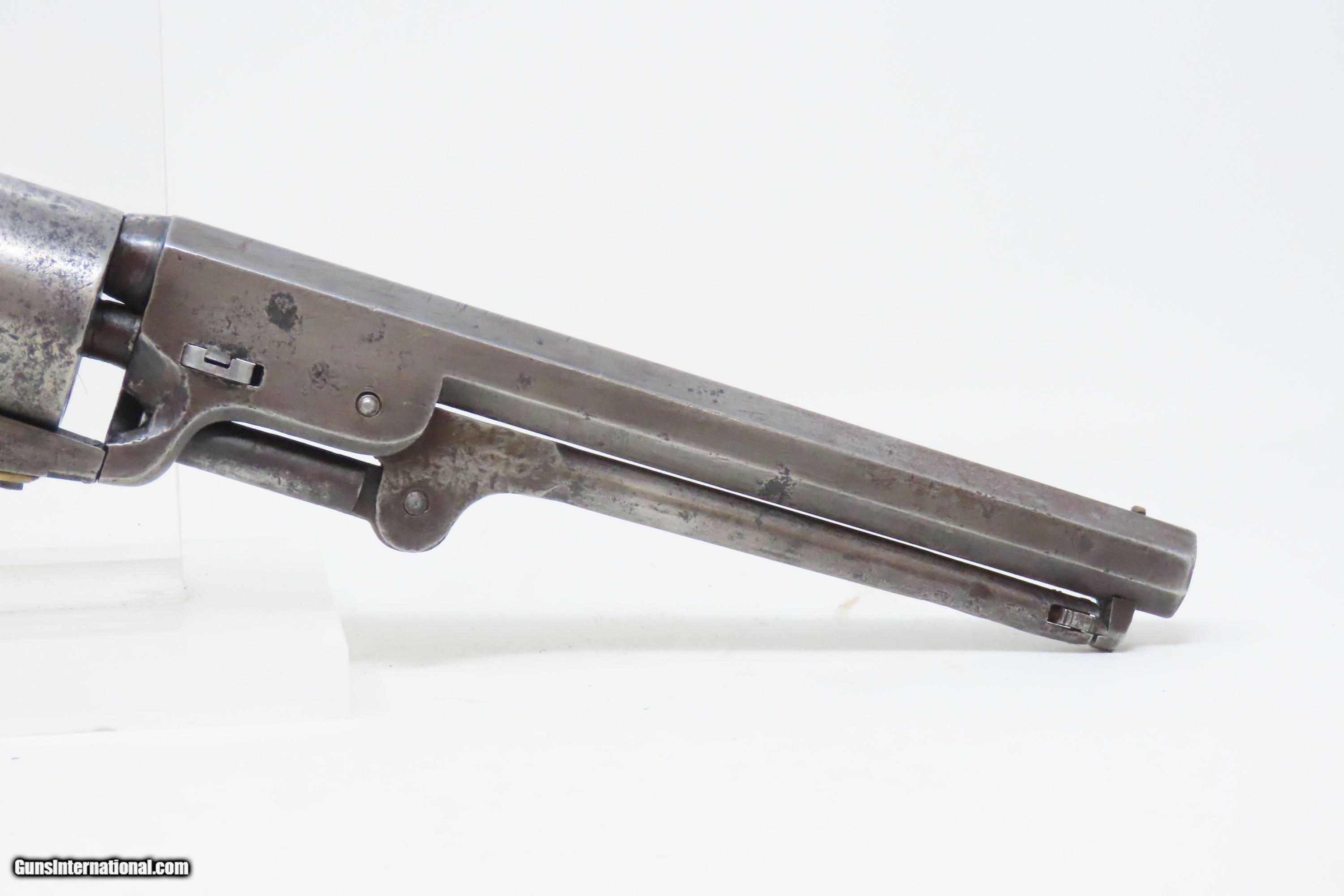 Description: CIVIL WAR / WILD WEST Antique COLT M1851 NAVY .36 Perc. Revolver GUNFIGHTER Manufactured in 1861 and used into the WILD WEST Here we present an antique Colt Model 1851 Navy Percussion Revolver, made at the start of the American Civil War in 1861 in Hartford, Connecticut. The 1851 Navy was one of Colt’s most famous and successful lines, reaching a production total of 257,348 from 1850 to 1873 (right up to the time of SAA production) from both Hartford and London factories. From Hartford alone, 185,000 were made by the end of the American Civil War. Many of these saw service during the conflict on both sides. There were some military purchases and lots of private purchases by soldiers going off to war. Though its name implies maritime use, most Navy revolvers primarily saw use on dry land, including in the Old West, which truly, the Colt 1851 Navy revolver ushered in the era of the gunfighter. Among the many guns that were used on the western frontier, none was more popular in its day than the Colt percussion revolver designated the 1851 Navy. This single action revolver weighed in at roughly 42 ounces. The Colt Navy was the first popular single-action revolver that could be worn comfortably on the belt. Prior to the beginning of the Civil War, the state of Missouri was a hotbed of trouble that often broke out in shooting fights. Bill Anderson, Jesse and Frank James, and the Youngers all cut their teeth on this border trouble and were ready to go when leaders like William Quantrill enlisted them in his guerilla band during the war. The boys from Missouri became quite proficient with their six-guns and generally carried a brace of Dragoons on their saddle pommels and a brace of Navy revolvers on their hip. The overall condition is good. The action functions, but the hammer has resistance when cocked. Good bore for its age. Solid grip, average wear. Markings are legible. Numbers match. Light remnants of the cylinder scene remain. Own the original! This is a legitimate antique and not a reproduction. Barrel is 7-1/2 inches. Caliber: .36 Percussion Overall condition as seen in photos. Very Fast. Very Safe. FREE SHIPPING WORLDWIDE. Delivered directly to your door by express mail! Guaranteed AUTHENTIC & Includes CERTIFICATE OF AUTHENTICITY. ancestryguns $2000 #233145 SOLD Antique: Yes |