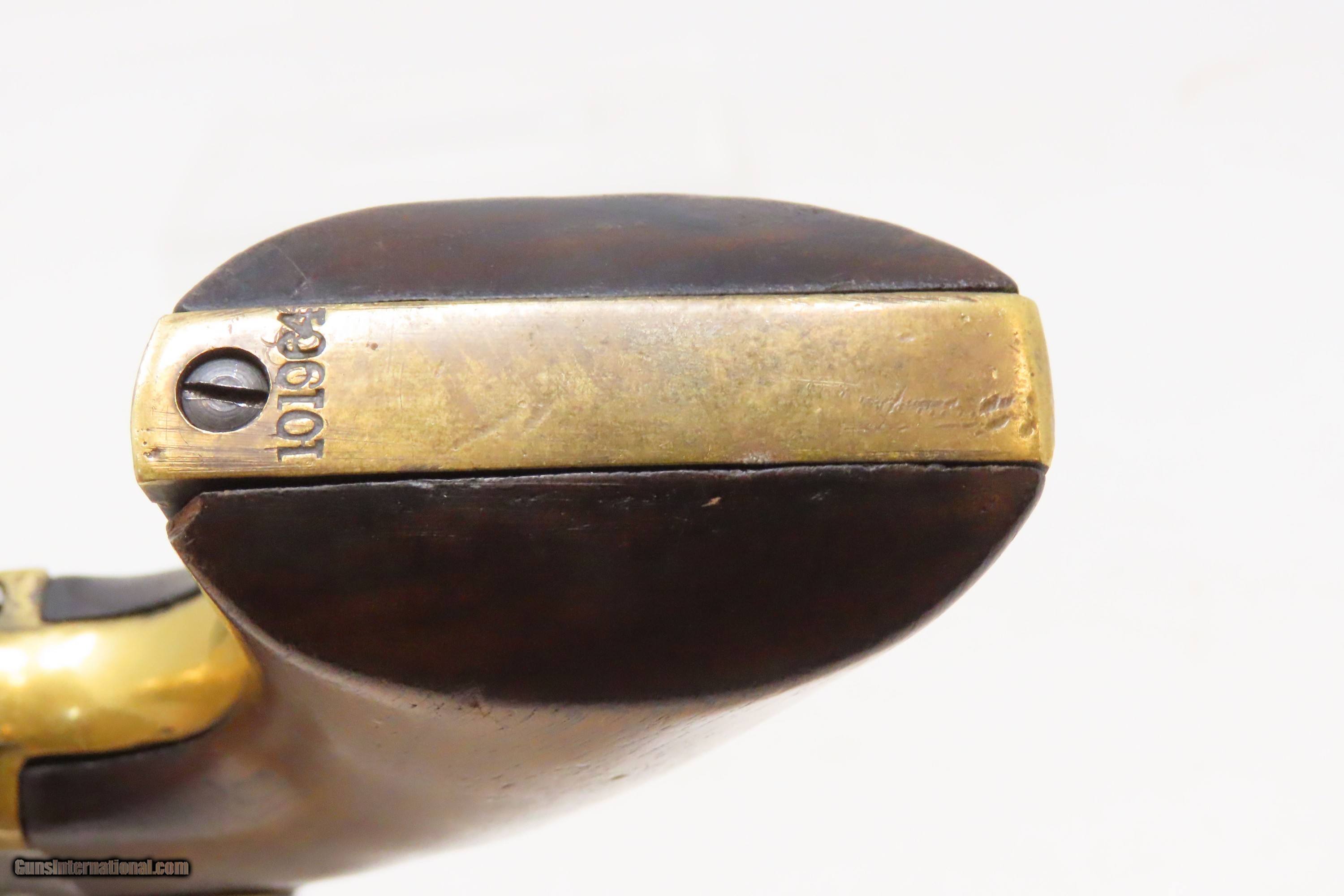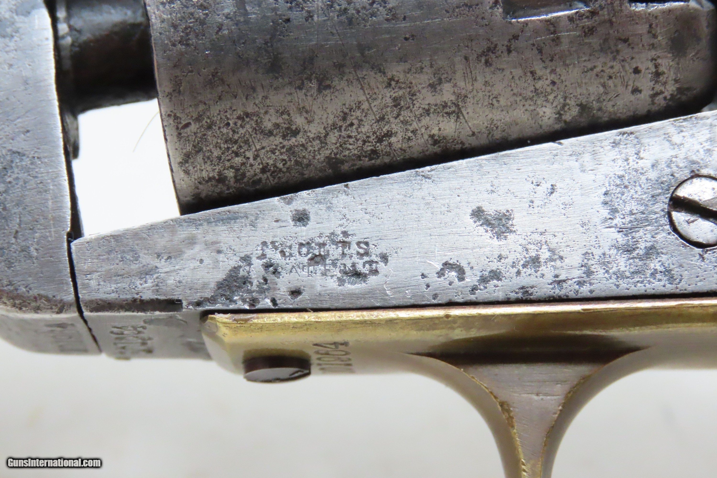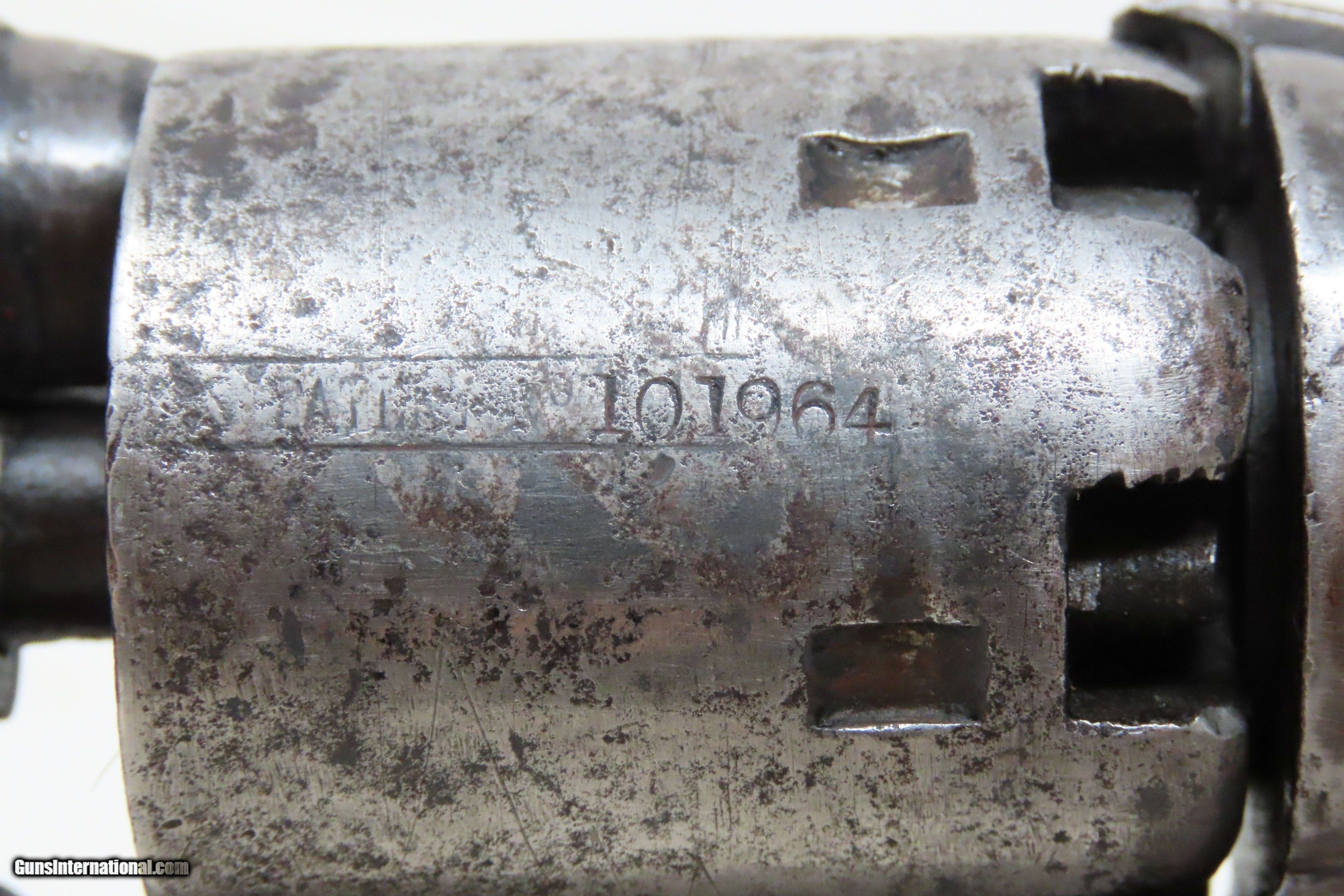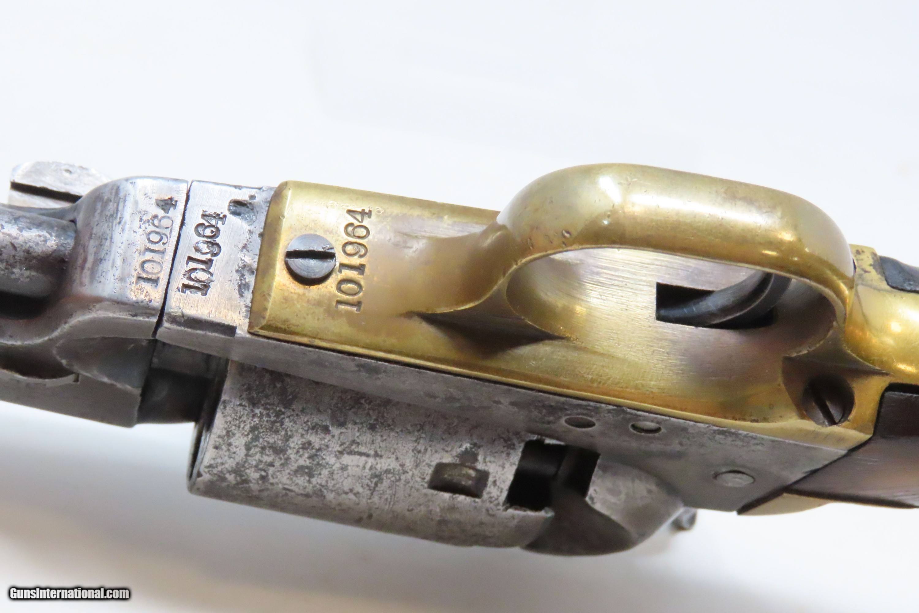 Description: CIVIL WAR / WILD WEST Antique COLT M1851 NAVY .36 Perc. Revolver GUNFIGHTER Manufactured in 1861 and used into the WILD WEST Here we present an antique Colt Model 1851 Navy Percussion Revolver, made at the start of the American Civil War in 1861 in Hartford, Connecticut. The 1851 Navy was one of Colt’s most famous and successful lines, reaching a production total of 257,348 from 1850 to 1873 (right up to the time of SAA production) from both Hartford and London factories. From Hartford alone, 185,000 were made by the end of the American Civil War. Many of these saw service during the conflict on both sides. There were some military purchases and lots of private purchases by soldiers going off to war. Though its name implies maritime use, most Navy revolvers primarily saw use on dry land, including in the Old West, which truly, the Colt 1851 Navy revolver ushered in the era of the gunfighter. Among the many guns that were used on the western frontier, none was more popular in its day than the Colt percussion revolver designated the 1851 Navy. This single action revolver weighed in at roughly 42 ounces. The Colt Navy was the first popular single-action revolver that could be worn comfortably on the belt. Prior to the beginning of the Civil War, the state of Missouri was a hotbed of trouble that often broke out in shooting fights. Bill Anderson, Jesse and Frank James, and the Youngers all cut their teeth on this border trouble and were ready to go when leaders like William Quantrill enlisted them in his guerilla band during the war. The boys from Missouri became quite proficient with their six-guns and generally carried a brace of Dragoons on their saddle pommels and a brace of Navy revolvers on their hip. The overall condition is good. The action functions, but the hammer has resistance when cocked. Good bore for its age. Solid grip, average wear. Markings are legible. Numbers match. Light remnants of the cylinder scene remain. Own the original! This is a legitimate antique and not a reproduction. Barrel is 7-1/2 inches. Caliber: .36 Percussion Overall condition as seen in photos. Very Fast. Very Safe. FREE SHIPPING WORLDWIDE. Delivered directly to your door by express mail! Guaranteed AUTHENTIC & Includes CERTIFICATE OF AUTHENTICITY. ancestryguns $2000 #233145 SOLD Antique: Yes |