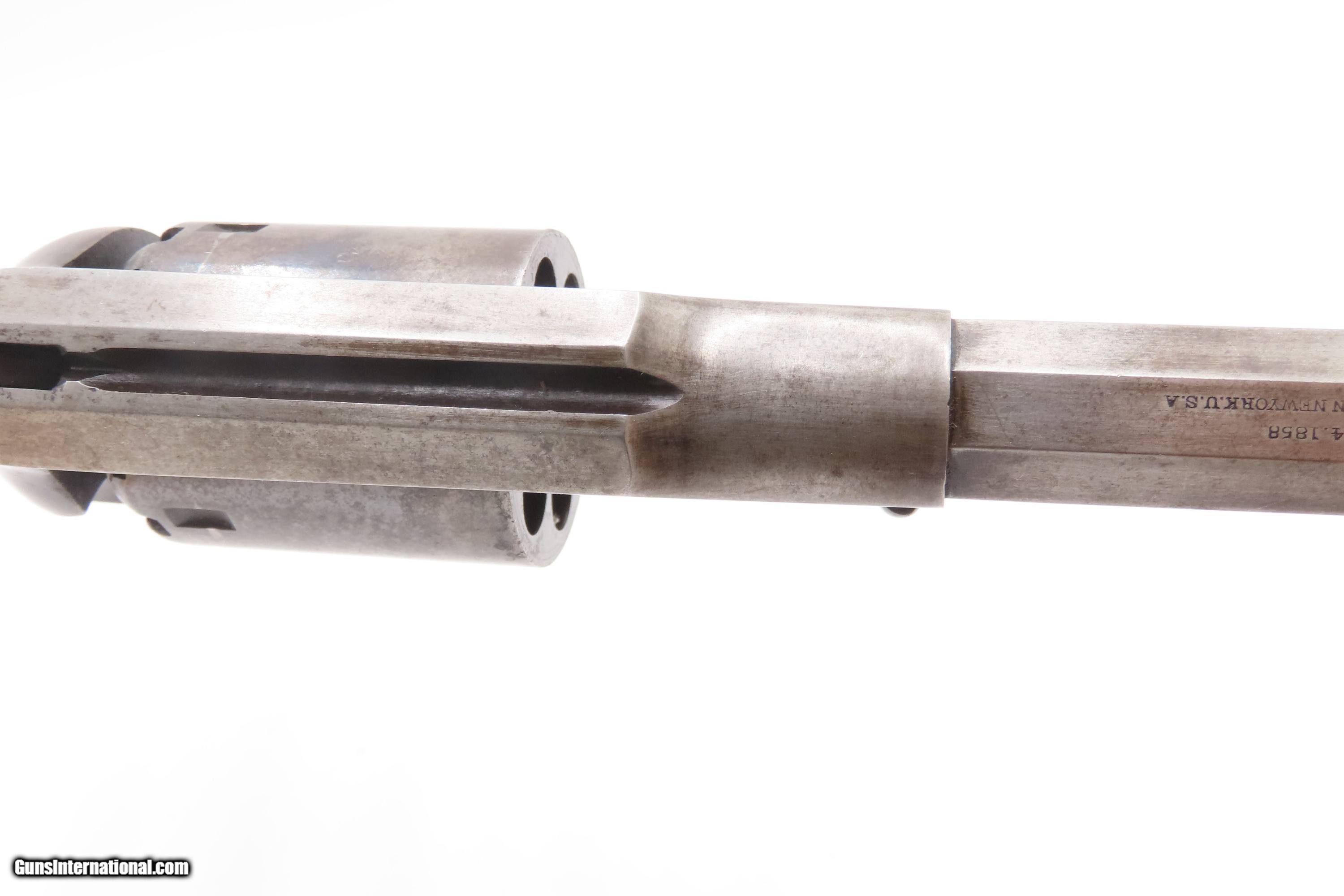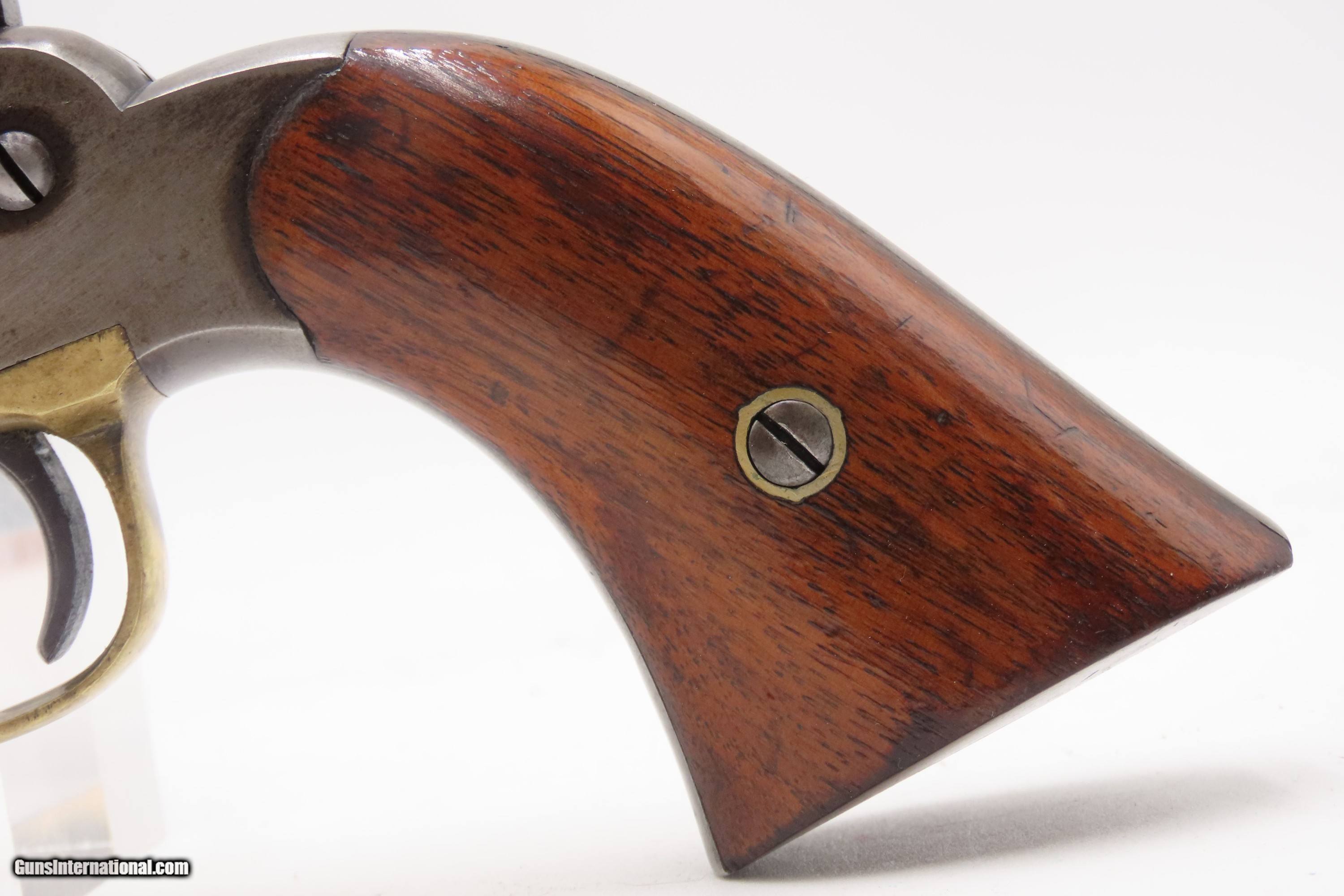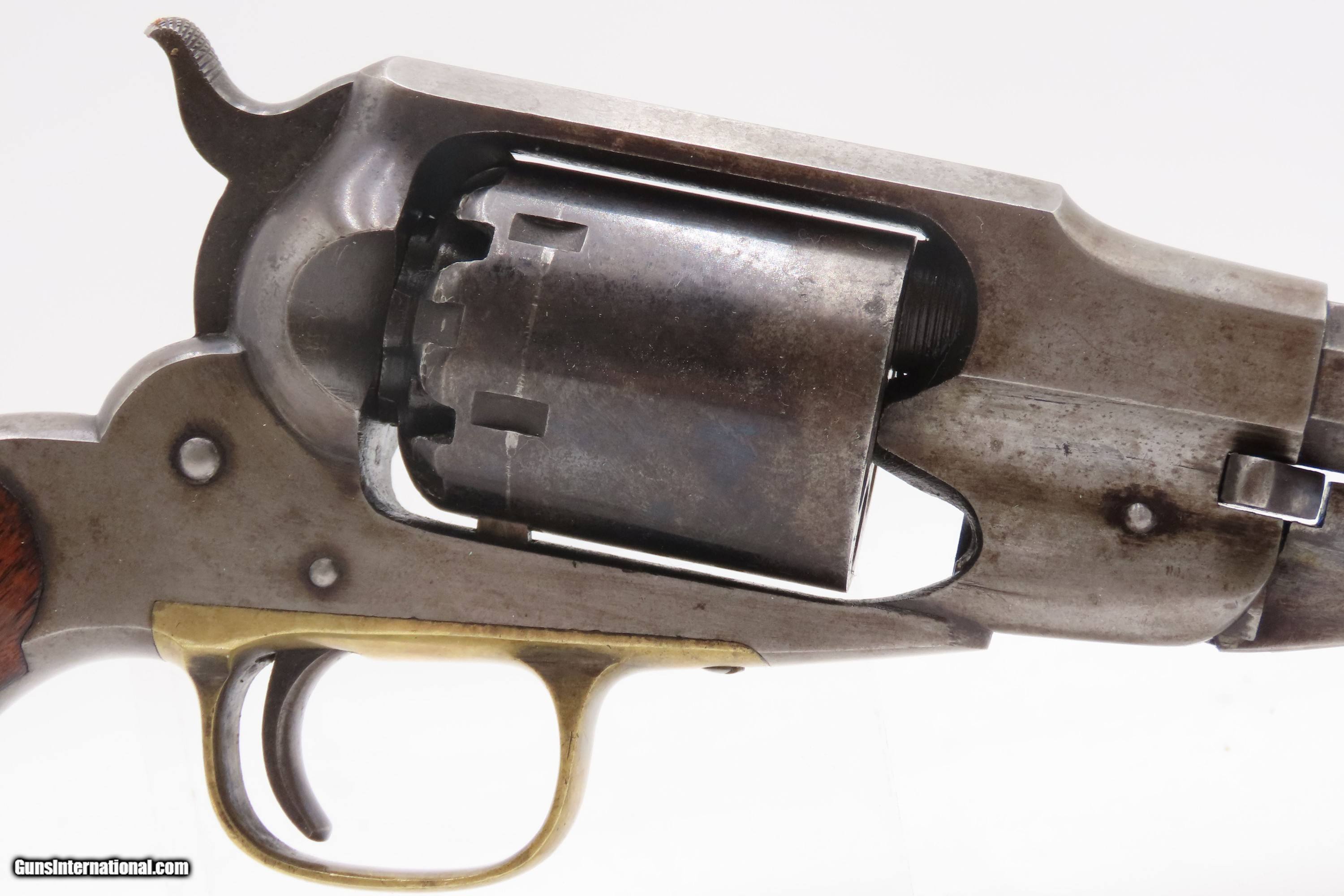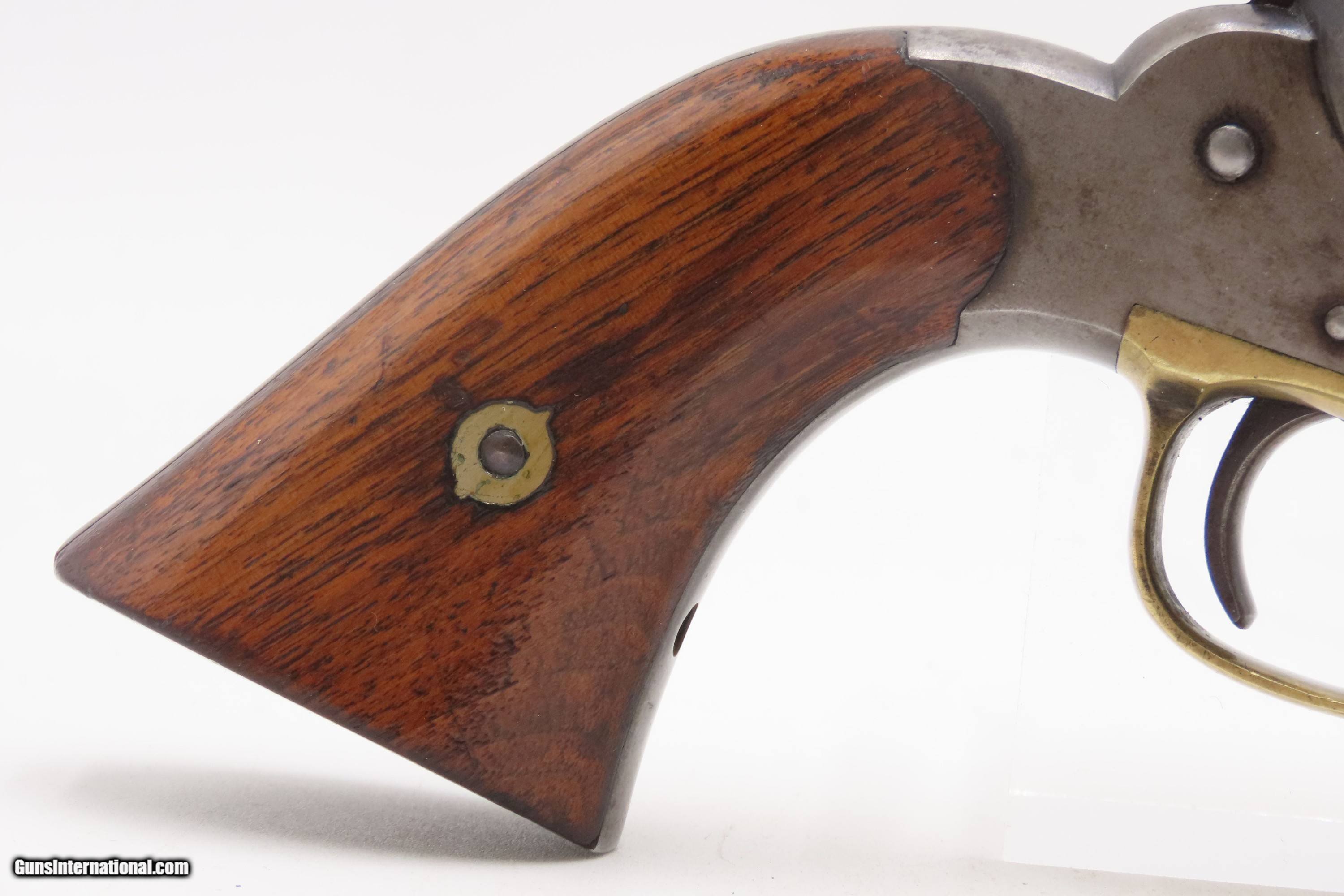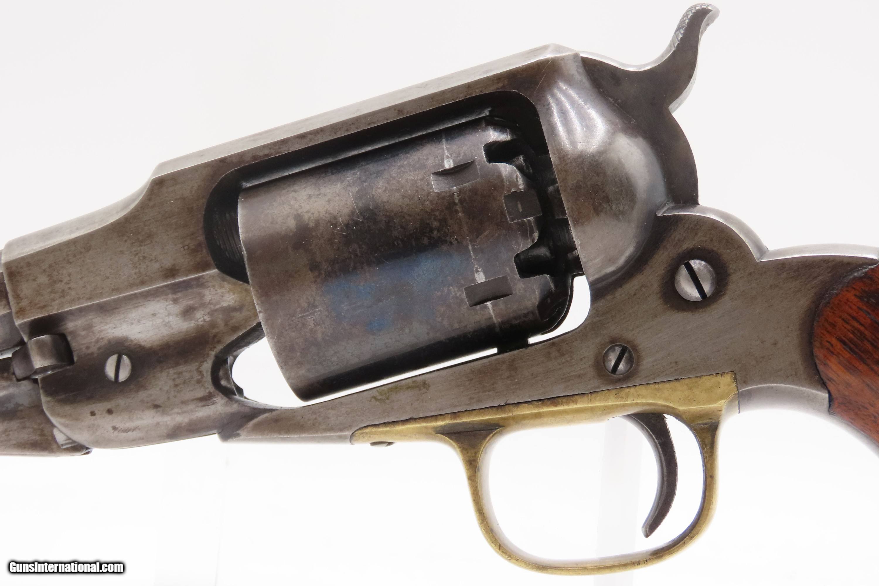 Description: CIVIL WAR/WILD WEST Antique REMINGTON “New Model” NAVY Percussion Revolver VERY EARLY; One of the first “NEW MODELS” Produced Here Ancestry Guns presents an antique Extremely Early Production Remington New Model Navy Single Action Percussion Revolver manufactured in the middle of the Civil war in 1863 in Ilion, New York. According to Flayderman, the serial numbers were a continuation from the “Old Model Navy”, who’s serial numbering ended somewhere around 23,000. The “New Model” Navy serial numbers began around 23,001. This example being serial numbered “23053 is quite early and quite rare, with the “New Model” being left off of the roll stamping on the barrel. Remington manufactured approximately 28,000 of the .36 caliber New Model Navy revolvers between 1863 and 1875. About 4,300 of these revolvers were purchased by the U.S. Navy. This revolver lacks the anchor stamp found on some U.S. Navy Remington revolvers. There were three progressive models made by Remington. They were the Remington-Beals Army & Navy (1860–1862), the 1861 Army & Navy (1862–1863), and the New Model Army & Navy (1863–1875). The three models are nearly identical in size and appearance. Subtle but noticeable differences in hammers, loading levers, and cylinders help identify each model. The 1861 Remington actually transitioned into New Model appearance by late 1862, slowly transforming throughout 1862, due to continual improvement suggestions from the U. S. Ordnance Department. This solid frame revolver came with a high polish blue finish on the barrel, frame and cylinder. The hammer has a casehardened finish and the trigger is niter blue. The trigger guard is brass. The two-piece walnut grips are oil finished. The top of the octagon barrel is roll-stamped “PATENTED SEPT. 14, 1858/E. REMINGTON & SONS, ILLION, NEW YORK, U.S.A.” in two lines. Many of these were converted to a .38 caliber metallic cartridge before ever leaving the factory, as the Rollin-White patent was expiring. The overall condition is very good. Original finish is present on the cylinder with a gray patina on the frame and barrel. Excellent action. The bore is bright and shiny with crisp rifling. Both grips are seated firmly and remain fine. Markings are clear and legible. Visible numbers match. Own the original! This is a legitimate antique and not a reproduction. Barrel is 7-3/8 inches. Caliber: .36 Percussion Overall condition as seen in photos. Very Fast. Very Safe. FREE SHIPPING WORLDWIDE. Delivered directly to your door by express mail! Guaranteed AUTHENTIC & Includes CERTIFICATE OF AUTHENTICITY. $2900 #259363 Antique: Yes Price: $2,900.00 Buy Now Pay with