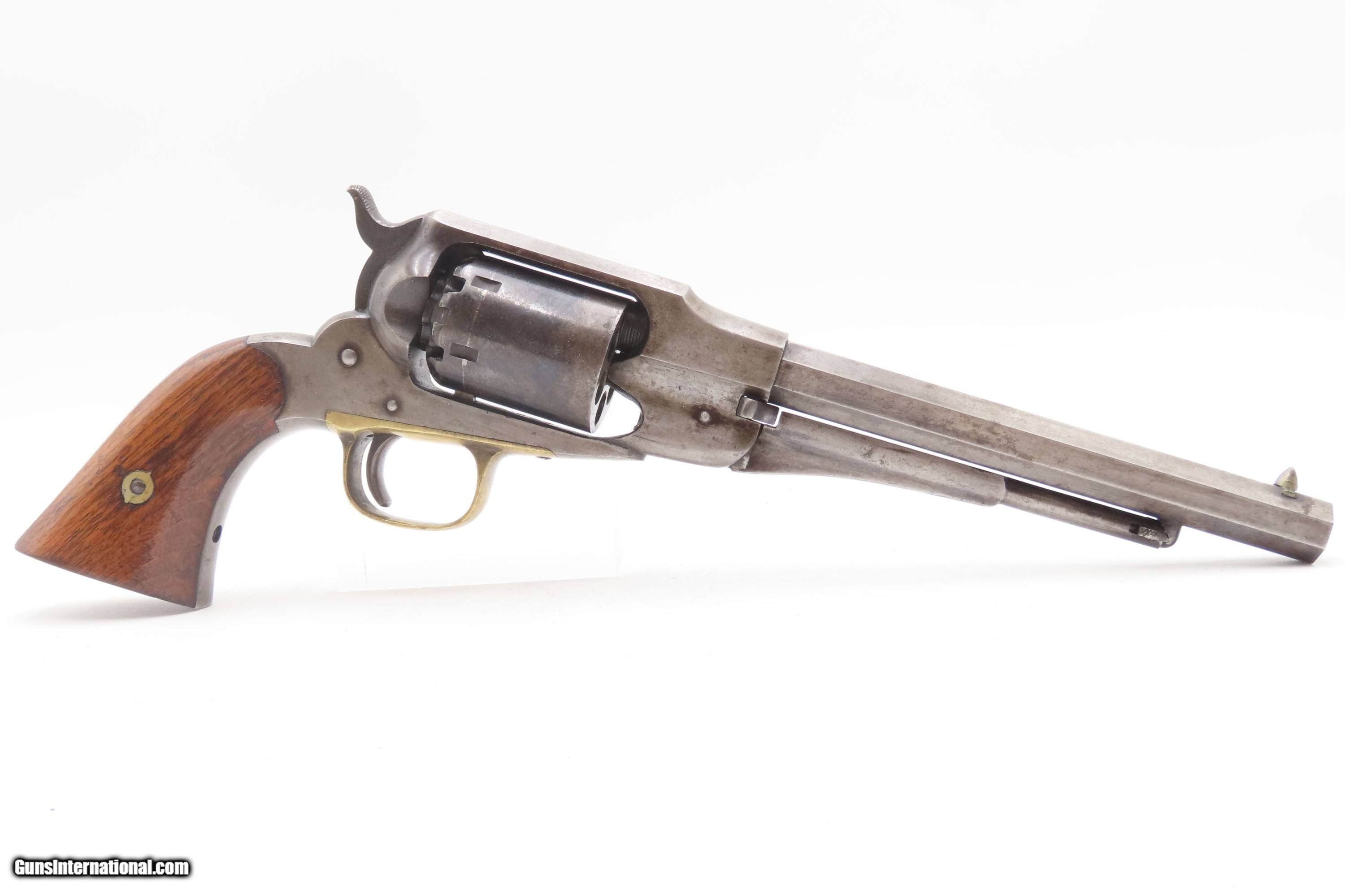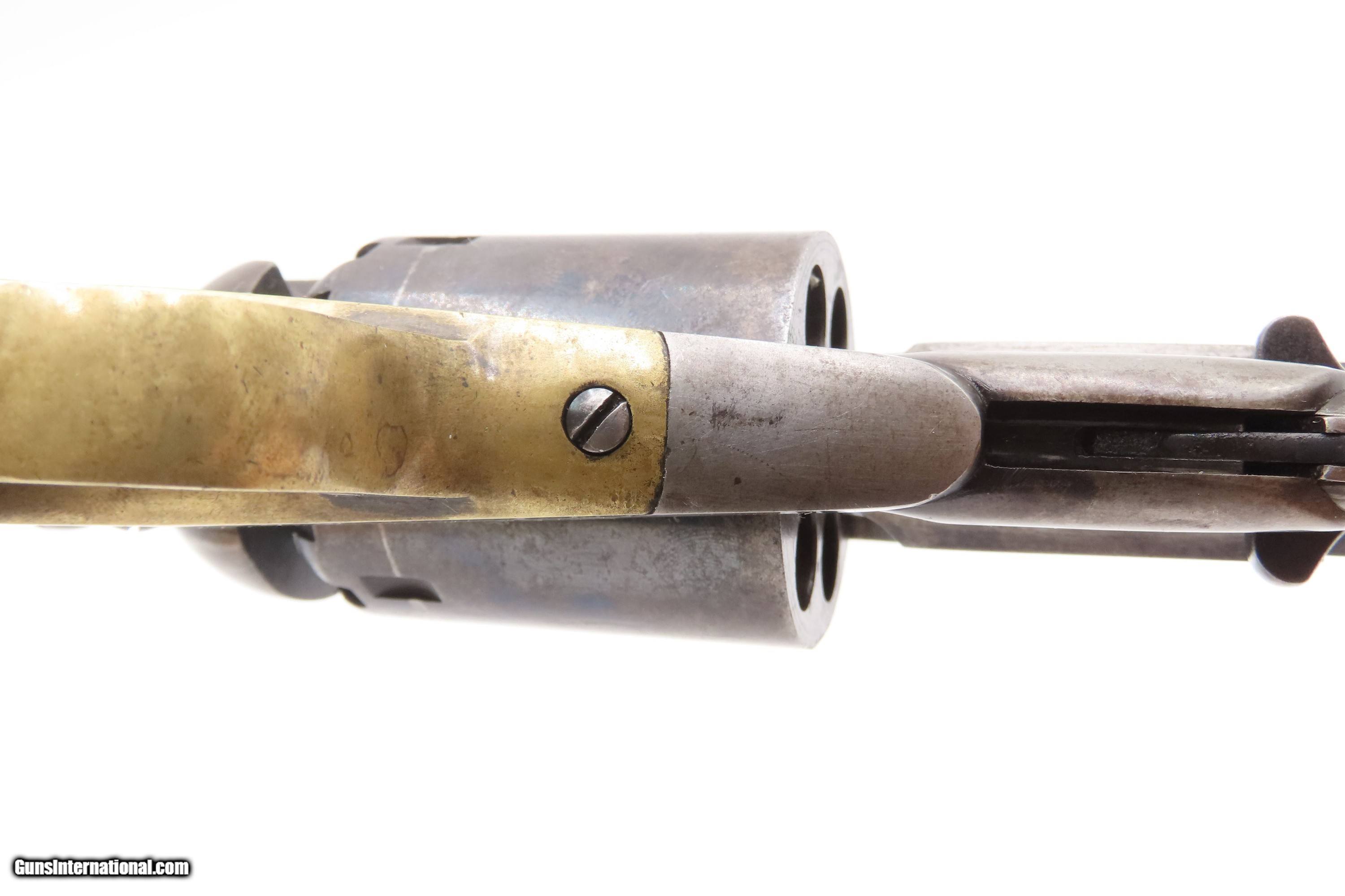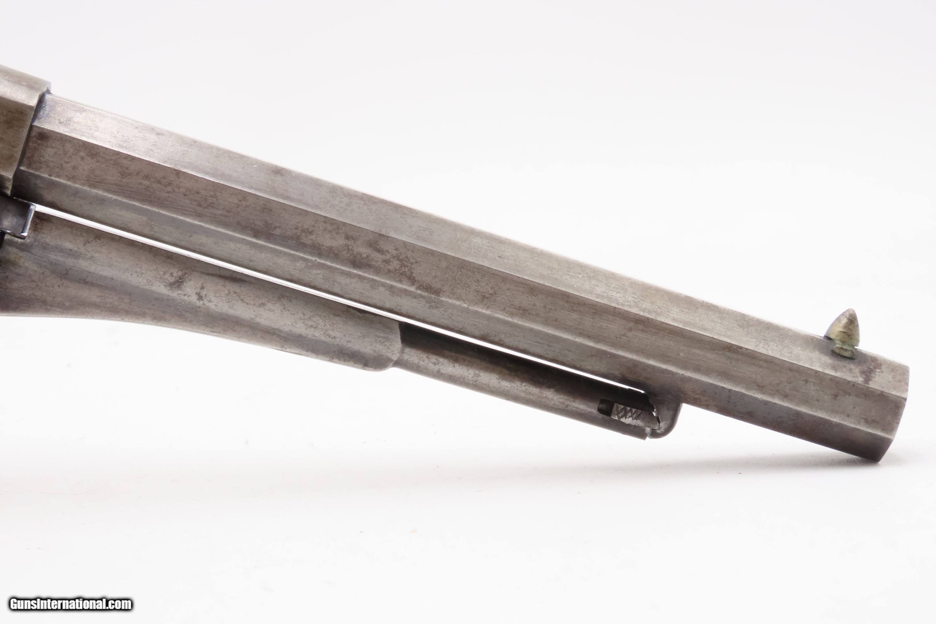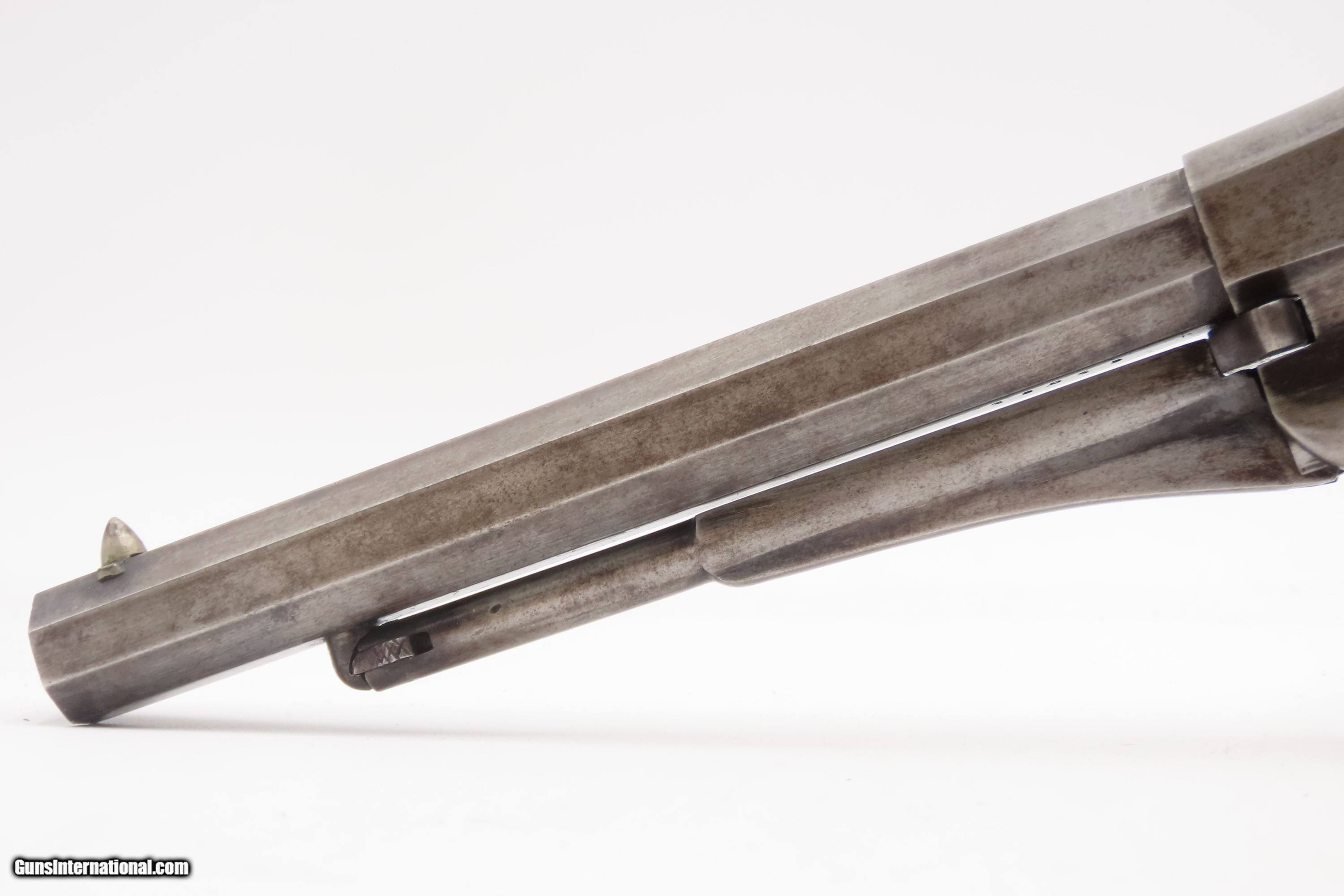 Description: CIVIL WAR/WILD WEST Antique REMINGTON “New Model” NAVY Percussion Revolver VERY EARLY; One of the first “NEW MODELS” Produced Here Ancestry Guns presents an antique Extremely Early Production Remington New Model Navy Single Action Percussion Revolver manufactured in the middle of the Civil war in 1863 in Ilion, New York. According to Flayderman, the serial numbers were a continuation from the “Old Model Navy”, who’s serial numbering ended somewhere around 23,000. The “New Model” Navy serial numbers began around 23,001. This example being serial numbered “23053 is quite early and quite rare, with the “New Model” being left off of the roll stamping on the barrel. Remington manufactured approximately 28,000 of the .36 caliber New Model Navy revolvers between 1863 and 1875. About 4,300 of these revolvers were purchased by the U.S. Navy. This revolver lacks the anchor stamp found on some U.S. Navy Remington revolvers. There were three progressive models made by Remington. They were the Remington-Beals Army & Navy (1860–1862), the 1861 Army & Navy (1862–1863), and the New Model Army & Navy (1863–1875). The three models are nearly identical in size and appearance. Subtle but noticeable differences in hammers, loading levers, and cylinders help identify each model. The 1861 Remington actually transitioned into New Model appearance by late 1862, slowly transforming throughout 1862, due to continual improvement suggestions from the U. S. Ordnance Department. This solid frame revolver came with a high polish blue finish on the barrel, frame and cylinder. The hammer has a casehardened finish and the trigger is niter blue. The trigger guard is brass. The two-piece walnut grips are oil finished. The top of the octagon barrel is roll-stamped “PATENTED SEPT. 14, 1858/E. REMINGTON & SONS, ILLION, NEW YORK, U.S.A.” in two lines. Many of these were converted to a .38 caliber metallic cartridge before ever leaving the factory, as the Rollin-White patent was expiring. The overall condition is very good. Original finish is present on the cylinder with a gray patina on the frame and barrel. Excellent action. The bore is bright and shiny with crisp rifling. Both grips are seated firmly and remain fine. Markings are clear and legible. Visible numbers match. Own the original! This is a legitimate antique and not a reproduction. Barrel is 7-3/8 inches. Caliber: .36 Percussion Overall condition as seen in photos. Very Fast. Very Safe. FREE SHIPPING WORLDWIDE. Delivered directly to your door by express mail! Guaranteed AUTHENTIC & Includes CERTIFICATE OF AUTHENTICITY. $2900 #259363 Antique: Yes Price: $2,900.00 Buy Now Pay with