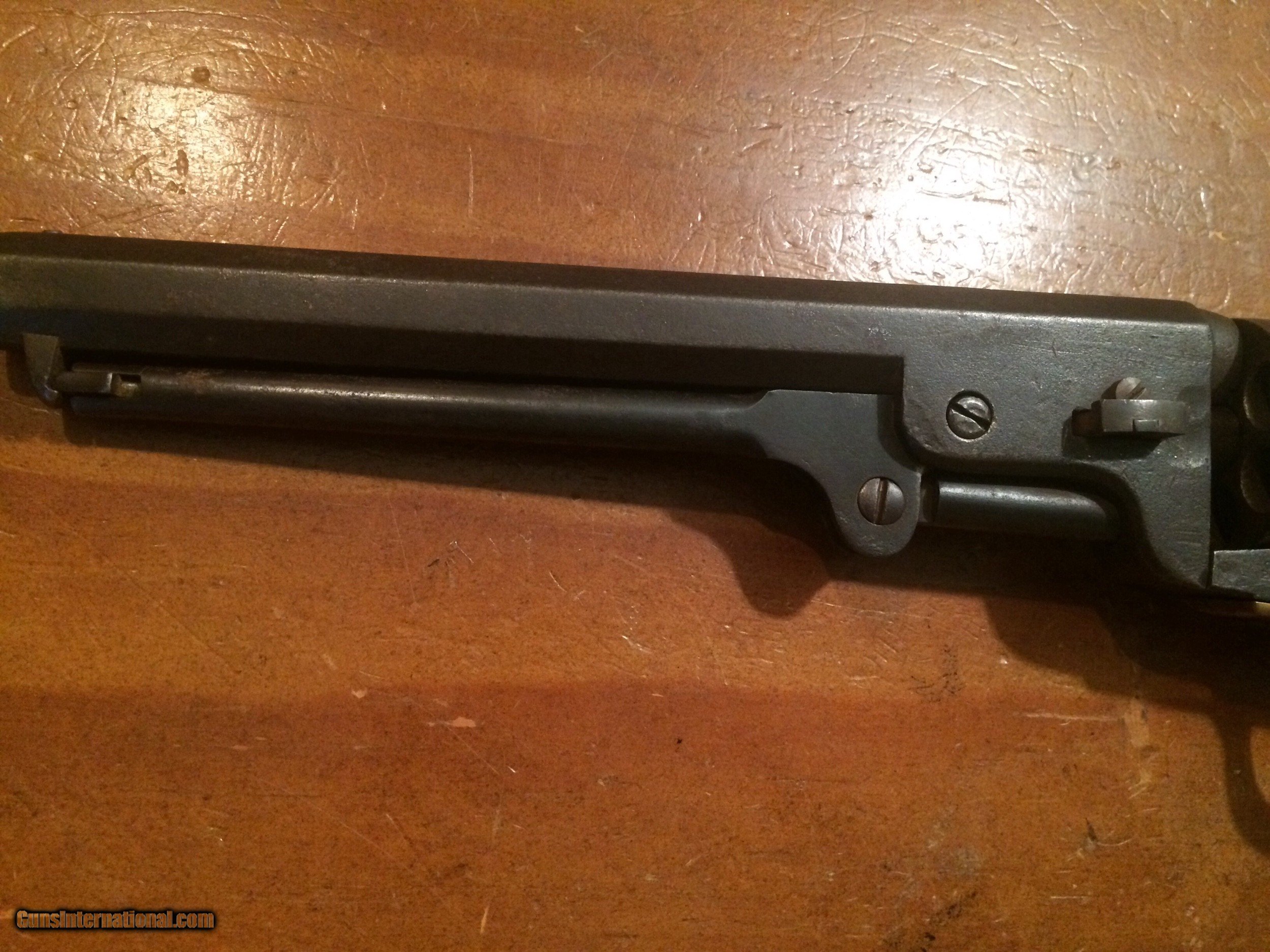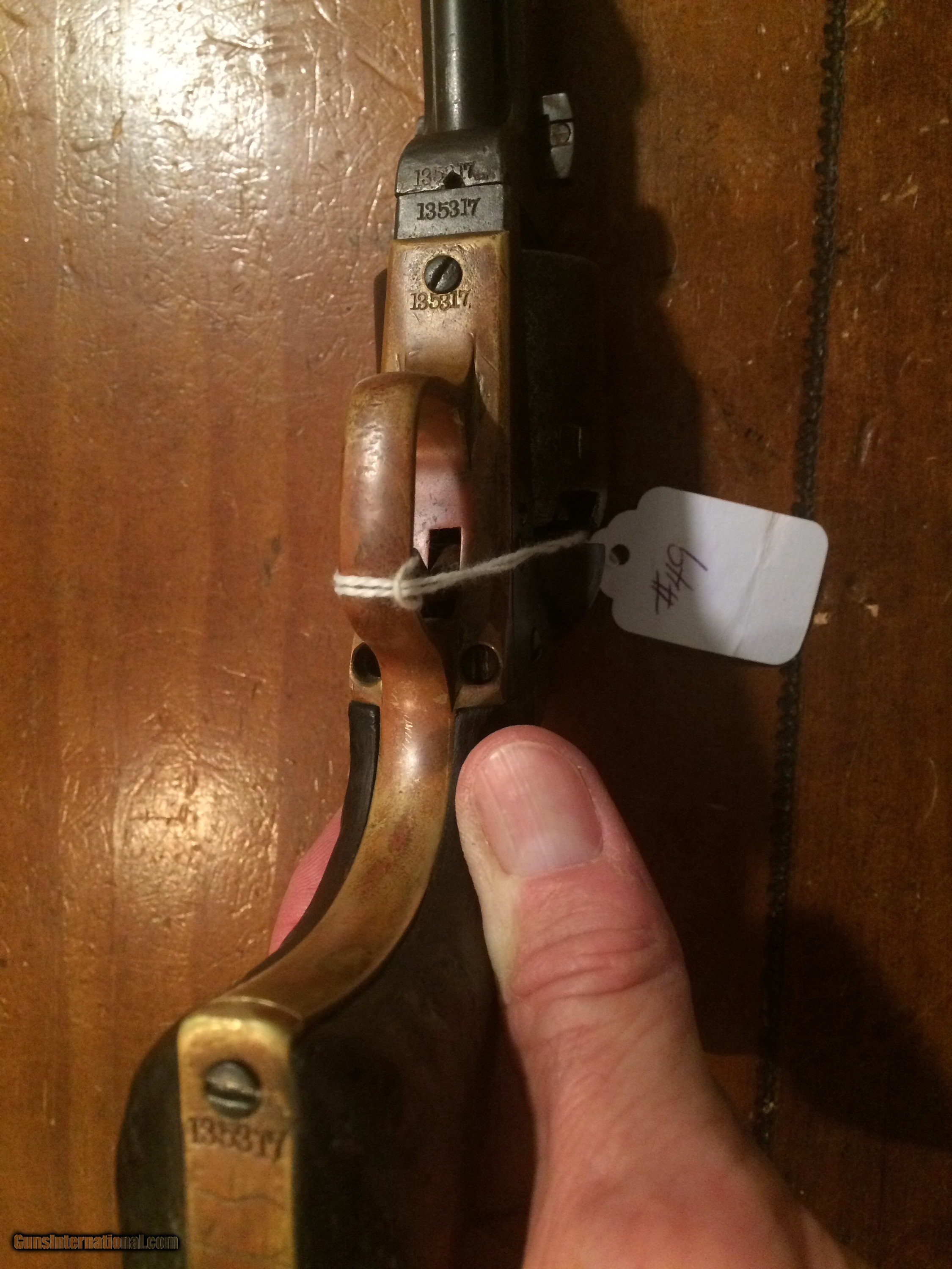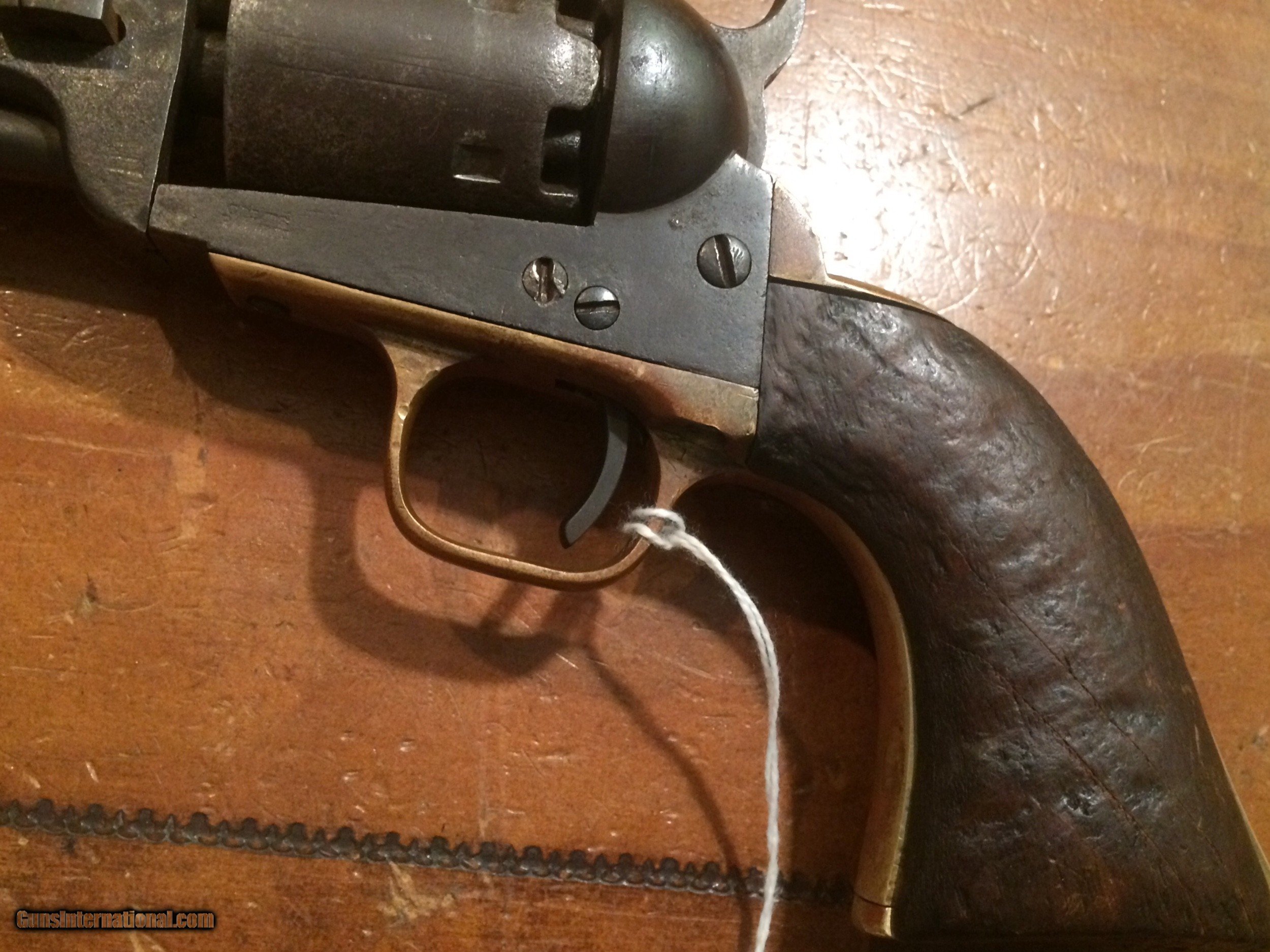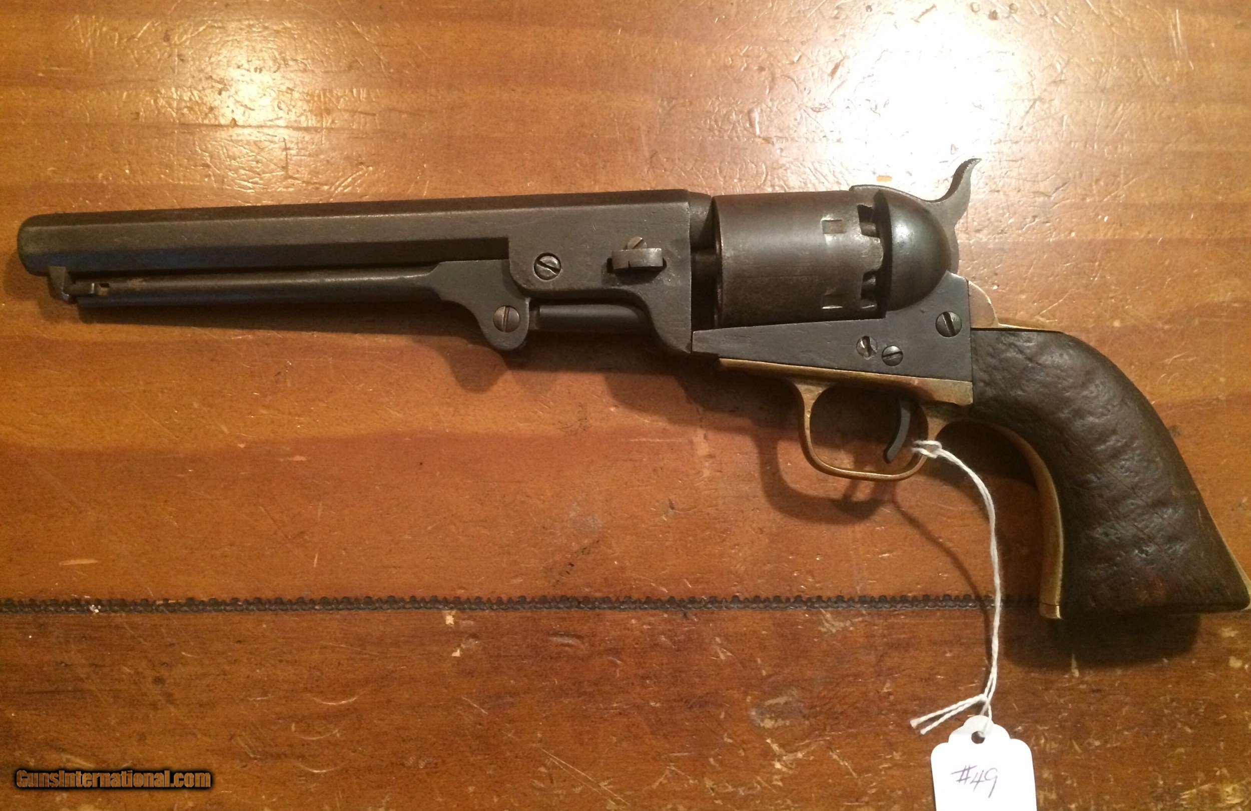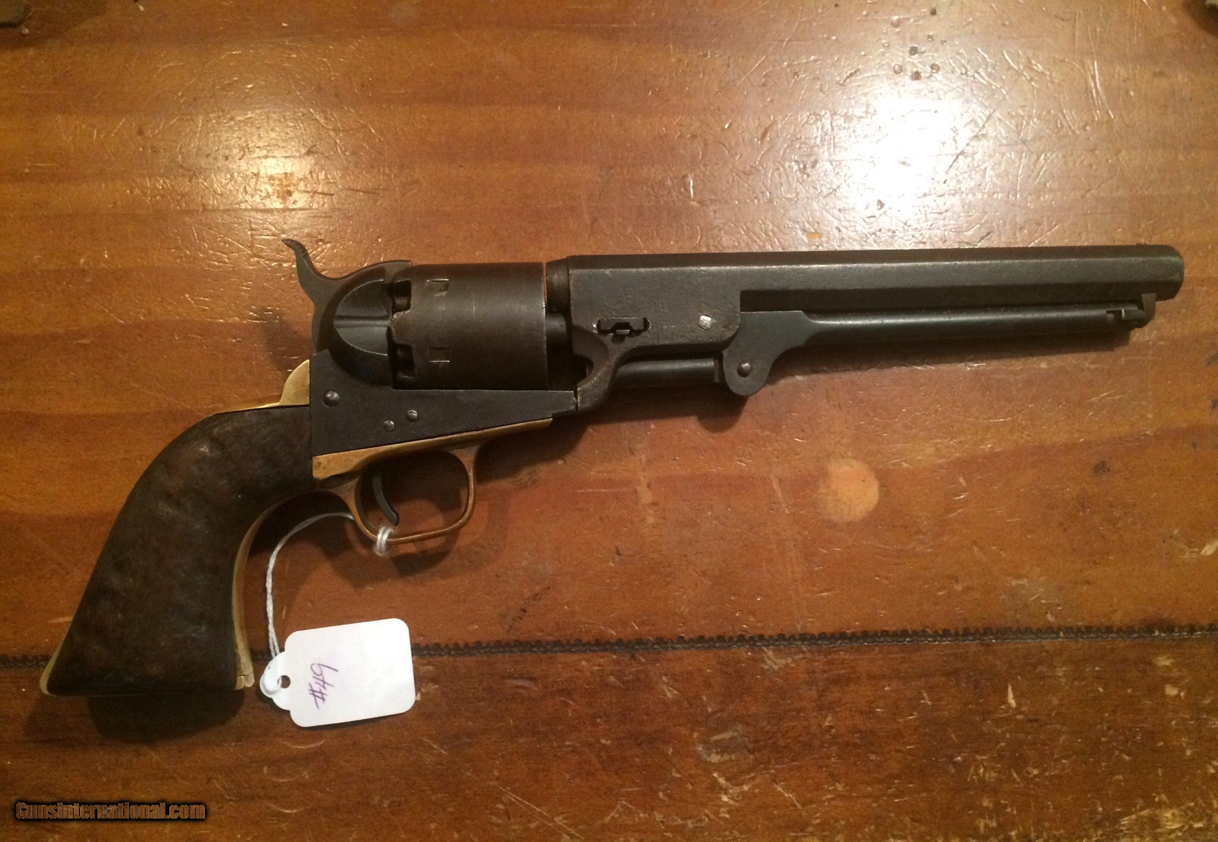 Description: Colt 1851 Navy in .36 caliber. Honest well used Civil War gun. Still in fine condition for its age. Cylinder rotates properly at half cock but the bolt will slip at times at full cock. Matching serial numbers throughout. A very good example of a fine old percussion gun. Antique ships direct for $35.00. See photos for condition and email or call to discuss. 214-957-7574. SOLD Antique: Yes Manufacturer: Colt Model: 1851 Navy |