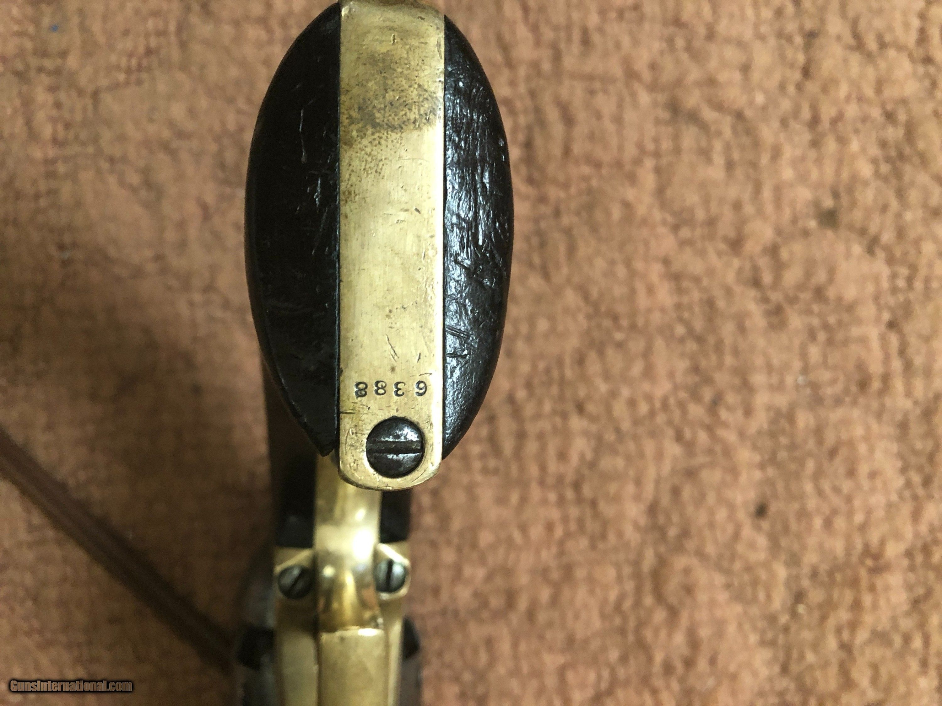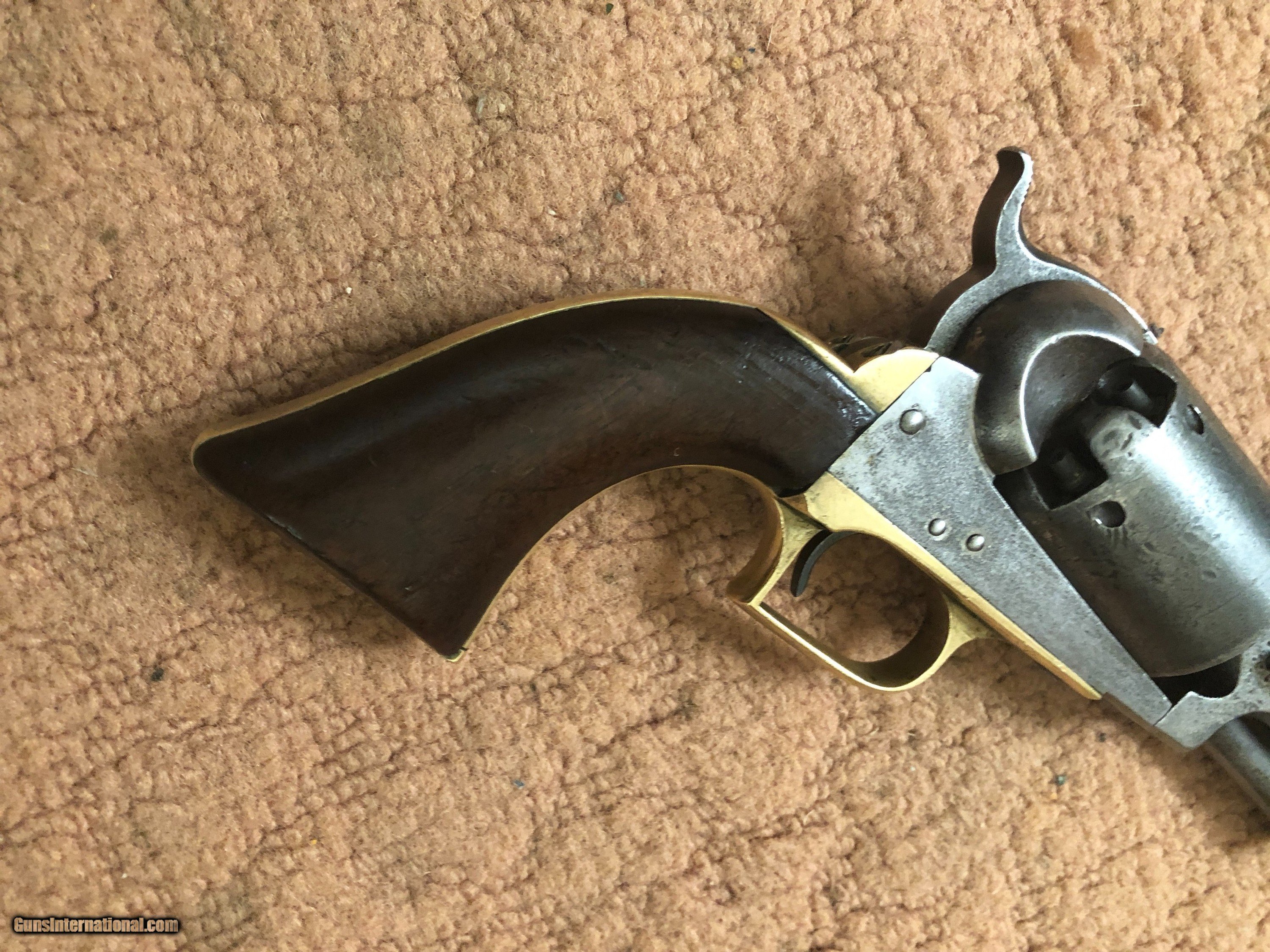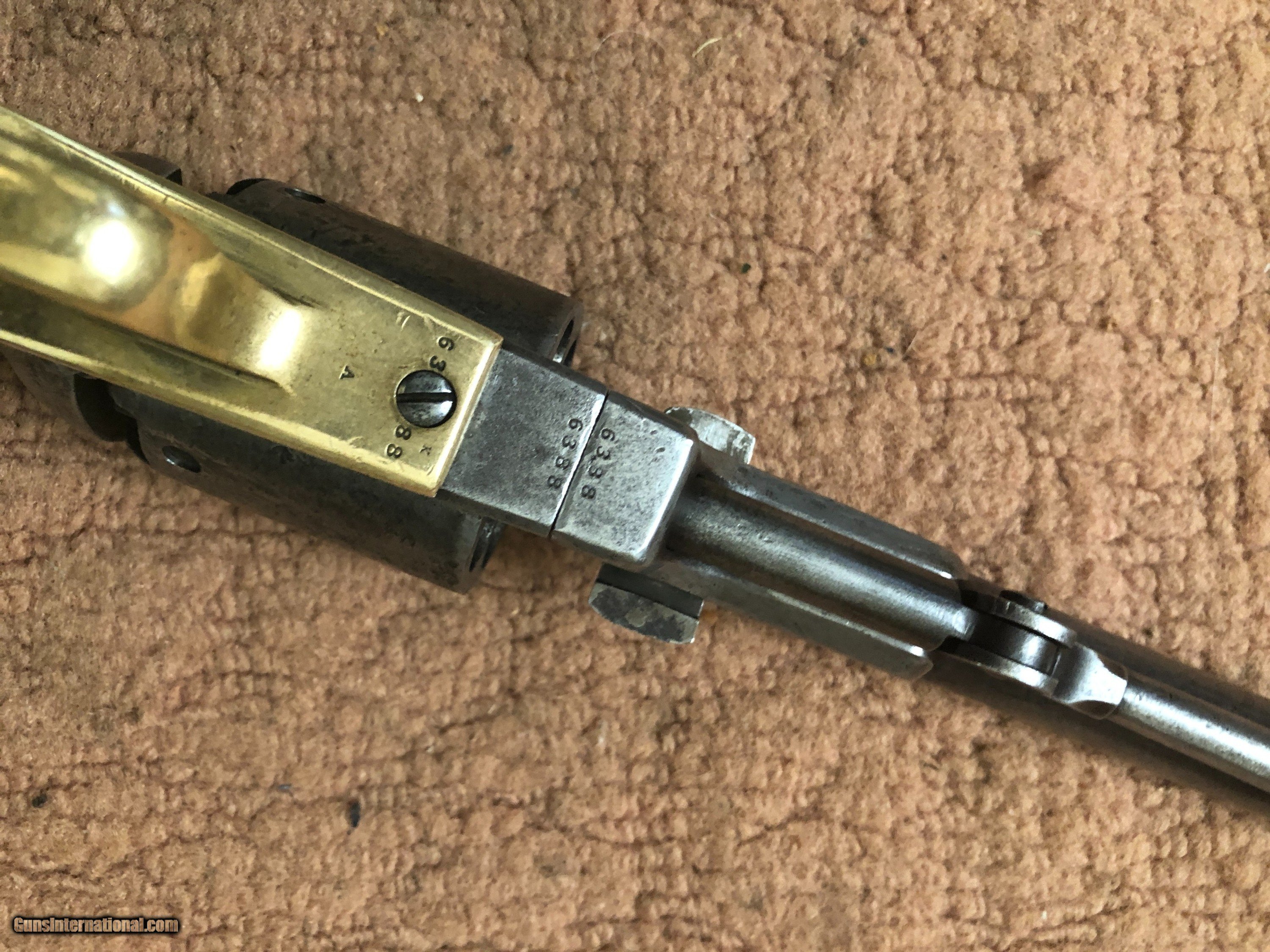 Description: Colt 1st Model Dragoon serial #6388 and martially marked. Good working condition with fine grips and all markings clear. The cylinder scene with perhaps 10-15% visible. The nipples were replaced many years ago by an idiot who left vise marks at each cylinder stop. One cylinder pen left. The loading lever has three batch numbers going across and a N inspection mark on the side. This is correct with a N stamped on frame, cylinder and side of hammer. A and K stamped on triggerguard and N on backstrap. Notice the serial number stamped on each side of triggerguard front screw. Nice gun and serial number in range of those issued to the Texas rangers. SOLD Antique: Yes |