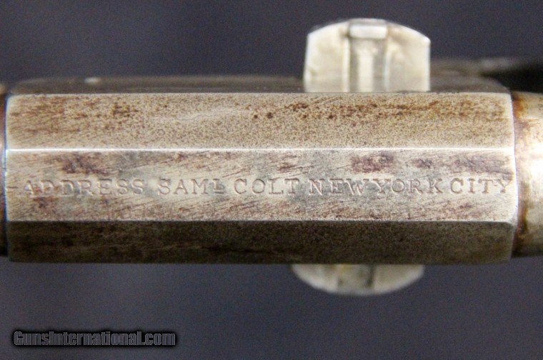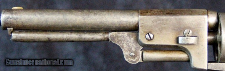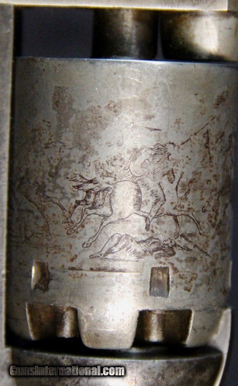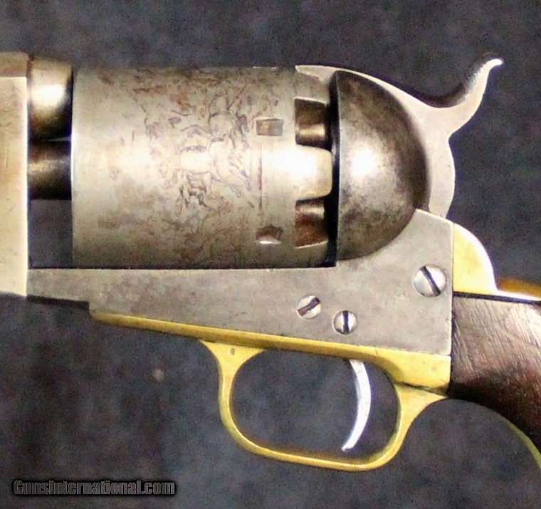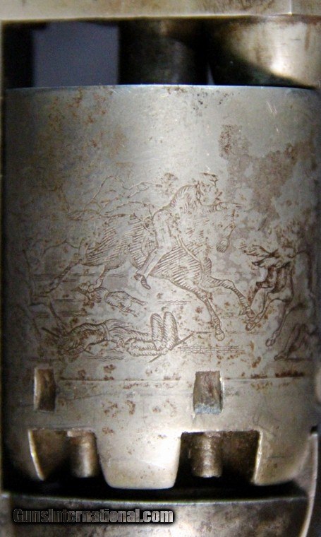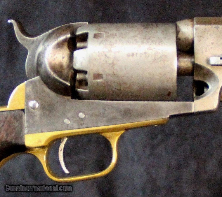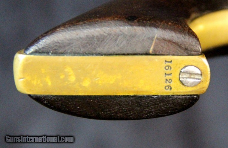 Description: .44, #16126, 7 1/2 inch barrel, blue and case color finish, one piece waknut grips, all matching including loading lever and barrel wedge,1856. Condition: strong rifling with some black powder oxidation, barrel is smooth silver gray with touches of original blue, frame has shadows of case colors, excellent cylinder scene, slight shrinking of grips, also has a crack at the right toe of the grip and a piece replaced, excellent mechanically, excellent marks. SOLD Antique: Yes |