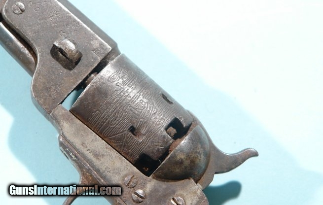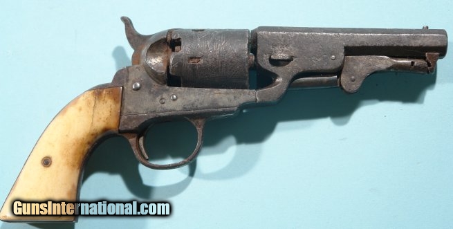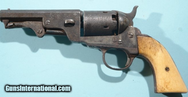 Description: COLT BREVETE MODEL 1849 POCKET PERCUSSION REVOLVER, CIRCA 1880-90. 4" octagonal barrel with "American Colt Extra" stamped on top of barrel with Belgian proofs. Additional Belgian and Liege proof on sides of barrel assembly. Cylinder having "Brooklyn Bridge" scene and belgian proofs. All original nipples still present and I excellent condition. Frame with 'Patent Sysytem" stamped on left side. Original bone grips a nice fit. Silver plated triggerguard with just traces remaining and '.35 CAL" stamped on left side. Uncleaned overall with excellent patina. A few areas of oxidation but reluctant to clean further as loss of very old character might result. Mainspring is strong but sear does not catch. Cylinder does not rotate so would make a good project for anyone who likes to tinker without fear of screwing up an exspensive piece. SOLD Antique: Yes |