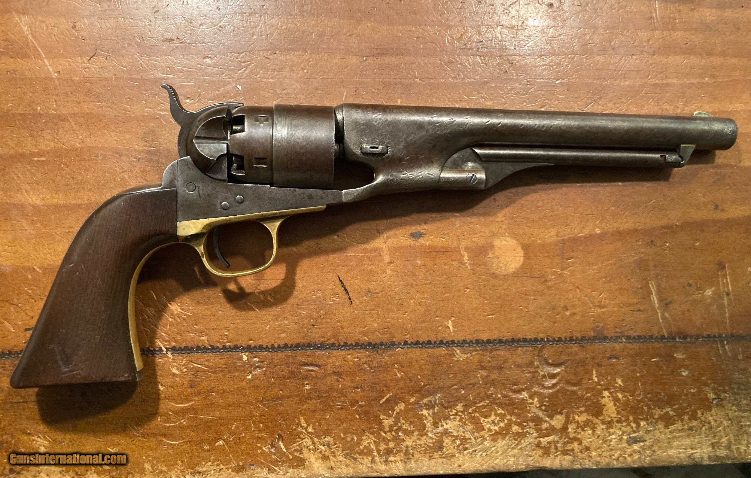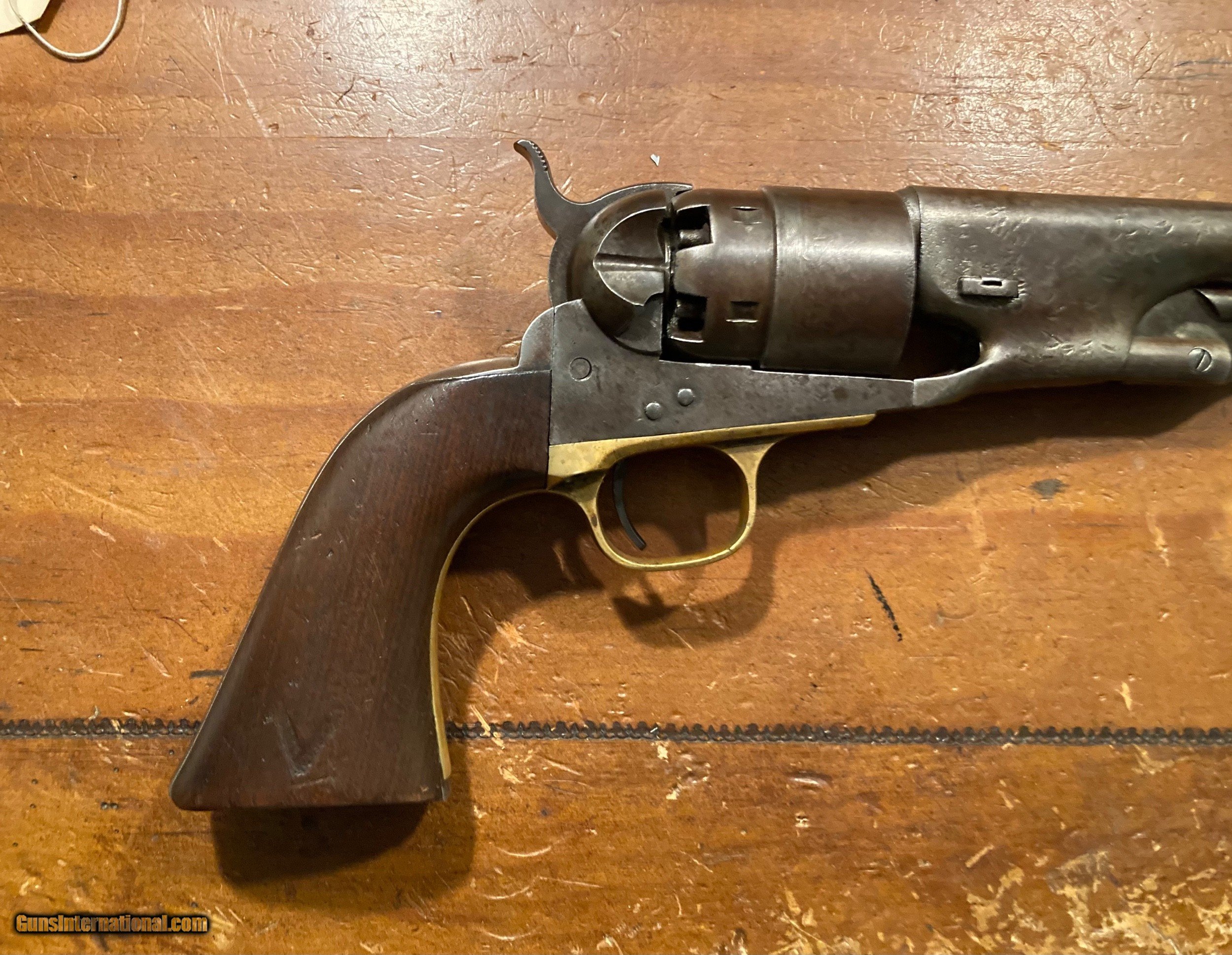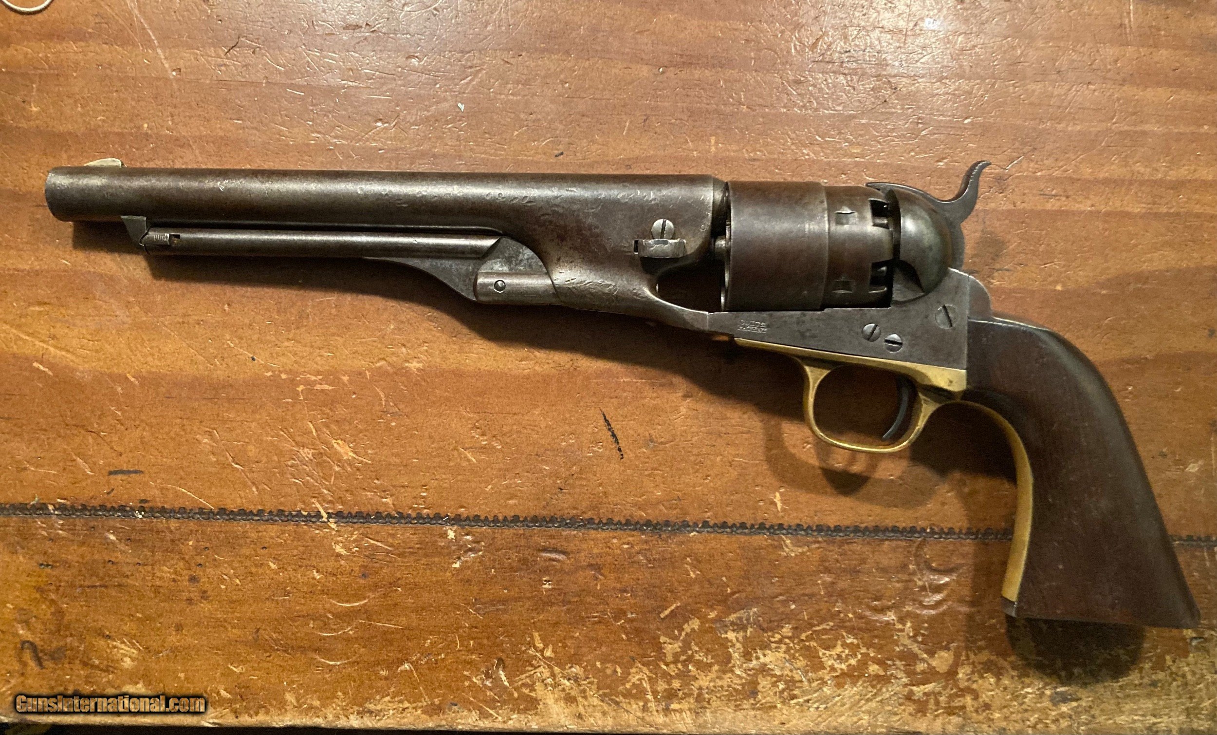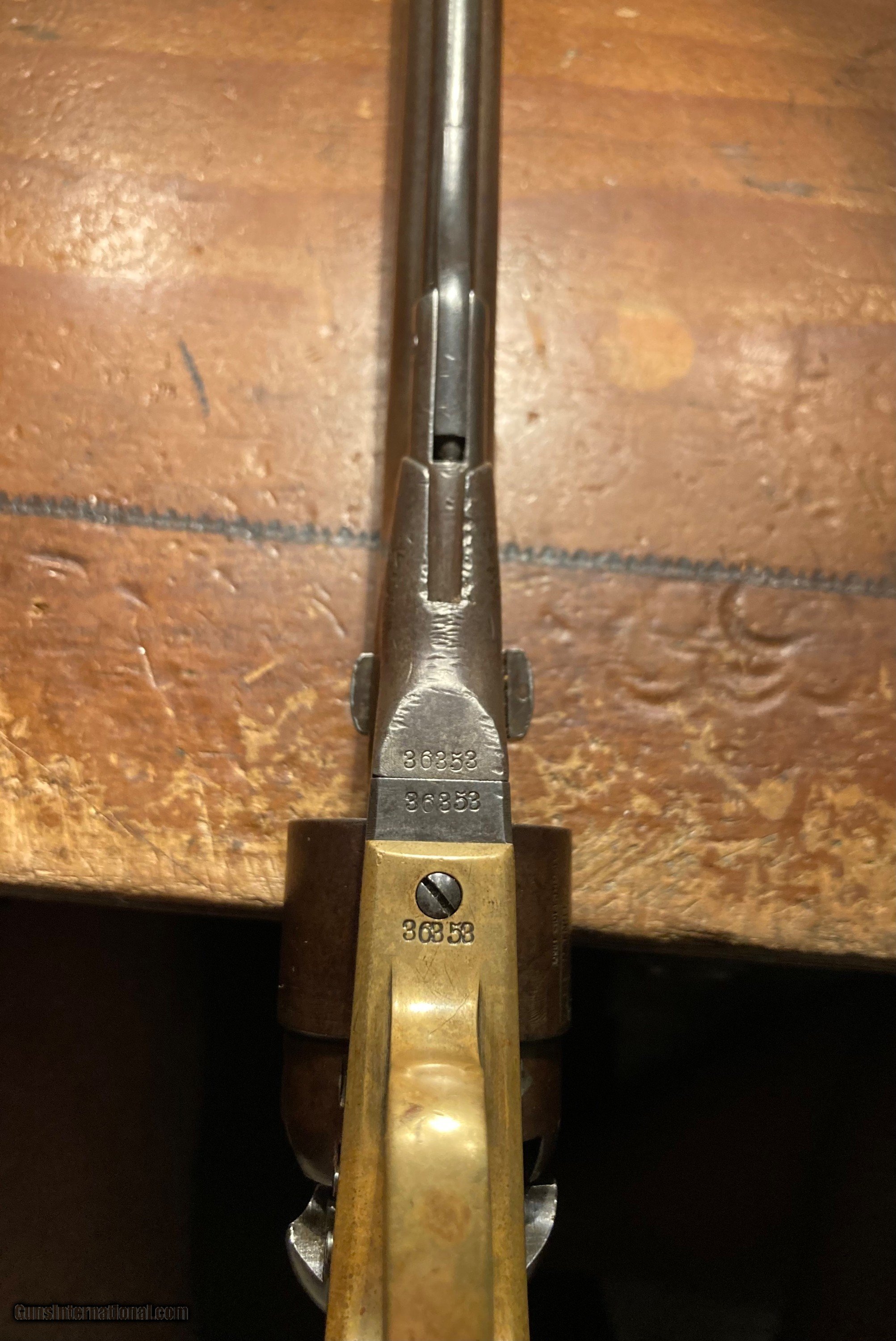 Description: Colt model 1860 army. This gun was put into service in 1862. Very nice military inspected .44 with 8" barrel. This has a unique story but as often happens with the death of the collector much dies with them. This gun came from a Florida based collector who indicated the gun had Southern history and specifically Florida provenance. In 30 plus years I've been saving history I see this often. The paperwork associated with the collection is misplaced by family or they just are not knowledgeable enough to understand the value to the paperwork. This gun still has all the inspector markings very clear along with the cartouche on the grips. Cylinder scene is visible. The interesting thing with this gun is when the southern soldier picked this up to use he couldn't stand the Northern maker address and carefully filed off the barrel address with Union ties. It was done well and very long ago. Just makes for a great piece of history with this gun. I was familiar with this gun and it's story, Its just unfortunate that the family lost the paperwork. It's a great old Civil War era gun that saw use well after that conflict ended. Action is tight. Gun is a fine historical piece worthy of the best collections! See photos as description. Antique gun ships direct for $38. Email or call with questions or to discuss. Matt 214-957-6574 SOLD Antique: Yes Manufacturer: Colt Model: 1860 Army |