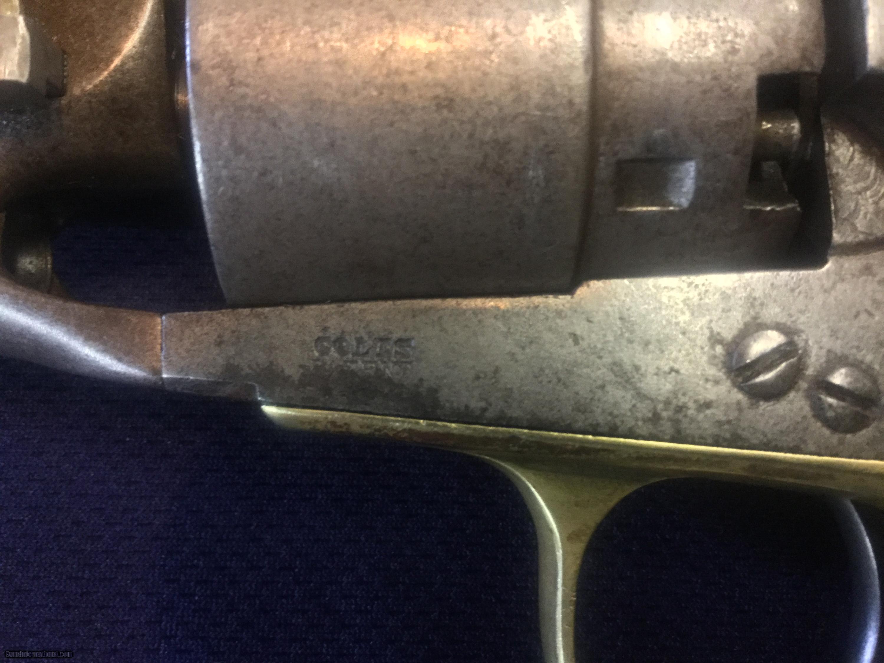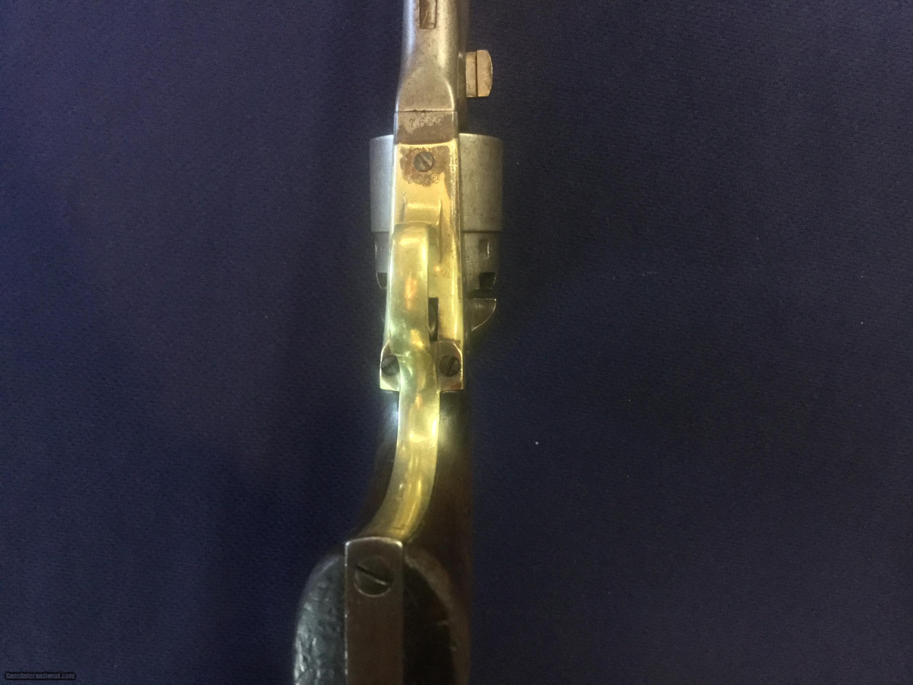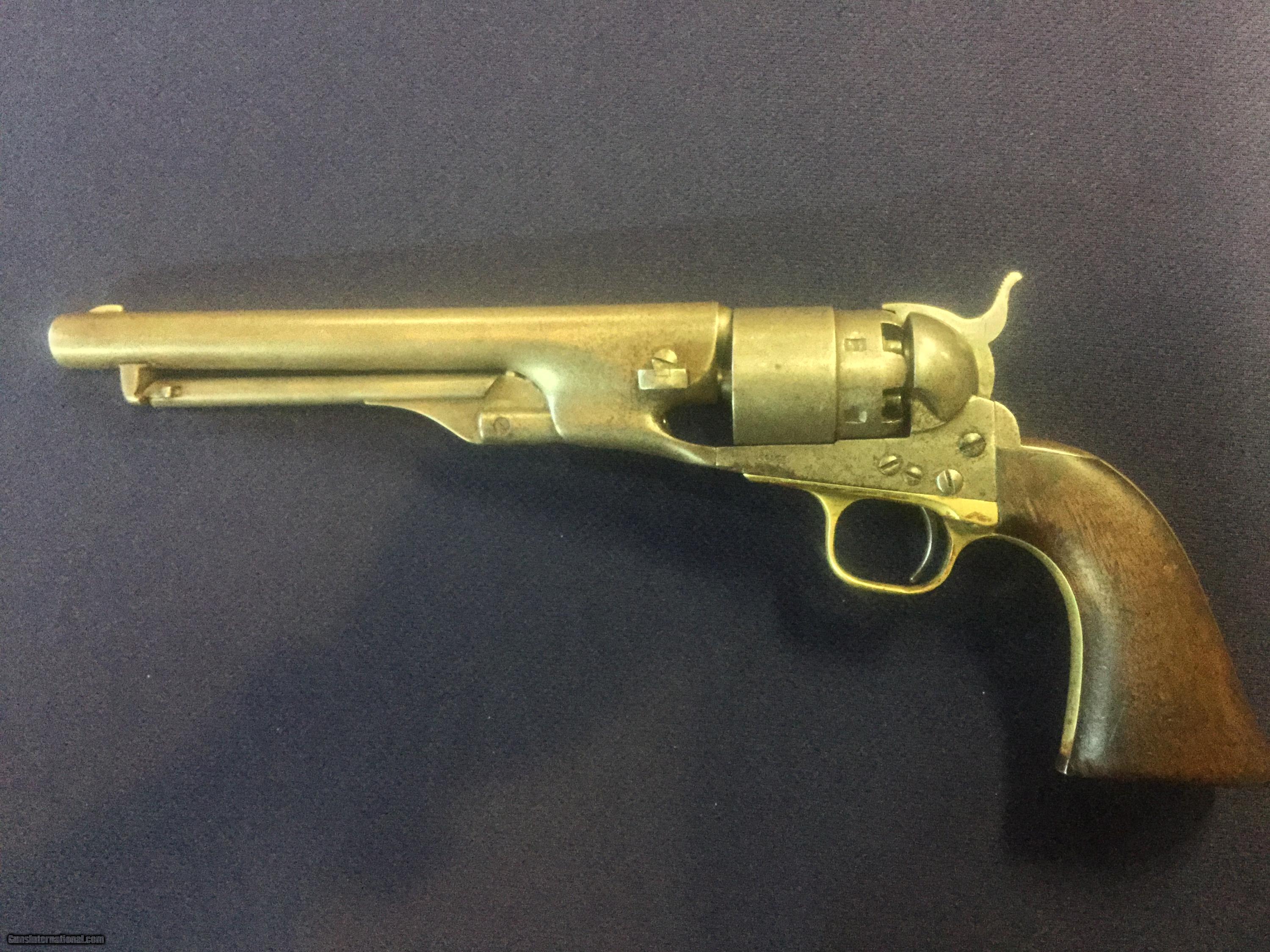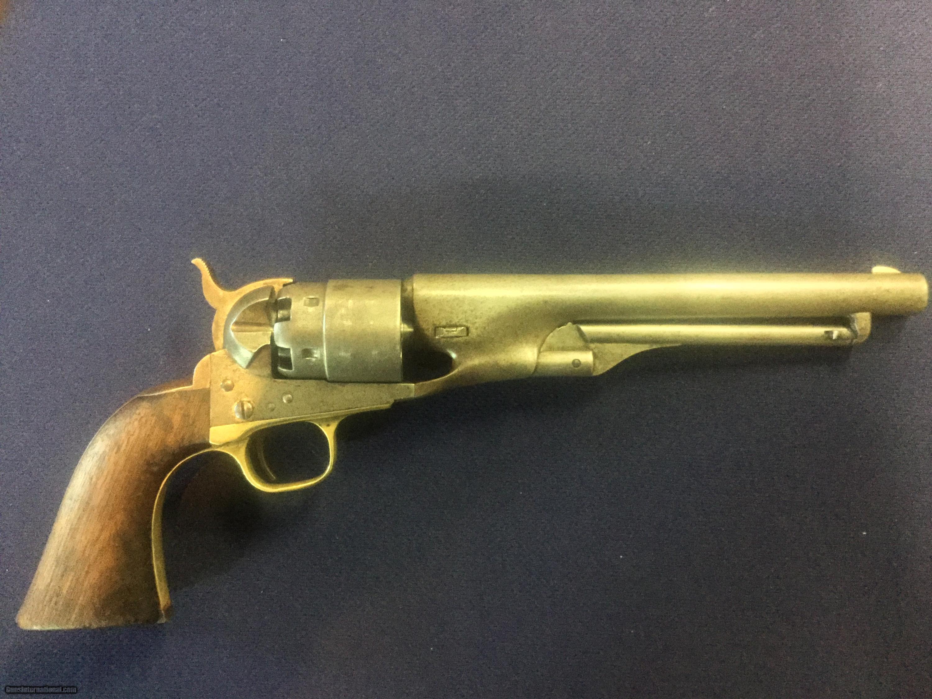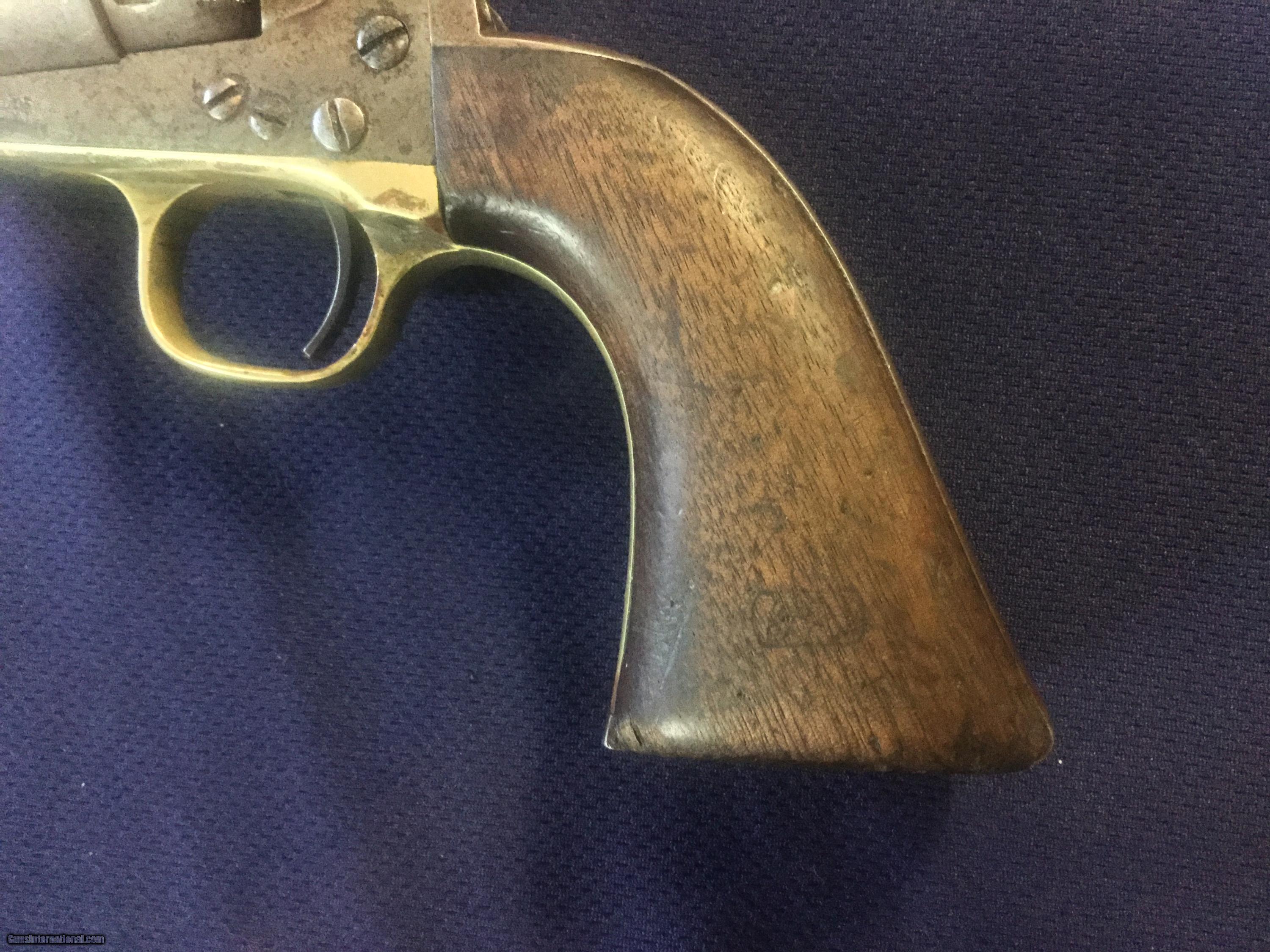 Description: Attention all Civil War collectors! Up for sale today is a Colt Model 1860 Four Screw serial no. 7662 (1861) chambered in caliber .44 black powder. This excellent original early-war revolver was recently released from an estate in Gettysburg, Pennsylvania. The revolver is all-matching with the exception of the backstrap of the grips, which bears a different number, and the wedge, which is not serialized. It has an excellent bore and still locks up tightly and is correctly timed. The grips are outstanding and bear a cartouche. An excellent example of an early-war Colt, and a great addition to any collection. All Pennsylvania residents please add 6% sales tax. SOLD Curio/Relic: Yes Antique: Yes Manufacturer: Colt Model: 1860 Four Screw Serial Number: 7662 Caliber Info: .44 Condition: Excellent Metal Condition: Excellent Wood Condition: Excellent Bore Condition: Excellent |