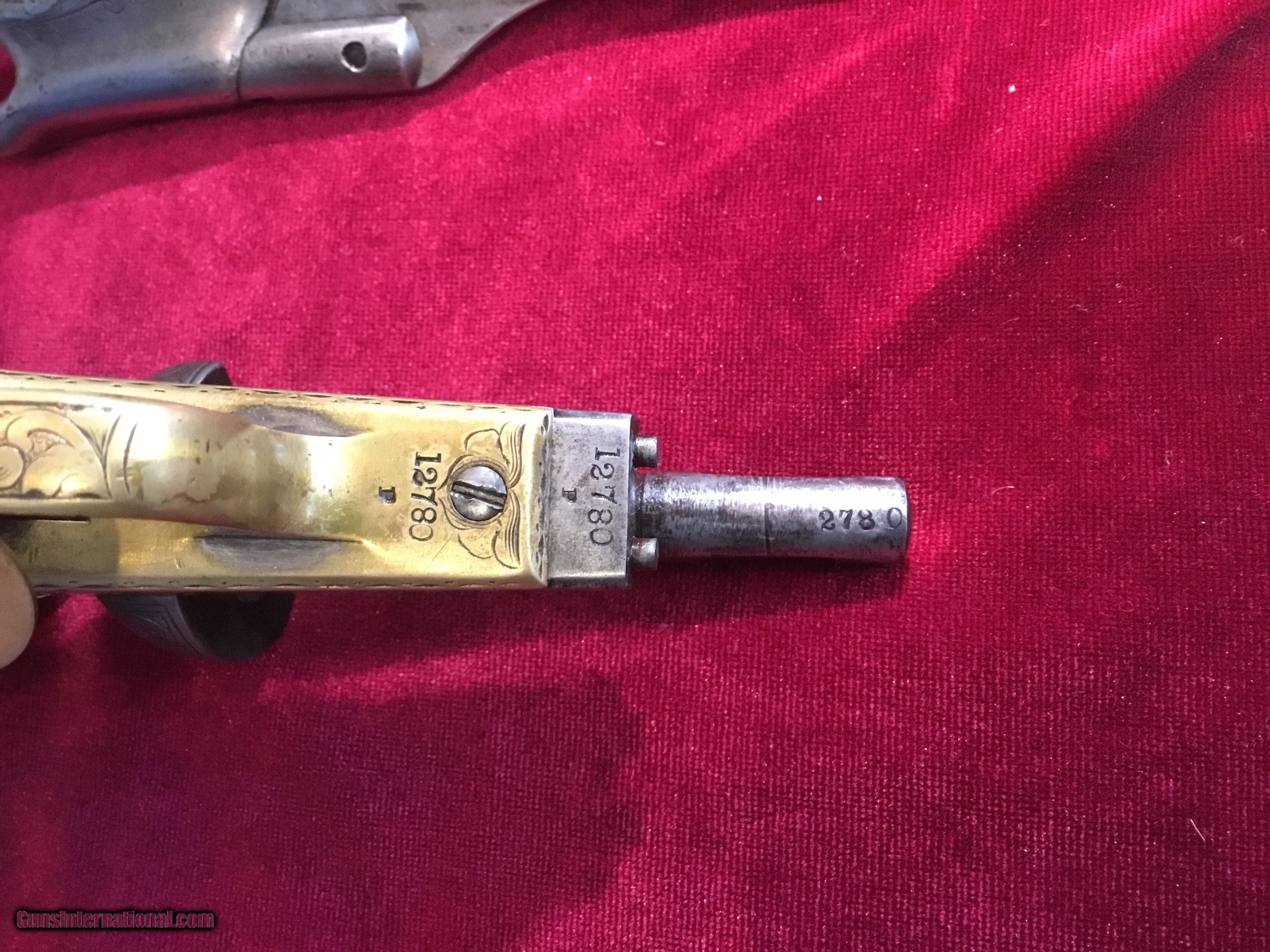 Description: One of the last percussion pistols introduced by Colt, only 37,000 were manufactured. These were used by the US Army/Navy in the Civil War. This Colt Navy was manufactured in 1861 (the beginning the American Civil War). This example has been engraved by Gustavo Young (Jung), one of the premier engravers of the day. Mr. Young worked for Colt from 1850 until the mid 1860s. The pistol is in working order and was well used. The pistol is a matching serial number exple. Note, the barrel wedge, trigger guard, barrel, base pin and the frame all are numbered and matching. The grips are in good shape, but well worn and rounded. There is a tiny bit of silver plate still on the trigger guard. There’s no serial number on the bottom of back strap. The top barrel is marked “ADDRESS COL. SAML. COLT NEW-YORK U.S. AMERICA.” The cylinder is stamped with “COLTS PATENT” and “ENGAGE 16 MAY 1843“ with a naval battle scene. The left side of the frame is marked “COLTS PATENT“ the caliber of .36 CAL. is covered by engraving. This is a very special firearm. Usually, but not always, finely engraved firearms were given at that time as a special gift to a loved one (a wife to husband or a betrothed). I can only guess that it may have been carried by an officer in the Civil War, as it was well used, yet well cared for. This was not a gun that sat in a box and was never fired, so in my mind, it has more value than most. The engraving certainly makes it very, very special pistol. Please look at photos. No international shipping. Shipping and handling will be determined a date of sale. Thanks for looking. SOLD Antique: Yes Manufacturer: Colt Model: 1861 Navy 36 cal Serial Number: 12780 Caliber Info: .36 Chambers: 6 Condition: Good Metal Condition: Good Wood Condition: Good Weight: 2 lbs 9oz Engraving: Yes Item Location: Colorado |