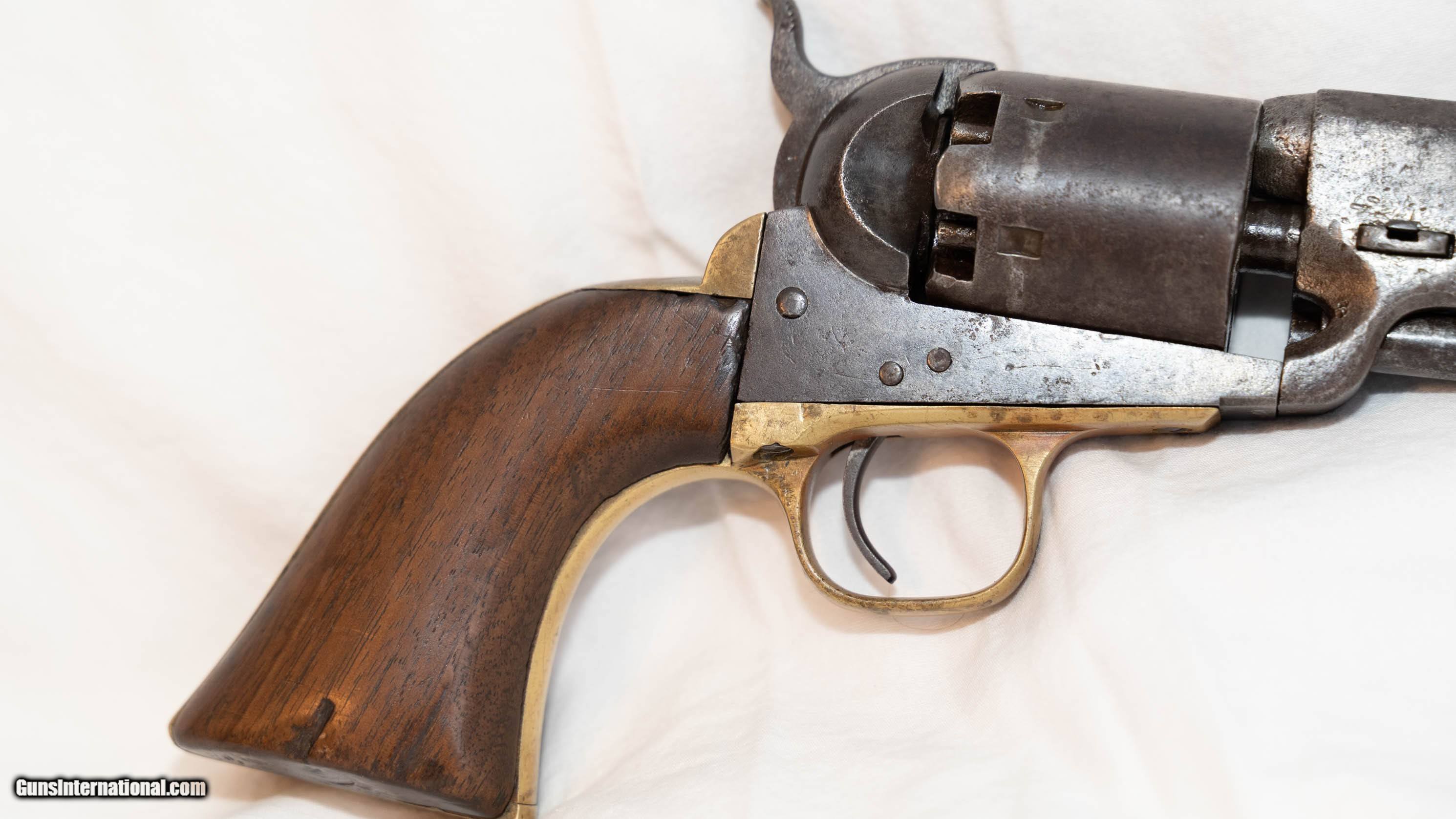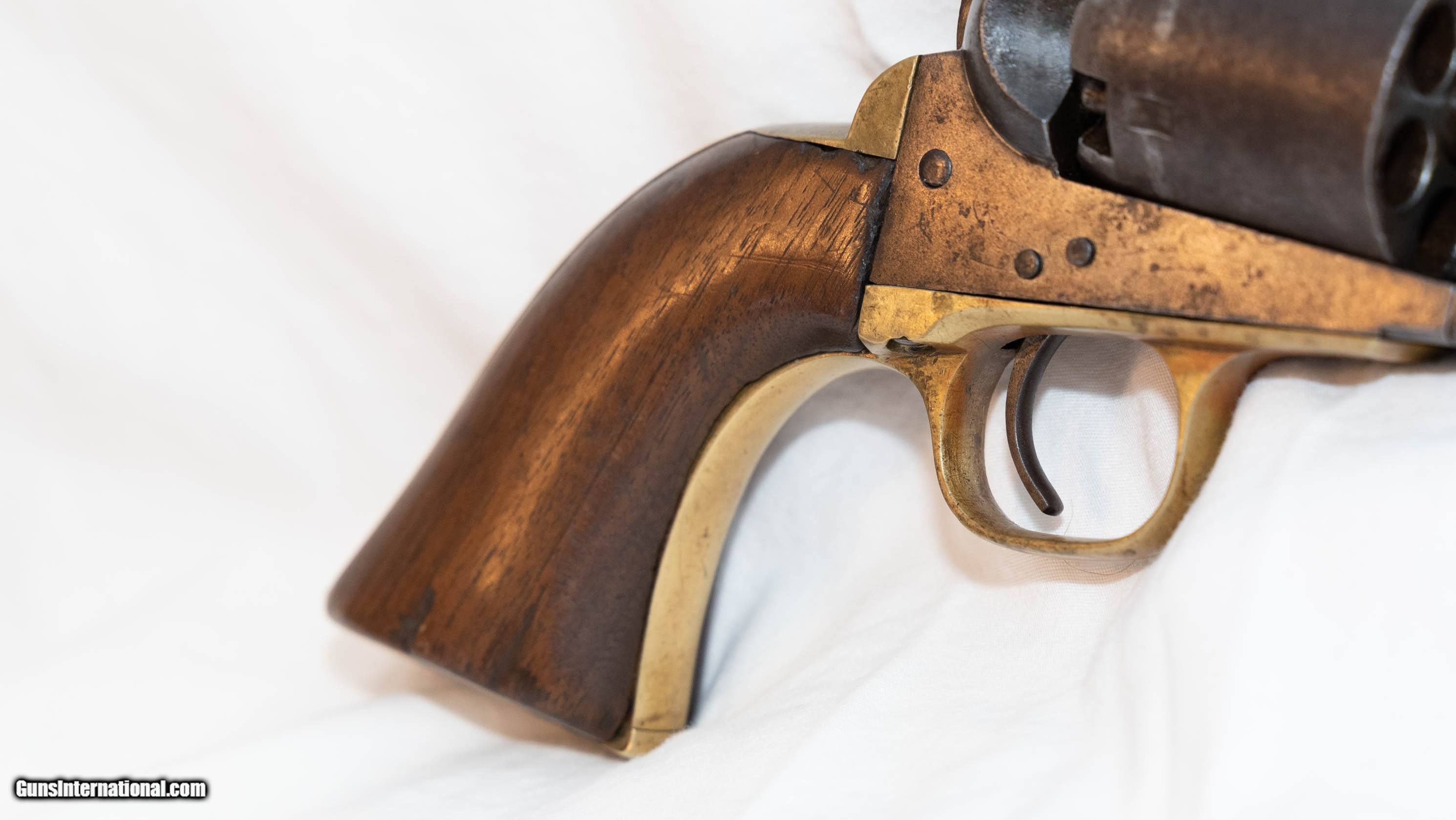 Description: Here is a complete Civil War Colt Model 1860 Army revolver in good original condition. In production from 1860 through 1873, these handguns were the successor to the Colt Third Model Dragoon pistols. The Model 1860 Army was the major sidearm in use by U.S. troops during the Civil War with over 127,000 Colt revolvers acquired by the Union government during the conflict. This revolver is a .44 caliber, four-screw model with a 6-shot fluted cylinder and an 7 ½” long barrel. All matching (low) serial numbers (105629) on the barrel, frame, trigger guard, butt strap, cylinder, and even on the wedge. Serial number dates the manufacture in the first half of 1860. Sidearm is equipped with recoil shield cutouts on the frame and the small notch on the base of the butt plate. Mechanics are strong. Barrel address, “ADDRESS SAML COLT HARTFORD, CT” has light wear. No cylinder scene on the fluted cylinder weapons. The “COLTS / PATENT” mark on the left side is light. All of the nipples are in fine condition. All cylinder safeties remain in fairly good shape. Screw heads are in good condition.Brass trigger guard shows some traces of silver plating. Patina on gunmetal is an overall pewter/gray color. Brass has a mellow golden patina. Back aim site is the top of the hammer, small V with fron site on end of octagon barrell. Brass Trigger guard and wrap of grip in brass. Grips are original one-piece walnut in fair condition. No cartouches remain. Wood shows heavy wear and some chipping at the corners. This is a classic, early production “Fluted Colt Army” revolver. SOLD Antique: Yes Manufacturer: Colt Army Revolver Model: Col SAN L/N 1860 Serial Number: Colt New-York. US America SS#105629 Caliber Info: .45 Chambers: 6 Condition: Good Wood Condition: minor chips on butt Bore Condition: good Barrels: 7.5 Triggers: 1 Rib: Octagon Finish: blue Manufacture Date: 1860s Item Location: Alabama |
