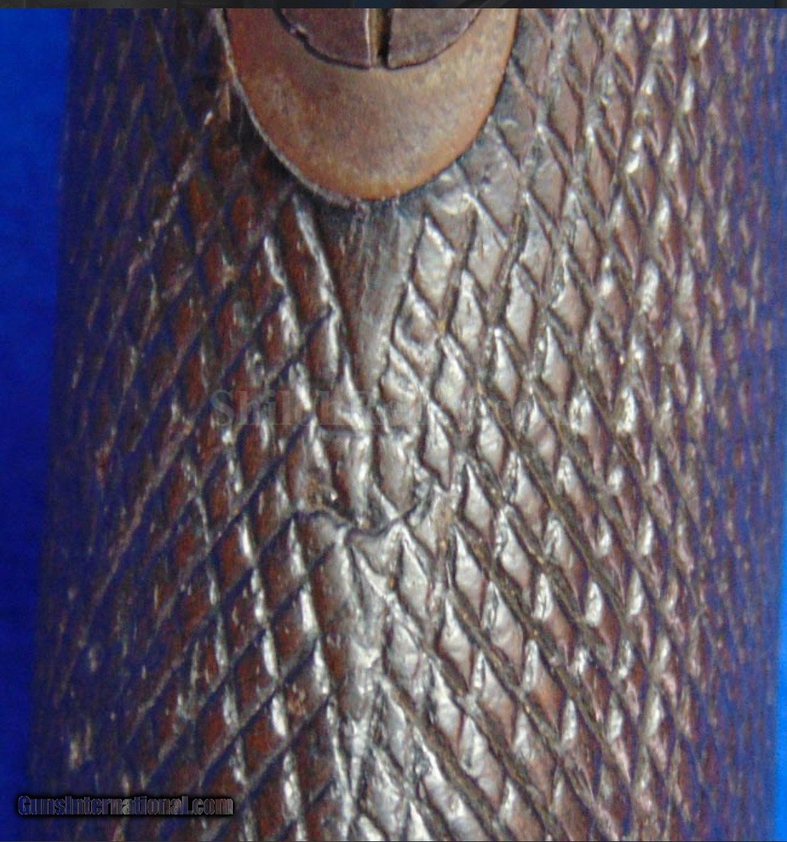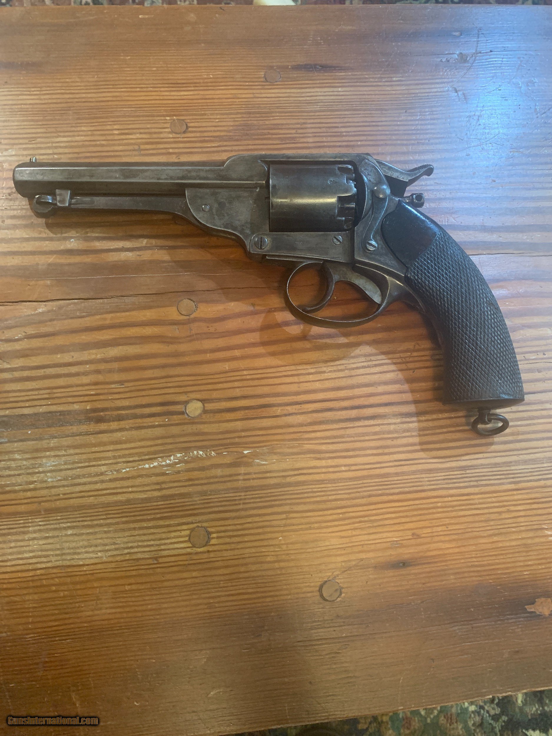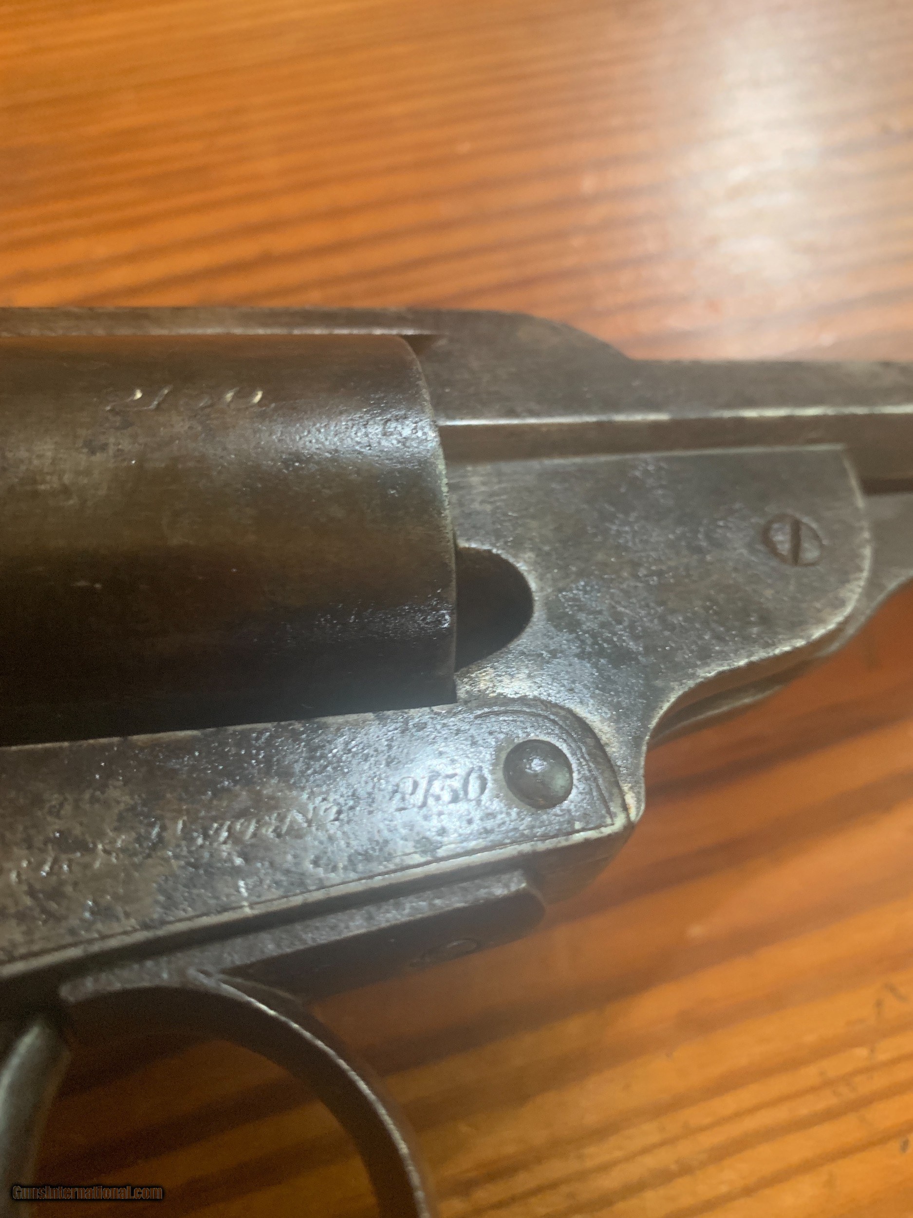 Description: Excellent for a Confederate used revovler. Serial number 2150 indicating an early shipped revolver. Probably early '62. Nice smooth plum patina. Gun locks when trigger pulled back. Remember, this was a sinlge action gun. London Armoury lock on grip. LAC and proofs on barrell. All original parts and nice chekered grips. The JS Anchor is stamped in the checkering at base of trigger guard as you want. Lanyard ring is still present and accounted for. Patina is smooth with very minor pitting on frame at serial number. Mentioned for accuracy and does not detract from gun. Used but not abused Confederate revolver without having to rob the bank. SOLD Antique: Yes |