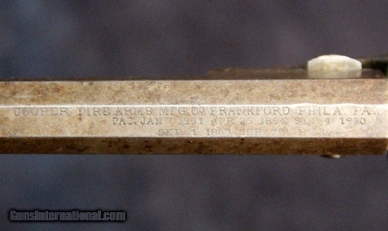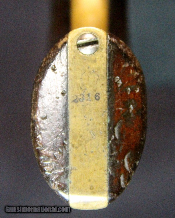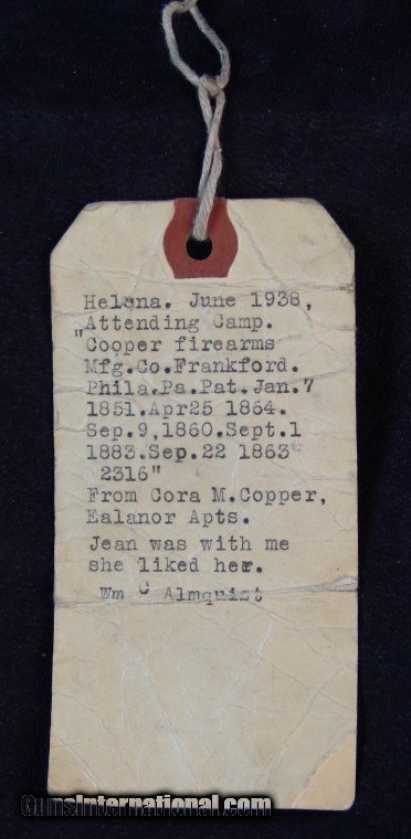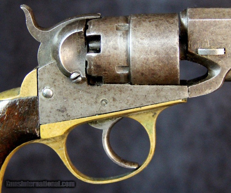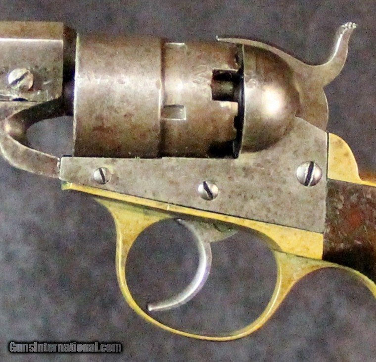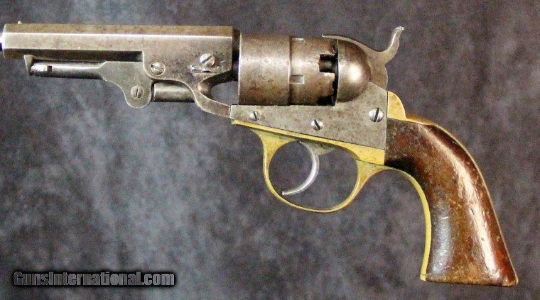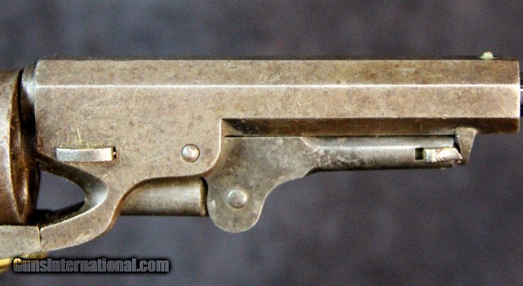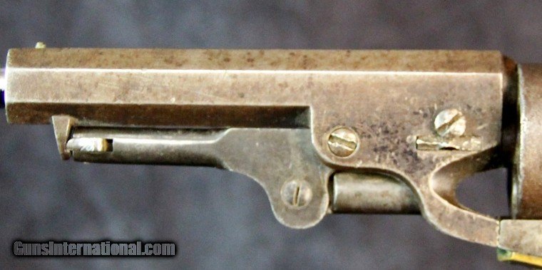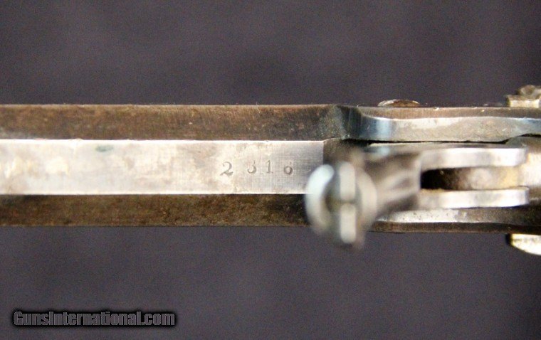 Description: .36 cal, 2nd Model, #2316, 4 inch barrel, blue finish, 1 piece walnut grips, has old tag from Montana collection, 1864. Condition: very good strong rifling, 10% blue on barrel, rest of iron silver gray, untouched brass back strap and trigger guard, very good grips show some holster wear on edges, broken barrel wedge, excellent mechanically, very good marks. SOLD Antique: Yes |