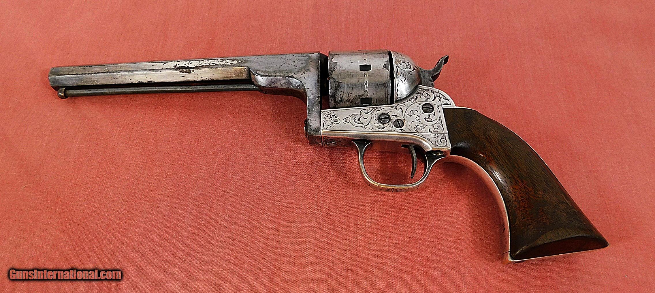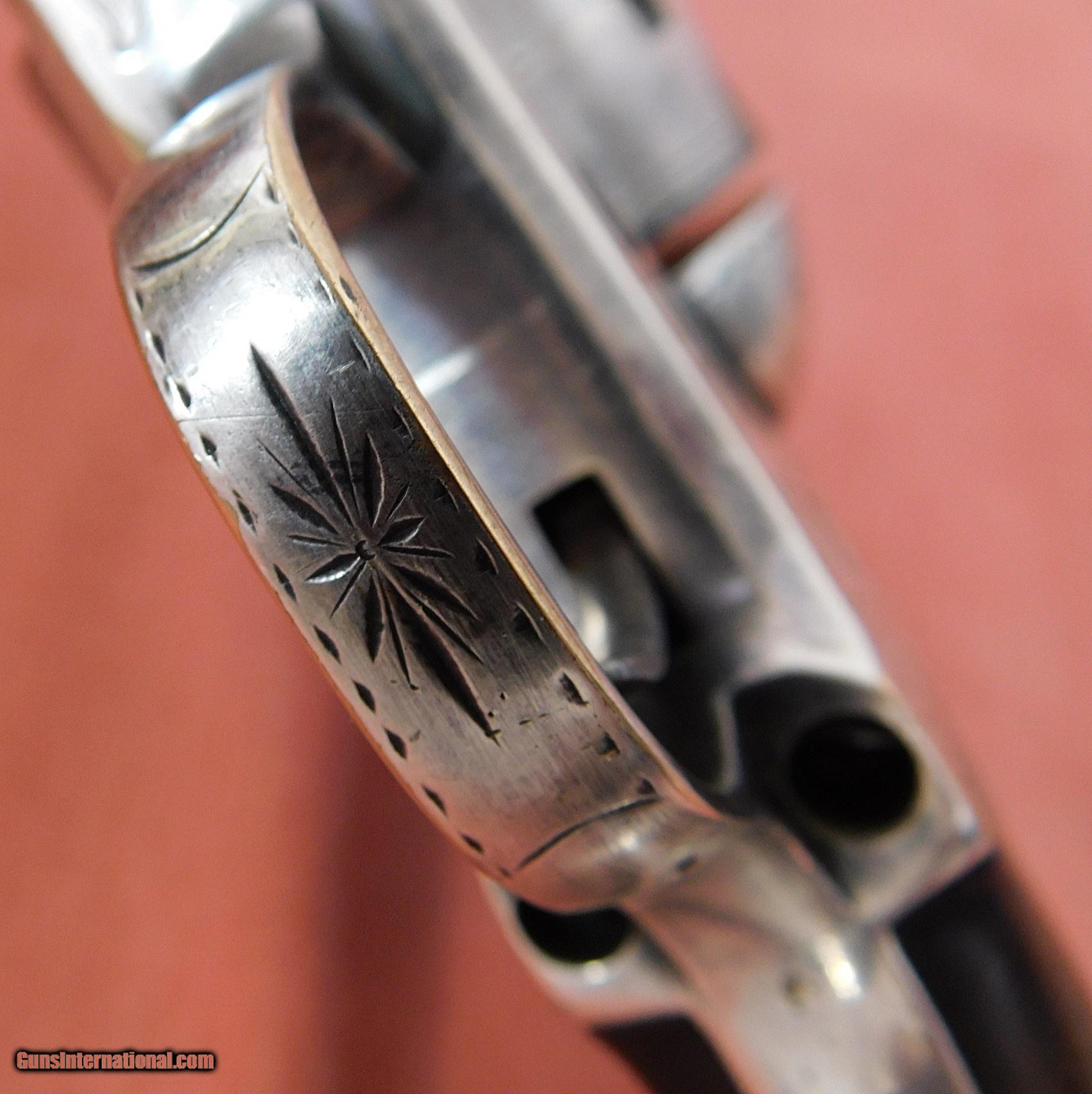 Description: SOLD PENDING FUNDS: D Moore 7 Shooter Belt Revolver, sn# 2059- This is the 7 shot Moore cartridge belt revolver with desirable 6 inch octagonal barrel, 32 rimfire caliber. The silver plated brass frame is beautifully hand engraved with scrollwork and retains about 80% of the silver plate. The cylinder and barrel retain very little of the original factory finish. Walnut grips are unmarred with no chips. The barrel is marked “D. MOORE. PATENT. SEPT, 18. 1860.” 100% original except for a proper replacement ejector rod, which was very common with the Moores as the ejectors are a simple rolled steel rod retained only by a tiny spring in the frame and most originals were lost during the war. 100% complete and mechanically sound with good visible rifling. Barrel/cylinder lock mechanisms is smooth and allows the cylinder to easily rotate for loading and ejecting. A very fine example. These revolvers were made in the early 1860’s and were popular with Union officers throughout the war. ANTIQUE USPS Priority Shipping to your Door (where allowed by law) $25, USPS Money Order, Cash, Certified Check SOLD Antique: Yes Handgun Caliber: .32 Rimfire Manufacturer: Moore's Patent Firearms Co Model: Seven Shooter Belt Revolver Serial Number: 2059 Caliber Info: 32 Rinfire Condition: Good Metal Condition: Good Wood Condition: Very Good Bore Condition: Visible Rifling Some Pitting Barrels: 6 inch Barrel Type: Octagon Action: Single Action Engraving: Broad floral Scrollwork Item Location: Sun City, AZ |