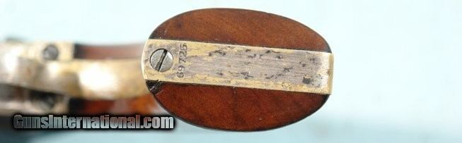 Description: EARLY COLT MODEL 1849 PERCUSSION .31 CAL. 5 SHOT 6” POCKET REVOLVER CA. 1953. All original and matching including wedge with barrel having the early small two-line “New York” barrel address and the very tiny “COLTS/PATENT” frame stamp. Even all the screws are original. Very good overall with good markings including the “STAGECOACH HOLDUP” roll die engraved cylinder scene which is all there with light wear. Crisp metal with very nice dark original patina. Brass grip and back straps with much original silver. Original factory walnut grips with the original piano finish. Very tight working order. Cylinder has the original safety pins in good order. Loading lever which is numbered to the gun is missing the upper tiny tip of the catch mortice barely noticeable and an easy repair. $1450. Good bore. Nice early example. SOLD Antique: Yes Handgun Caliber: .31 |