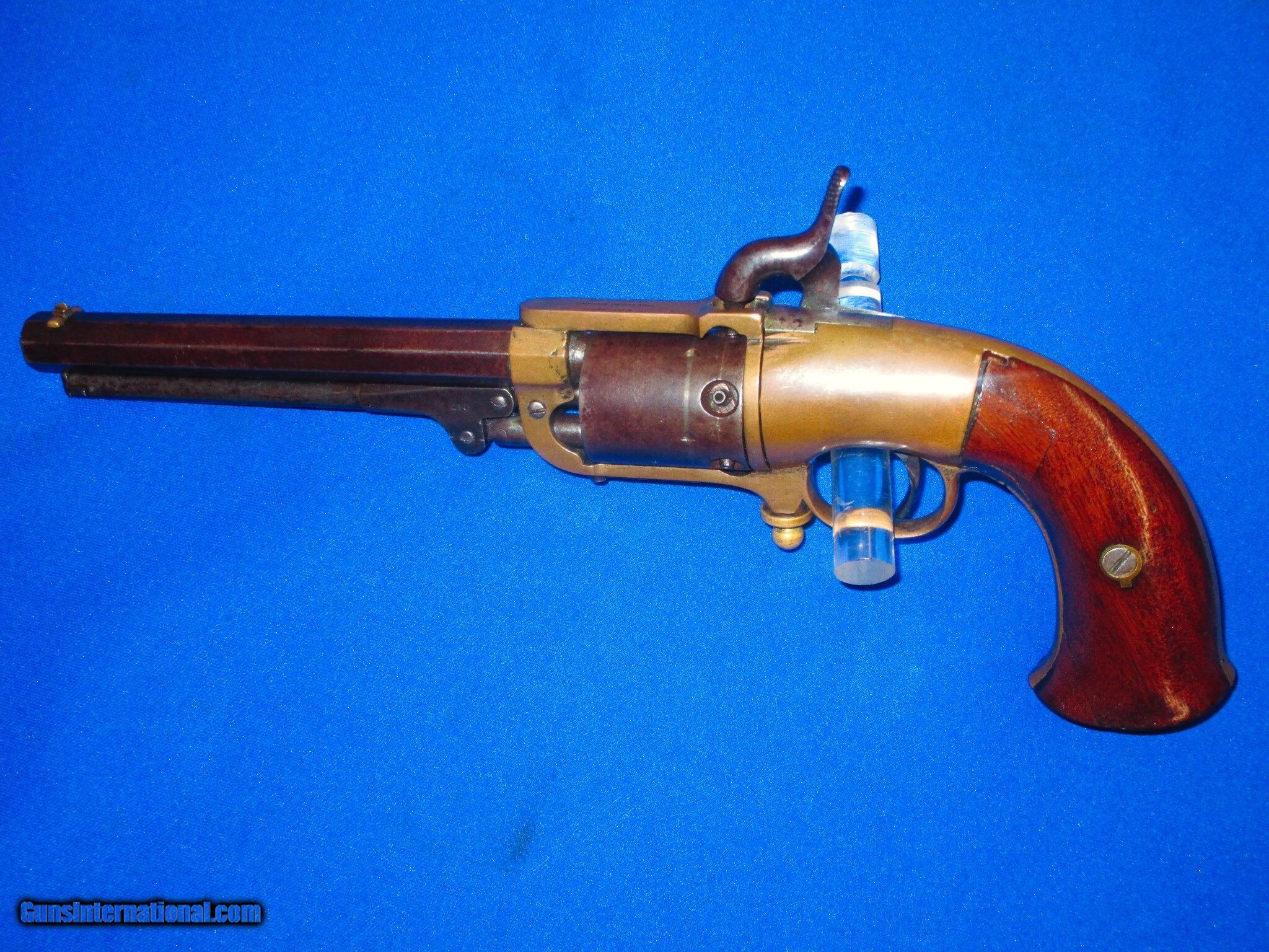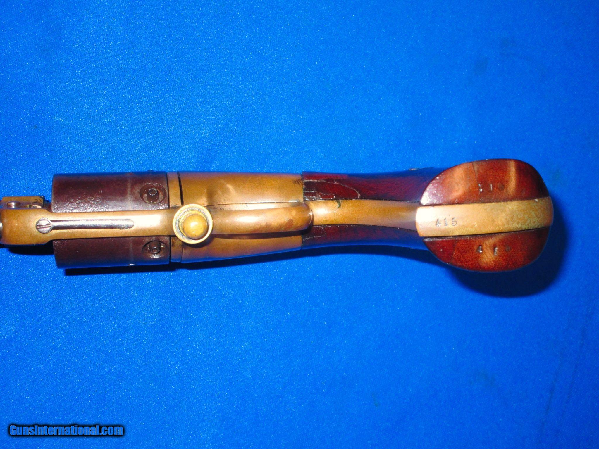 Description: An Early & Desirable U.S. Civil War Secondary Martial Percussion Butterfield Army Model Revolver In Fine Untouched Condition. Serial #416, all matching numbers. All original and complete. Only 640 made 1861-1862. The revolver has fine untouched brass, metal, markings, and edges. It is marked on the top of the frame "BUTTERFIELD'S/PATENT DEC. 11, 1855/PHILADA". The barrel and cylinder have a fine natural plum patina with thinning blue showing through in areas. The lever and hammer show some darkening case colors on them. The brass frame, backstrap, and trigger guard are fine throughout with a wonderful mellow color to them. All of the screws are fine. The original factory wood grips are fine throughout with nice edges and are numbered to the gun. There is a very old & well done period one inch repair in the grip on the upper left side. This old repair blends into the grip nicely. The pistol has a fine rifled bore and action, This Is A Very Fine Example Of A Scarce U.S. Civil War Secondary Martial Percussion Butterfield Army Model Revolver! DISCLAIMER: All firearms are sold as collector’s items only – we did not accept responsibility as to the shooting safety or reliability of any antique firearm. All firearms as described as accurately as possible, given the restraints of a catalog listing length. We want satisfied customers and often under describe the weapons. Any city or state regulations regarding owning antique firearms are the responsibility of the purchaser. All firearms are mechanically perfect unless noted, but again are NOT warranted as safe to fire. SOLD Antique: Yes Manufacturer: Butterfield Model: Army Serial Number: 416 Condition: Fine Untouched Condition Metal Condition: Fine Untouched Condition Wood Condition: Nice Untouched Condition Manufacture Date: 1861 - 1862 Only 640 |