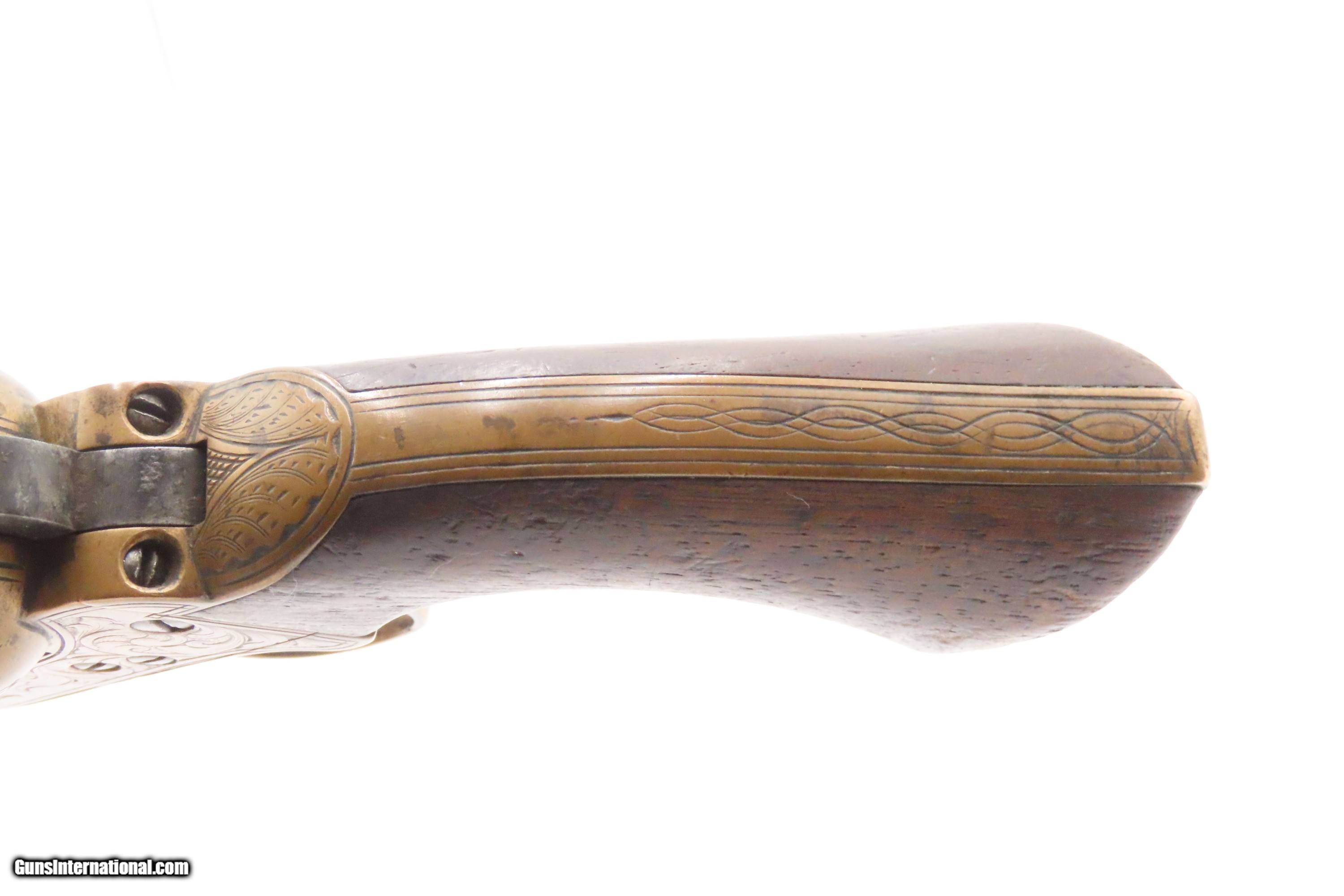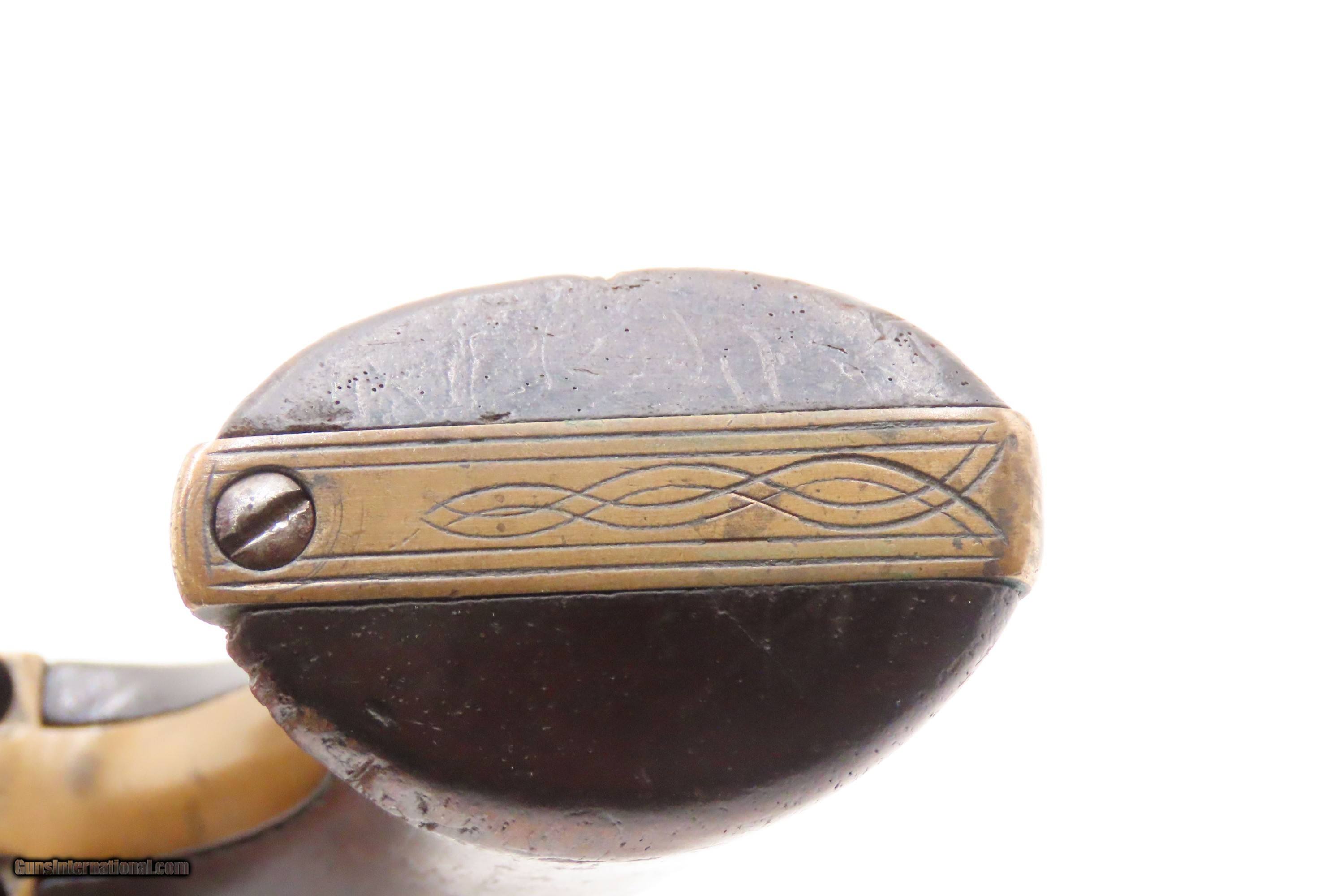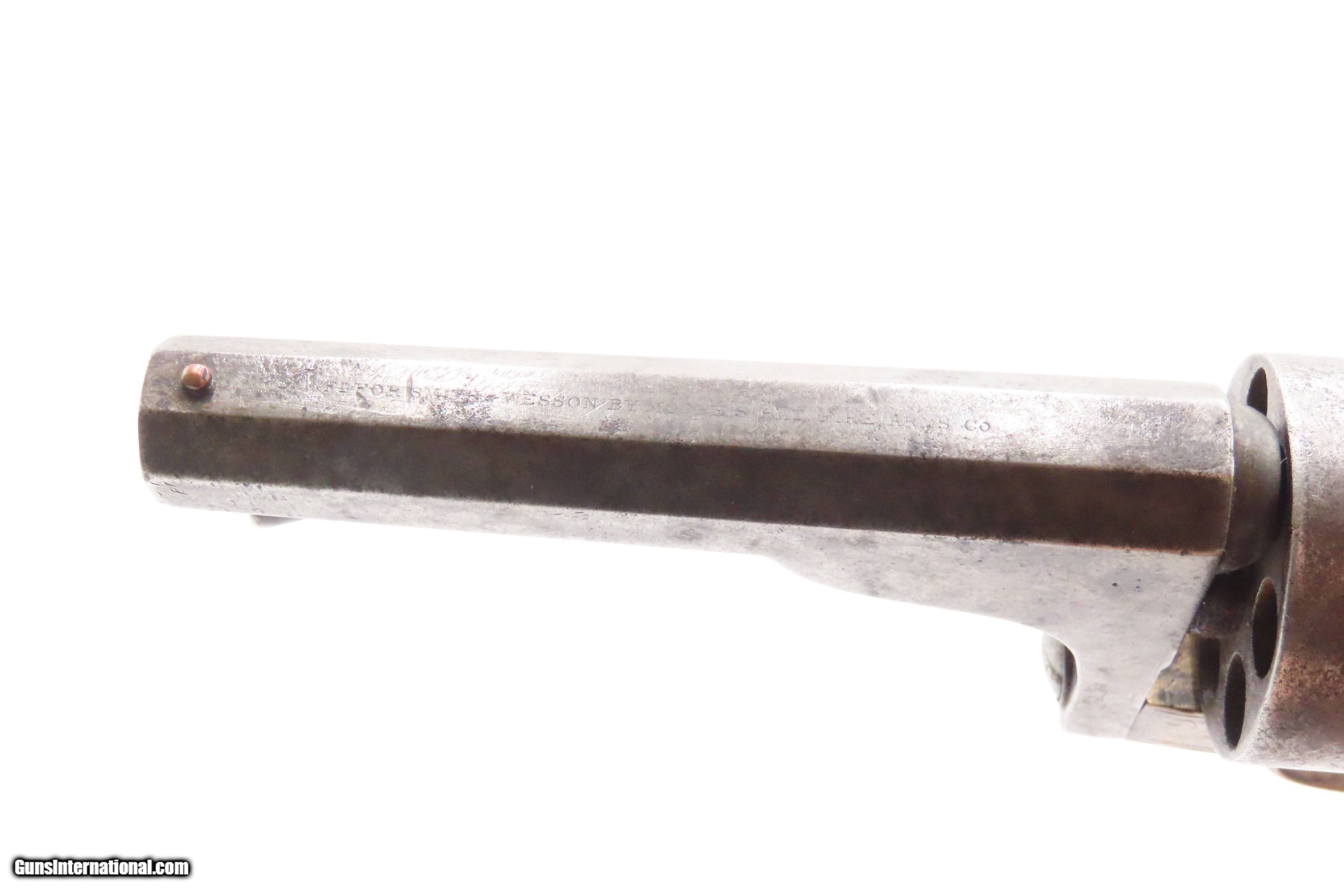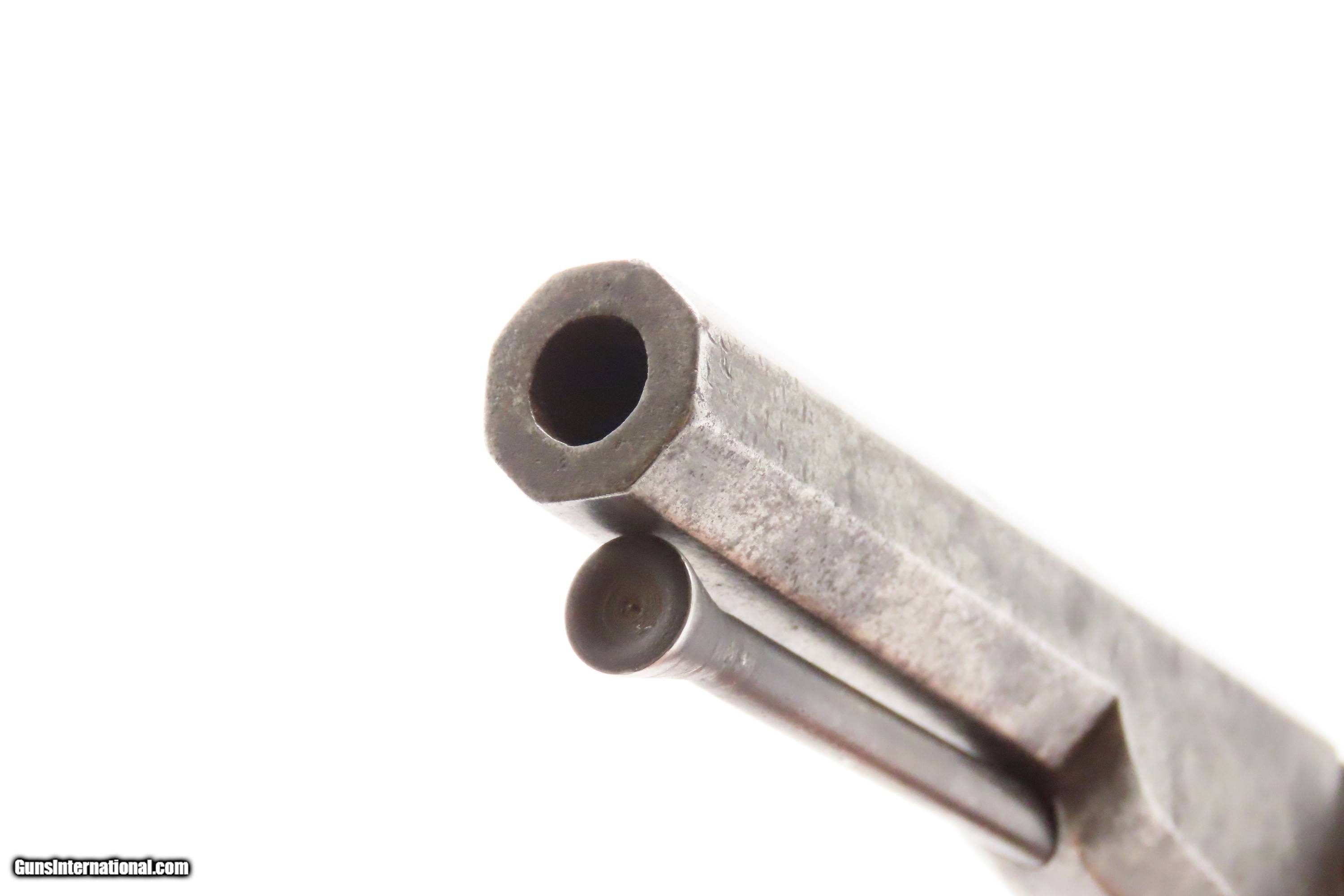 Description: ENGRAVED Antique CIVIL WAR Era MOORE’S PATENT Co. .32 BELT Revolver SCARCE Scarce & Very Collectible Civil War Revolver Here we present an antique Engraved Moore’s Patent Firearms Co. Single Action Belt Revolver. These revolvers were made in Brooklyn, New York from 1861-1863 and number less than 8,000 in total. In this era, many companies infringed on the Rollin White patent. They were promptly sued. Others tried and succeeded in finding ways around the patent to make metallic cartridge revolvers while the Rollin White Patent was still in effect. Daniel Moore, the designer of this revolver was one who did both. He designed a cartridge revolver that was the first “swing-out” cylinder revolver, but blatantly infringed on S&W’s patent. He was sued and lost. The other significance of this pistol is that many of these are known to have been purchased by Union officers and enlisted men for use during the American Civil War. Mechanically, this revolver utilizes a push-button release that allows the barrel and cylinder to cant to the right for loading and unloading. The cylinder is chambered for 7 shots of .32 rimfire and is fully bored through, violating the Smith & Wesson owned Rollin White Patent. The pistol also features full factory engraving on the brass frame, which is quite handsome. The overall condition is good. The action functions, but the cylinder does not lock up. The cylinder can be released without pressing the release button. Good grips. The bore is in good shape considering its age. Markings are worn but legible. The frame is nicely engraved with traditional floral designs. Don’t miss a chance to own this rare piece of firearms and Civil War history! Own the original! This is a legitimate antique and not a reproduction. Barrel is 3-3/4 inches. Caliber: .32 Rimfire Overall condition as seen in photos. Very Fast. Very Safe. FREE SHIPPING WORLDWIDE. Delivered directly to your door by express mail! Guaranteed AUTHENTIC & Includes CERTIFICATE OF AUTHENTICITY. ancestryguns $1150 #247256 SOLD Antique: Yes |