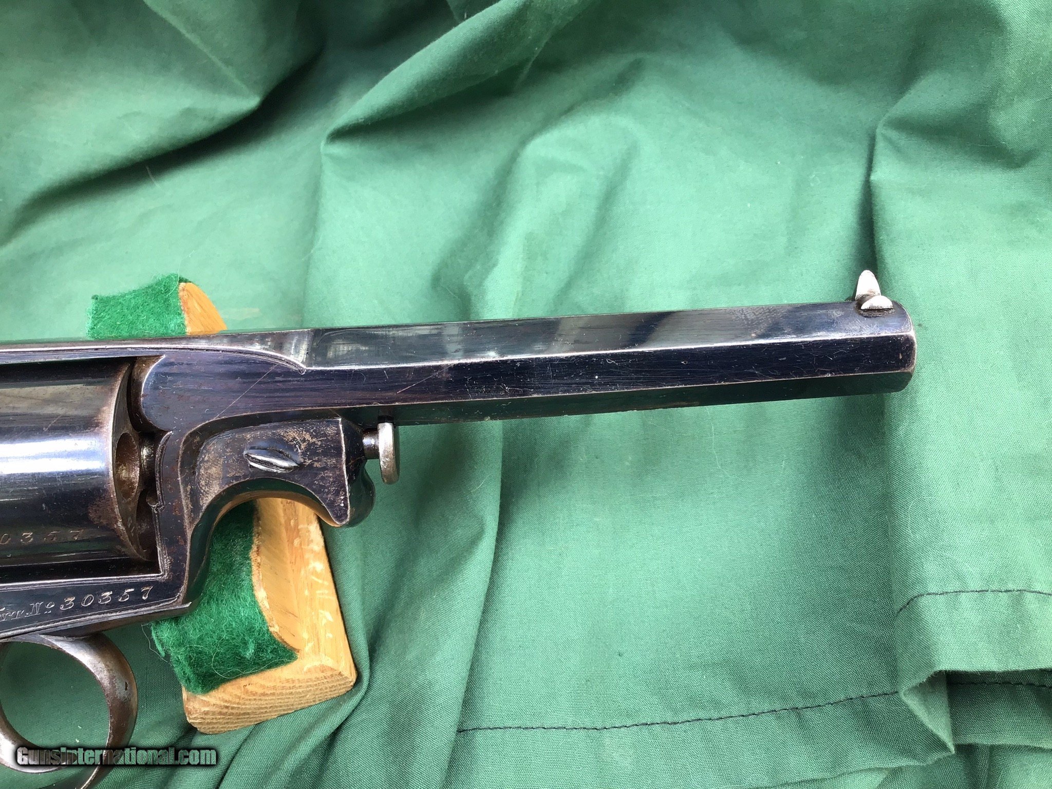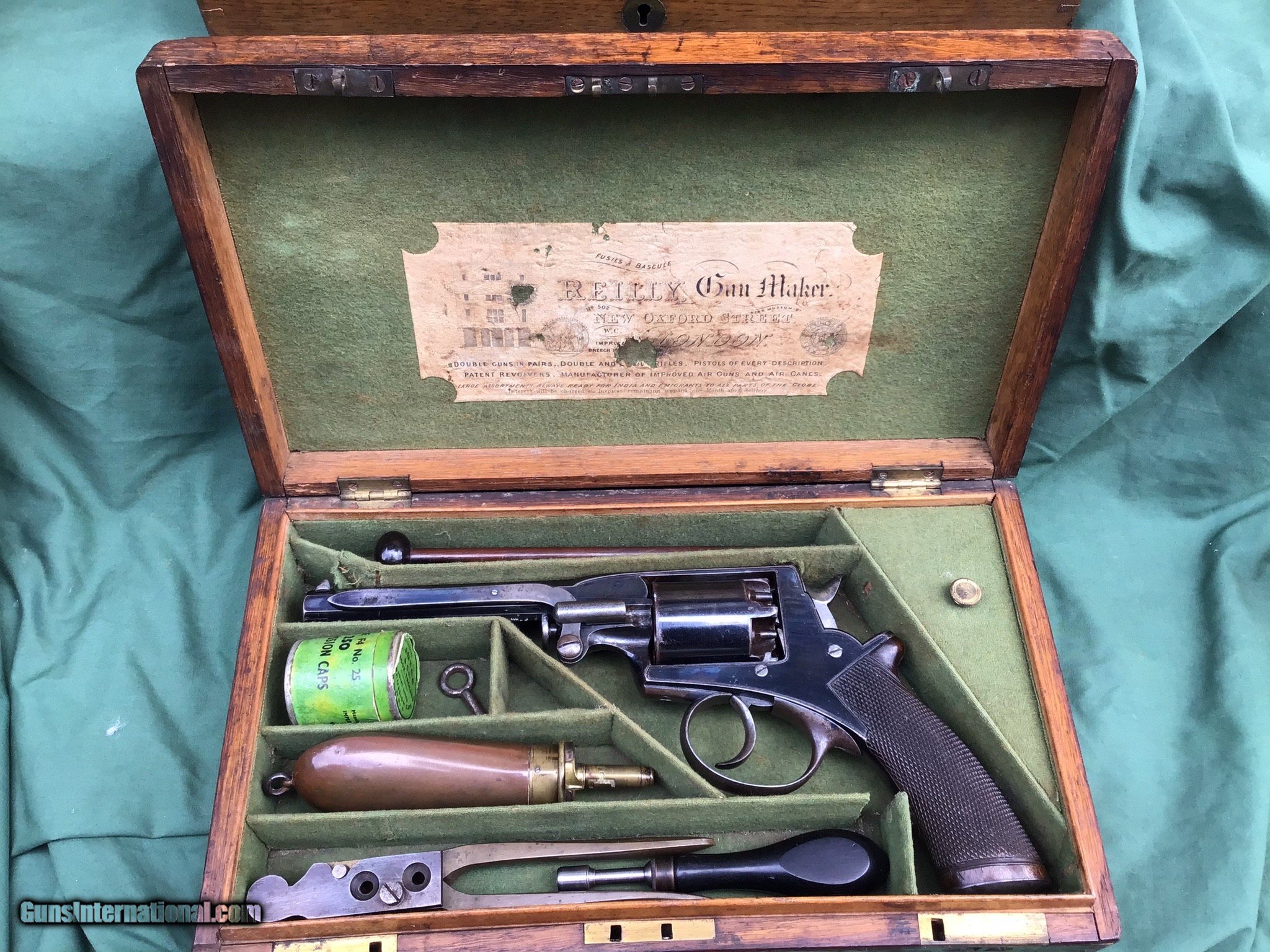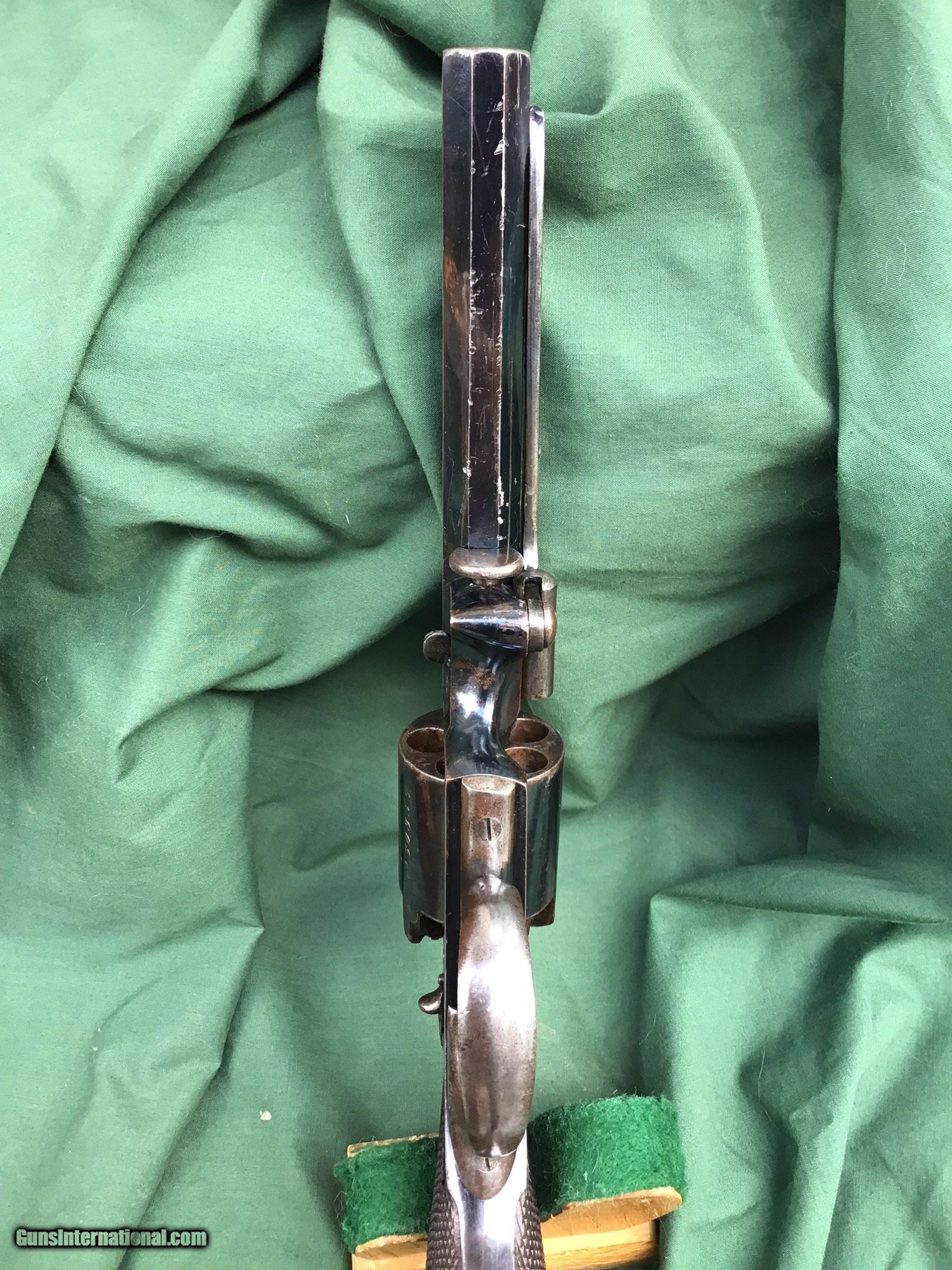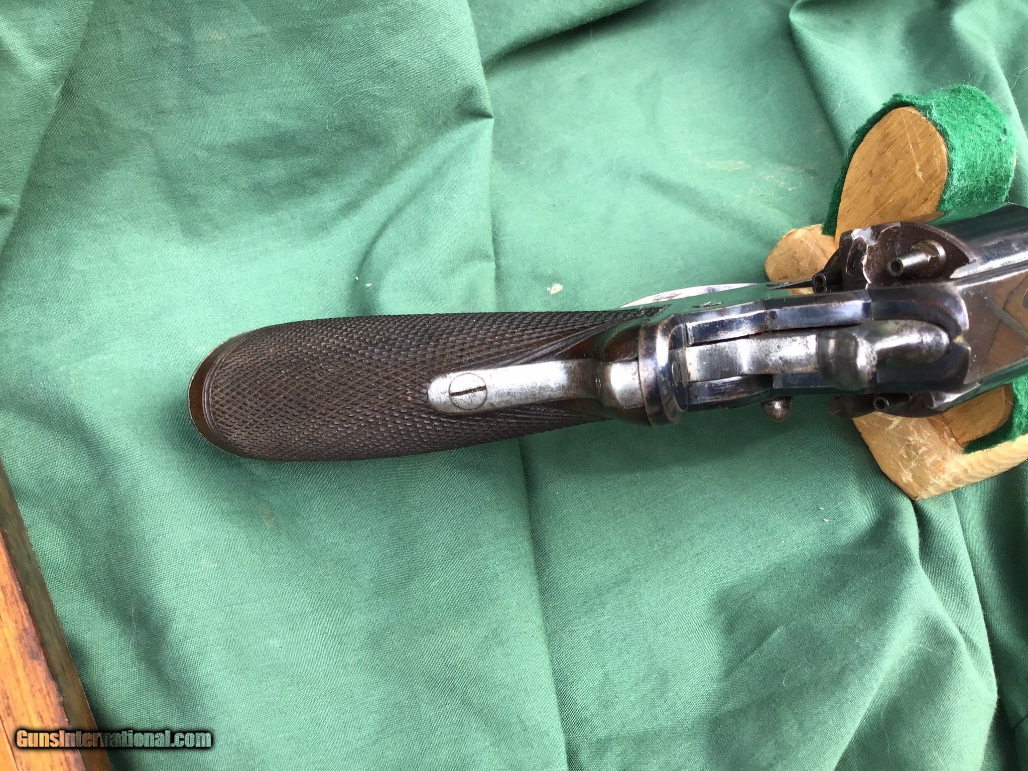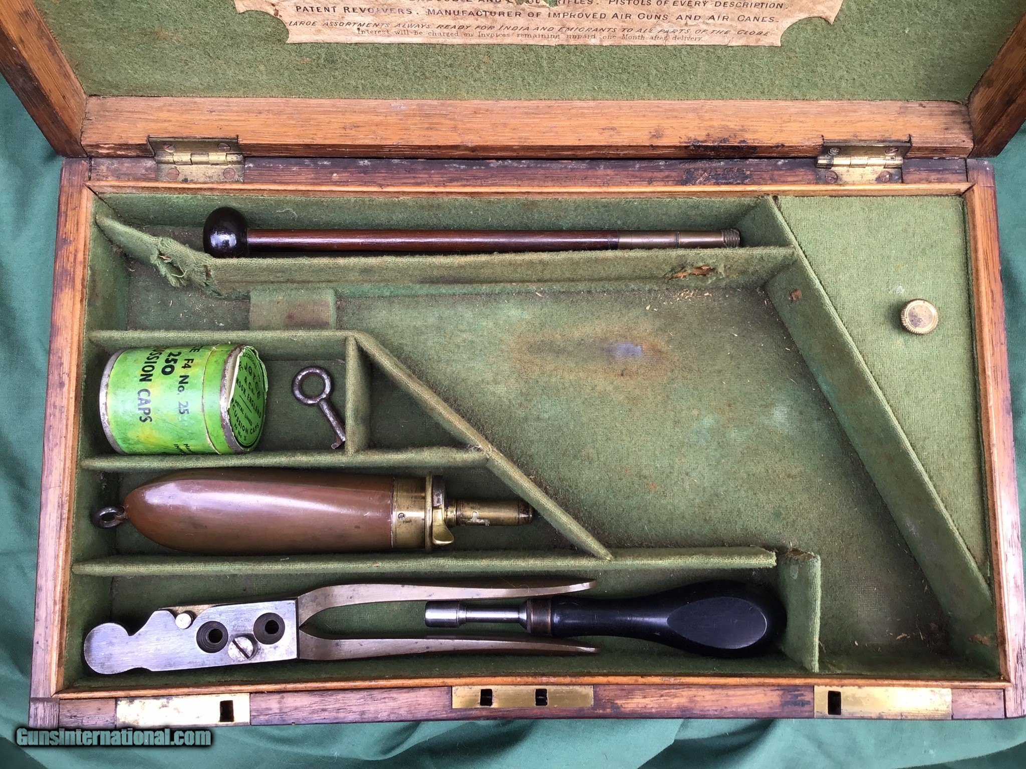 Description: Factory Cased Beaumont Adams .54 Bore in excellent condition. This 442 caliber percussion Beaumont-Adams revolver was made by the London Armory Company and marketed by Reilly Gunmakers in London. It has an approx. 5 5/8" octagon barrel and no markings on top strap of revolver. All metal is blue with approximately 90% remaining. The right side of the frame is marked ADAMS' PATENT. No. 30357. The cylinder is marked 30357. The barrel left oblique flat is marked With two proof marks (see pic). Each chamber of the cylinder is inspected with a crown/V. The grips are excellent with fine checkering and no chips or cracks. The action functions perfectly. Included in the case are the correct two-cavity mold marked with a crown over an oval reading REGISTERED ADAMS with 28 Nov./1851 inside that. It is also marked 54 which is the bore designation (.442). Also included in the case are an excellent Dixon bag flask, Joyce cap tin, cleaning rod, percussion nipple wrench, and original key for the case. Reilly label is still intact on underside of lid. I bought this cased set many years ago, the story that came with (only a story, no actual proof) it was it was purchased from an elderly woman in Charleston SC that said it belonged to a family member that served in Civil War. This is a super cased Beaumont-Adams revolver that is fit for the finest collection. SOLD Antique: Yes |
