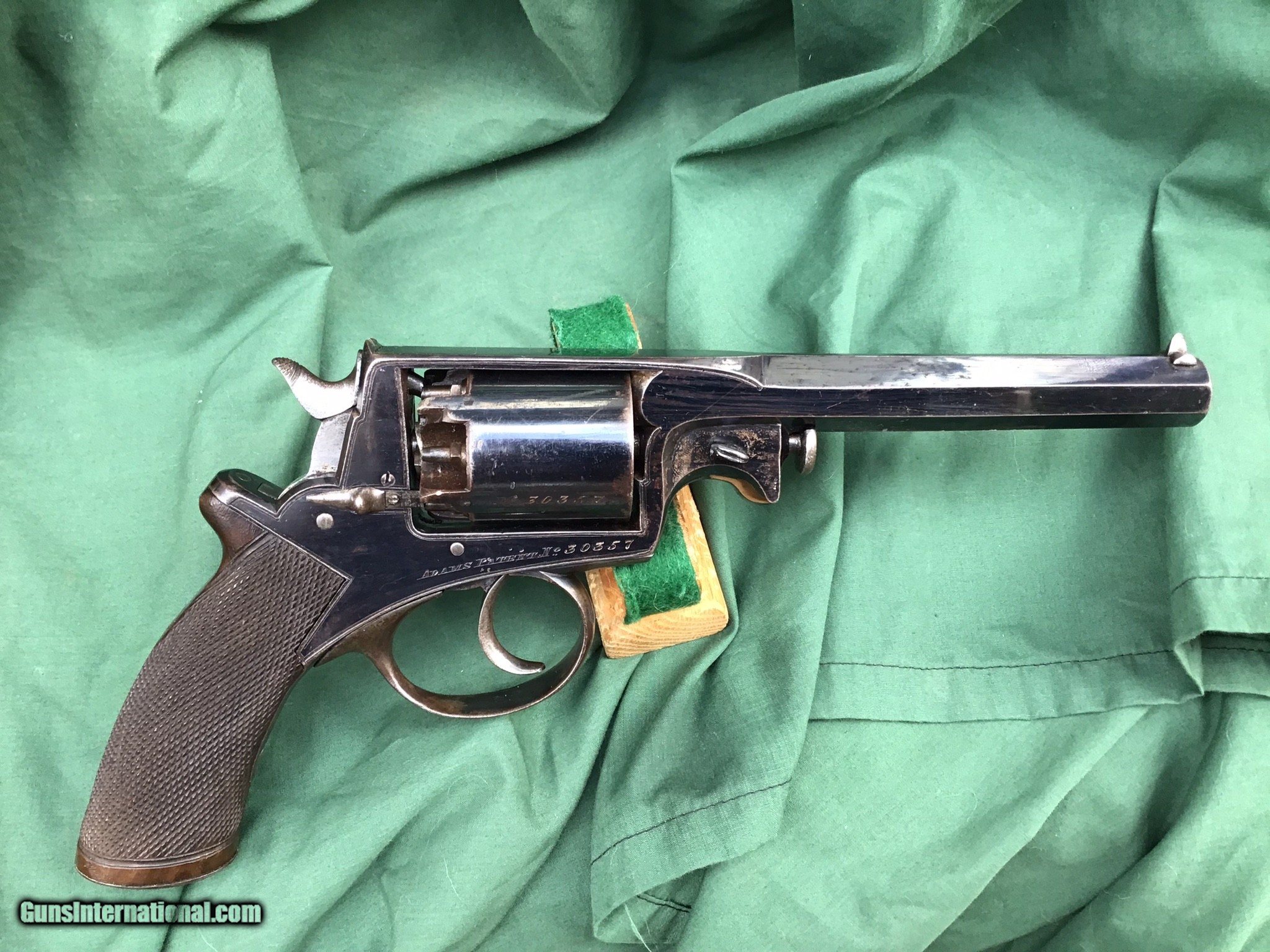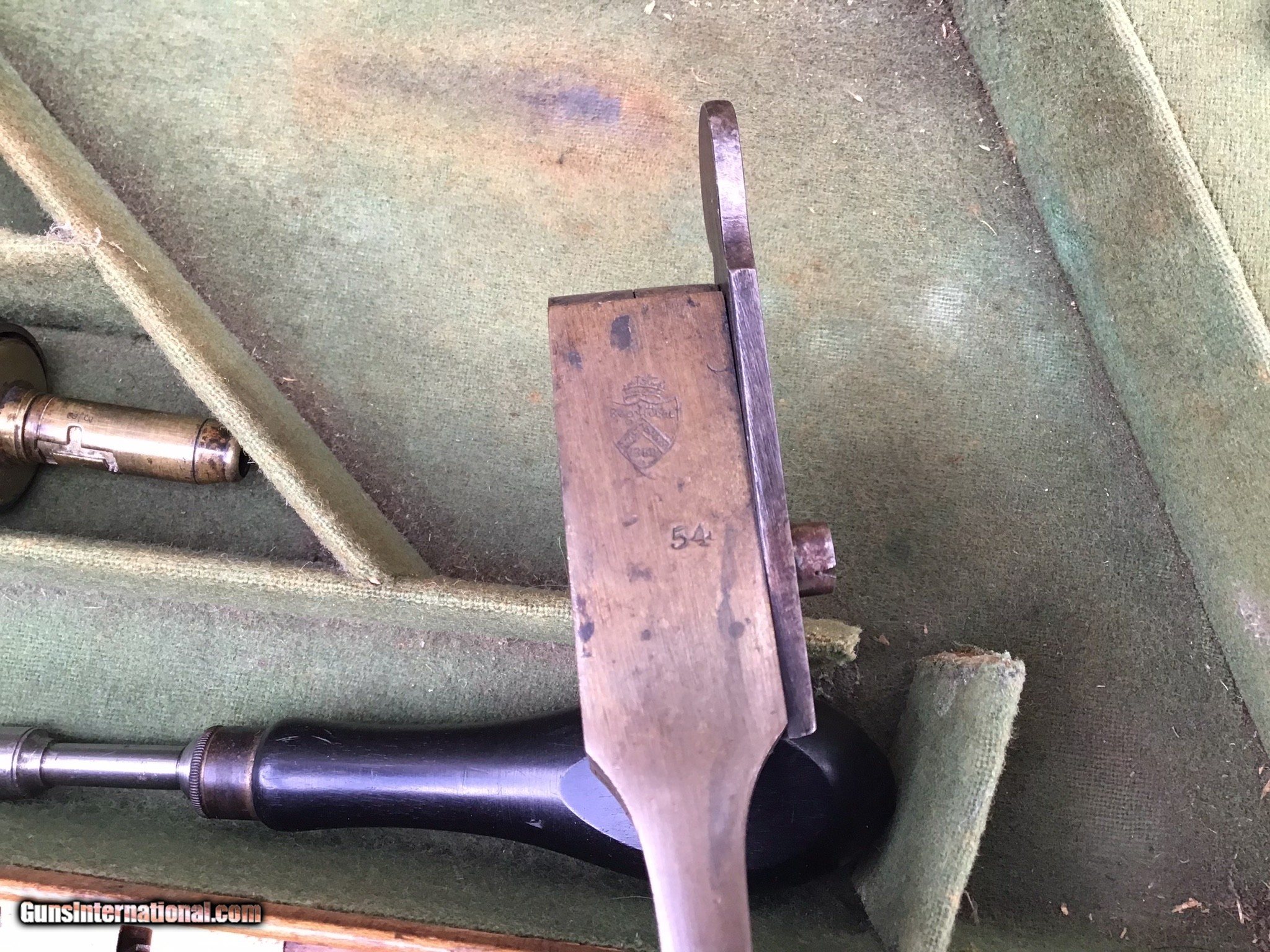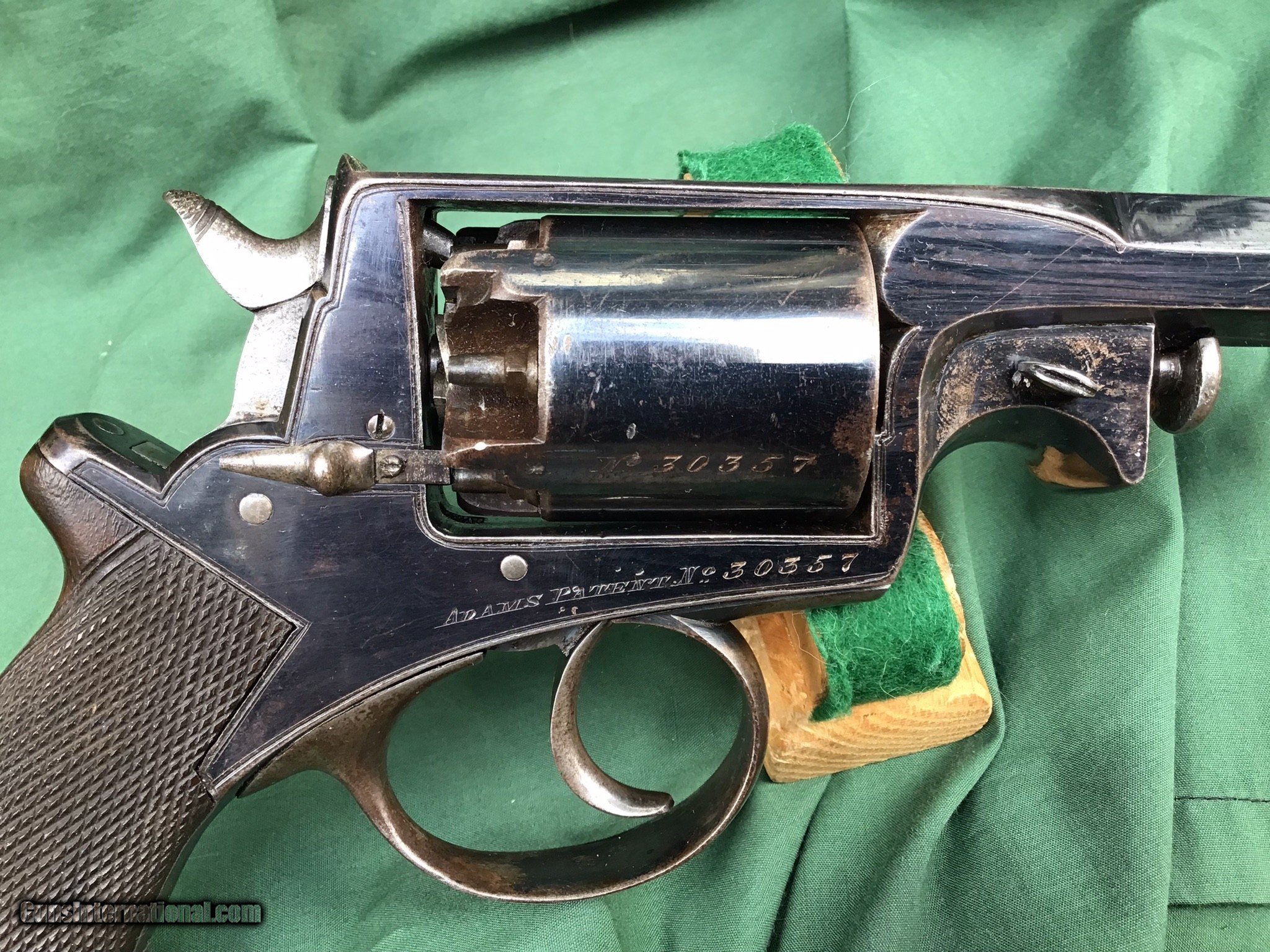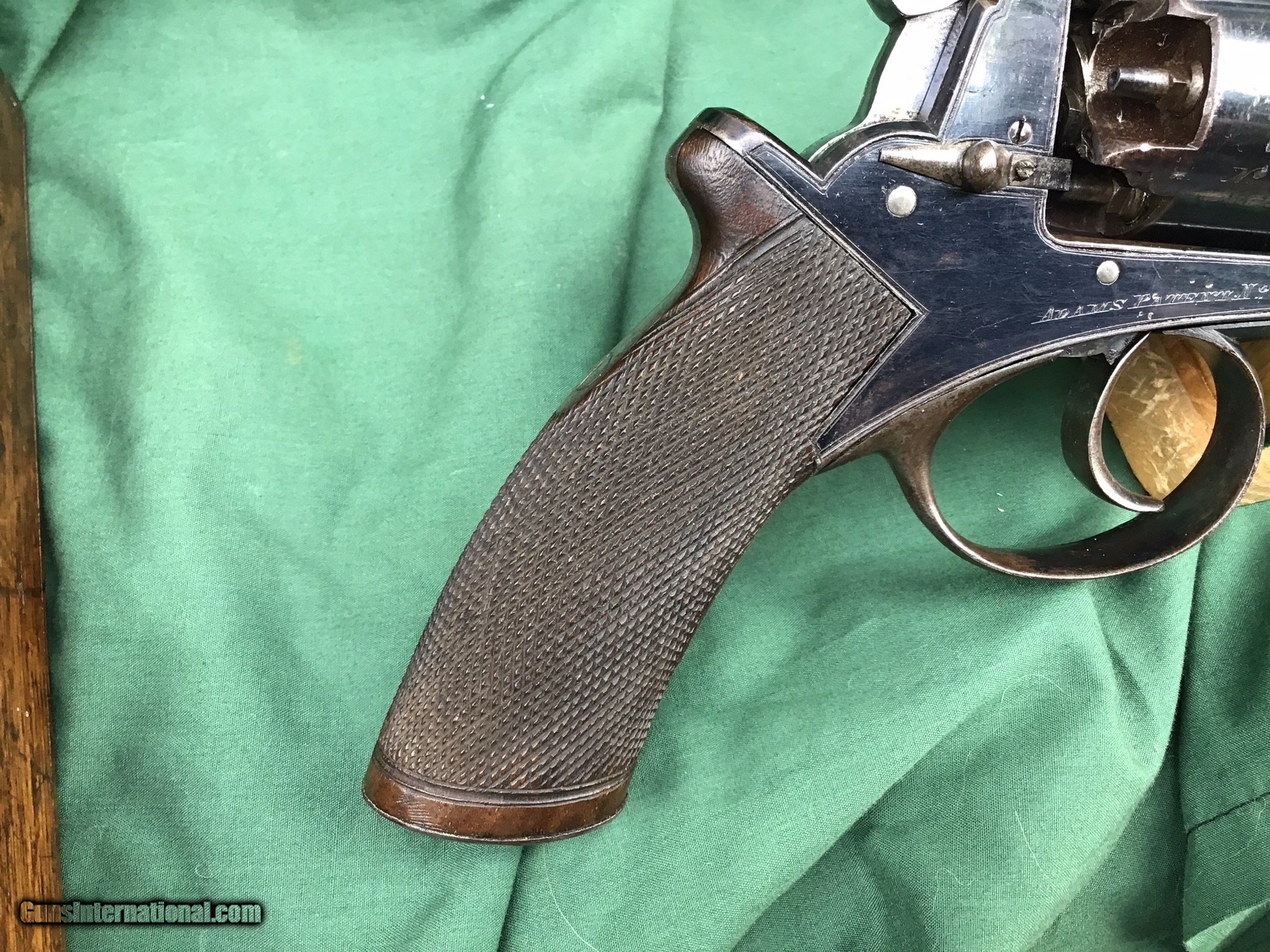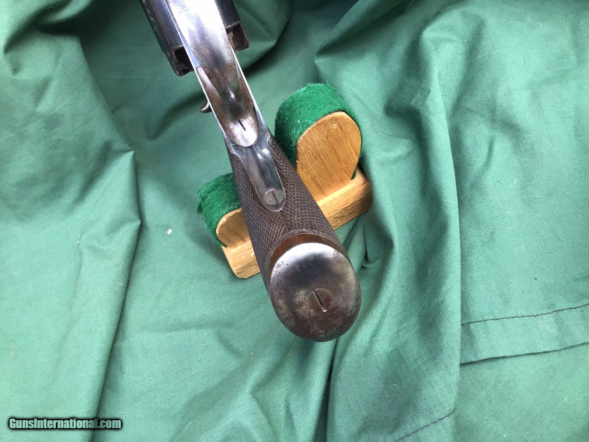 Description: Factory Cased Beaumont Adams .54 Bore in excellent condition. This 442 caliber percussion Beaumont-Adams revolver was made by the London Armory Company and marketed by Reilly Gunmakers in London. It has an approx. 5 5/8" octagon barrel and no markings on top strap of revolver. All metal is blue with approximately 90% remaining. The right side of the frame is marked ADAMS' PATENT. No. 30357. The cylinder is marked 30357. The barrel left oblique flat is marked With two proof marks (see pic). Each chamber of the cylinder is inspected with a crown/V. The grips are excellent with fine checkering and no chips or cracks. The action functions perfectly. Included in the case are the correct two-cavity mold marked with a crown over an oval reading REGISTERED ADAMS with 28 Nov./1851 inside that. It is also marked 54 which is the bore designation (.442). Also included in the case are an excellent Dixon bag flask, Joyce cap tin, cleaning rod, percussion nipple wrench, and original key for the case. Reilly label is still intact on underside of lid. I bought this cased set many years ago, the story that came with (only a story, no actual proof) it was it was purchased from an elderly woman in Charleston SC that said it belonged to a family member that served in Civil War. This is a super cased Beaumont-Adams revolver that is fit for the finest collection. SOLD Antique: Yes |