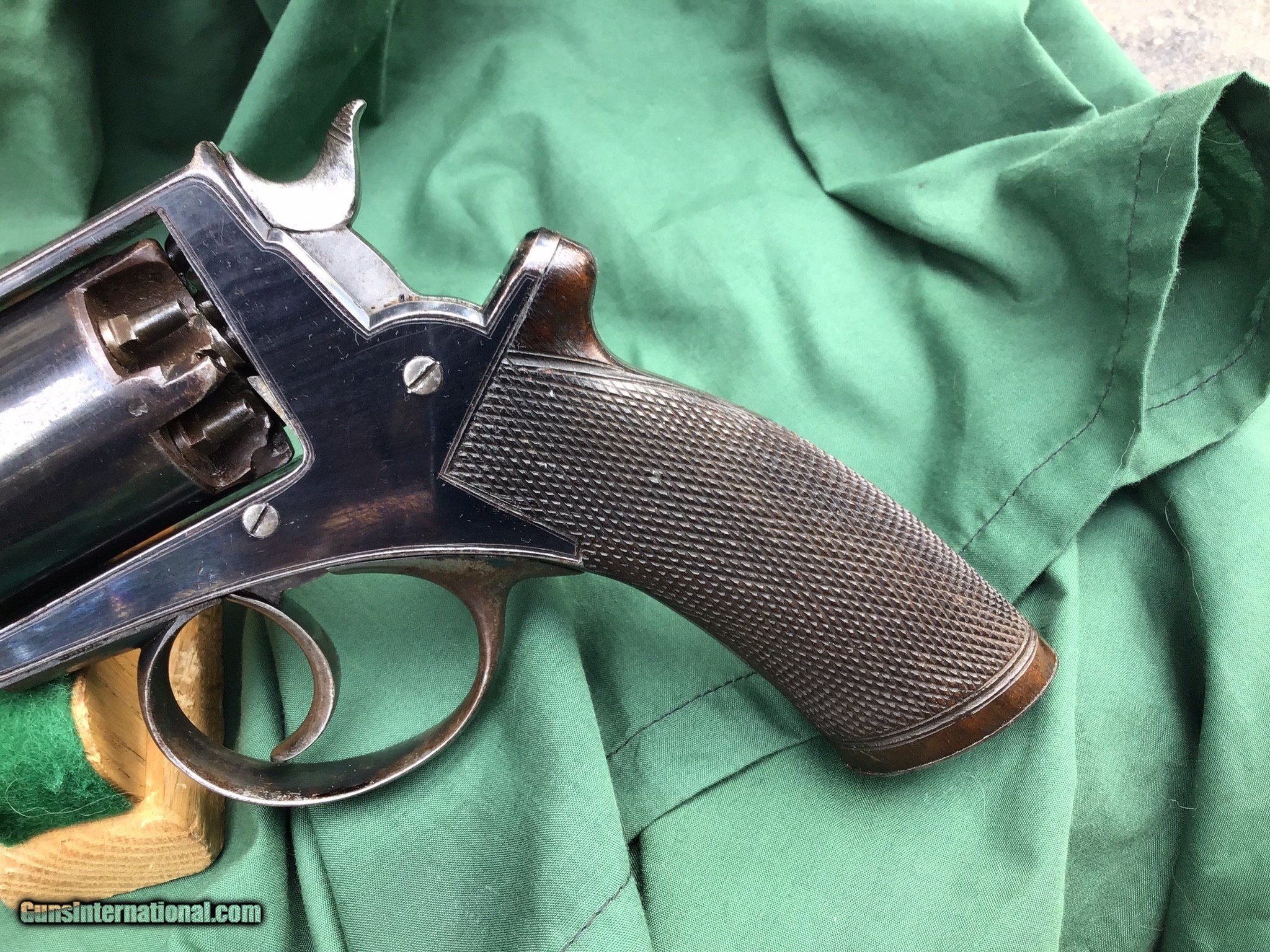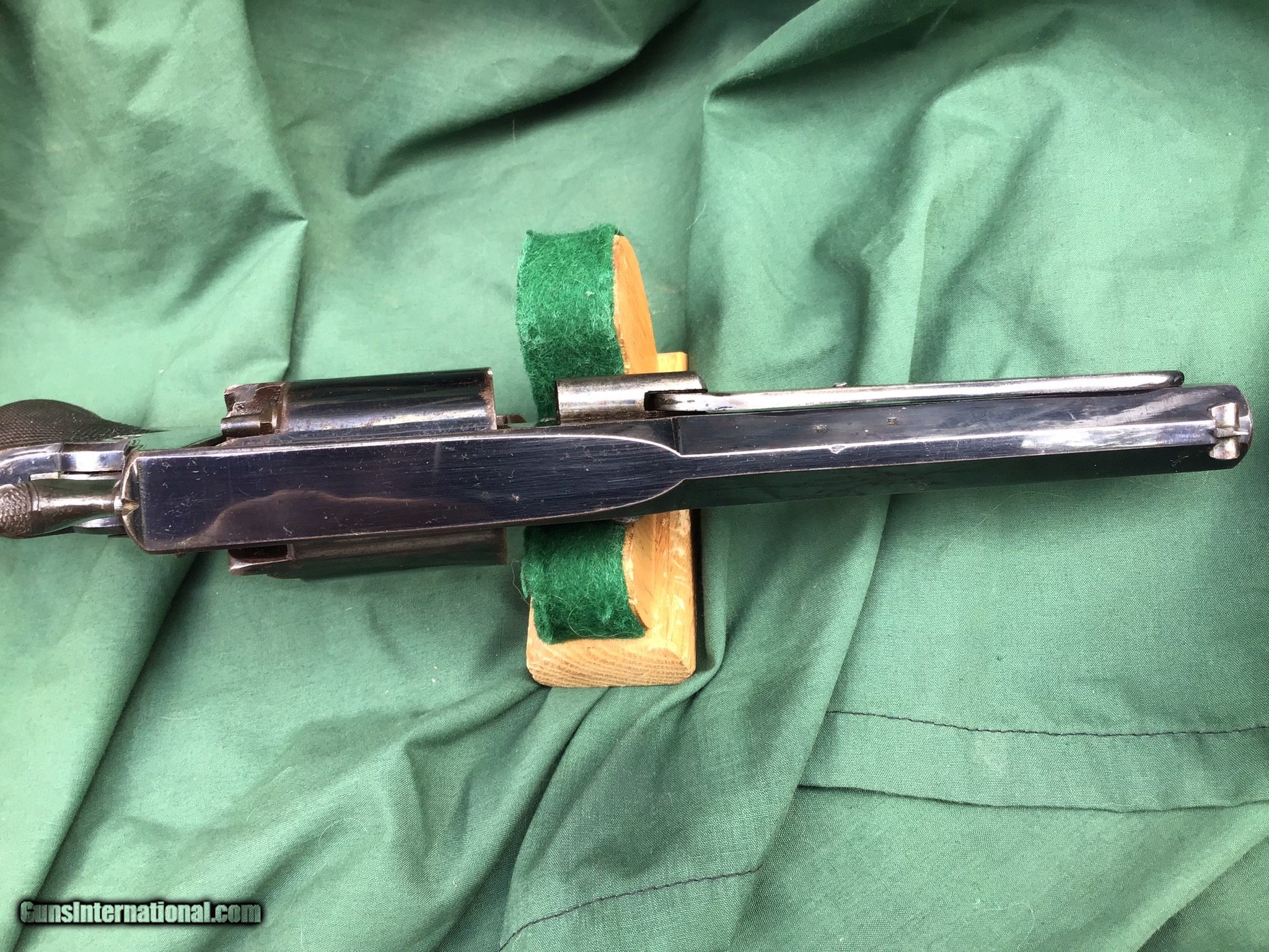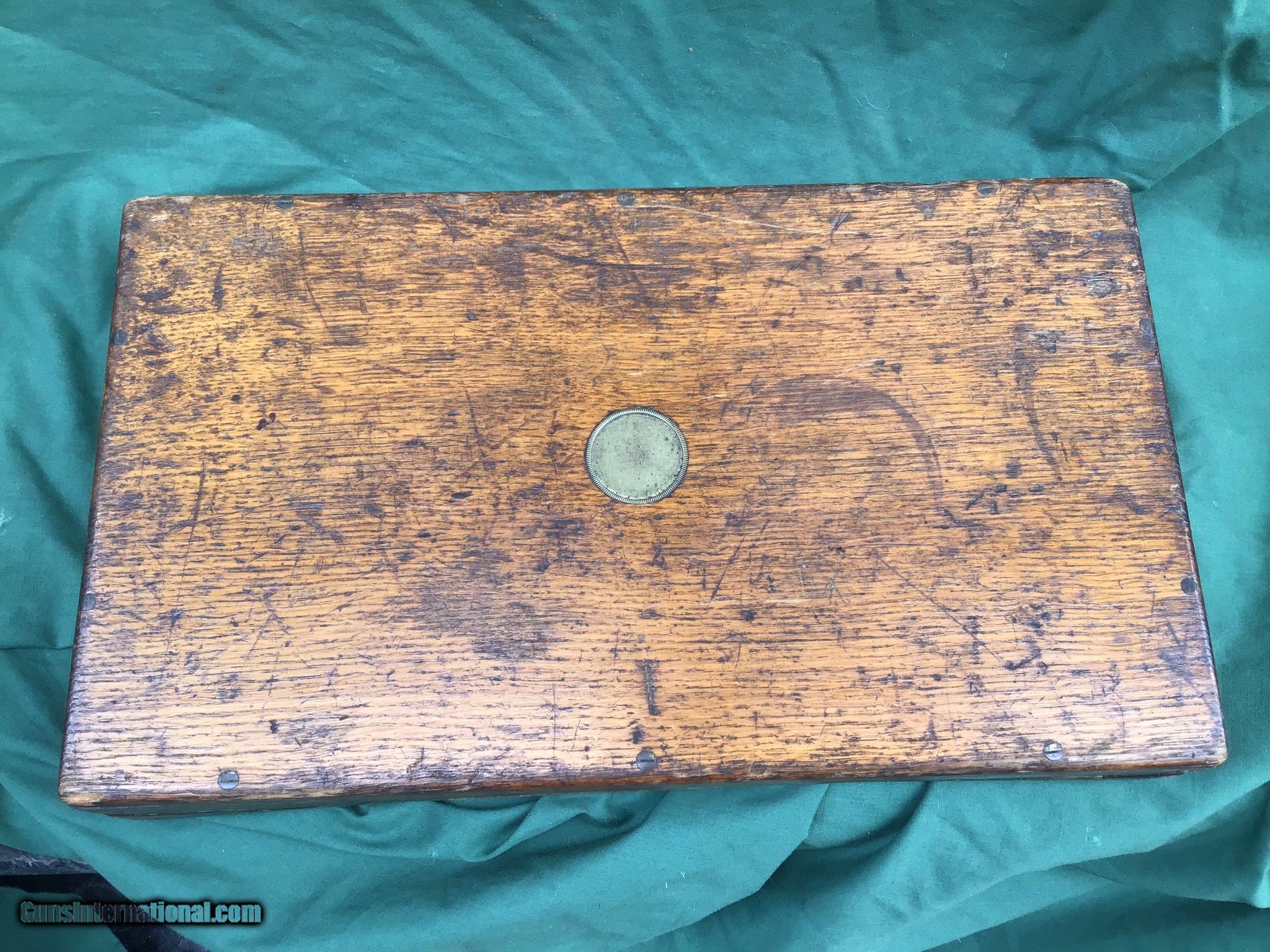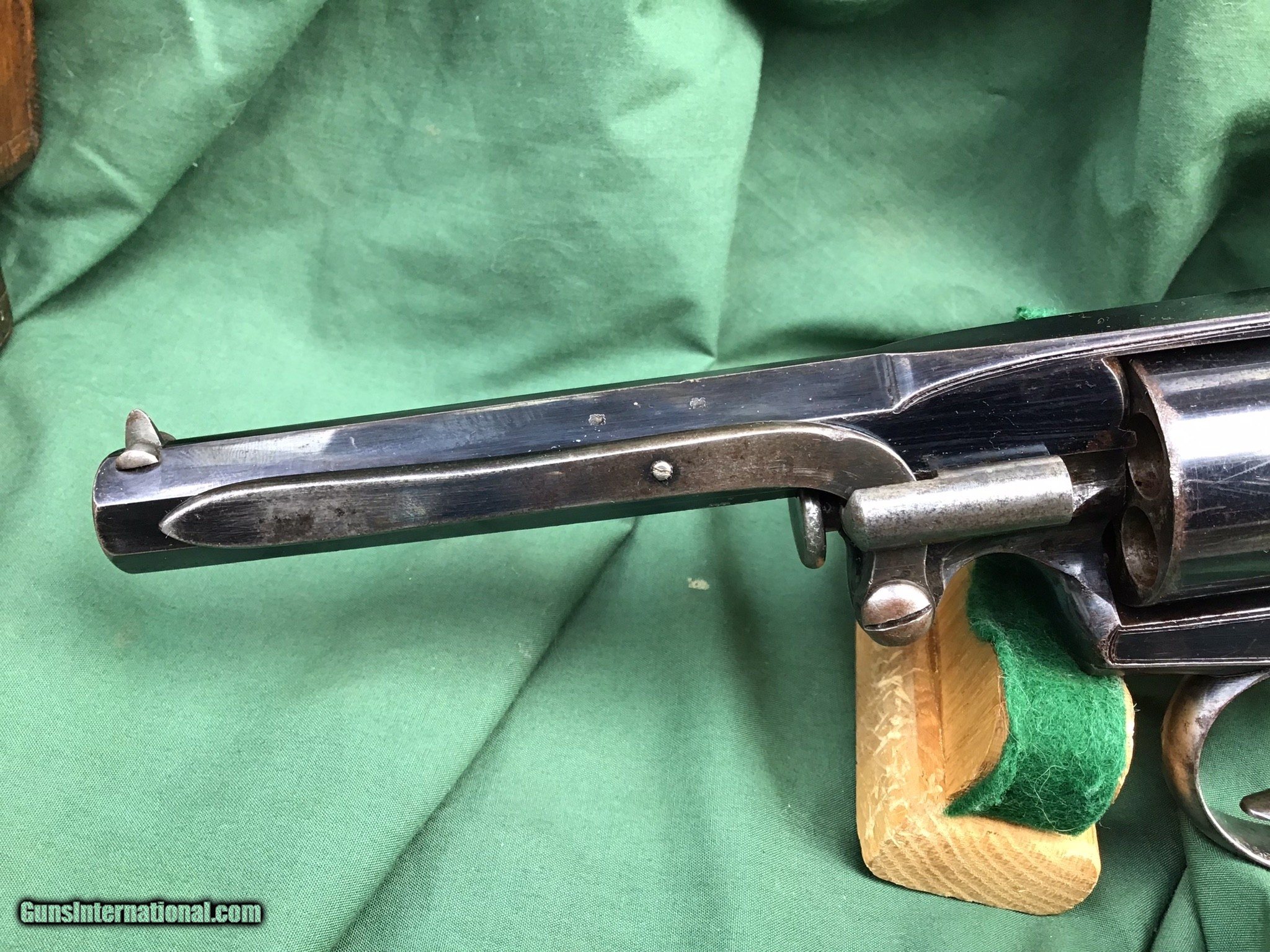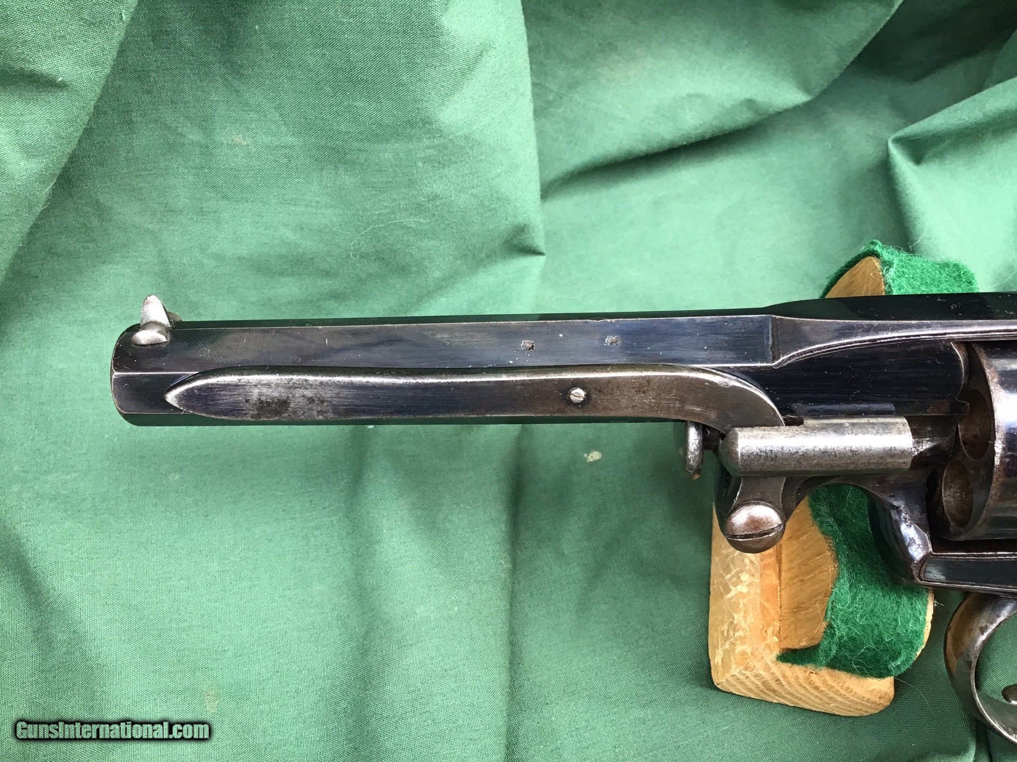 Description: Factory Cased Beaumont Adams .54 Bore in excellent condition. This 442 caliber percussion Beaumont-Adams revolver was made by the London Armory Company and marketed by Reilly Gunmakers in London. It has an approx. 5 5/8" octagon barrel and no markings on top strap of revolver. All metal is blue with approximately 90% remaining. The right side of the frame is marked ADAMS' PATENT. No. 30357. The cylinder is marked 30357. The barrel left oblique flat is marked With two proof marks (see pic). Each chamber of the cylinder is inspected with a crown/V. The grips are excellent with fine checkering and no chips or cracks. The action functions perfectly. Included in the case are the correct two-cavity mold marked with a crown over an oval reading REGISTERED ADAMS with 28 Nov./1851 inside that. It is also marked 54 which is the bore designation (.442). Also included in the case are an excellent Dixon bag flask, Joyce cap tin, cleaning rod, percussion nipple wrench, and original key for the case. Reilly label is still intact on underside of lid. I bought this cased set many years ago, the story that came with (only a story, no actual proof) it was it was purchased from an elderly woman in Charleston SC that said it belonged to a family member that served in Civil War. This is a super cased Beaumont-Adams revolver that is fit for the finest collection. SOLD Antique: Yes |