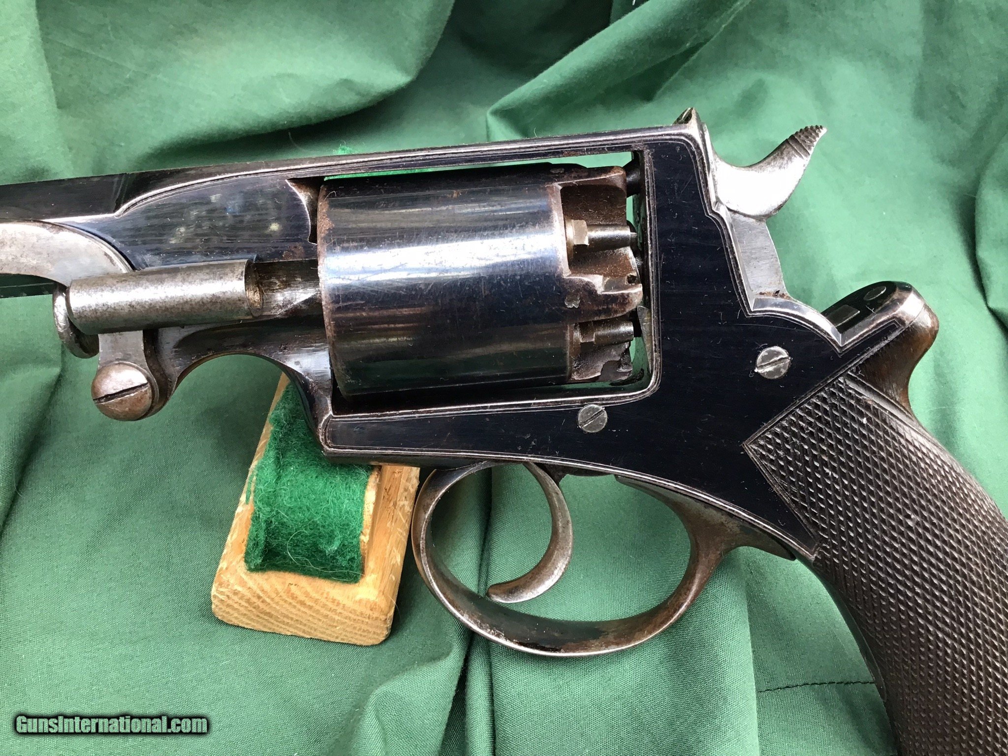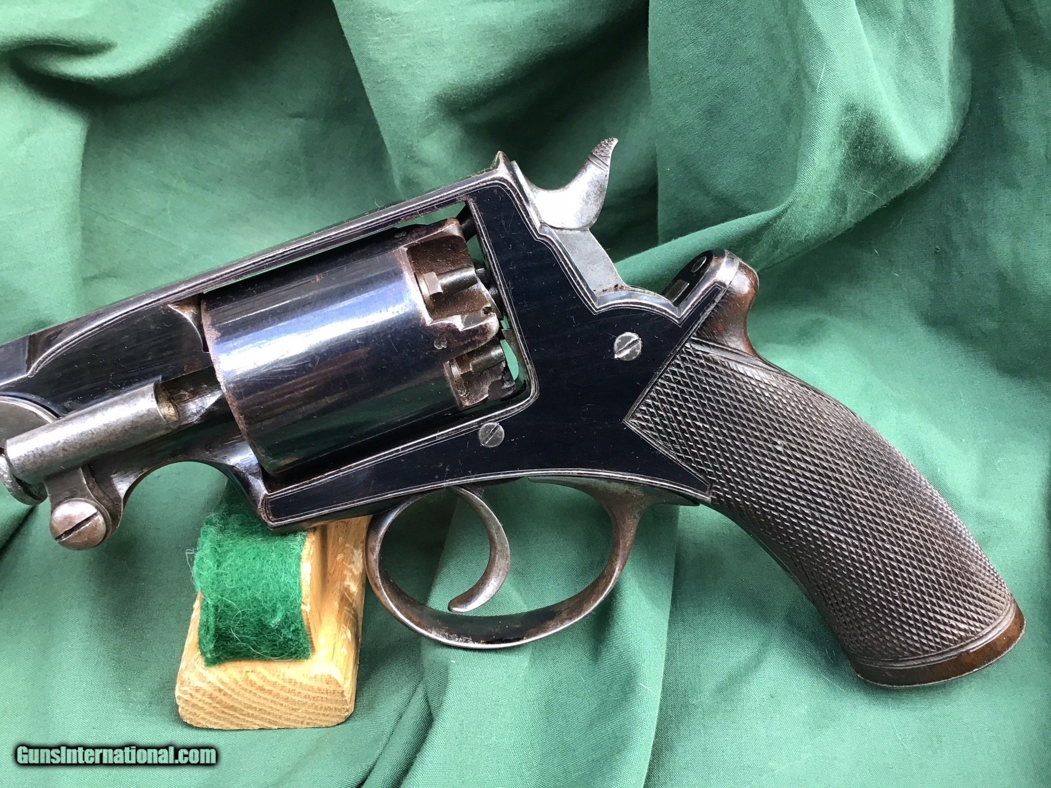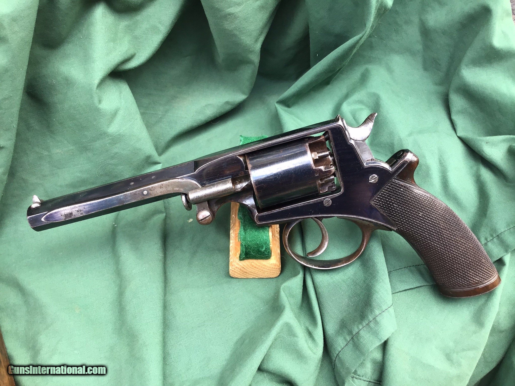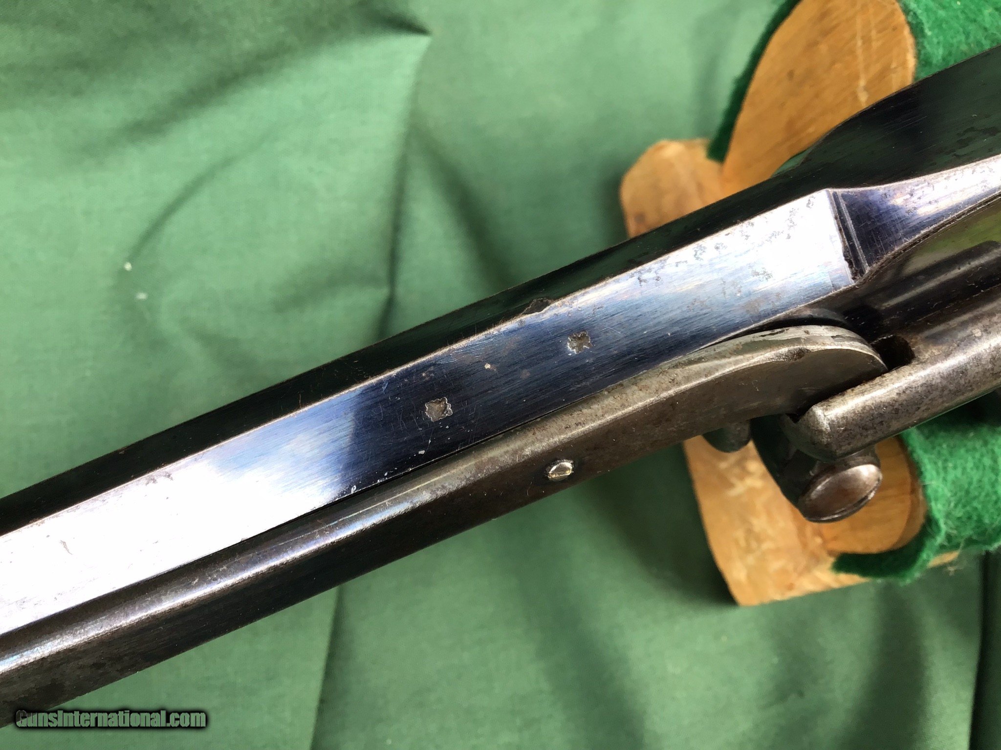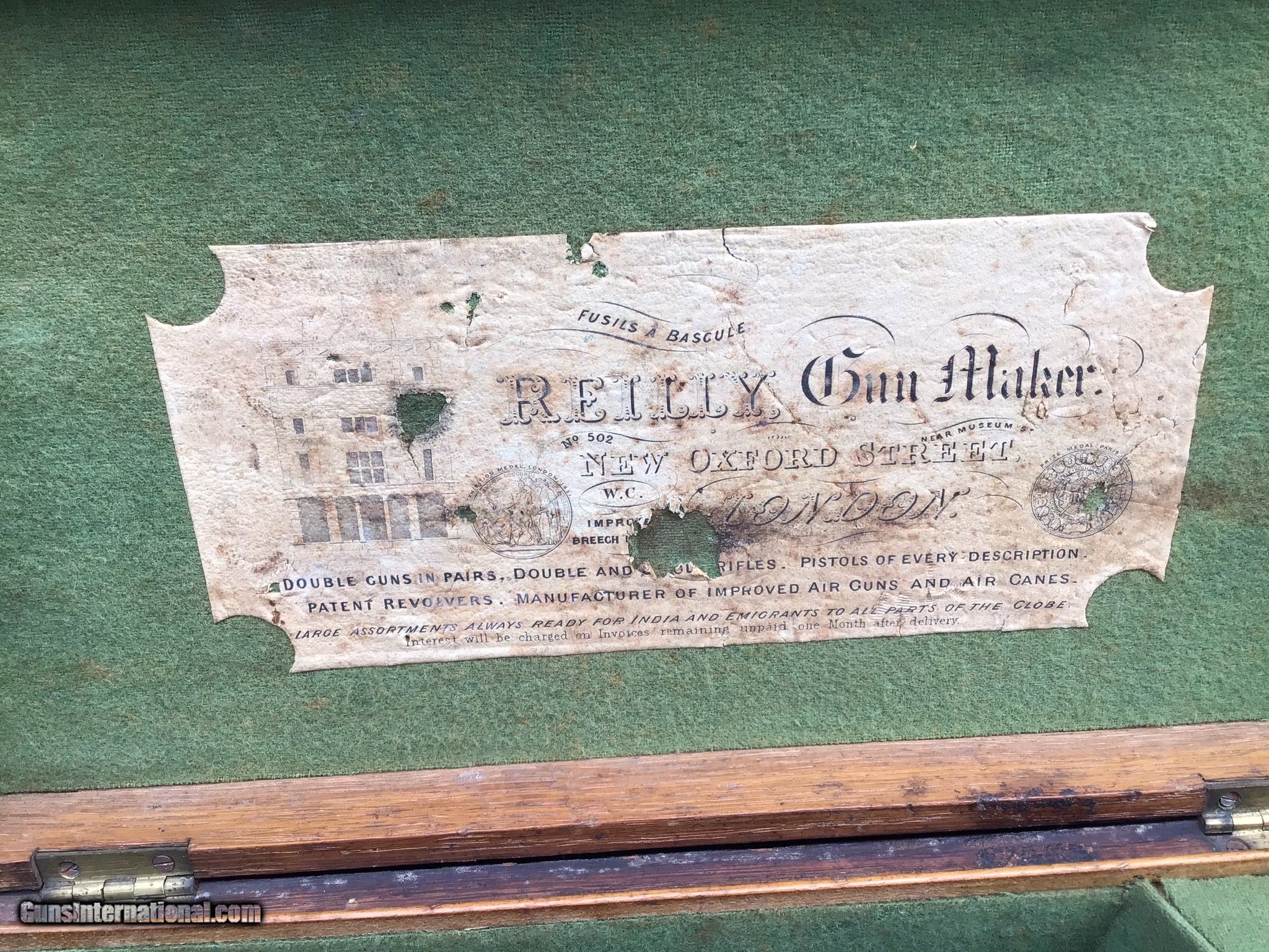 Description: Factory Cased Beaumont Adams .54 Bore in excellent condition. This 442 caliber percussion Beaumont-Adams revolver was made by the London Armory Company and marketed by Reilly Gunmakers in London. It has an approx. 5 5/8" octagon barrel and no markings on top strap of revolver. All metal is blue with approximately 90% remaining. The right side of the frame is marked ADAMS' PATENT. No. 30357. The cylinder is marked 30357. The barrel left oblique flat is marked With two proof marks (see pic). Each chamber of the cylinder is inspected with a crown/V. The grips are excellent with fine checkering and no chips or cracks. The action functions perfectly. Included in the case are the correct two-cavity mold marked with a crown over an oval reading REGISTERED ADAMS with 28 Nov./1851 inside that. It is also marked 54 which is the bore designation (.442). Also included in the case are an excellent Dixon bag flask, Joyce cap tin, cleaning rod, percussion nipple wrench, and original key for the case. Reilly label is still intact on underside of lid. I bought this cased set many years ago, the story that came with (only a story, no actual proof) it was it was purchased from an elderly woman in Charleston SC that said it belonged to a family member that served in Civil War. This is a super cased Beaumont-Adams revolver that is fit for the finest collection. SOLD Antique: Yes |