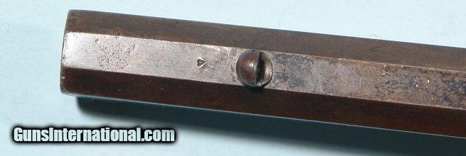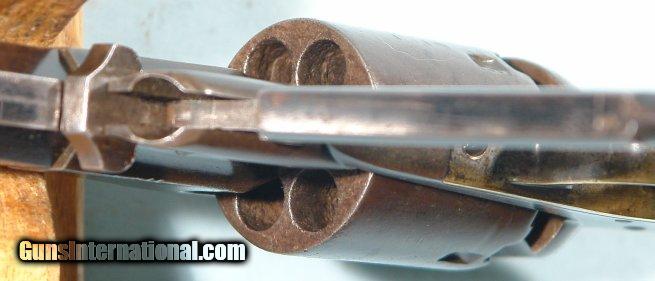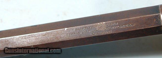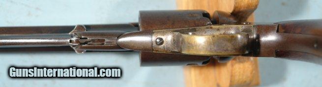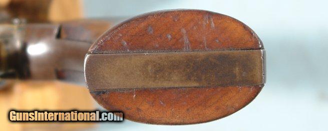 Description: FINE CIVIL WAR REMINGTON PERCUSSION NEW MODEL NAVY REVOLVER CA. 1863. .36 caliber with 7 3/8th” barrel. Crisp Remington “NEW MODEL” address with “SEPT. 14, 1858” patent date. Serial numbered in the 34,xxx range in the middle of the U.S.N. contract serial number range and all original and correct and matching. Civil War Naval contact New Models were unmarked as to U.S.N. inspector’s marks but do nave sub-inspector’s marks as does this one with a “C” stamped on the frame and small “Heart” stamp on underside of barrel in front of the ramrod catch. . Fine plus over all with 40-50% blue evenly mixed with patina. Fine original grips with near all the finish. Crisp screws with some original blue. Excellent bore and chambers and perfect working order. Very nice example and only about 4300 purchased by the Navy in the Civil War. SOLD Antique: Yes |