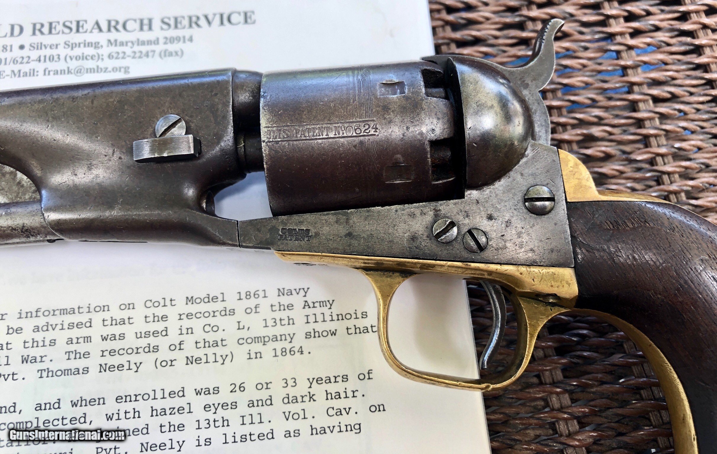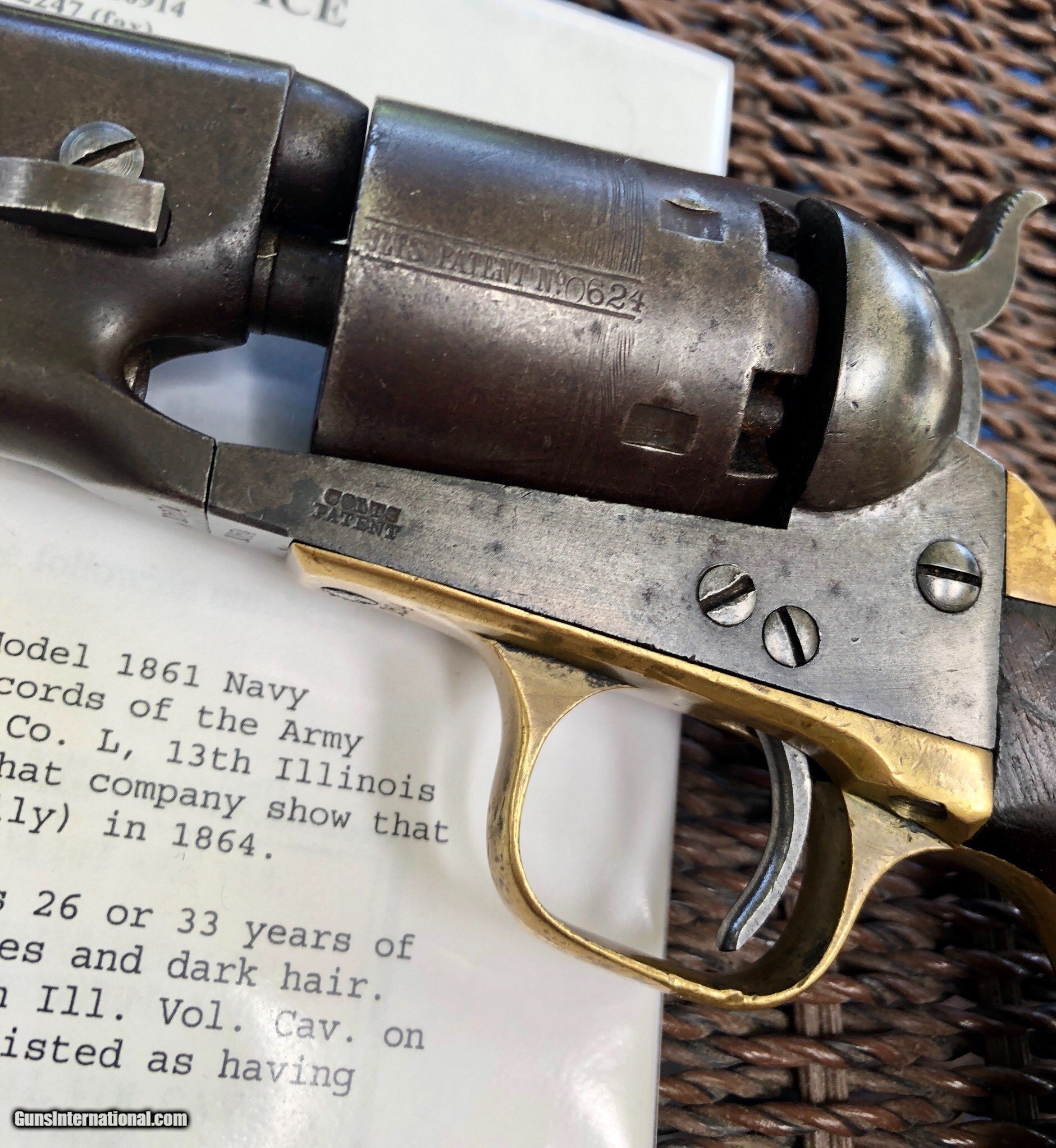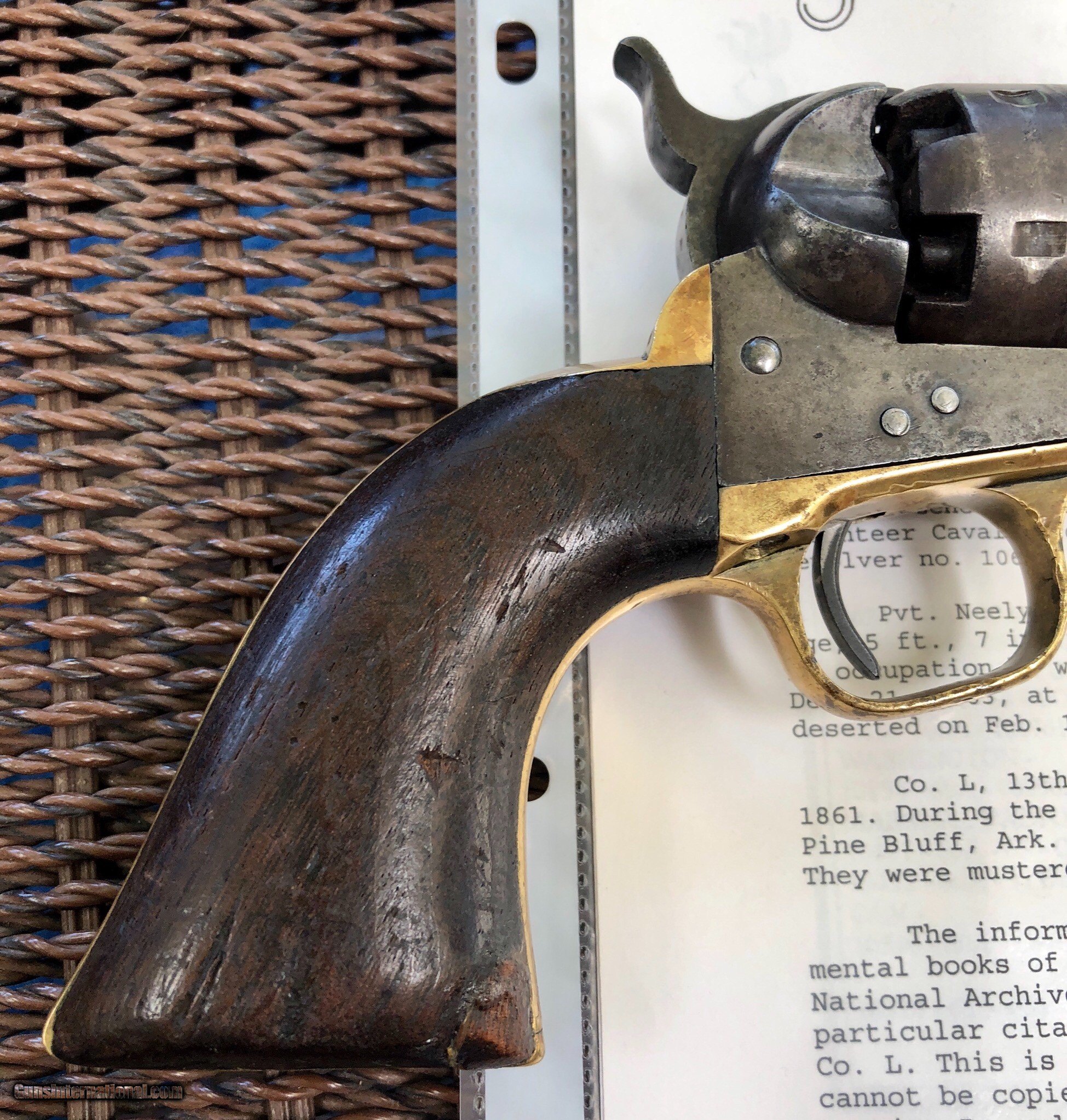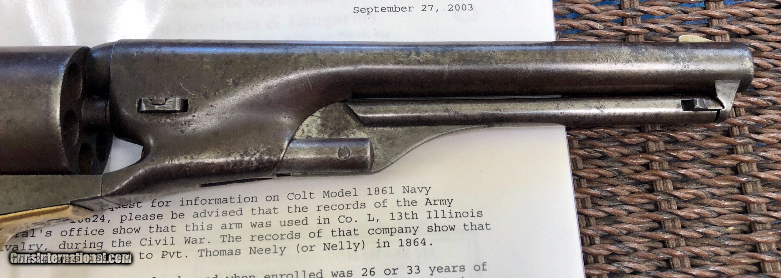 Description: This Martial Colt 1861 Navy is scarce on its own but when you can find a documented example to a soldier, it takes it up a notch. There is faint cartouches visible on the grip. a repair to the right grip toe. Mechanically excellent. Overall the finish has faded to a beautiful untouched patina. Private Neely or Nelly served in Co. L 13th Illinois Volunteer Cavalry, He enlisted December 21, 1863 at Benton Barrack, Missouri. Pvt. Nelly is listed having deserted on Feb. 1, 1864. Although he did not serve long, this is still an incredible and documented example! Shipping is $20 plus actual insurance SOLD SOLD Antique: Yes |